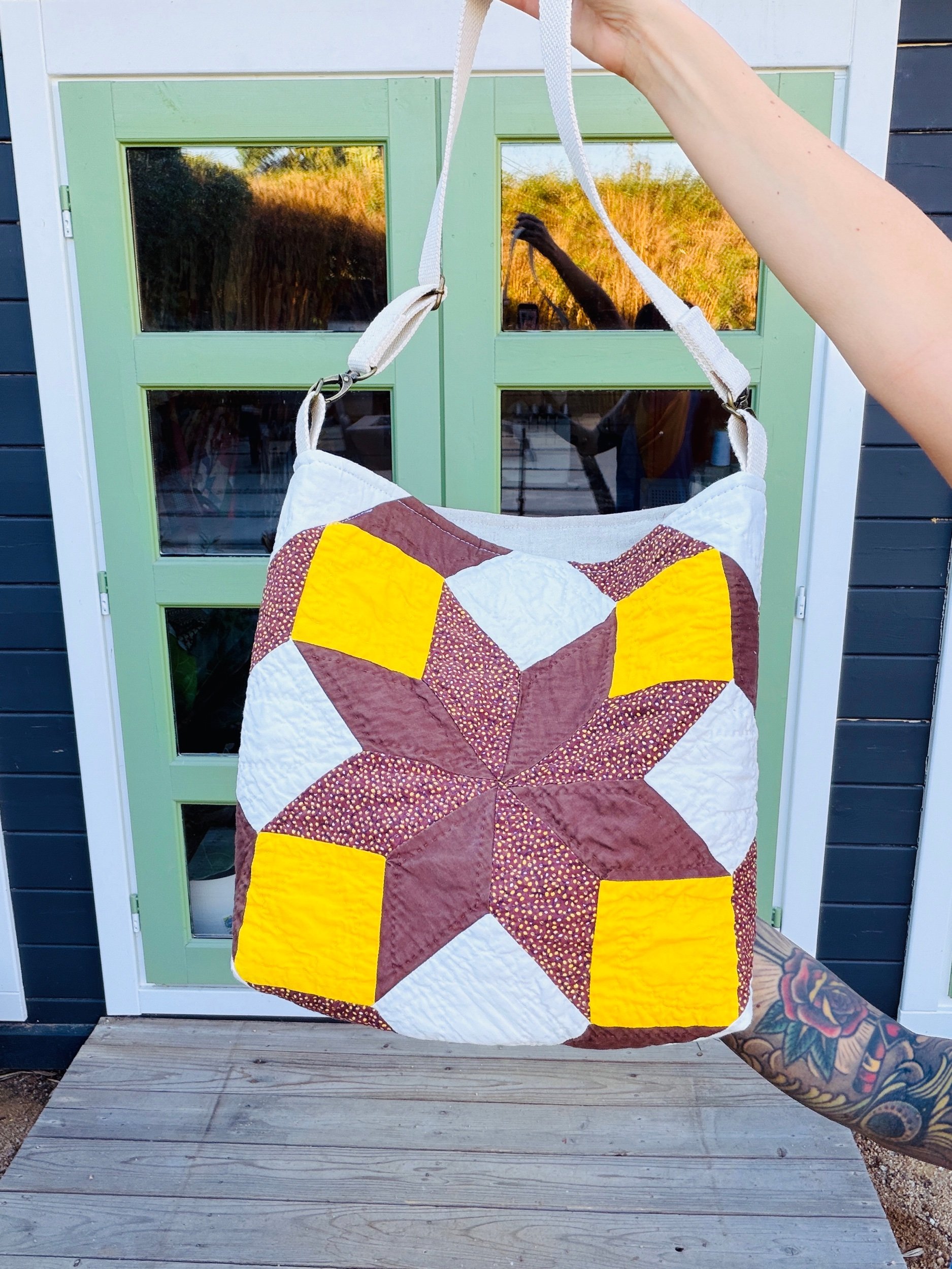 This one-of-a-kind quilted crossbody bag is made from a vintage 1970s quilt, giving new life to a beautiful piece of textile history. The bold geometric star pattern in warm browns, golden yellow, and soft ivory carries that unmistakable 70s charm—earthy, cozy, and full of character.