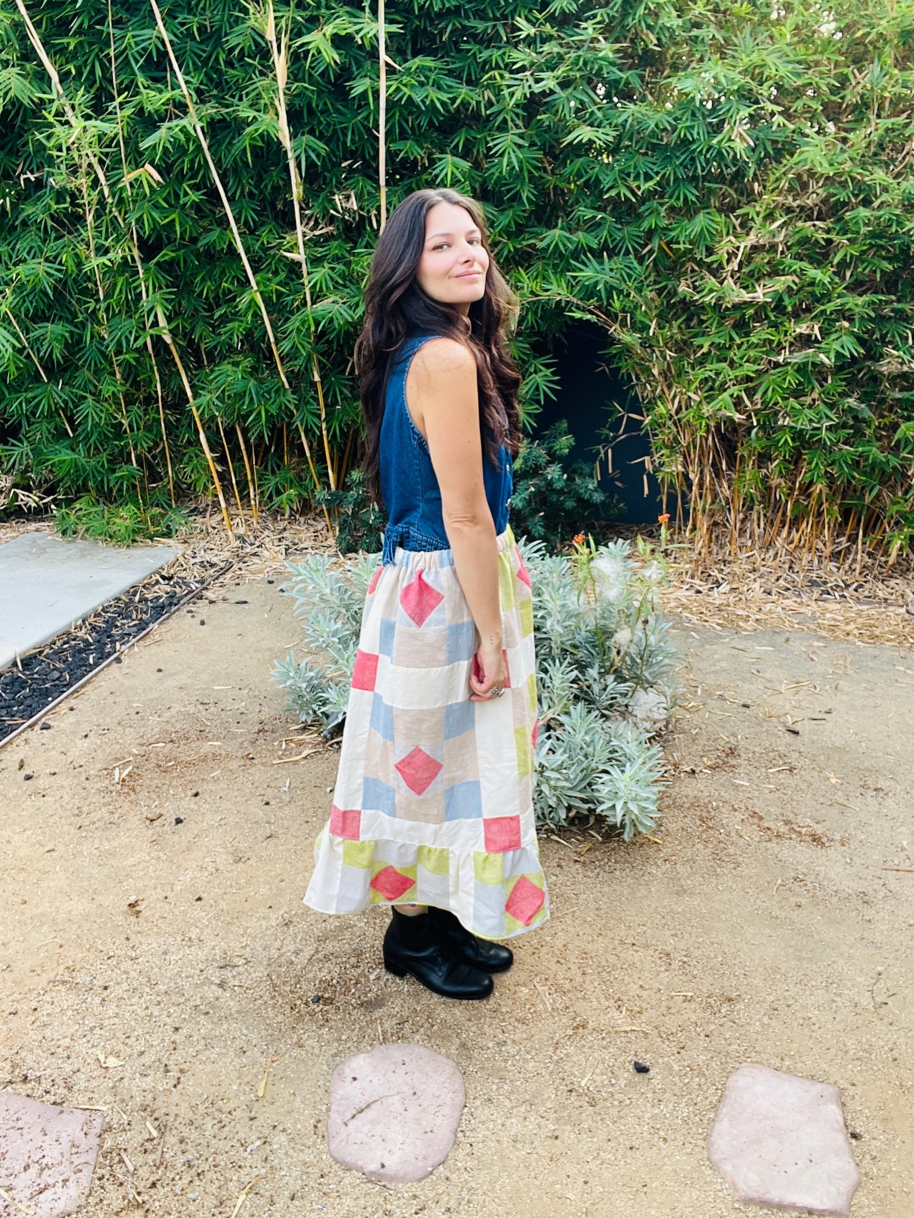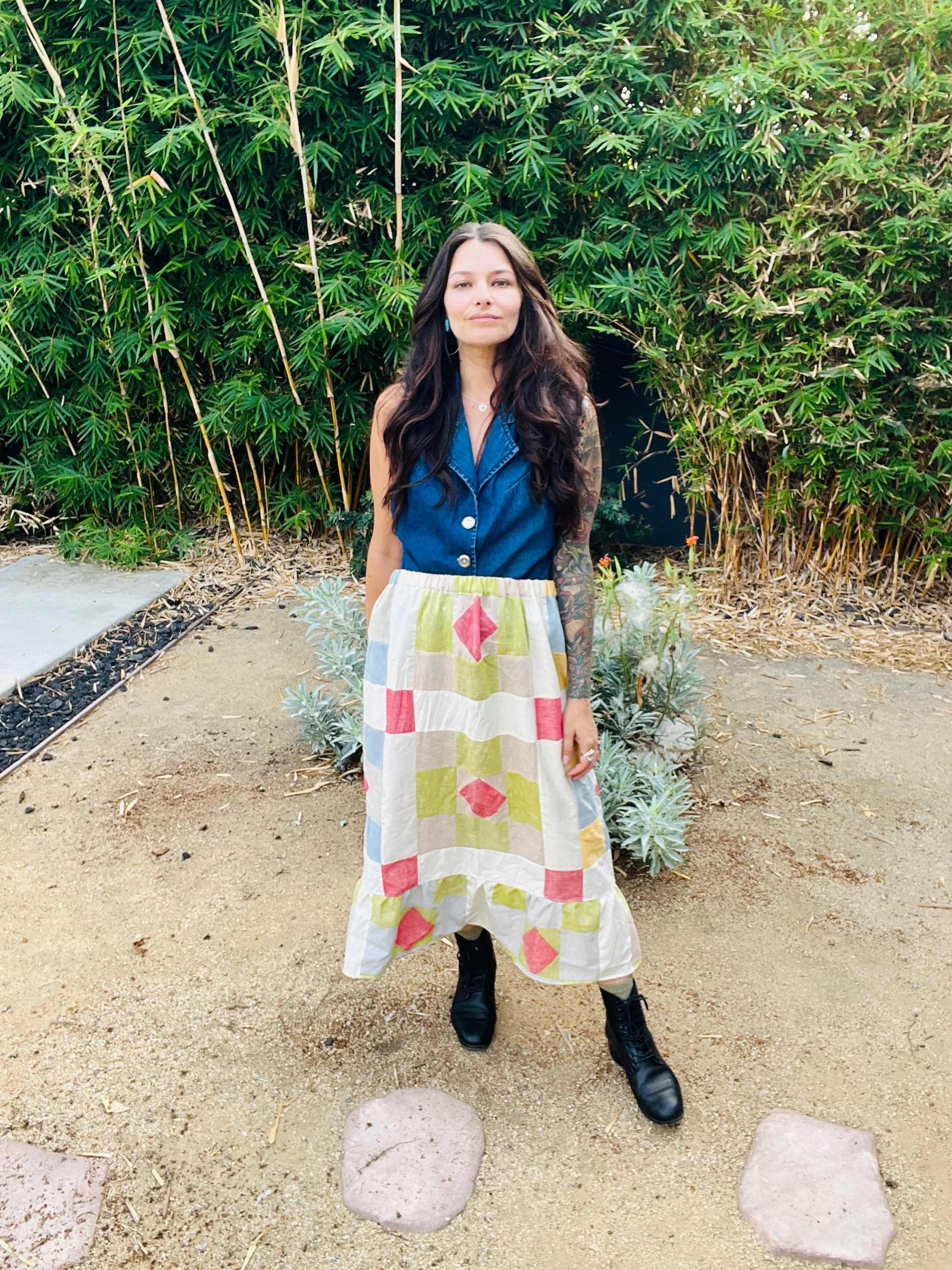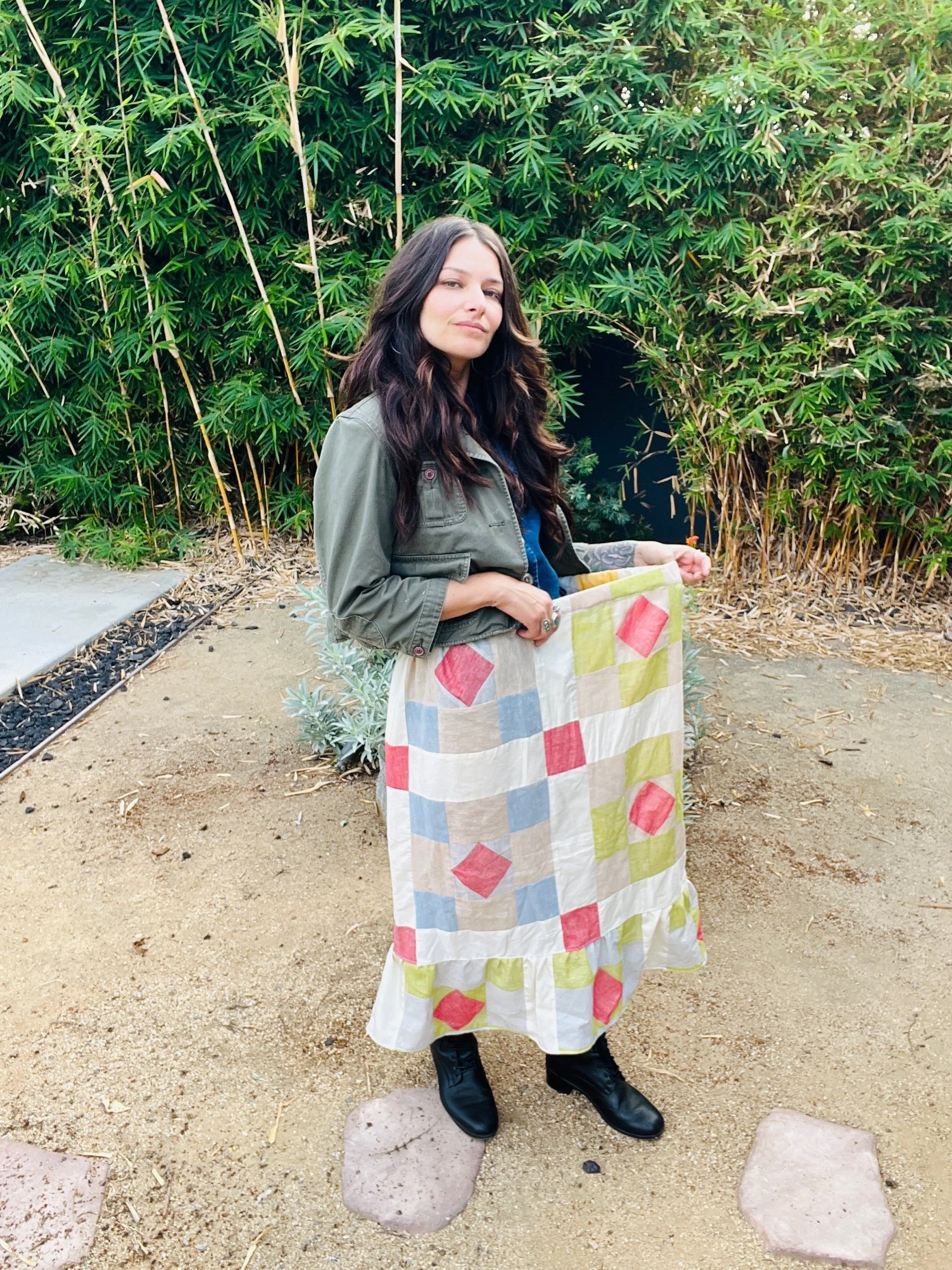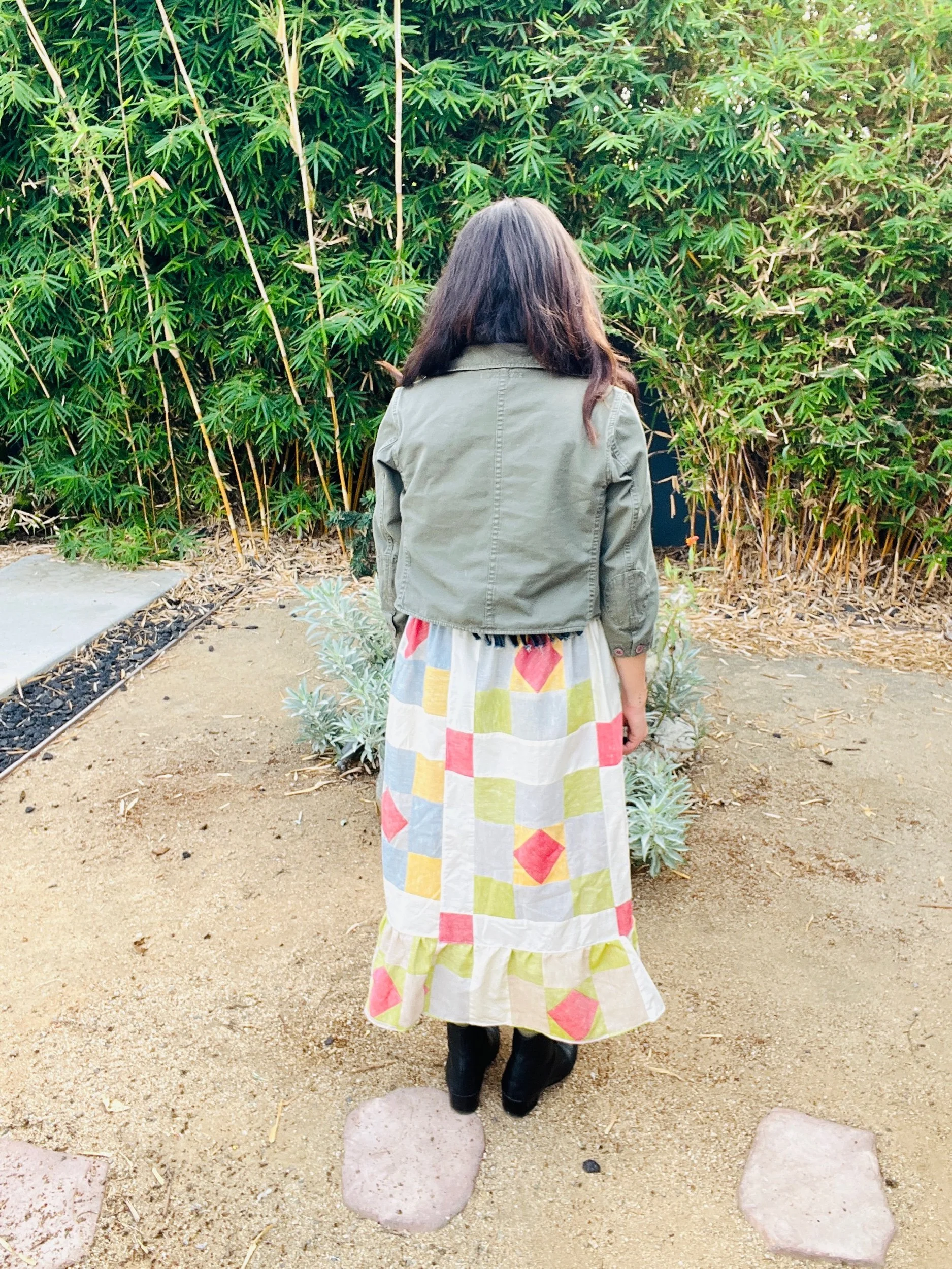 This large quilted skirt is a unique piece crafted from a finished quilt top dating back to the 1940s, showcasing an exquisite design and remarkable condition.