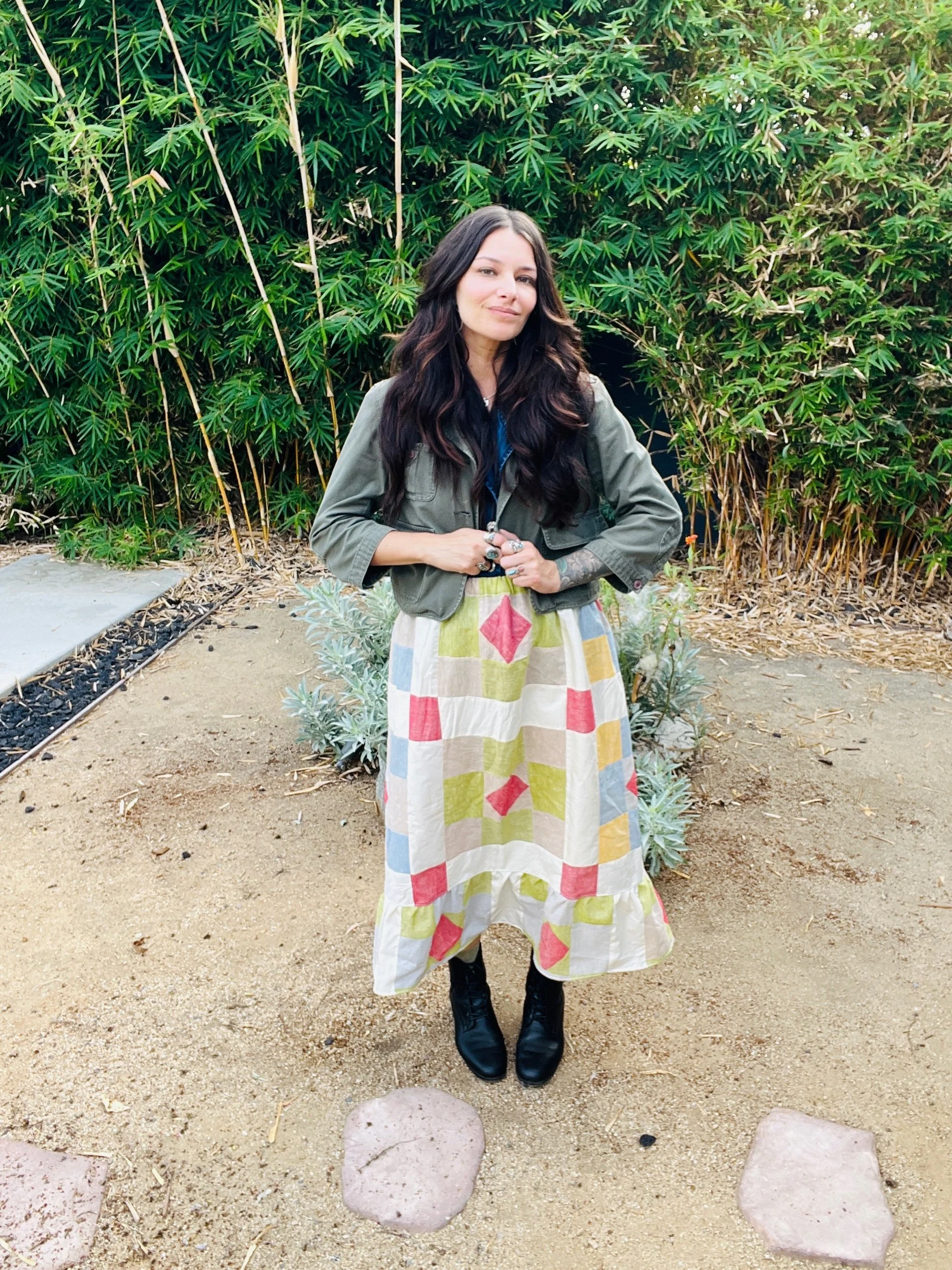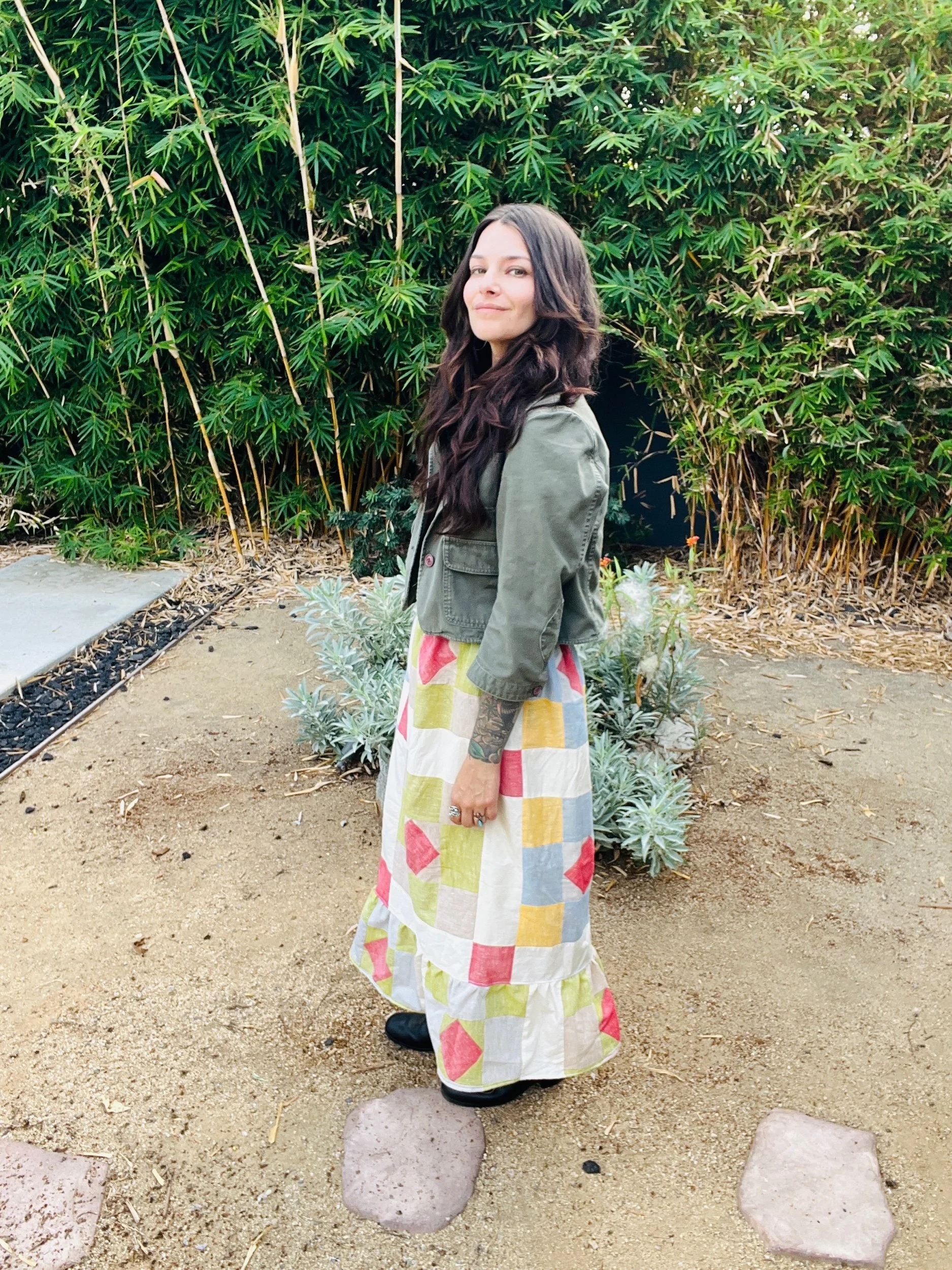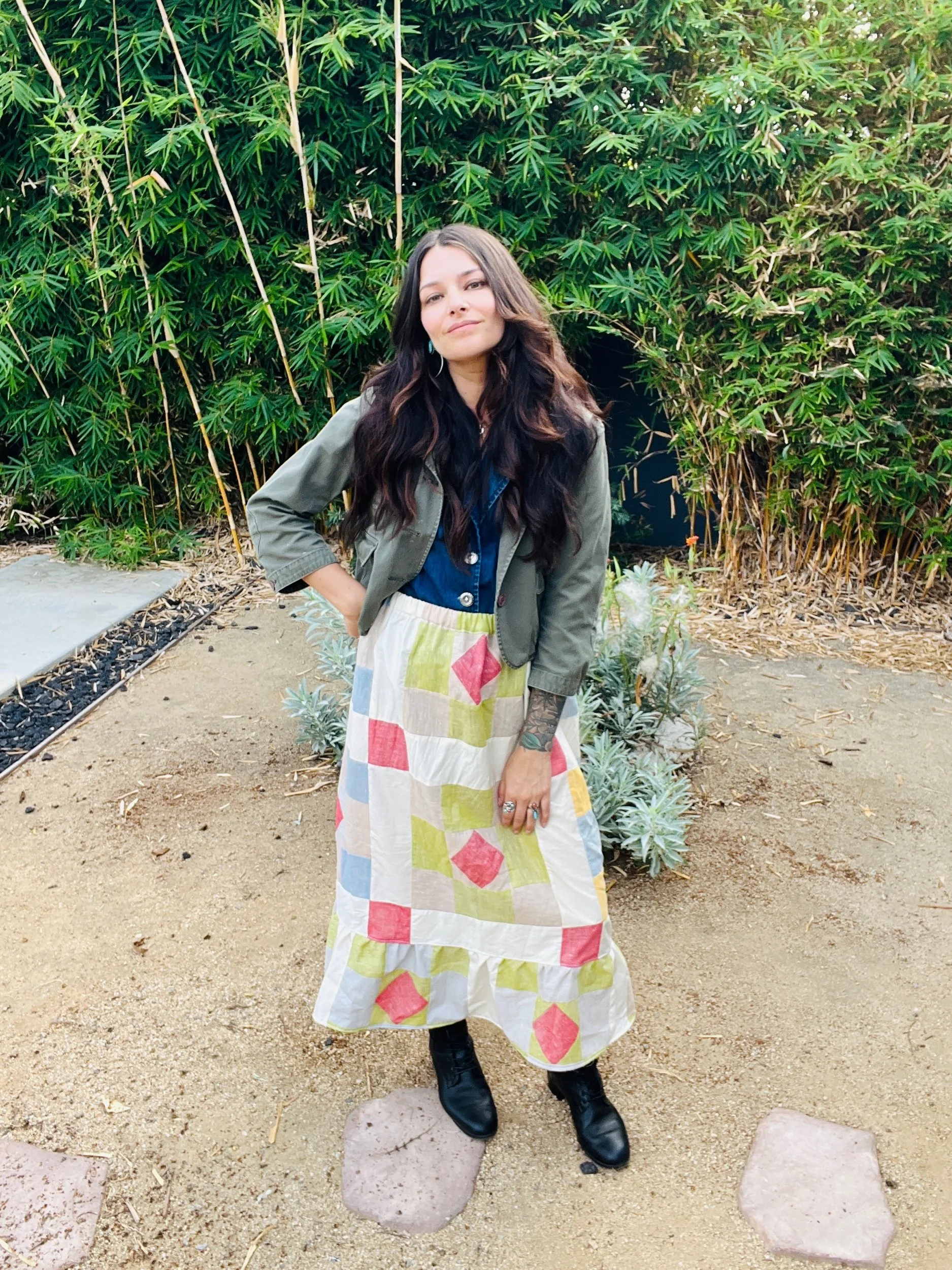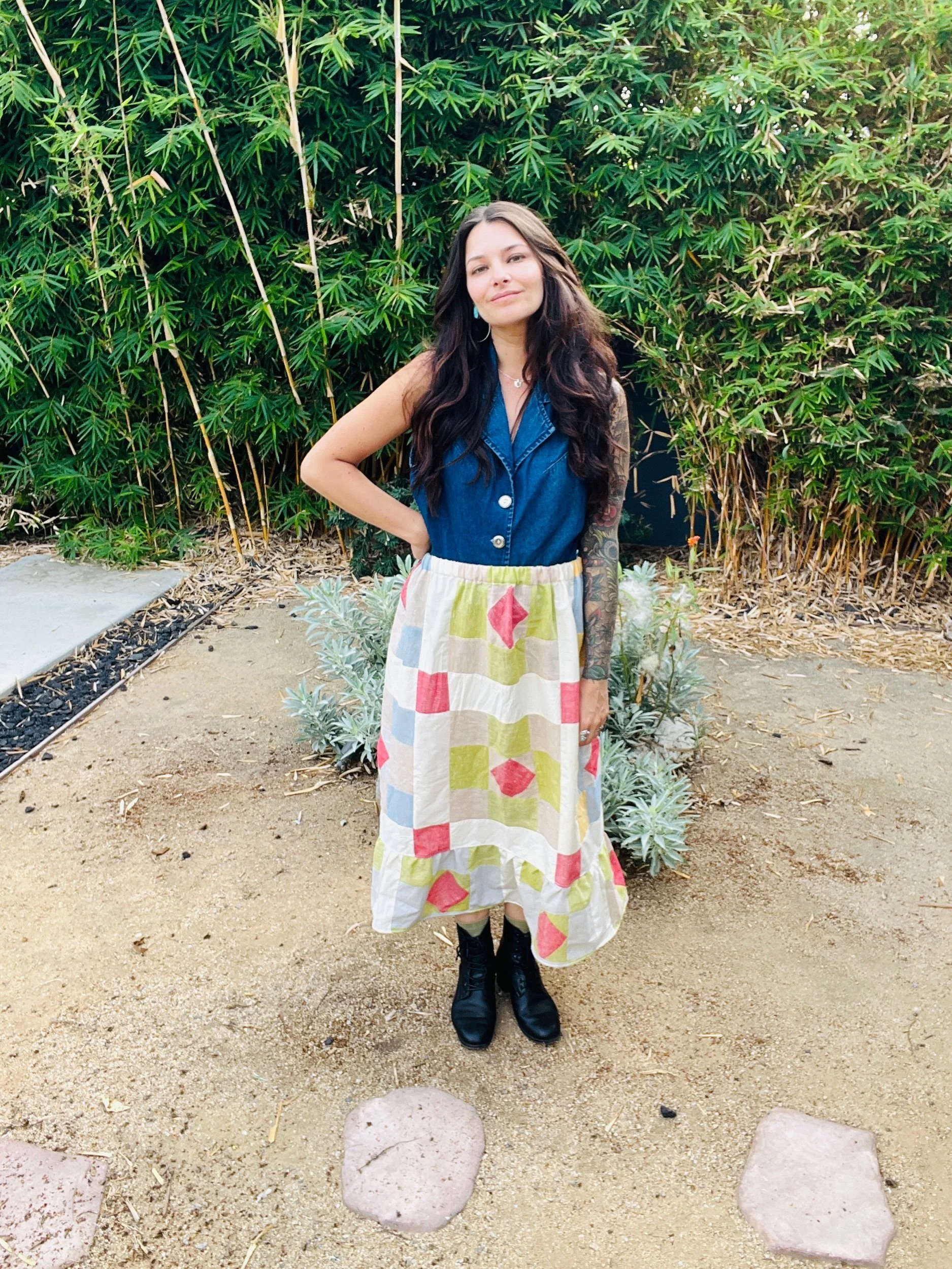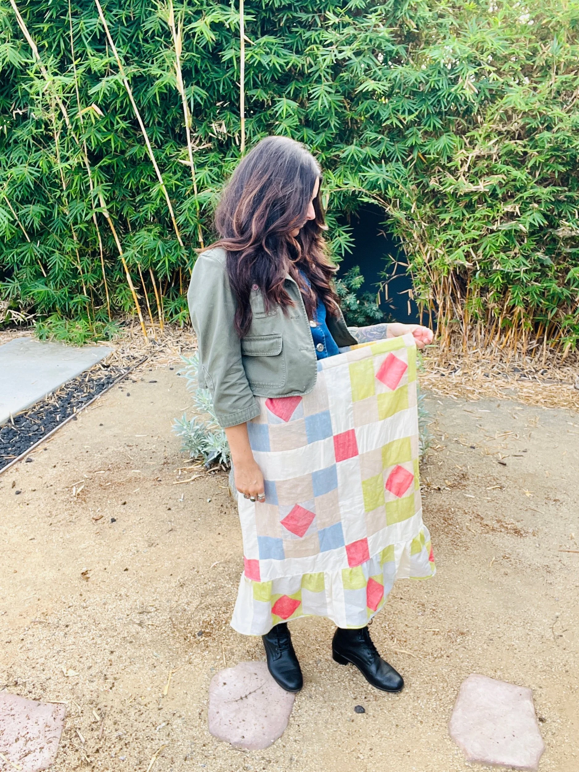 This large quilted skirt is a unique piece crafted from a finished quilt top dating back to the 1940s, showcasing an exquisite design and remarkable condition.