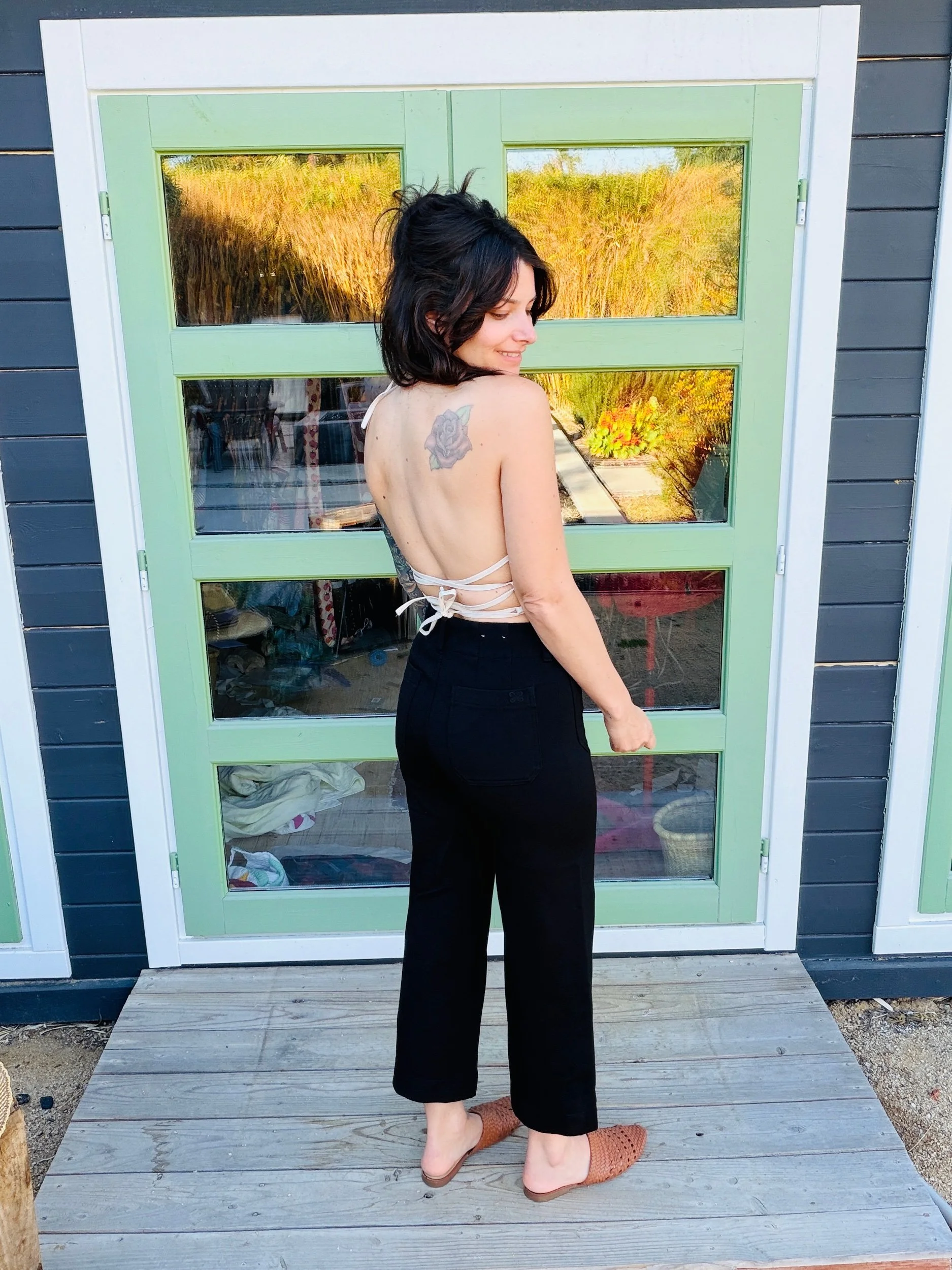 The backless design ties with linen straps, allowing you to adjust the fit to your body—easy, natural, and made to move with you. Best suited for a small to medium, it drapes with that perfectly imperfect charm only vintage fabrics can offer.
