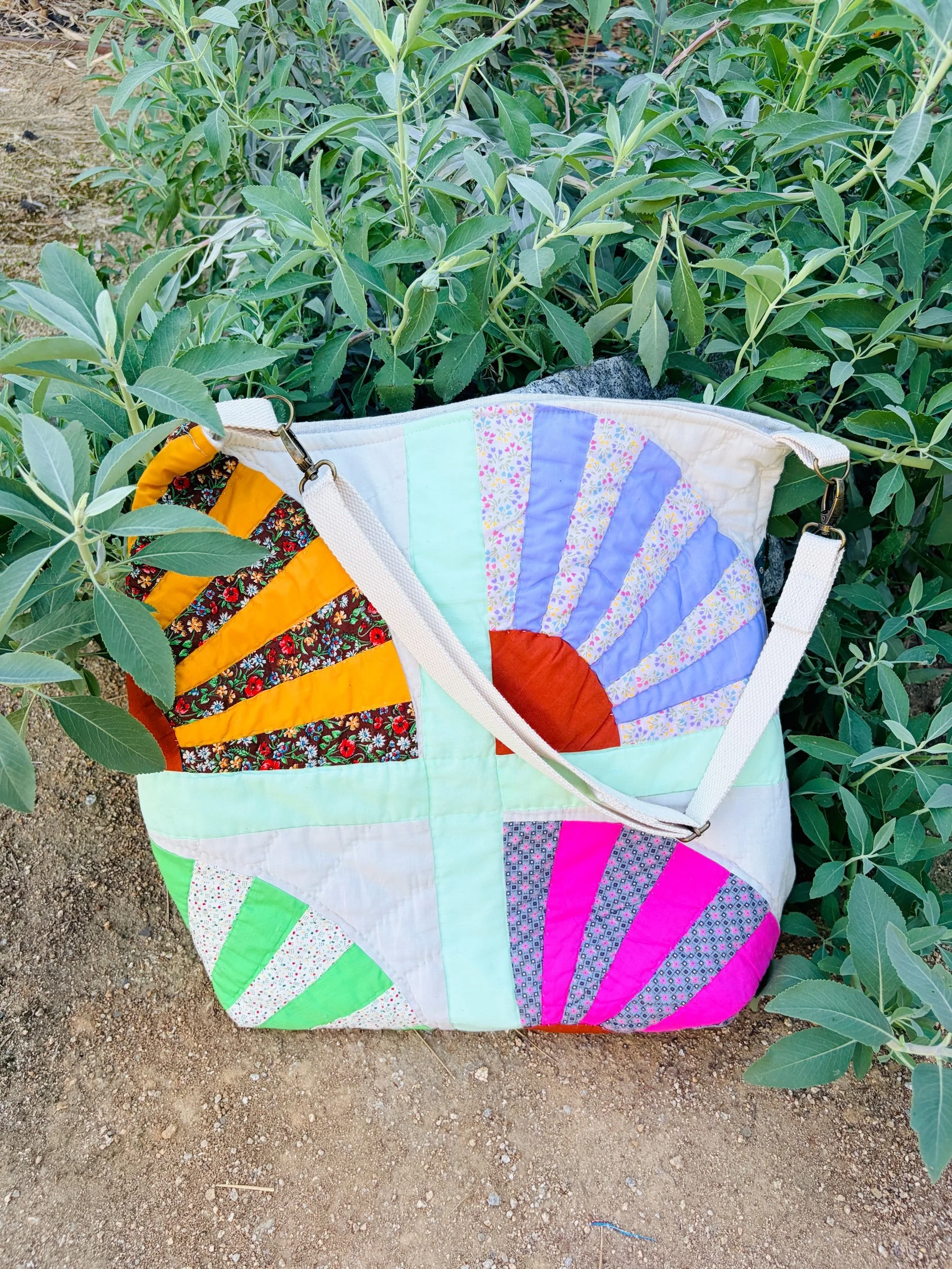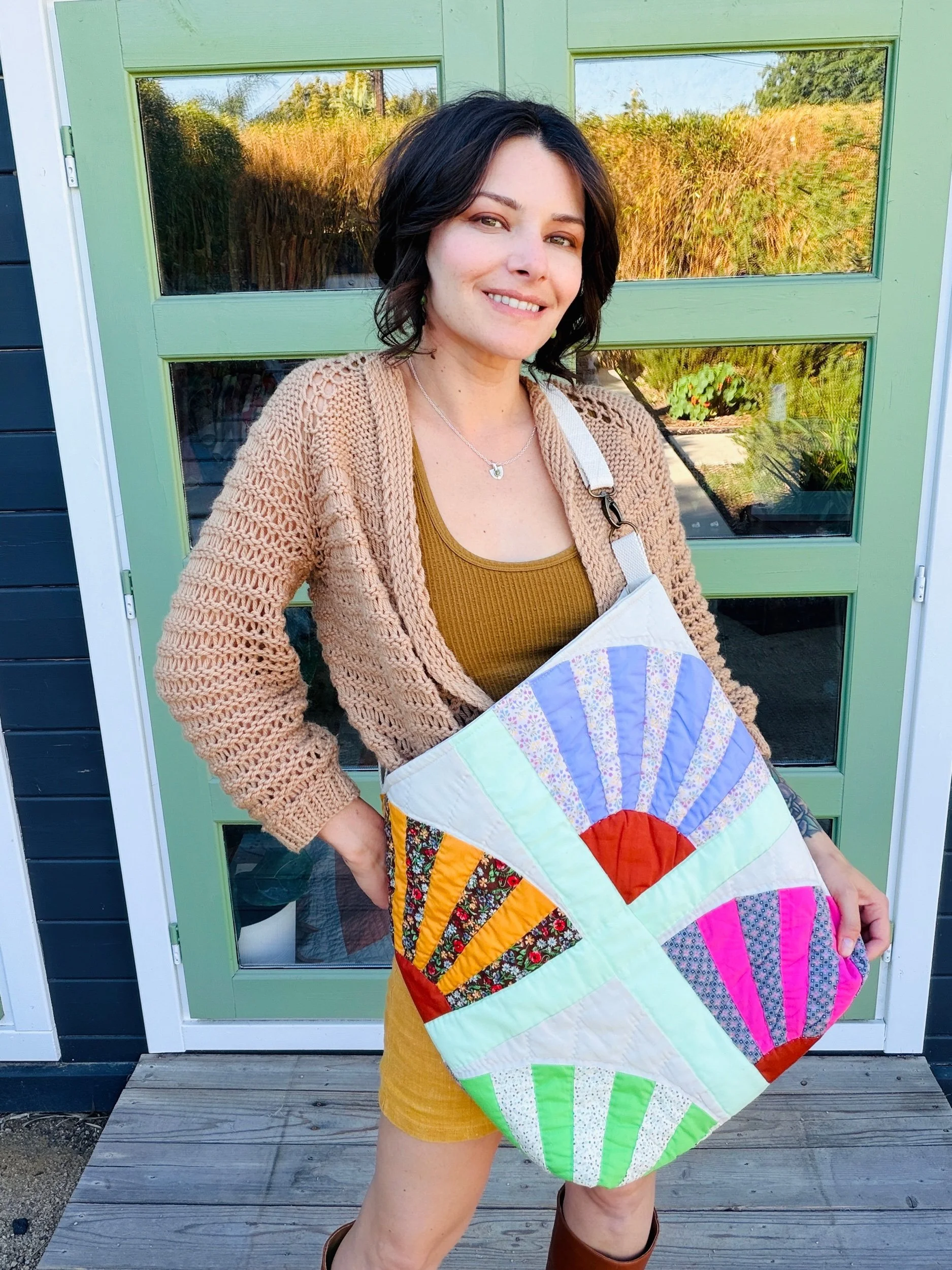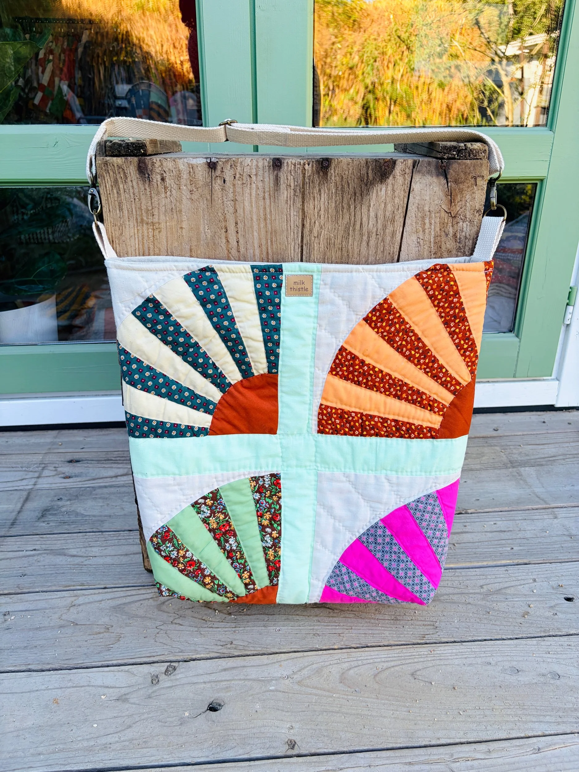 This one-of-a-kind quilted sunrise bag was handmade by me using a beautiful patchwork of sunrise quilt blocks that feel warm, bright, and a little nostalgic. Each rising sun panel brings its own mix of vintage-inspired colors and prints, giving the bag a joyful, handmade character that feels like carrying a small piece of a quilt story with you.