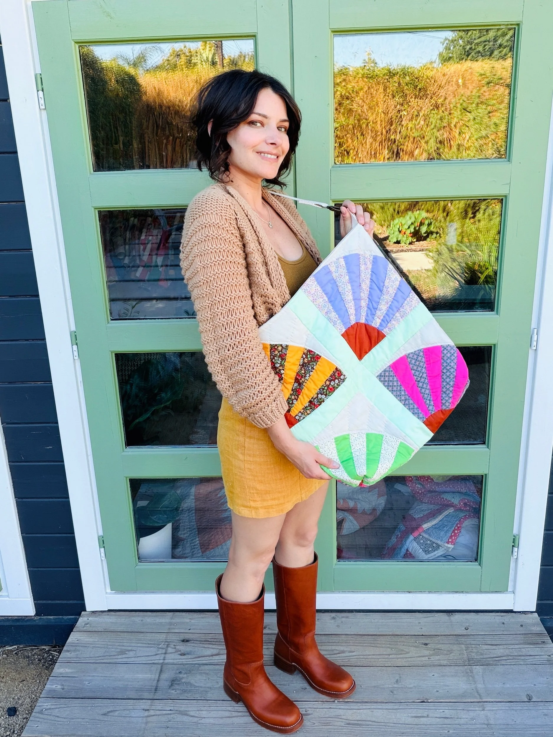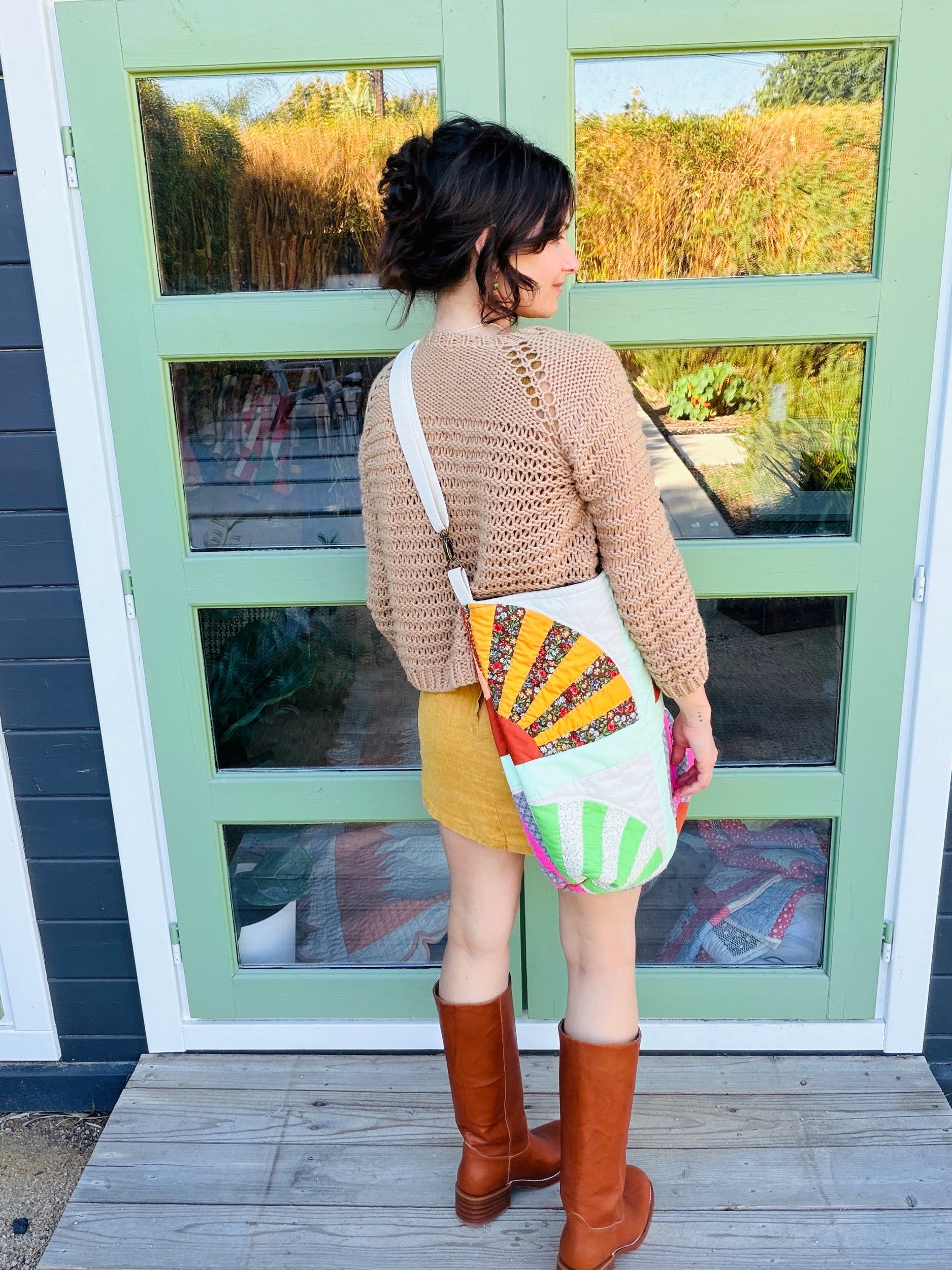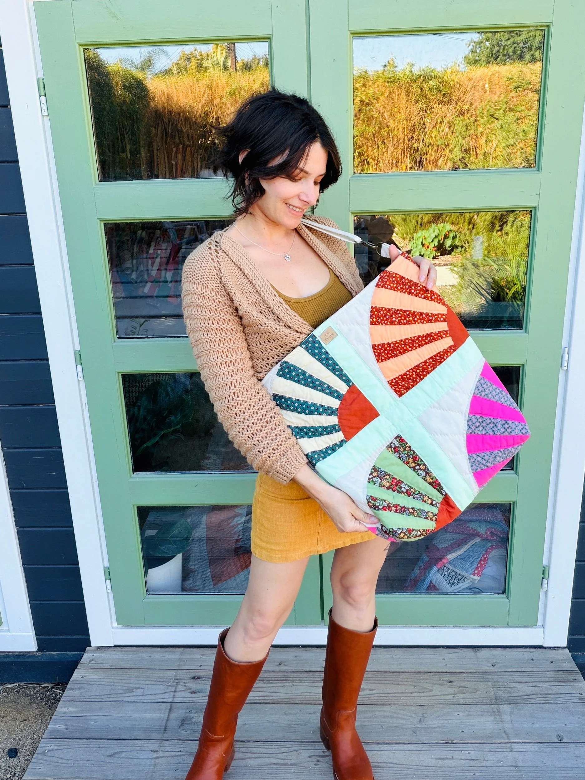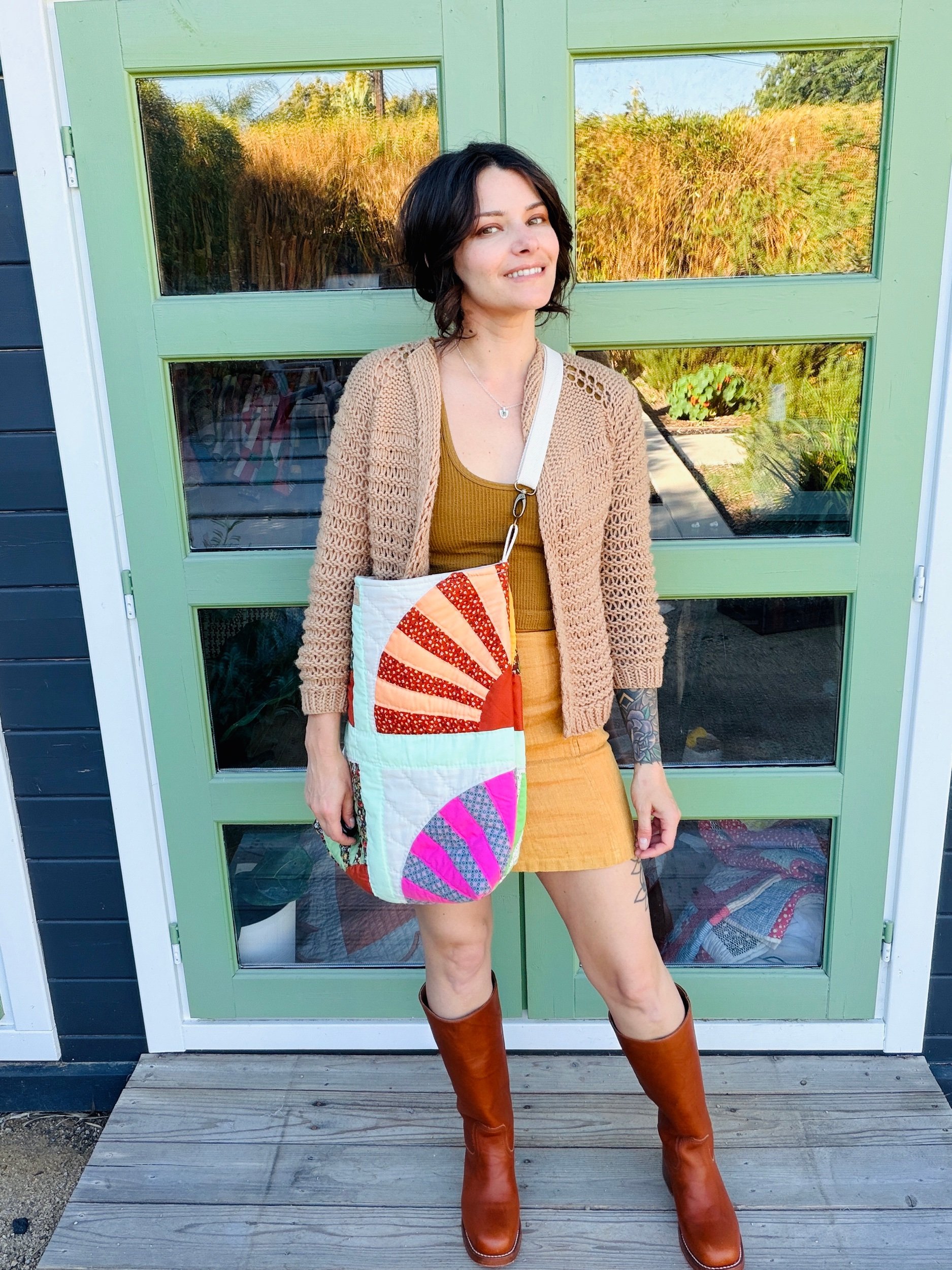 This one-of-a-kind quilted sunrise bag was handmade by me using a beautiful patchwork of sunrise quilt blocks that feel warm, bright, and a little nostalgic. Each rising sun panel brings its own mix of vintage-inspired colors and prints, giving the bag a joyful, handmade character that feels like carrying a small piece of a quilt story with you.