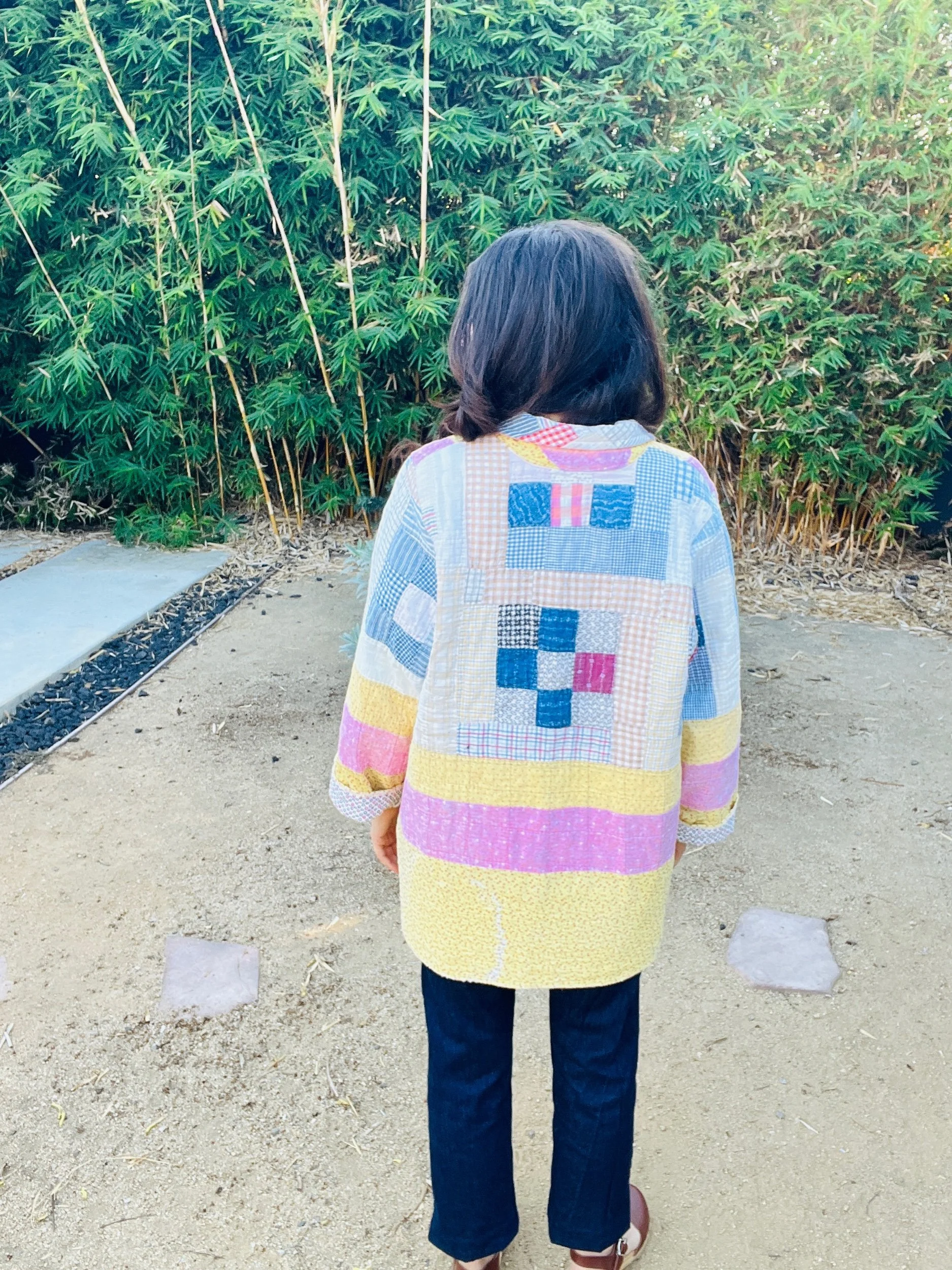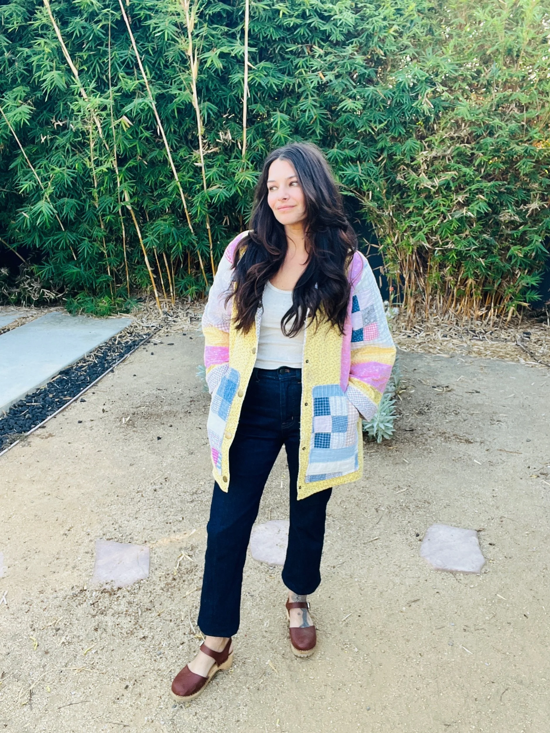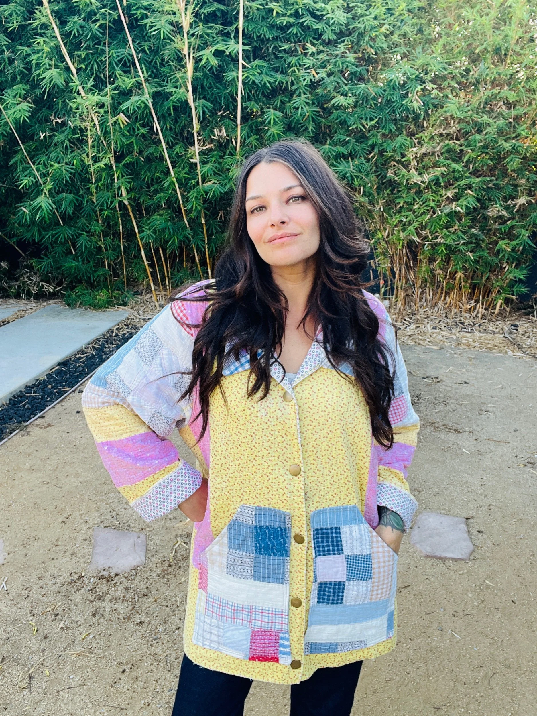 This handmade quilted grandmothers flower jacket offers unparalleled comfort and style. Crafted from an authentic 1970's grandmothers flower quilt, this jacket is truly one of a kind. Its vintage fabric brings a unique character and history, ensuring you stand out wherever you go. At the heart of this piece is sustainable fashion—repurposing timeless materials to create something fresh and eco-friendly. Embrace a jacket that’s not only comfortable and chic but also tells a story with every stitch.