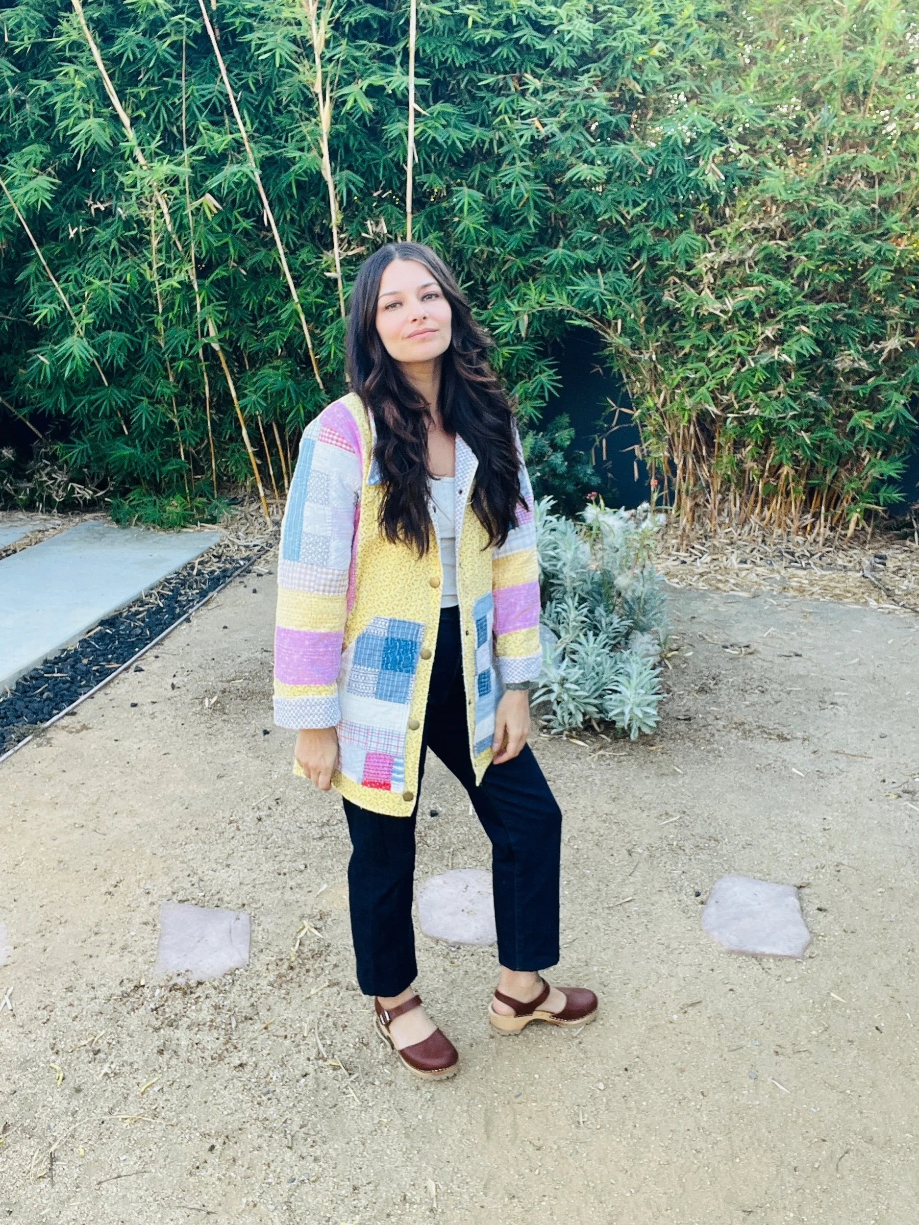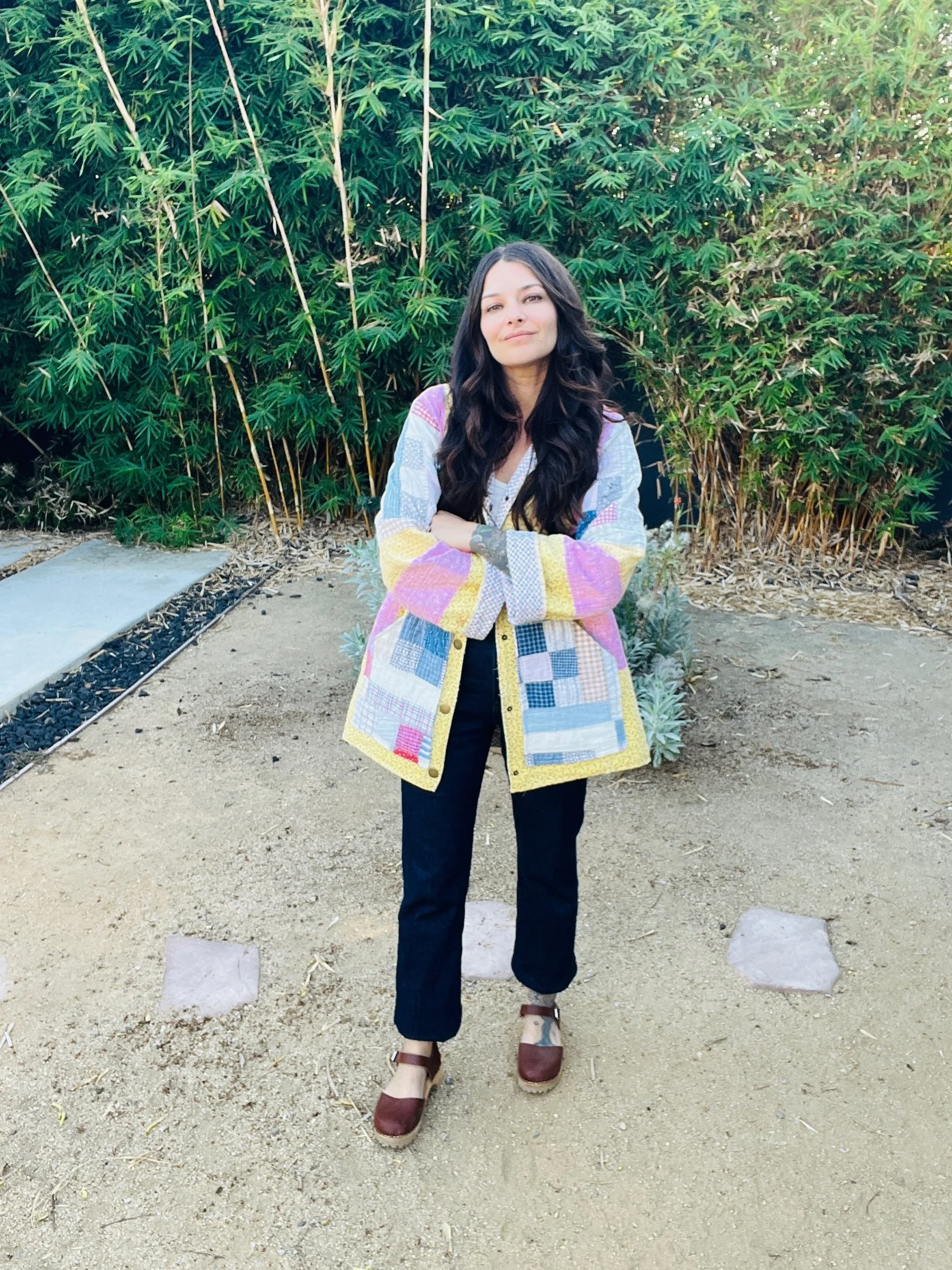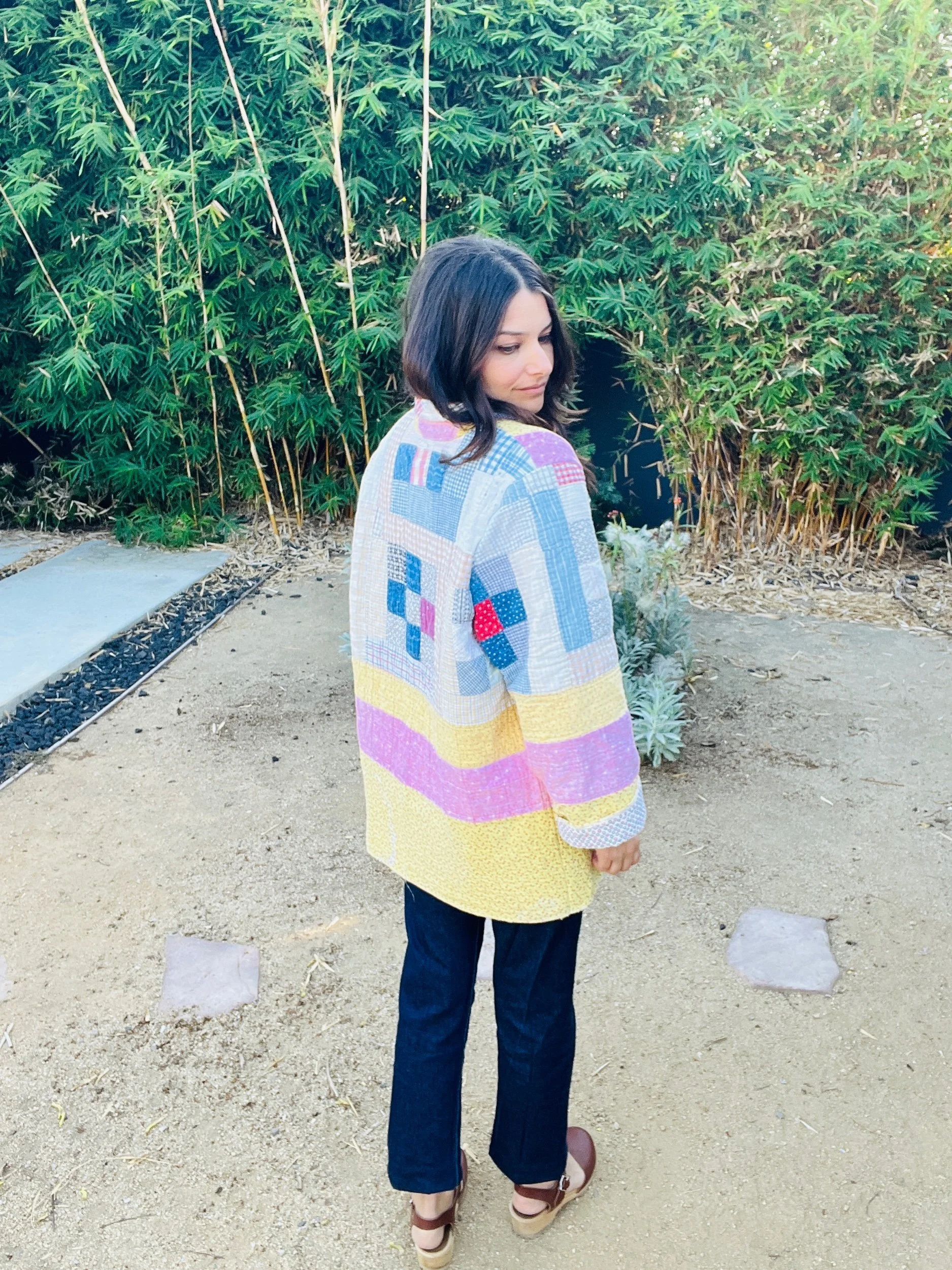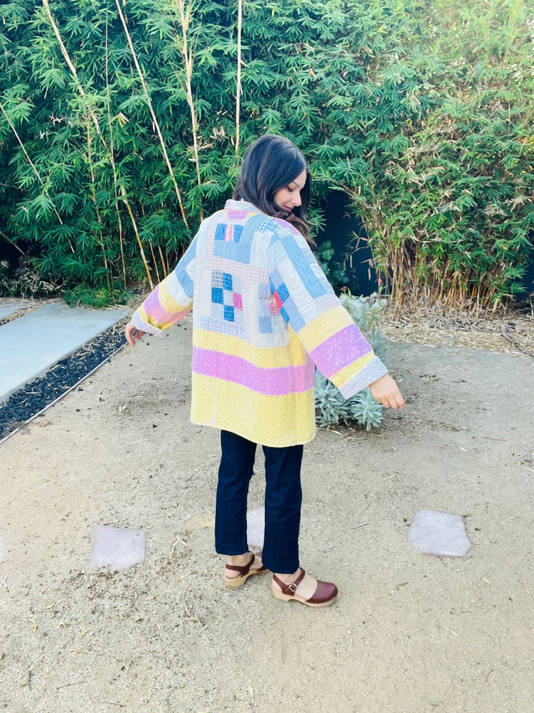 This handmade quilted grandmothers flower jacket offers unparalleled comfort and style. Crafted from an authentic 1970's grandmothers flower quilt, this jacket is truly one of a kind. Its vintage fabric brings a unique character and history, ensuring you stand out wherever you go. At the heart of this piece is sustainable fashion—repurposing timeless materials to create something fresh and eco-friendly. Embrace a jacket that’s not only comfortable and chic but also tells a story with every stitch.