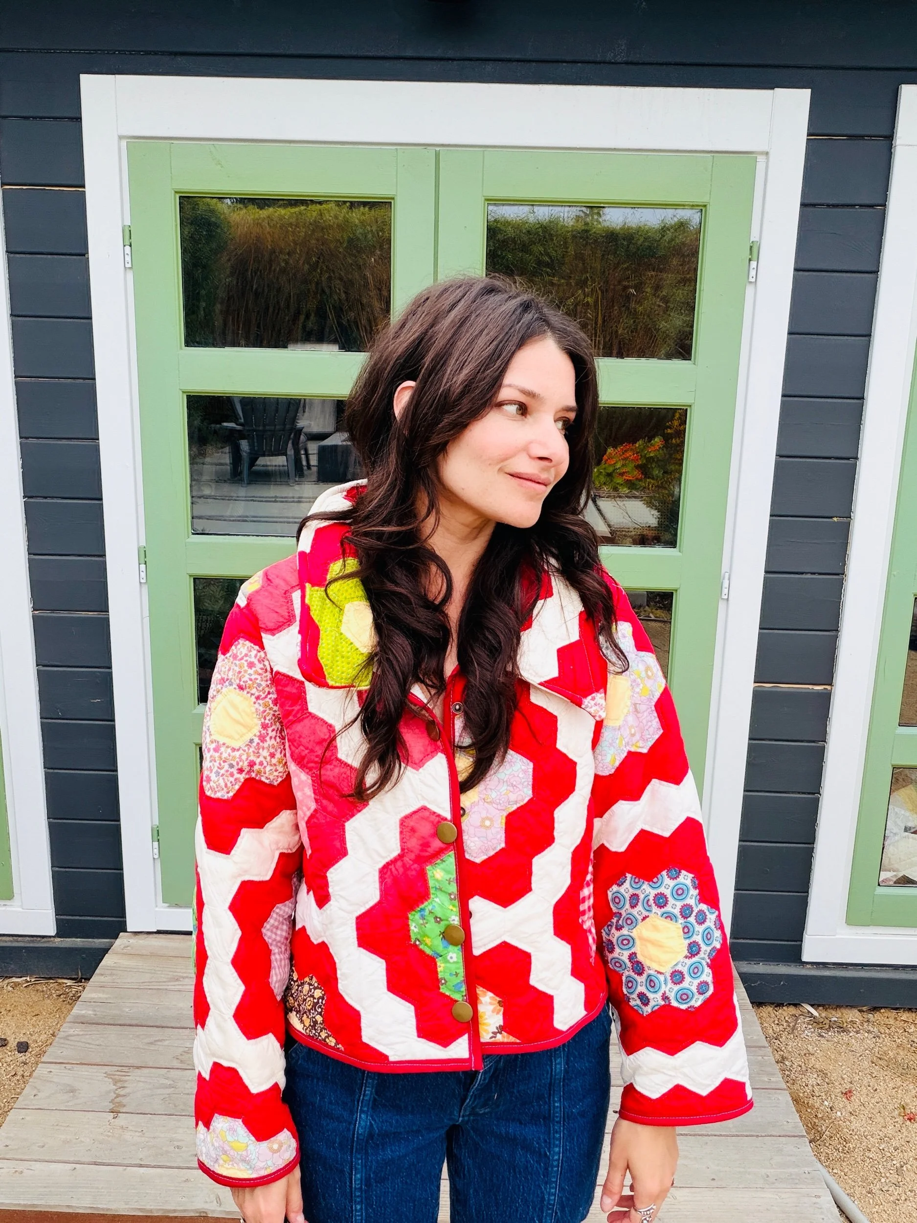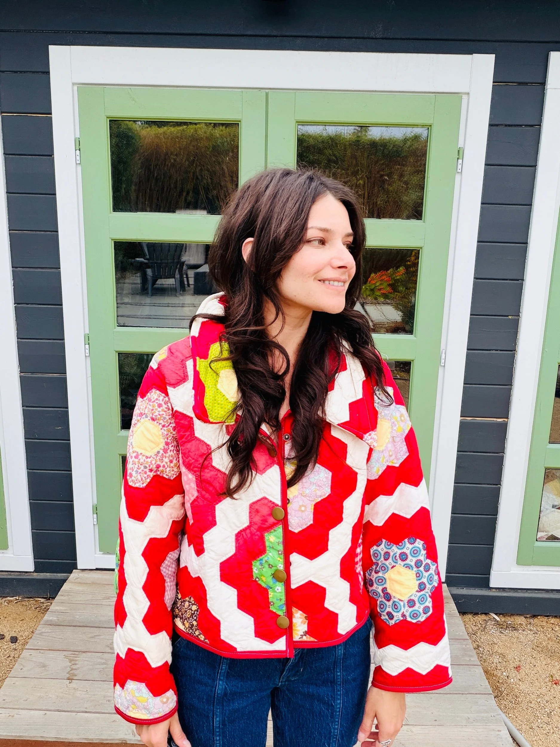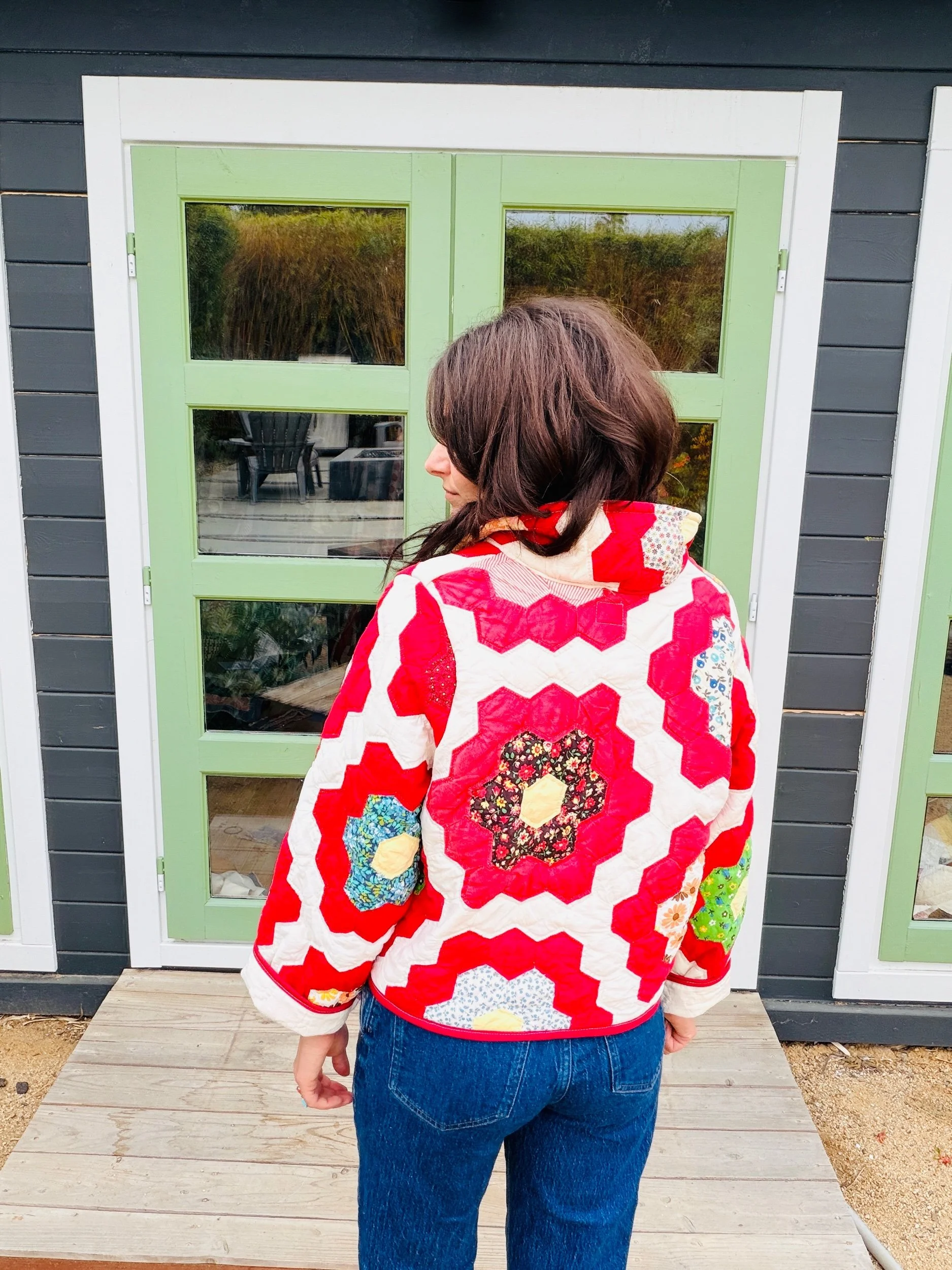 It’s a vintage quilt made into a crop jacket giving it a modern twist making it a great addition to any wardrobe.
