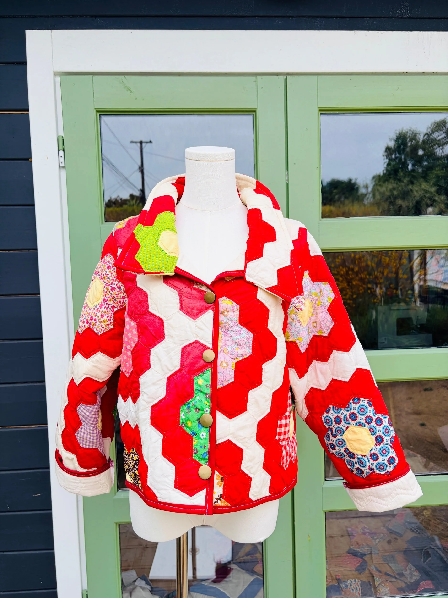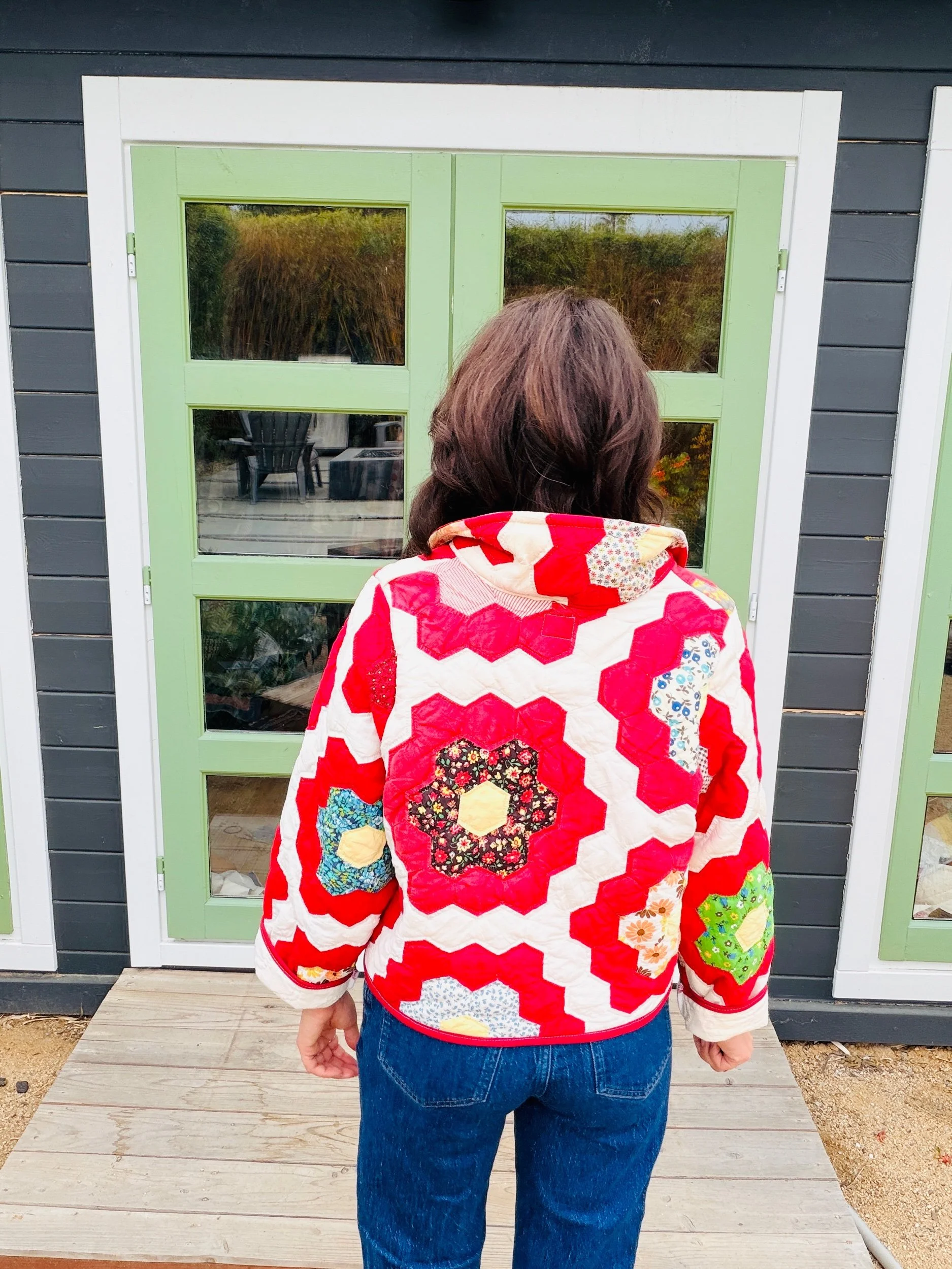 This 1940’s patchwork quilt jacket is truly one of a kind and incredibly comfortable. athere are beautiful red grandmothers flower’s all throughout handmade in Kentucky.