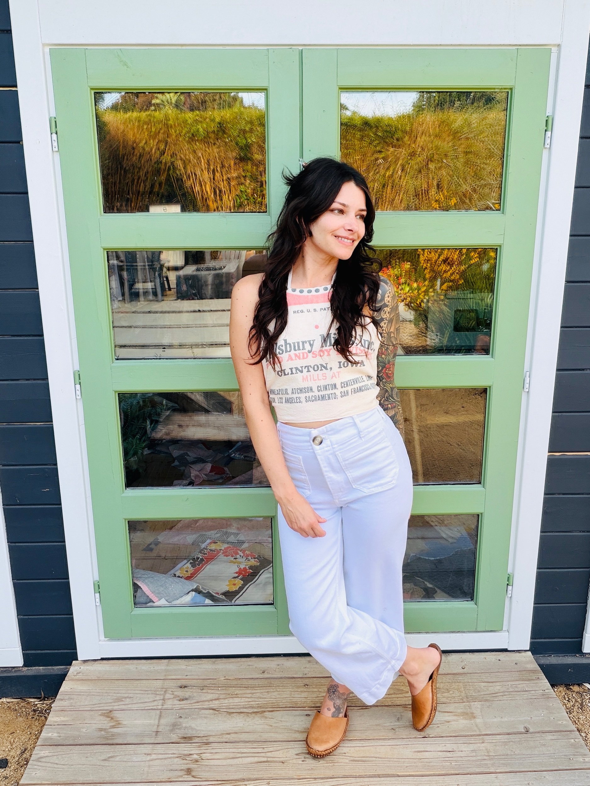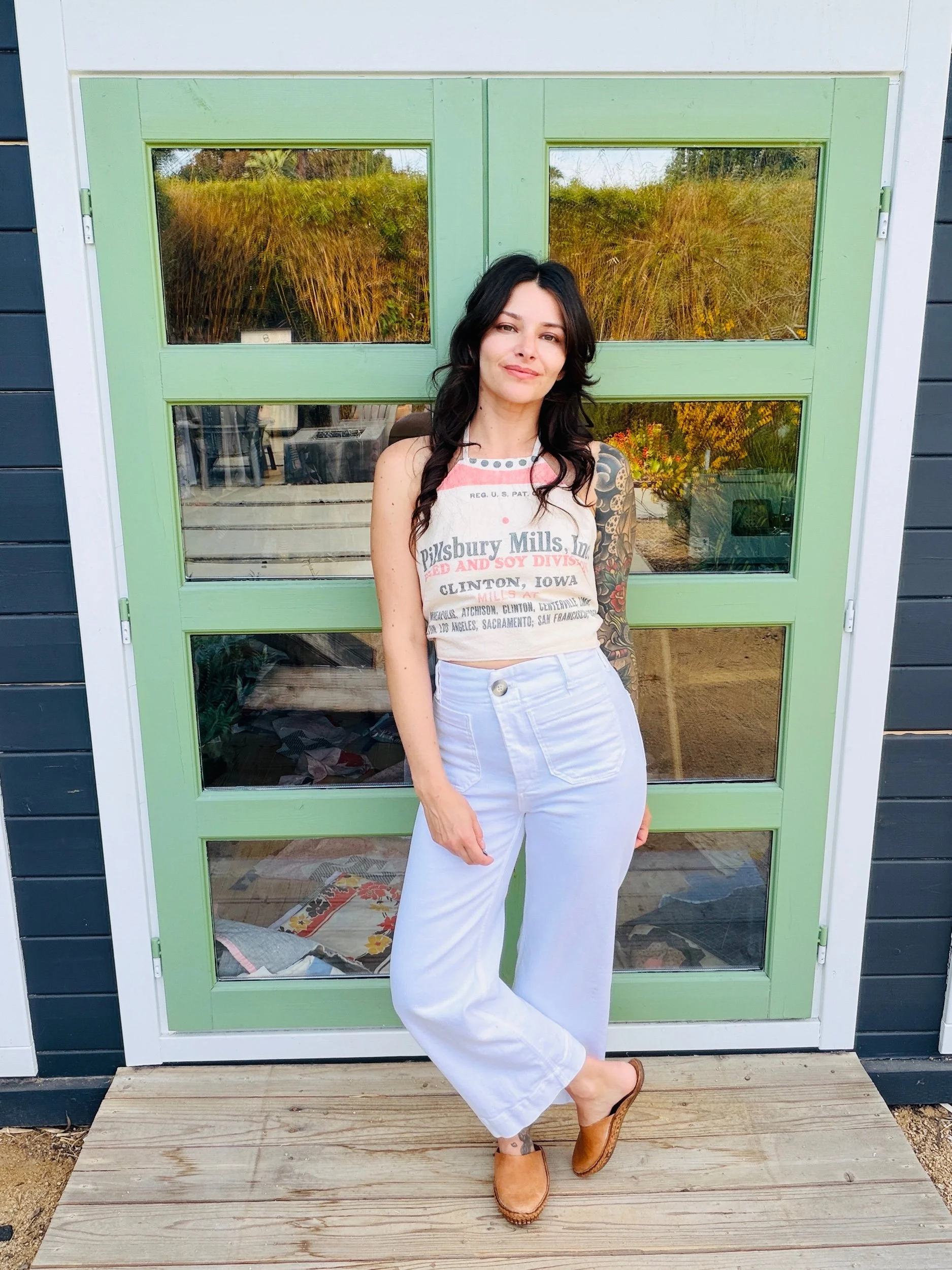 Handmade feed sack halter top made from vintage grain sack textile, with timeworn lettering that carries all the character of a well-lived past. Lined in soft linen for comfort, with adjustable ties for an easy, flattering fit.
