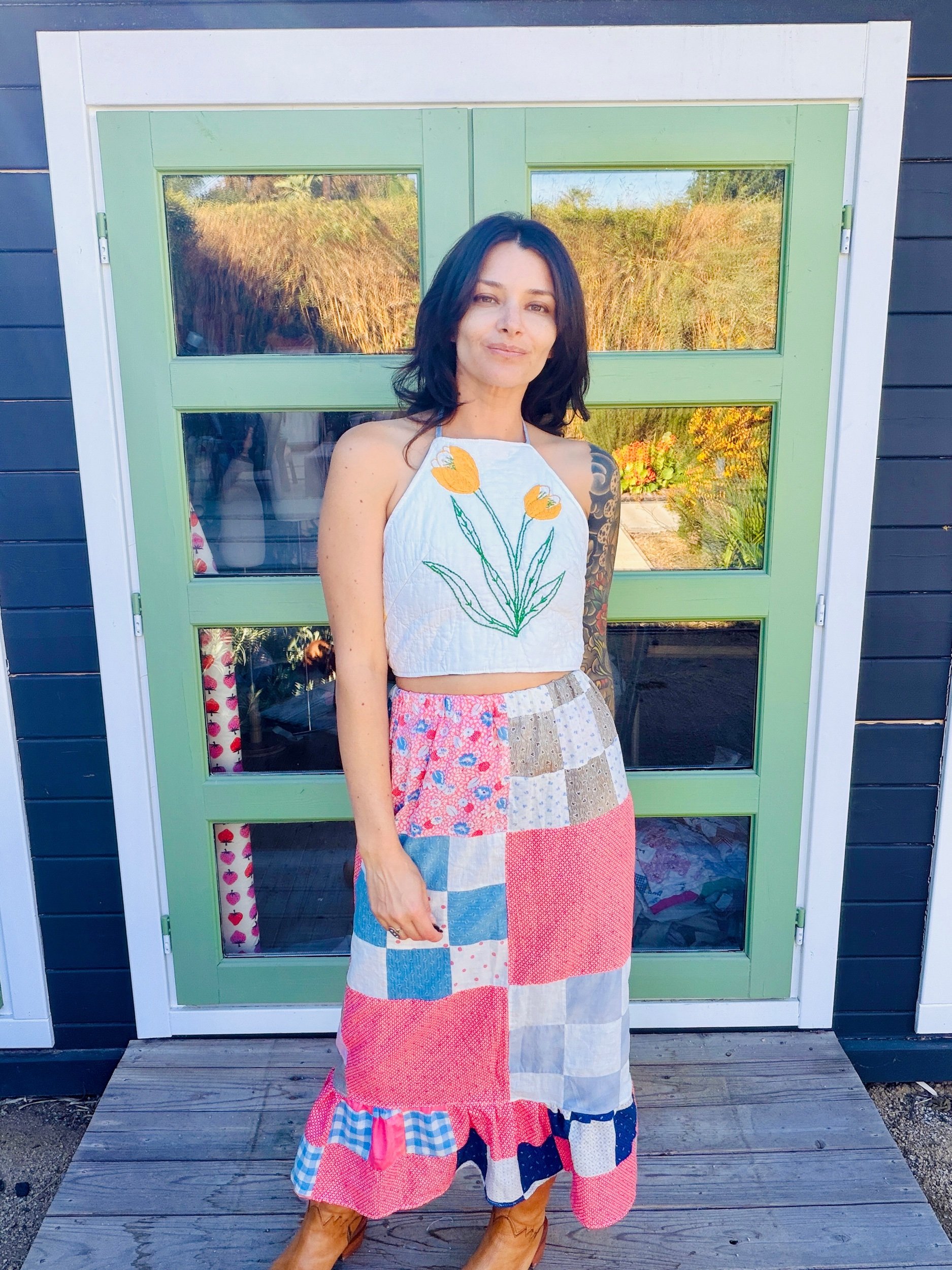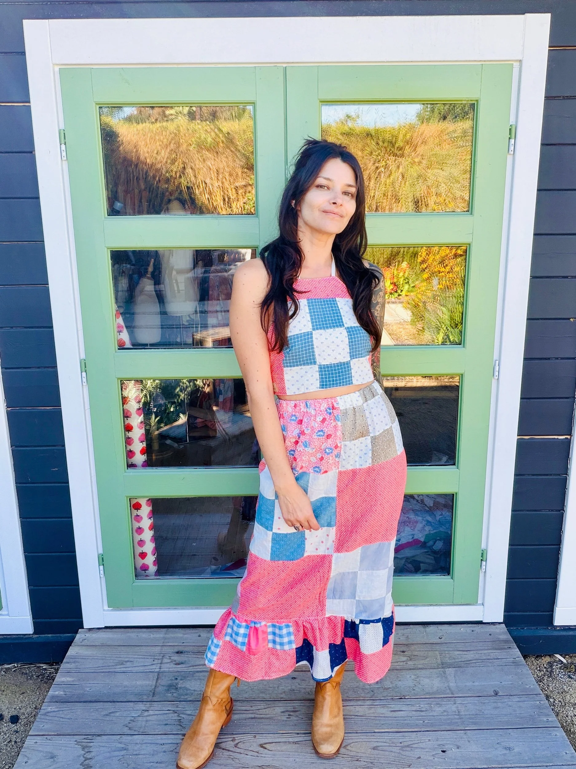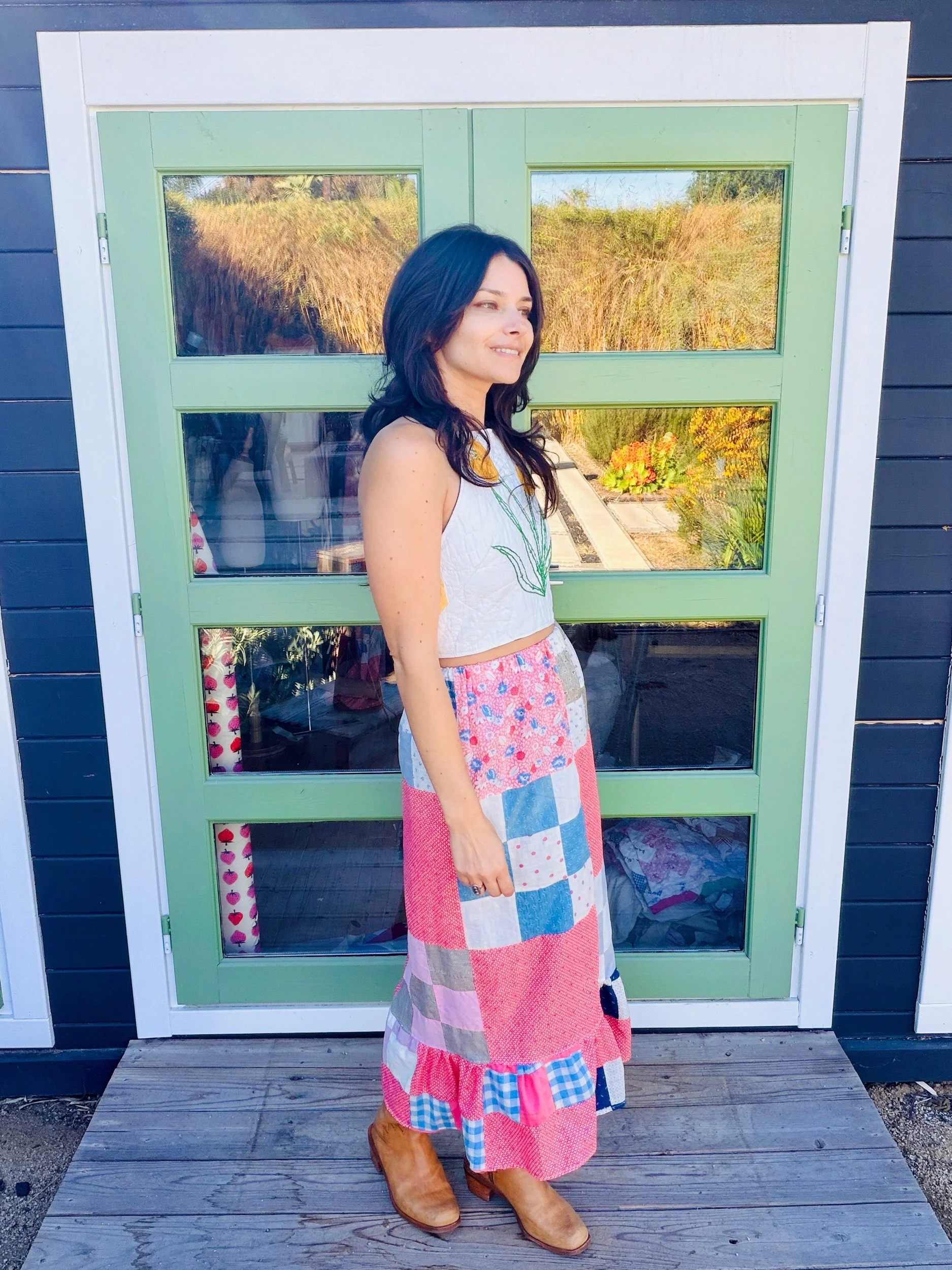 This quilted skirt is a unique piece crafted from a finished quilt top dating back to the 1940s, showcasing an exquisite design and remarkable condition.