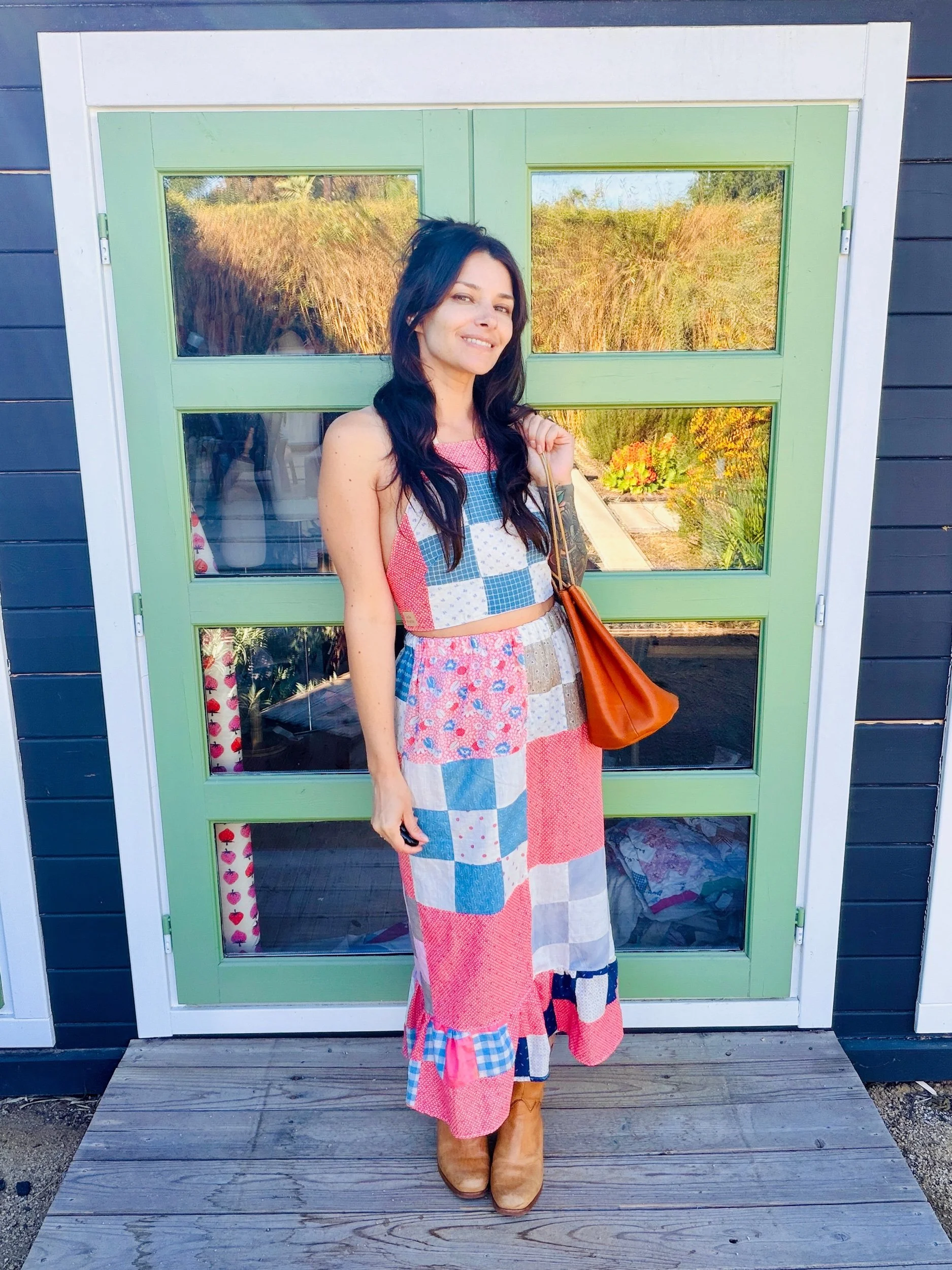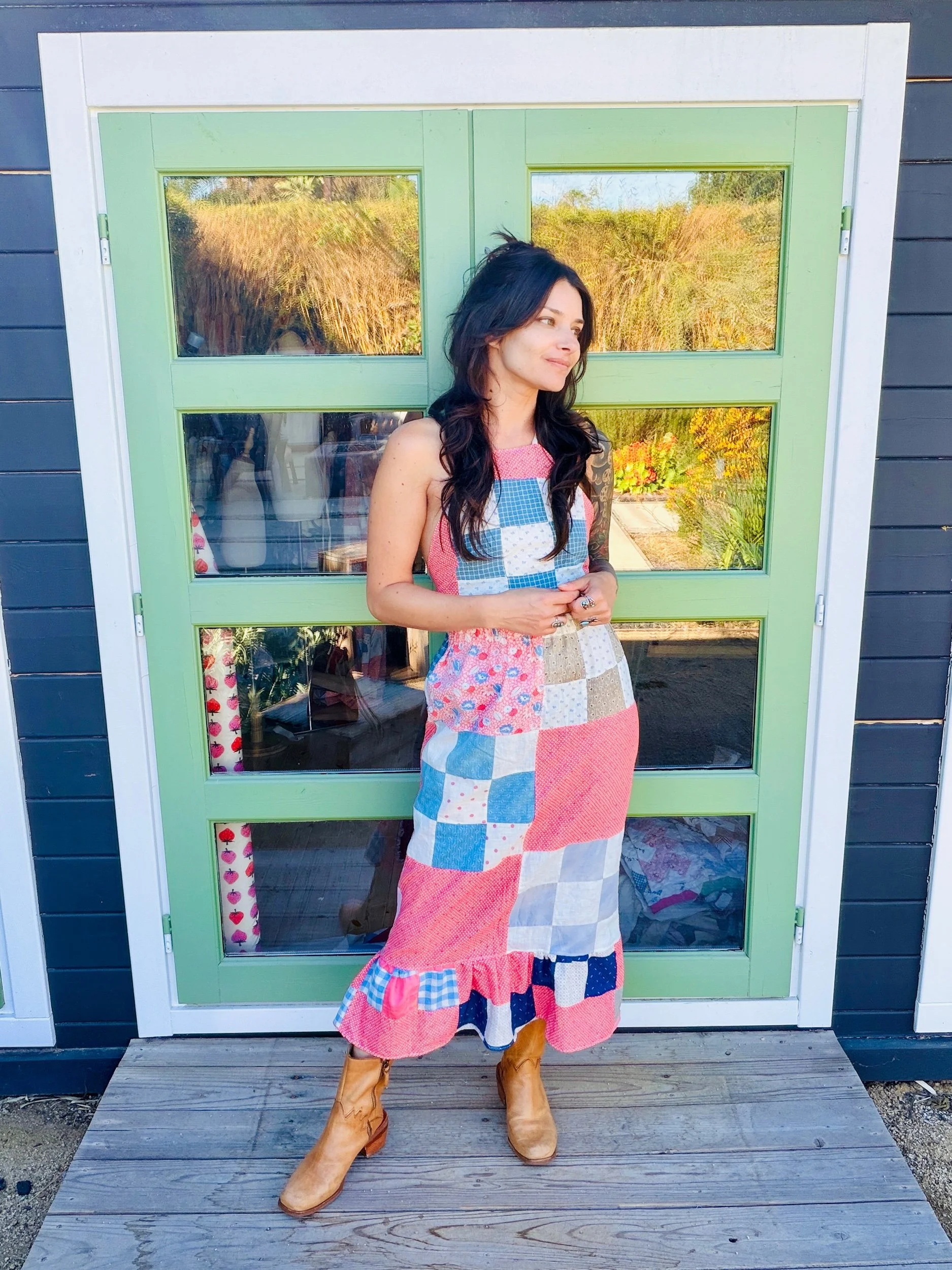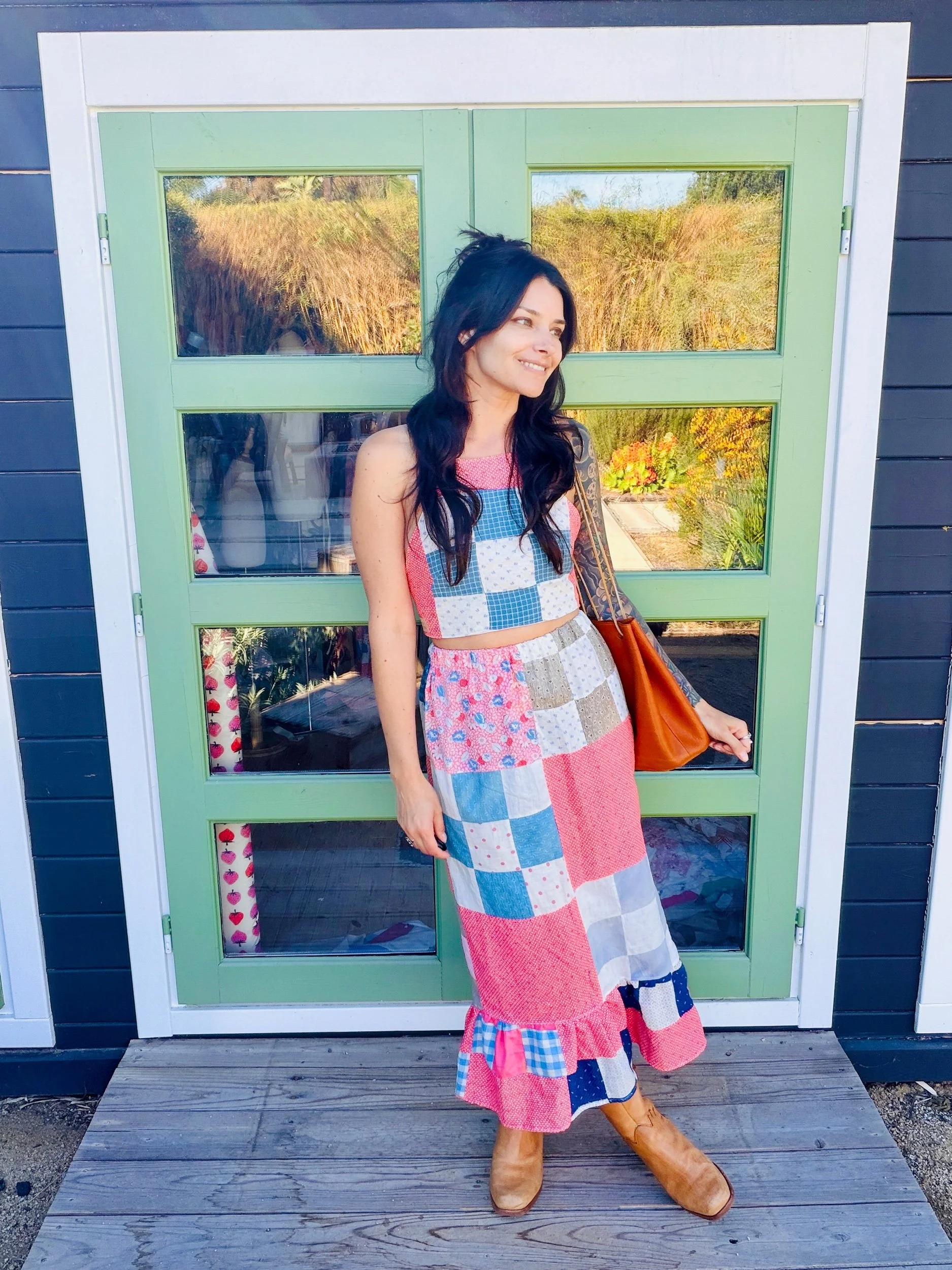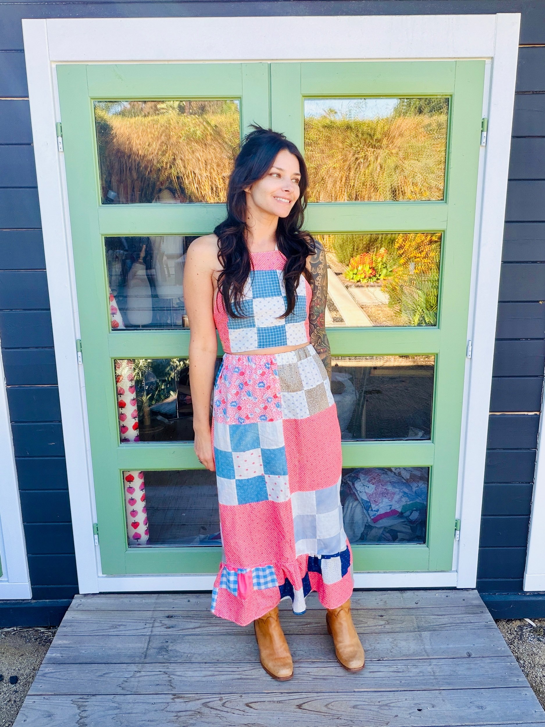 This quilted skirt is a unique piece crafted from a finished quilt top dating back to the 1940s, showcasing an exquisite design and remarkable condition.