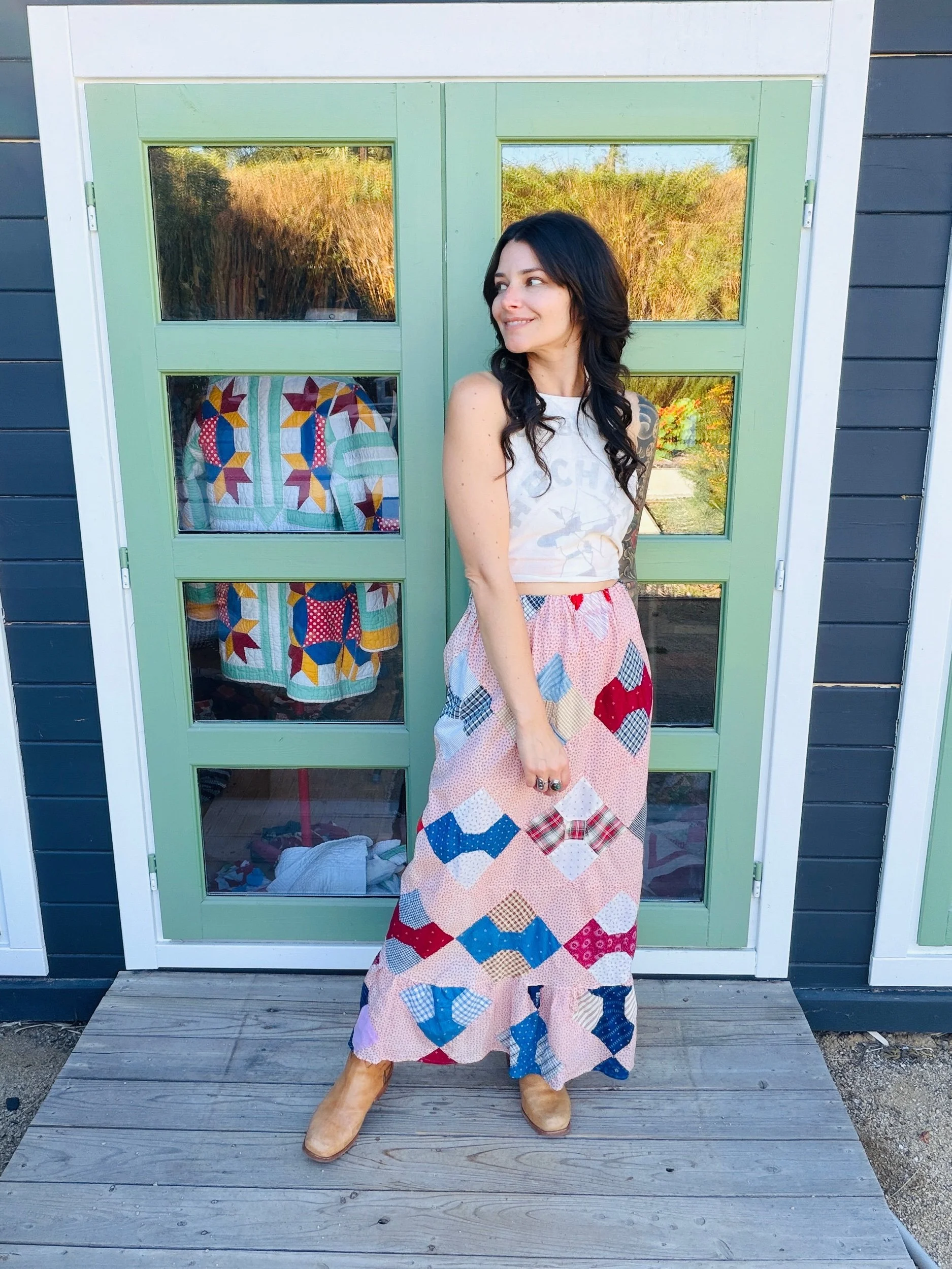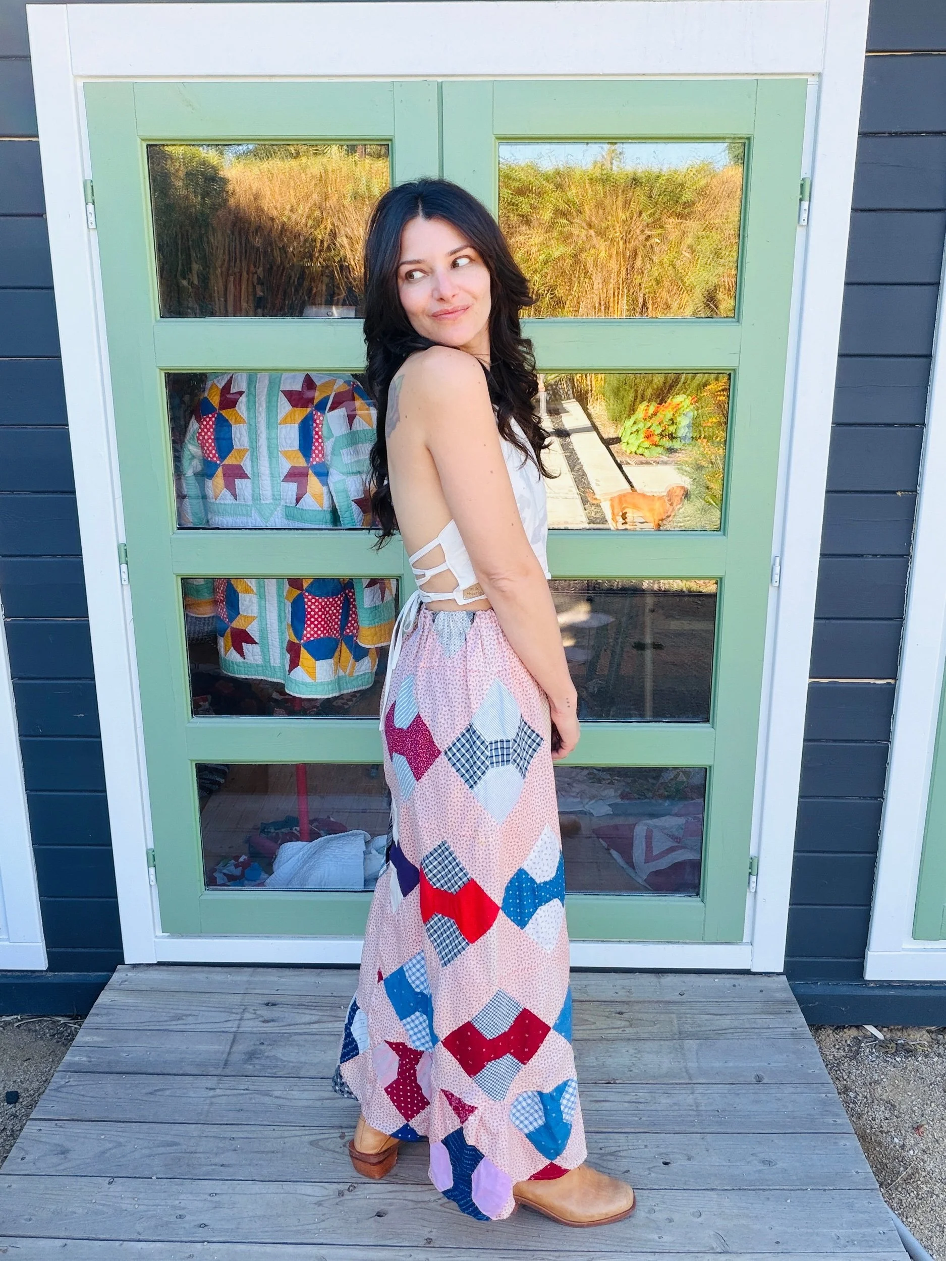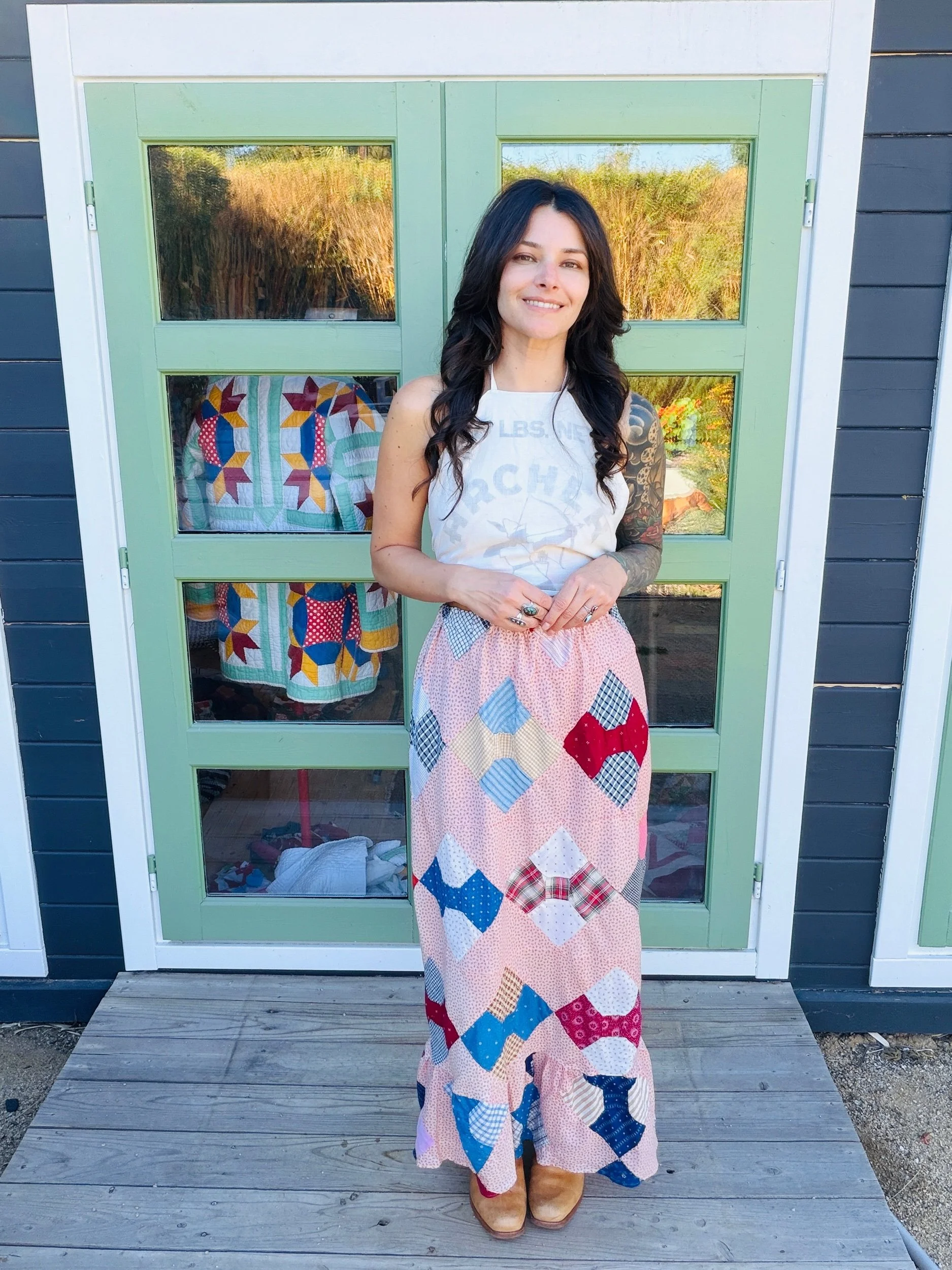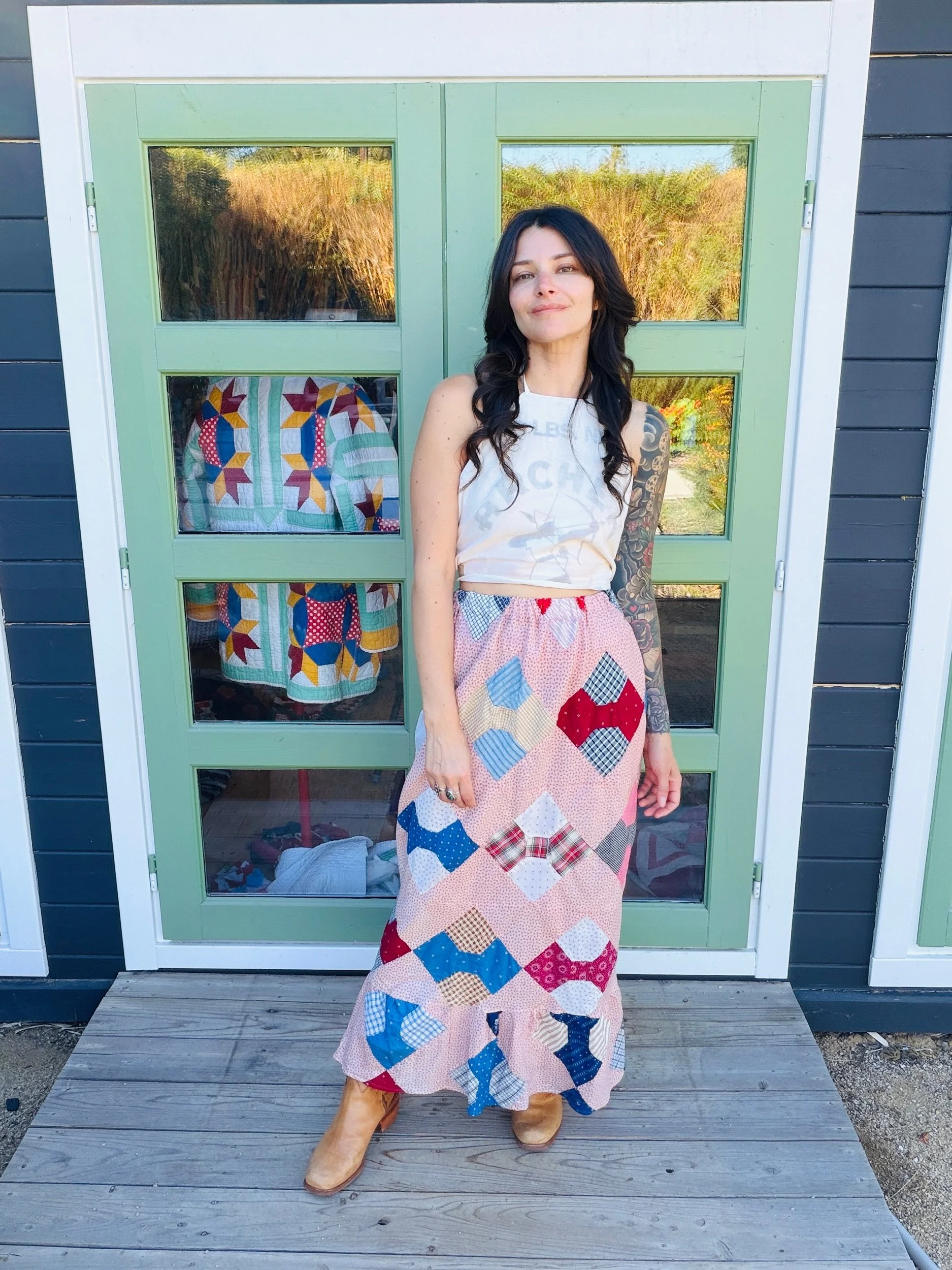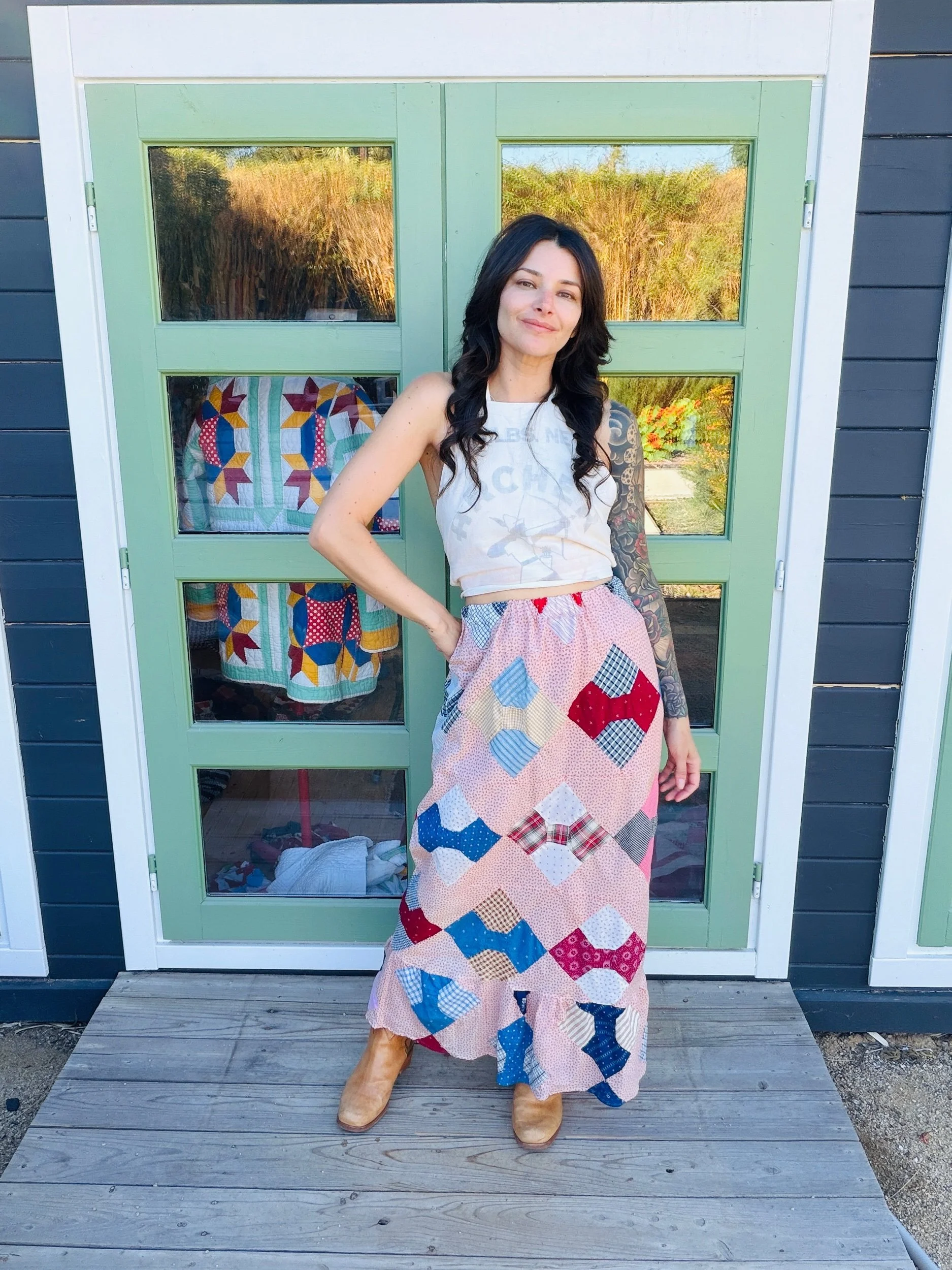 This one-of-a-kind handmade prairie skirt is crafted from a carefully sourced vintage quilt top, giving new life to a beautiful piece of textile history. Each skirt tells its own story through time-softened fabrics, intricate patchwork, and gentle signs of age that make it truly unique.