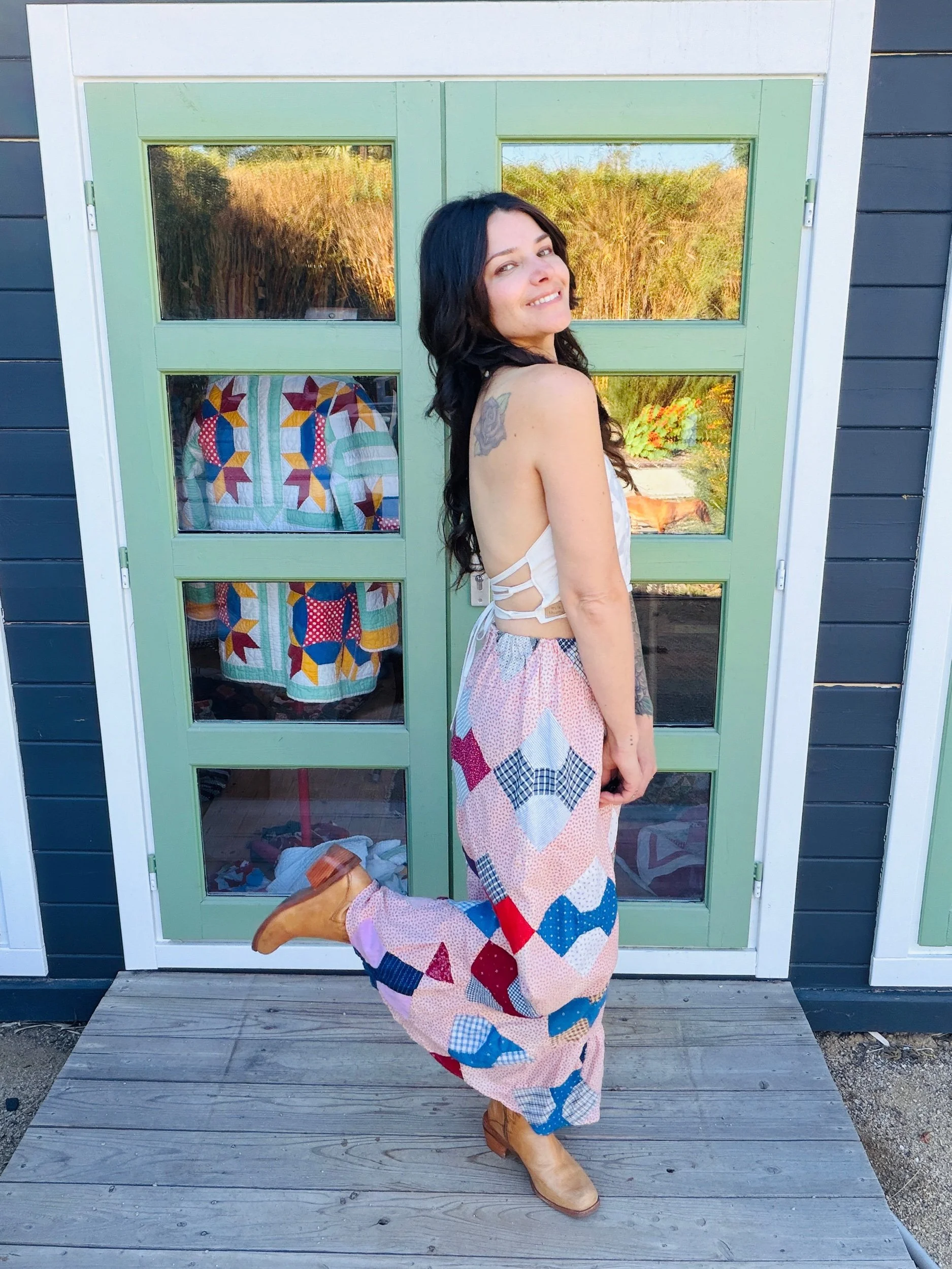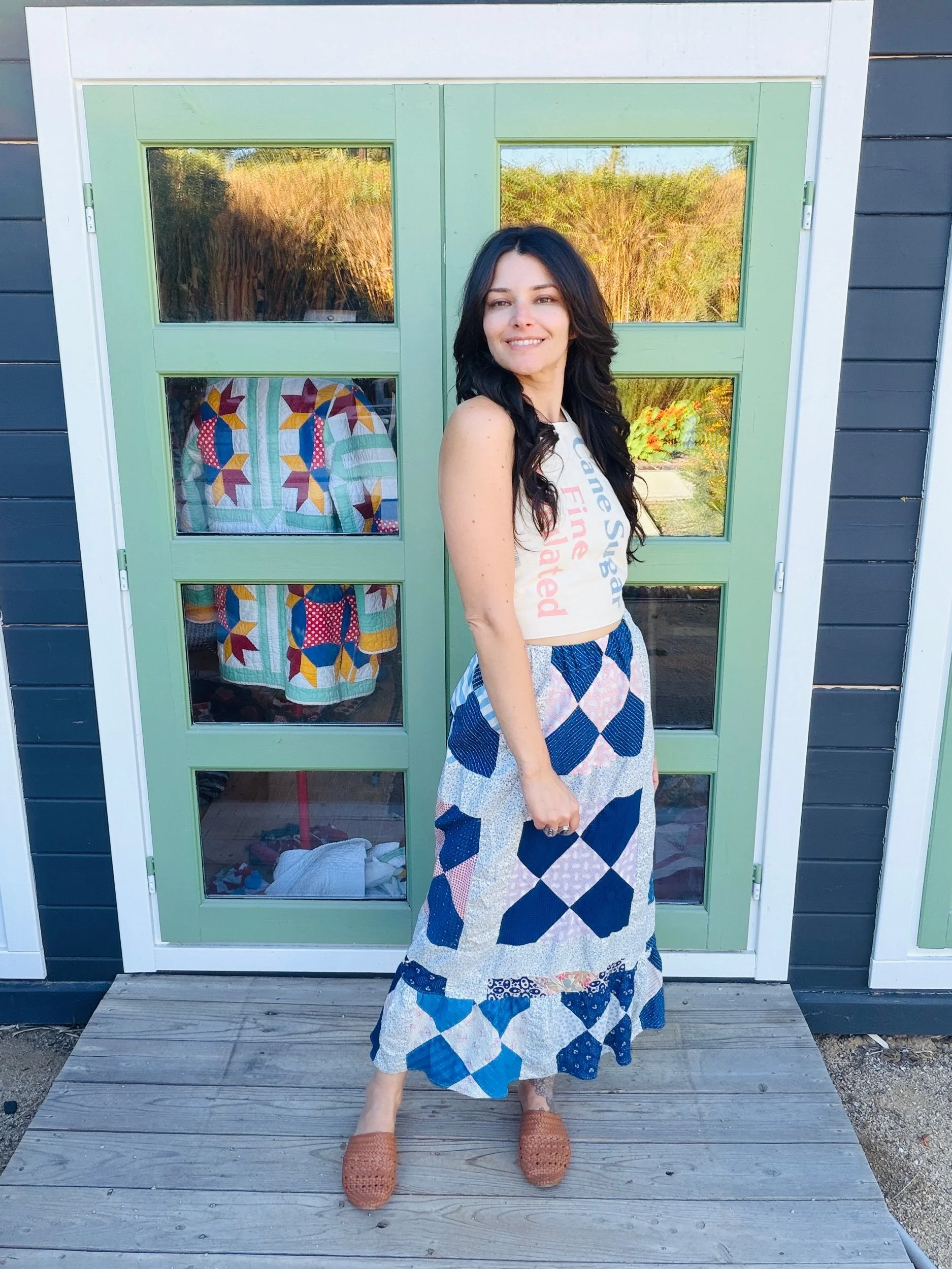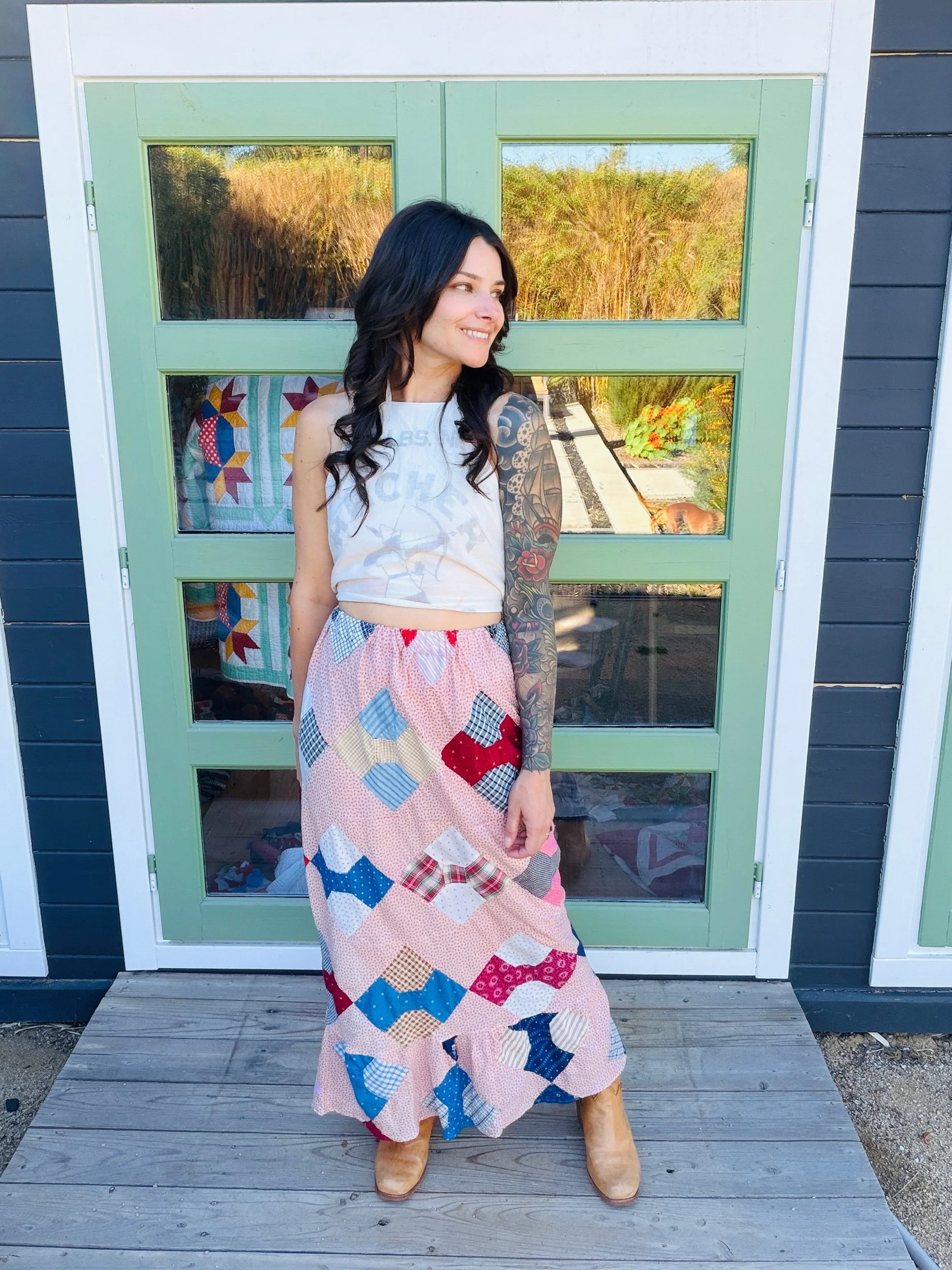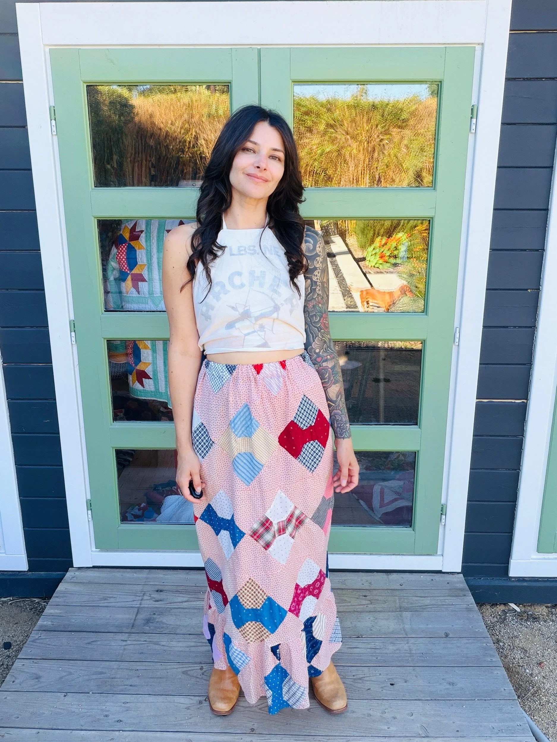 This one-of-a-kind handmade prairie skirt is crafted from a carefully sourced vintage quilt top, giving new life to a beautiful piece of textile history. Each skirt tells its own story through time-softened fabrics, intricate patchwork, and gentle signs of age that make it truly unique.
