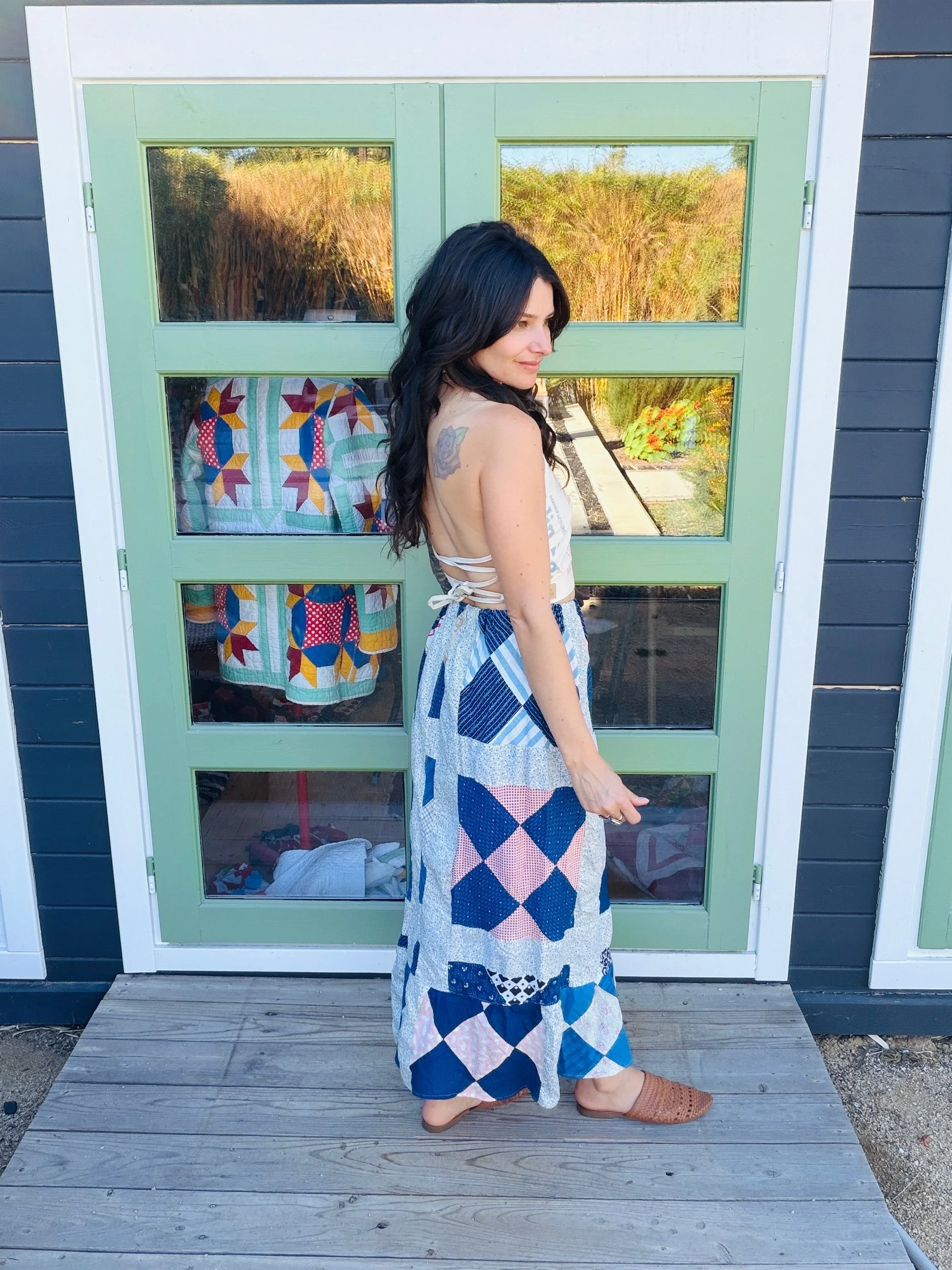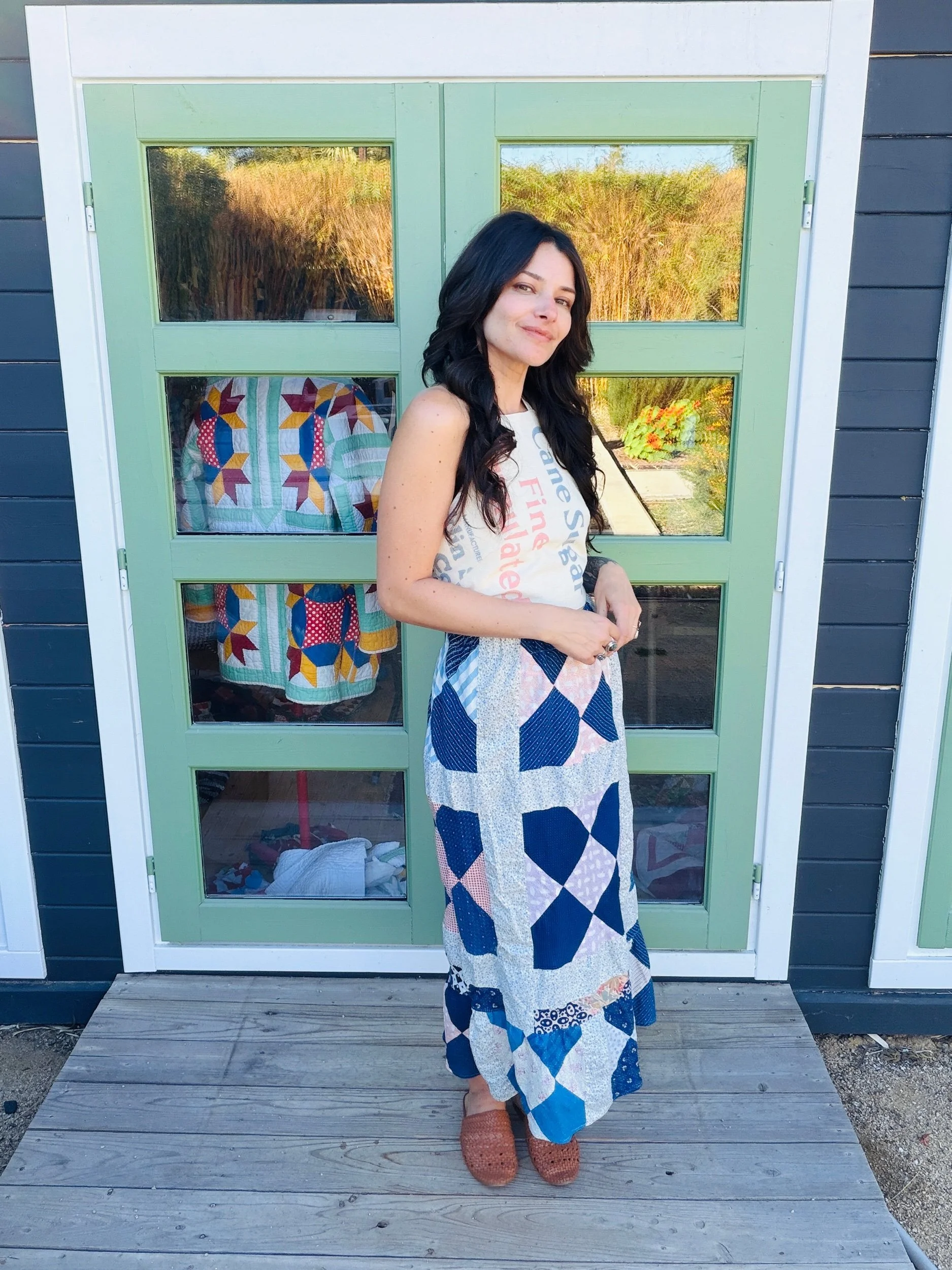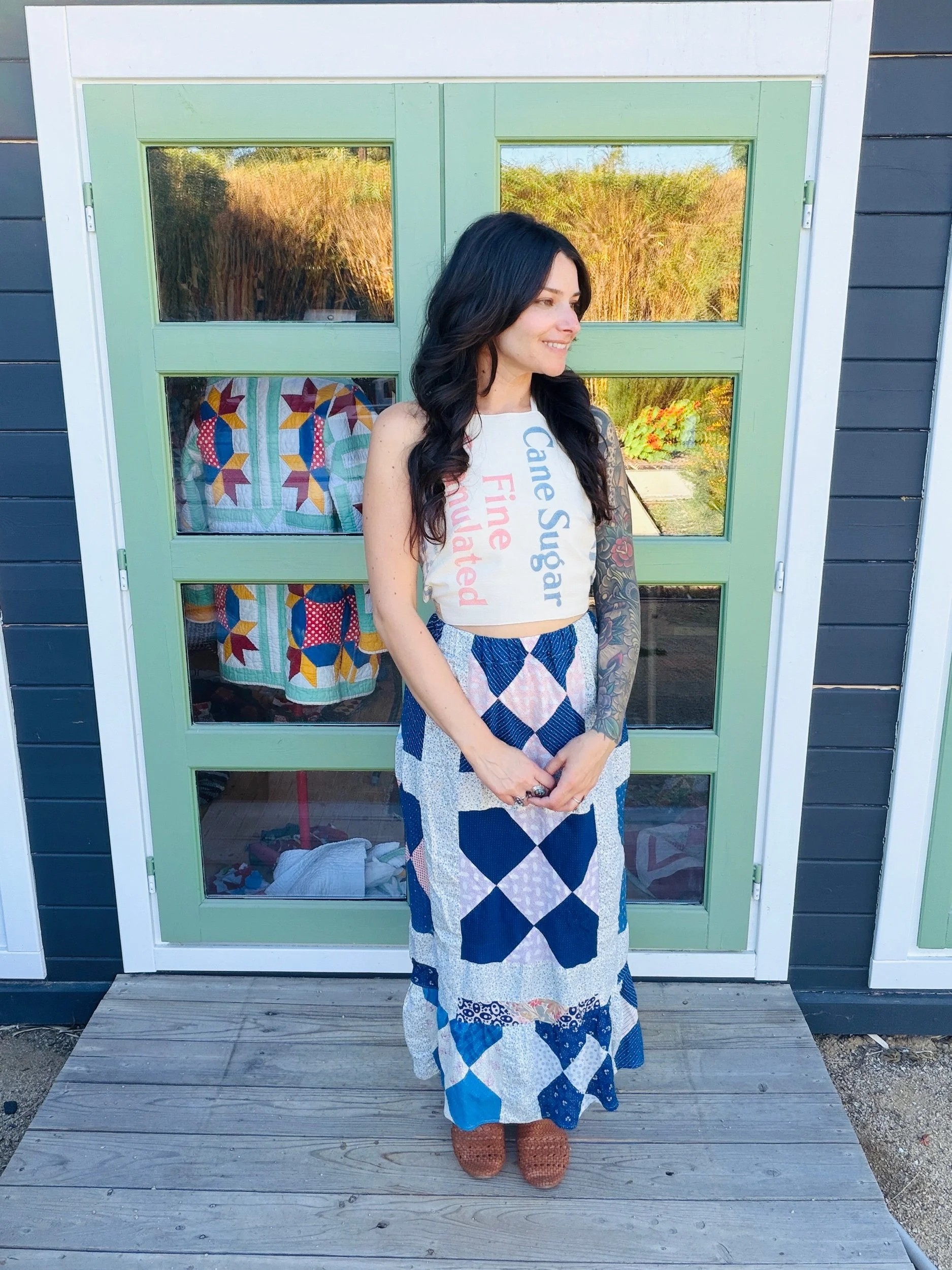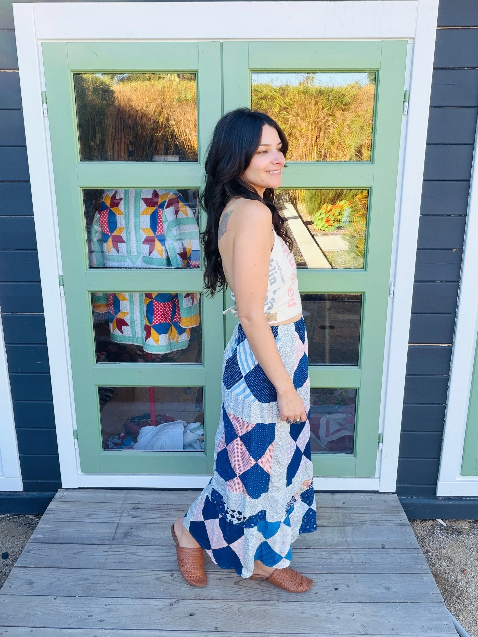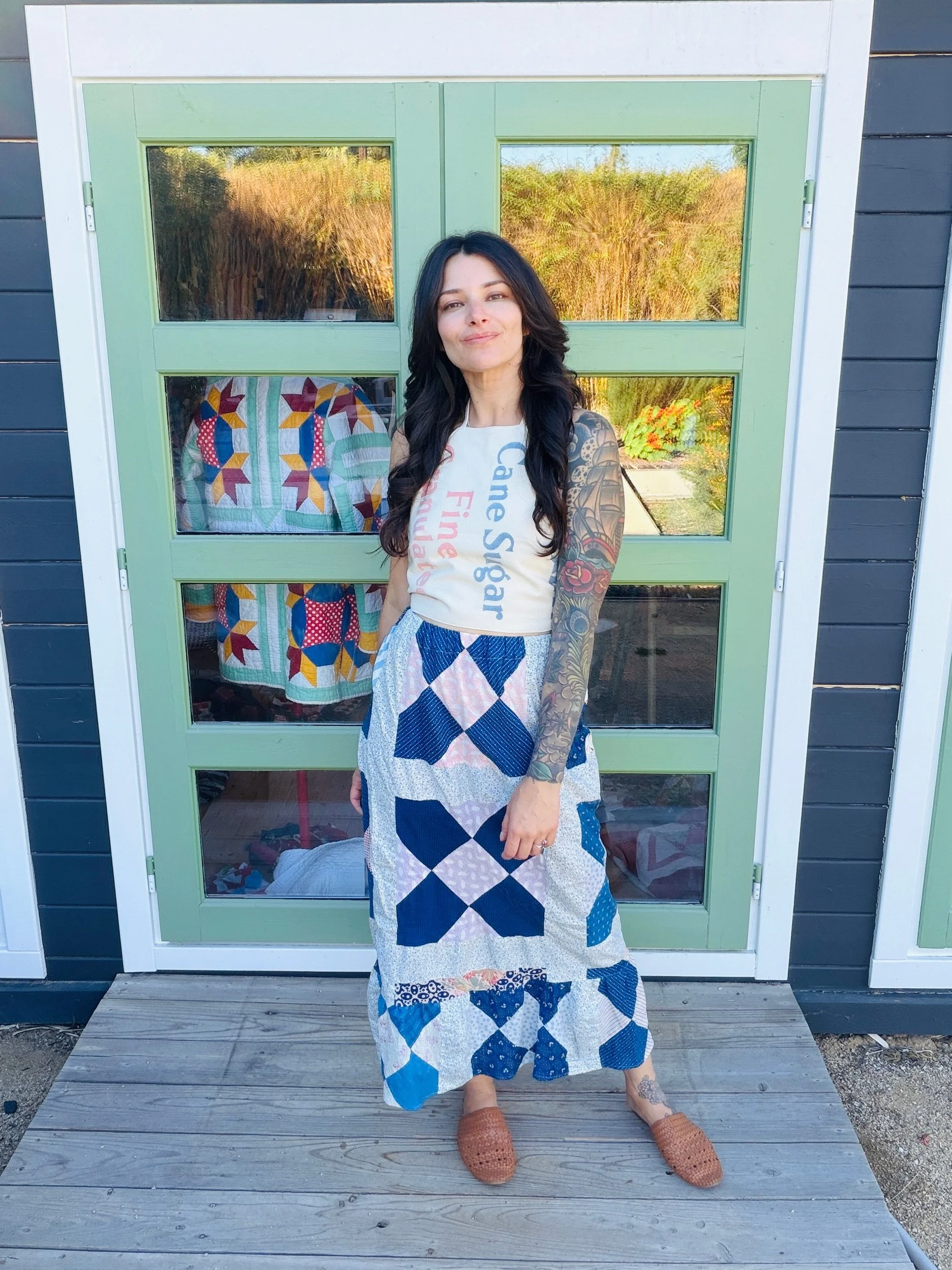 This one-of-a-kind handmade prairie skirt is crafted from a carefully sourced vintage quilt top, giving new life to a beautiful piece of textile history. Each skirt tells its own story through time-softened fabrics, intricate patchwork, and gentle signs of age that make it truly unique.
