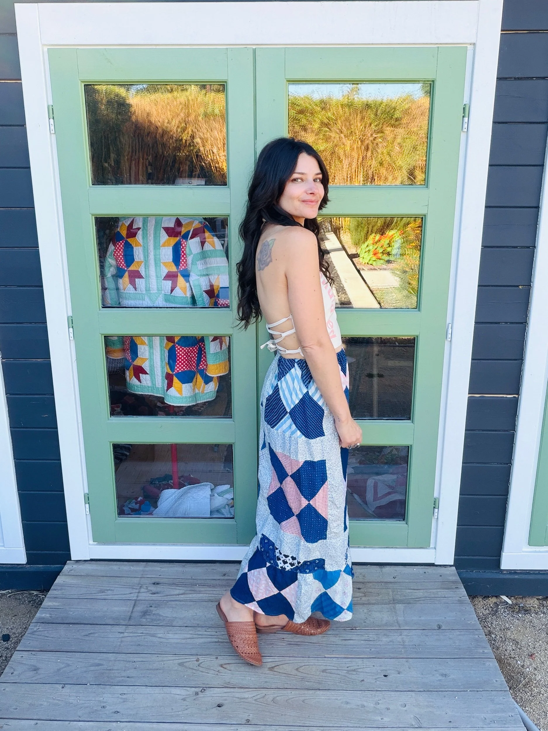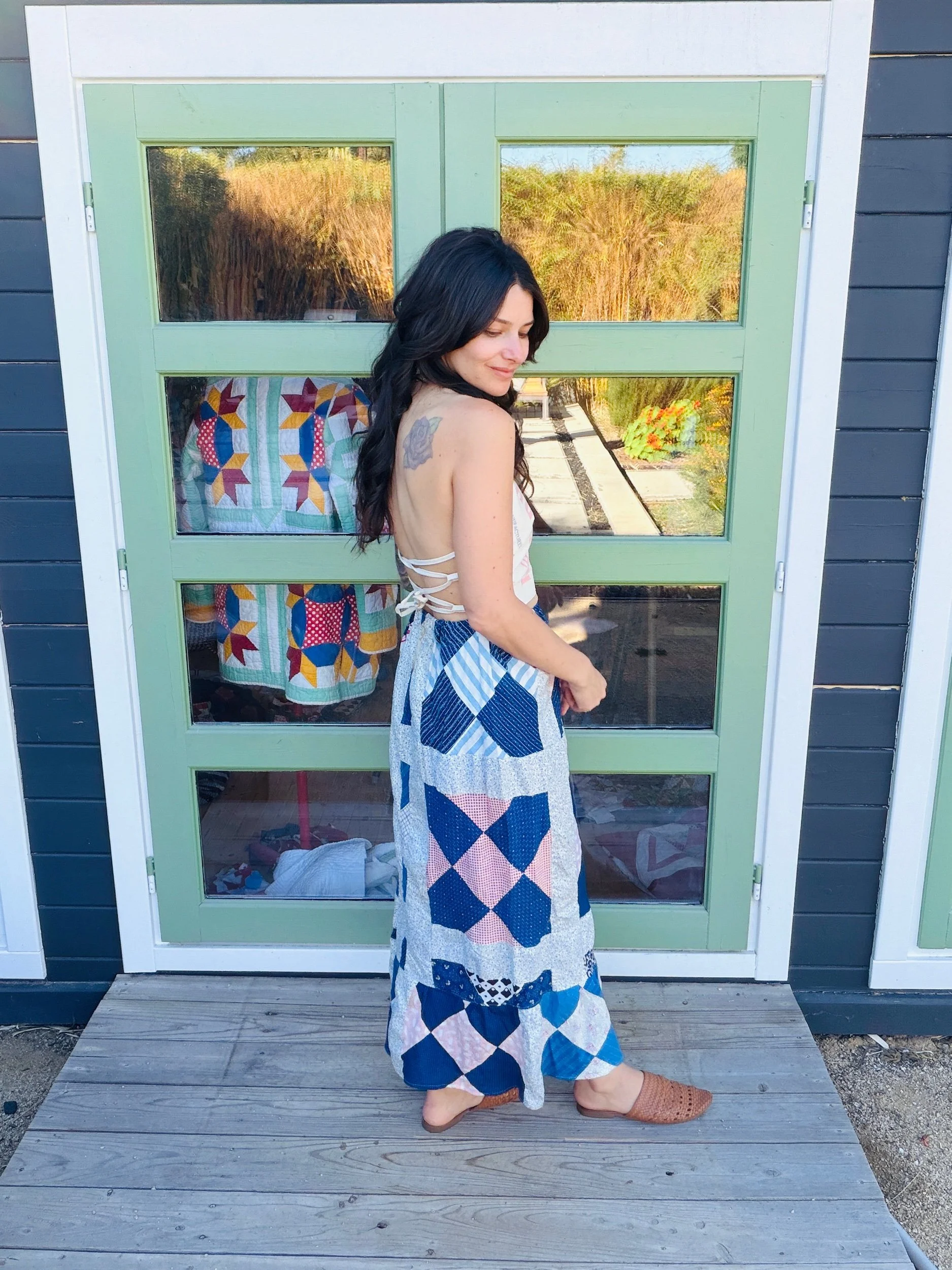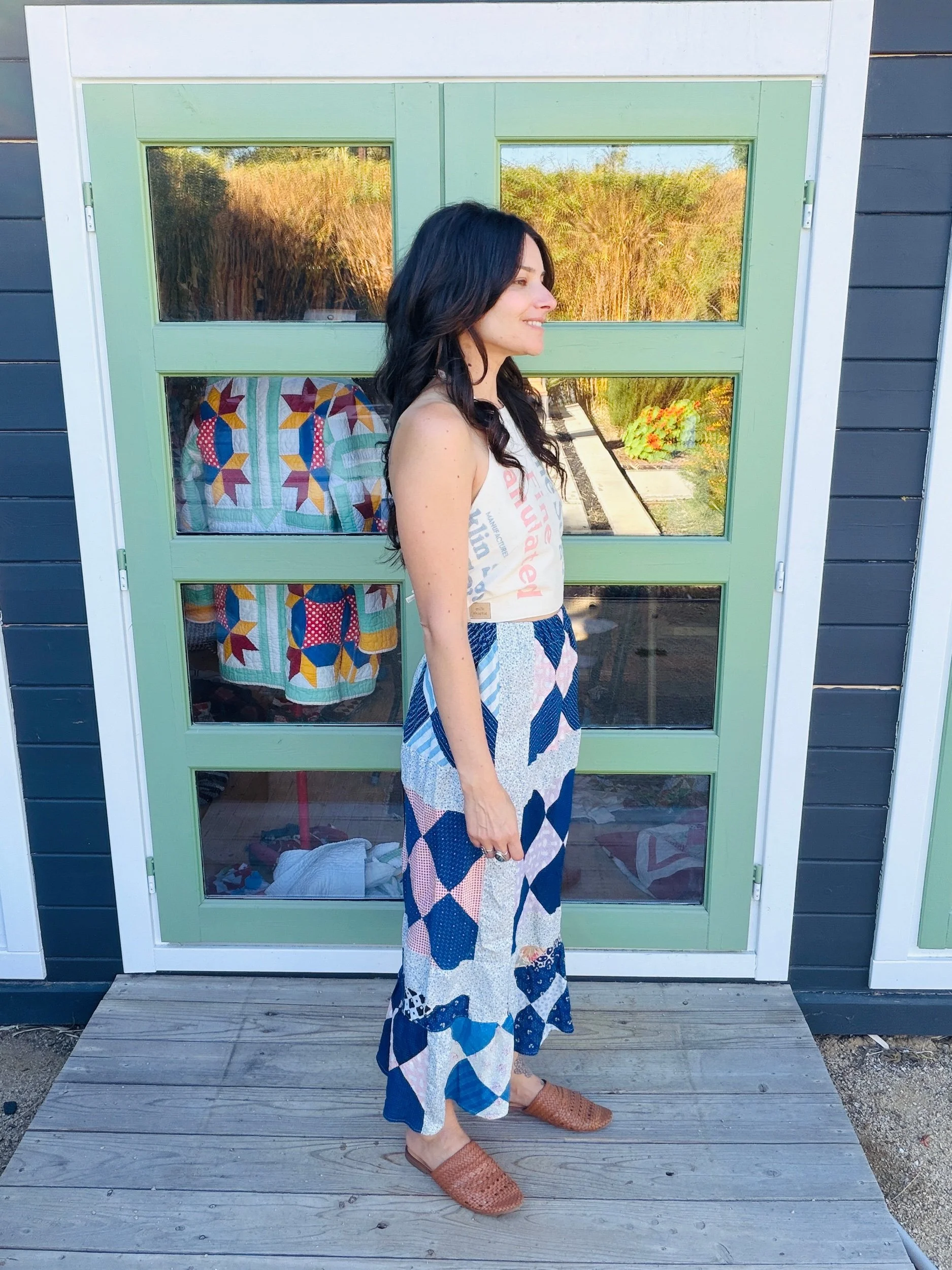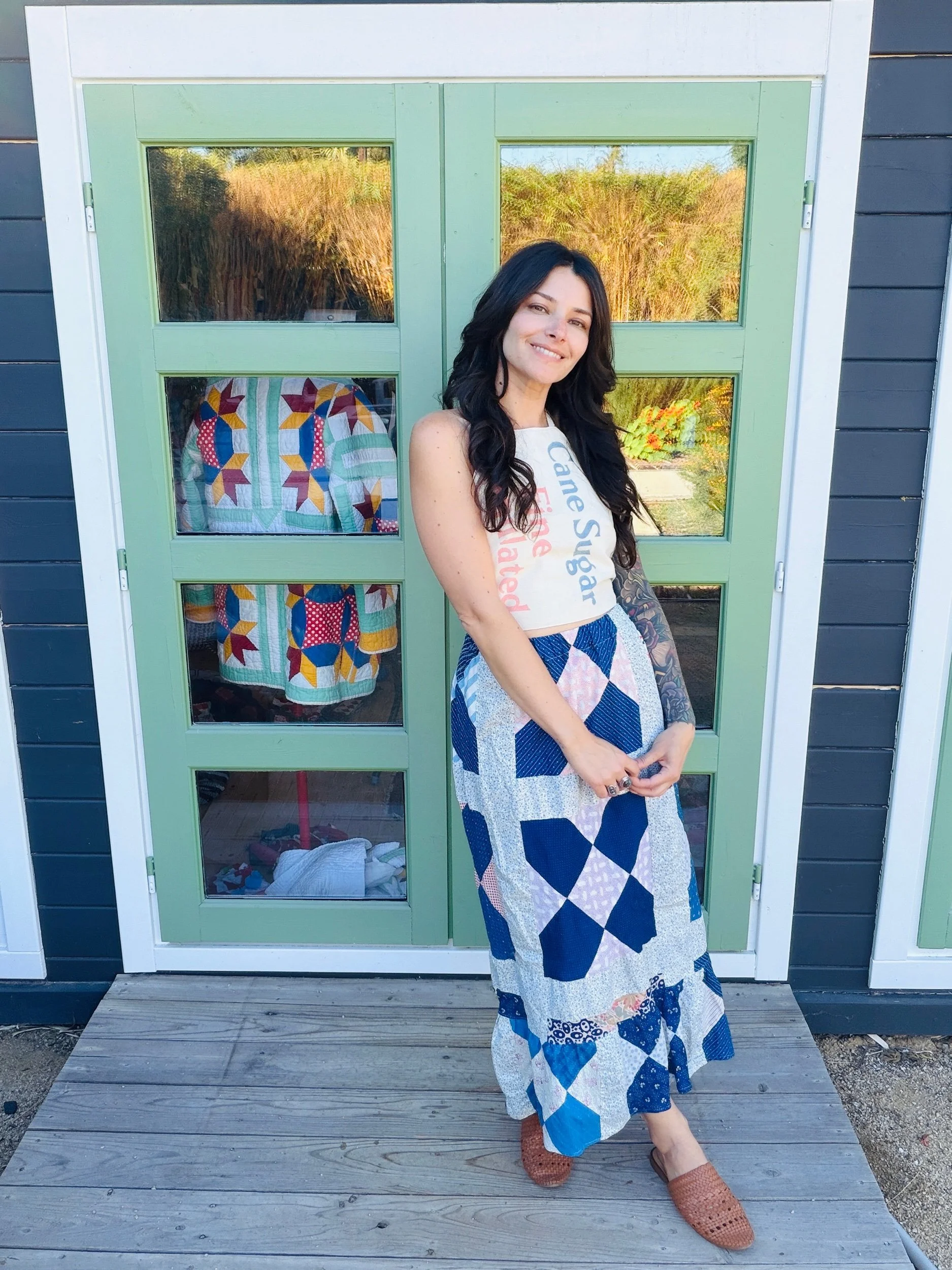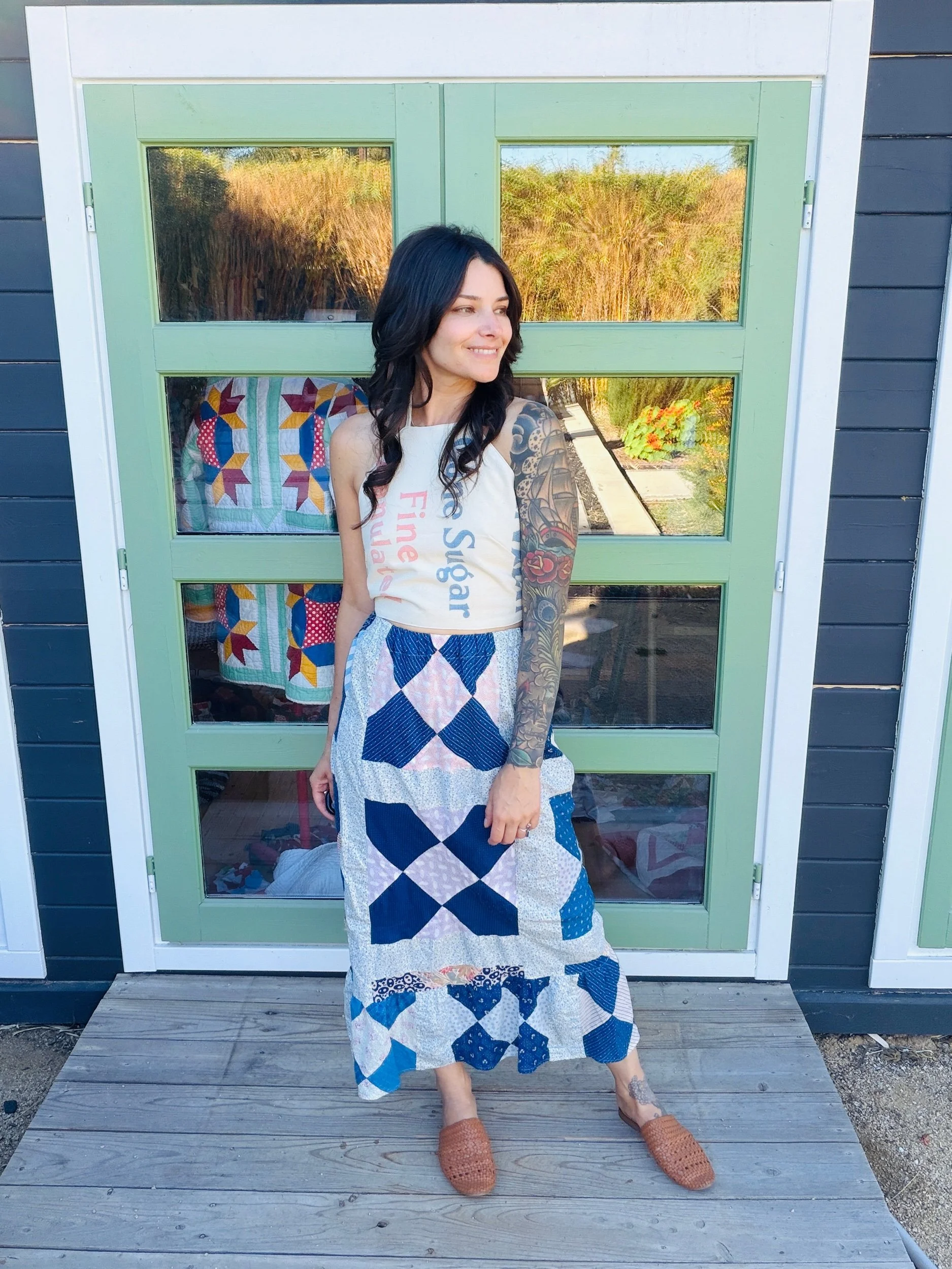 This one-of-a-kind handmade prairie skirt is crafted from a carefully sourced vintage quilt top, giving new life to a beautiful piece of textile history. Each skirt tells its own story through time-softened fabrics, intricate patchwork, and gentle signs of age that make it truly unique.