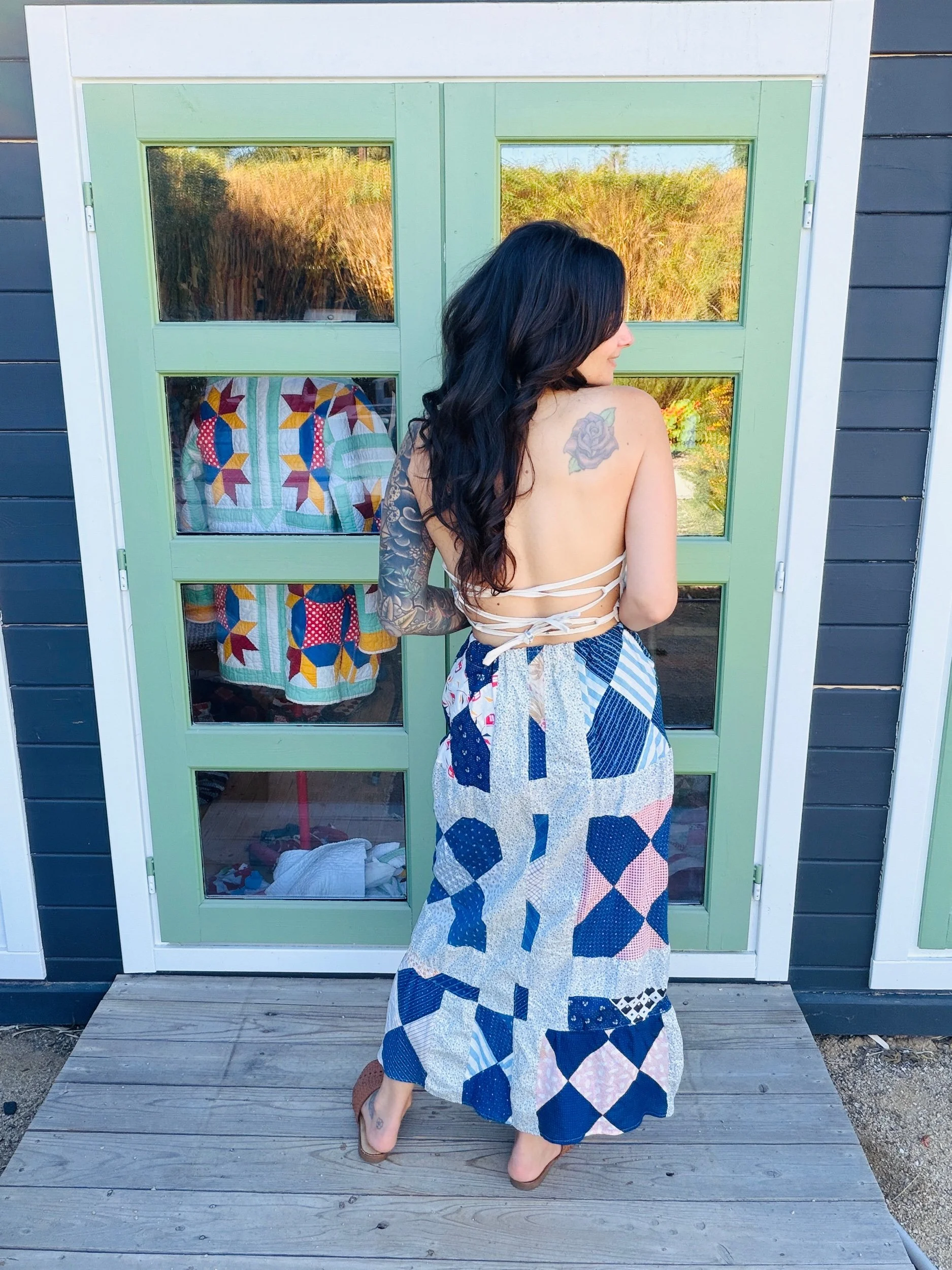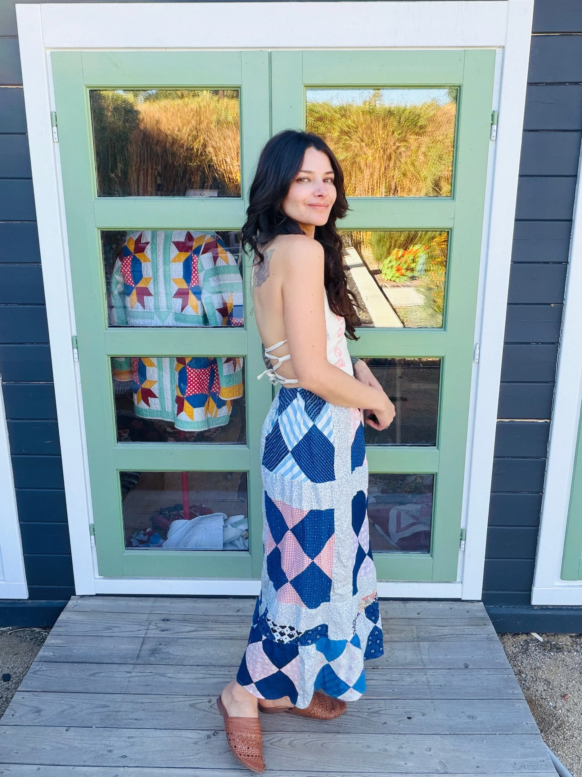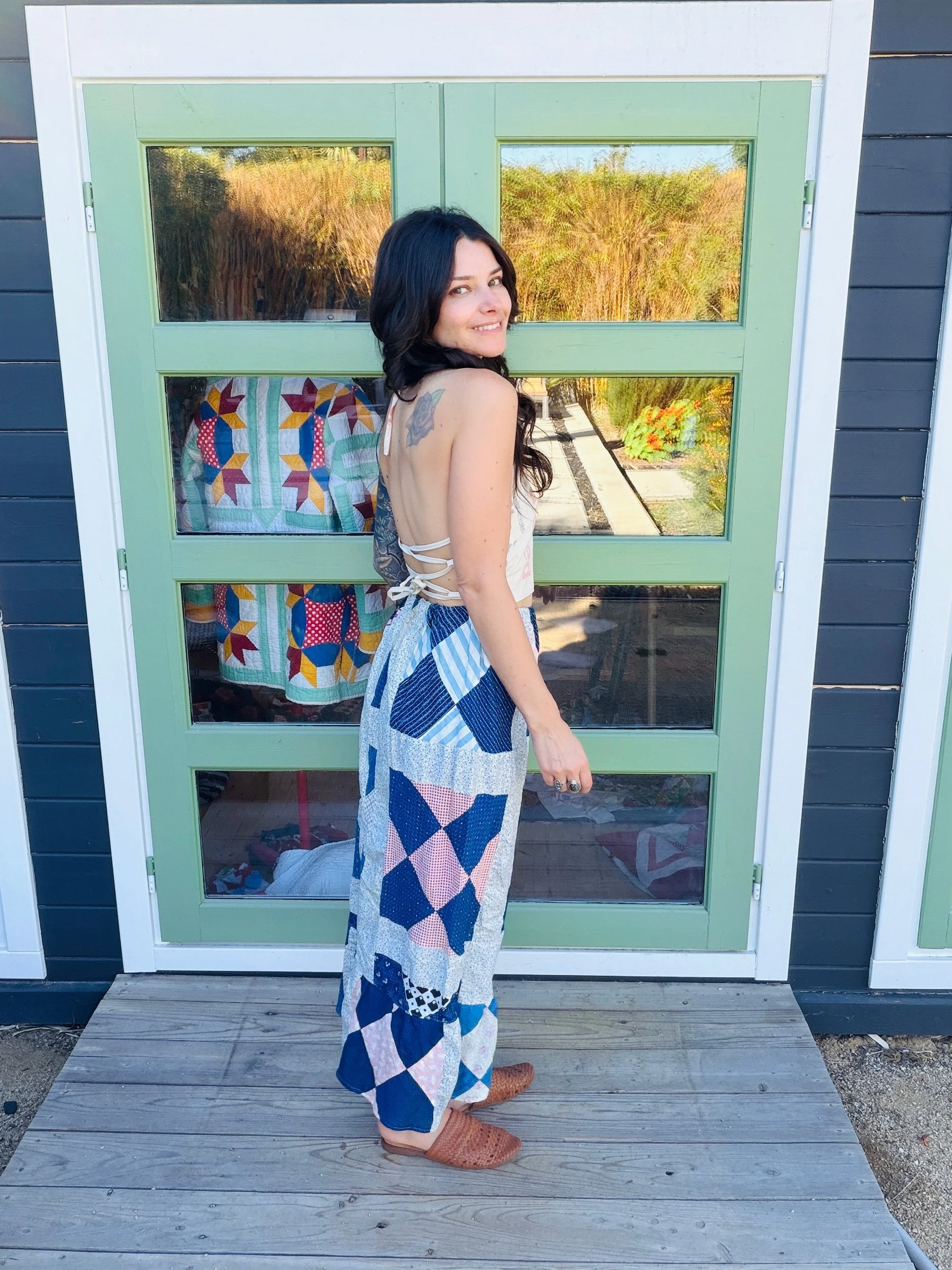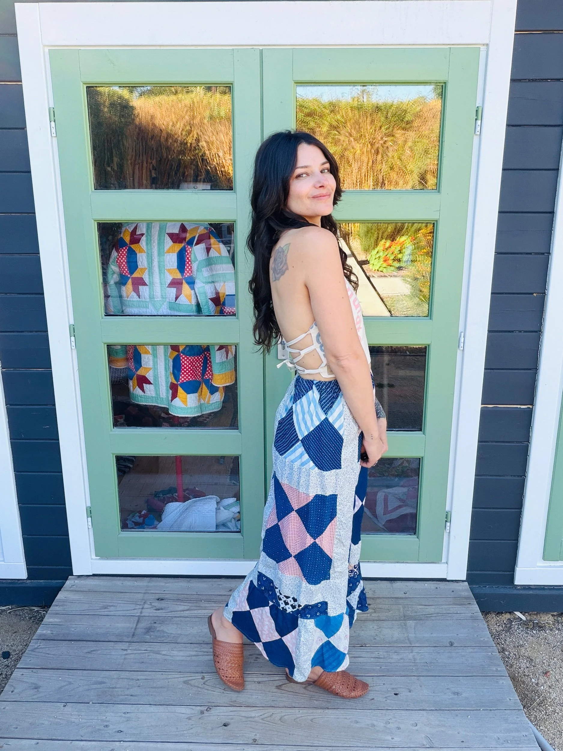 This one-of-a-kind handmade prairie skirt is crafted from a carefully sourced vintage quilt top, giving new life to a beautiful piece of textile history. Each skirt tells its own story through time-softened fabrics, intricate patchwork, and gentle signs of age that make it truly unique.
