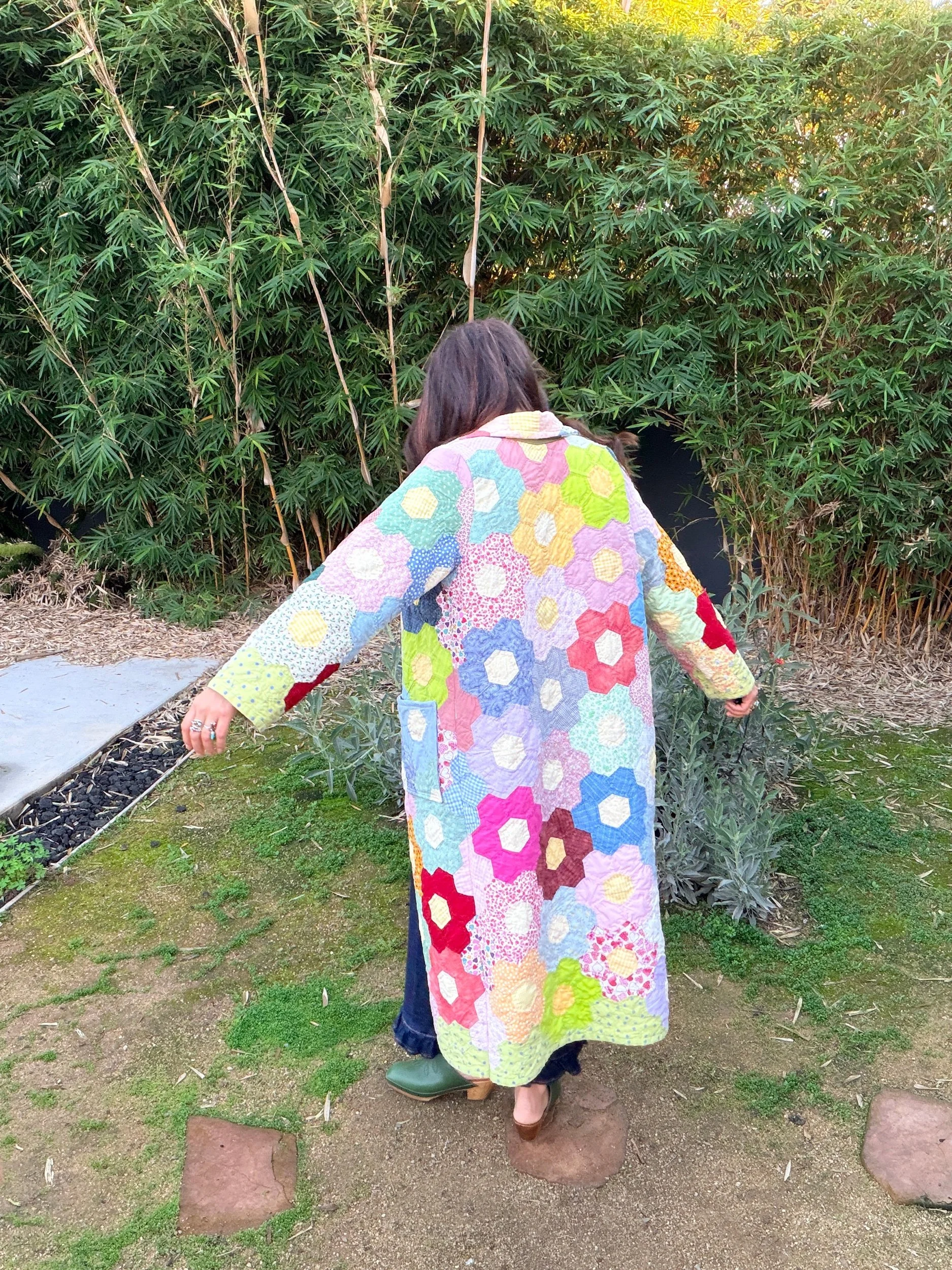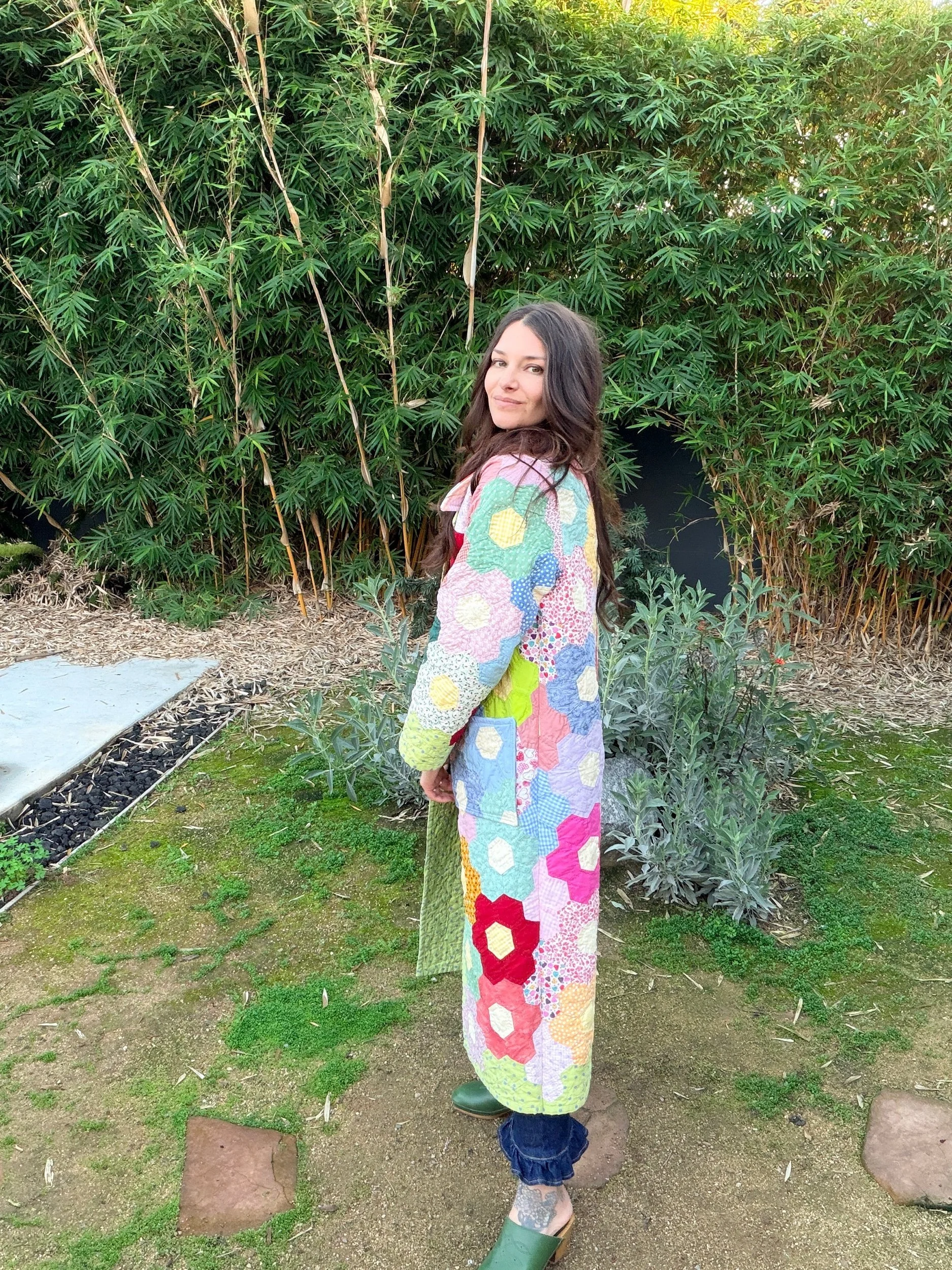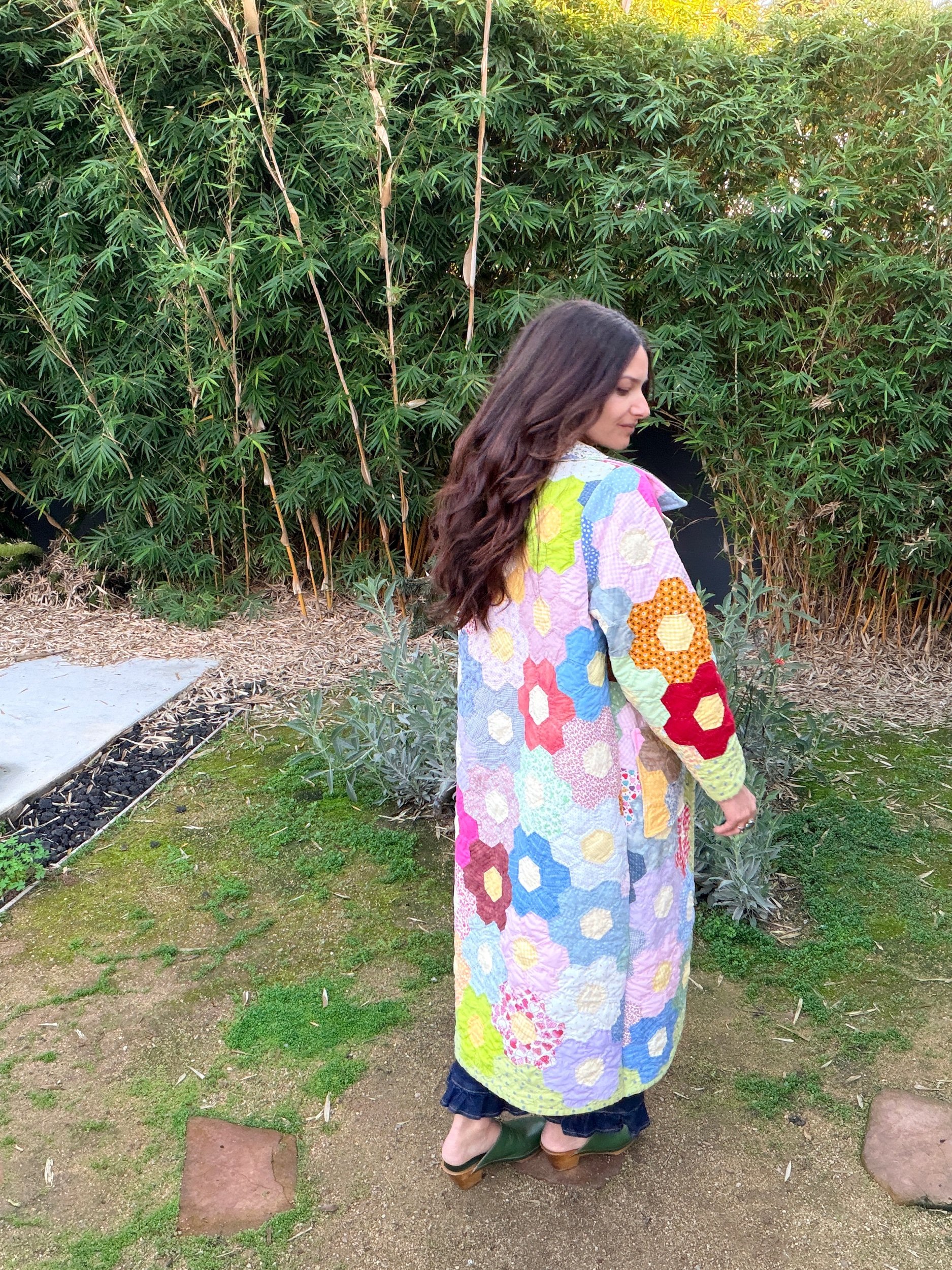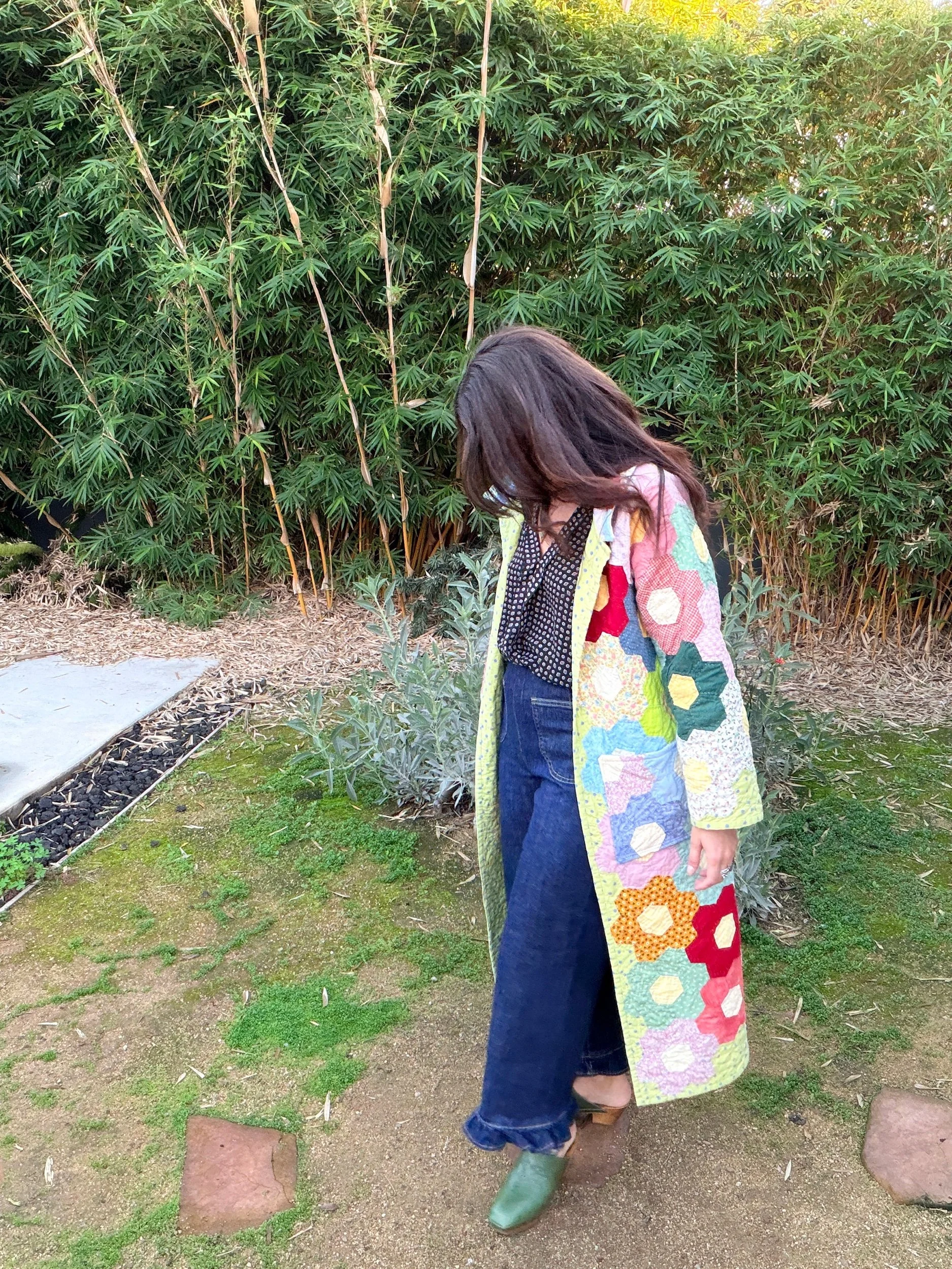 This handmade garden quilted duster offers unparalleled comfort and style. Crafted from a handmade thinner floral quilt, this jacket is truly one of a kind. It’s a great duster that is light weight and great for layering. I used a Small Museum pattern.