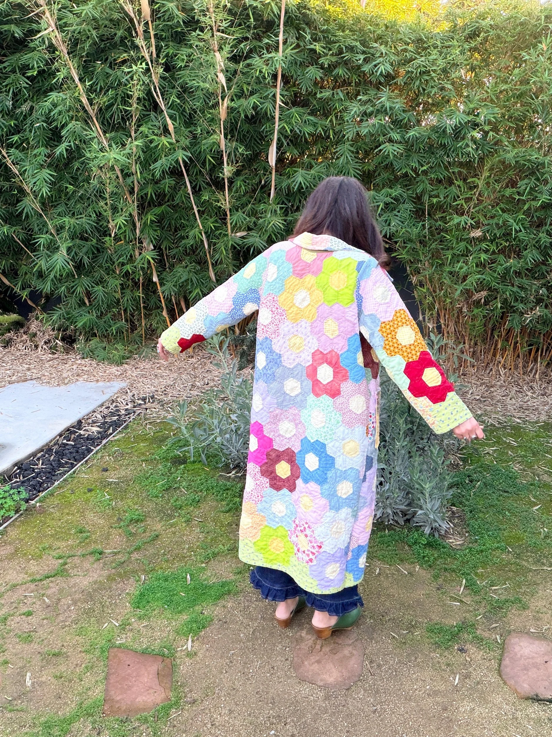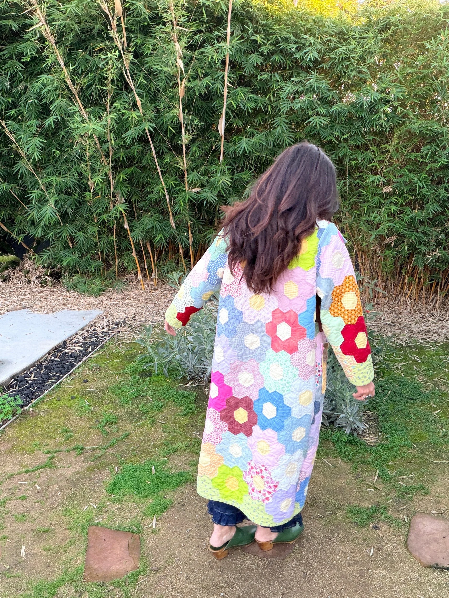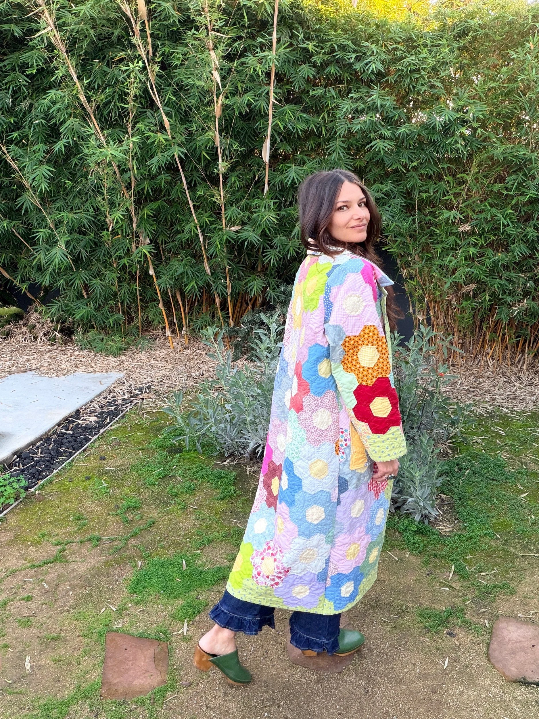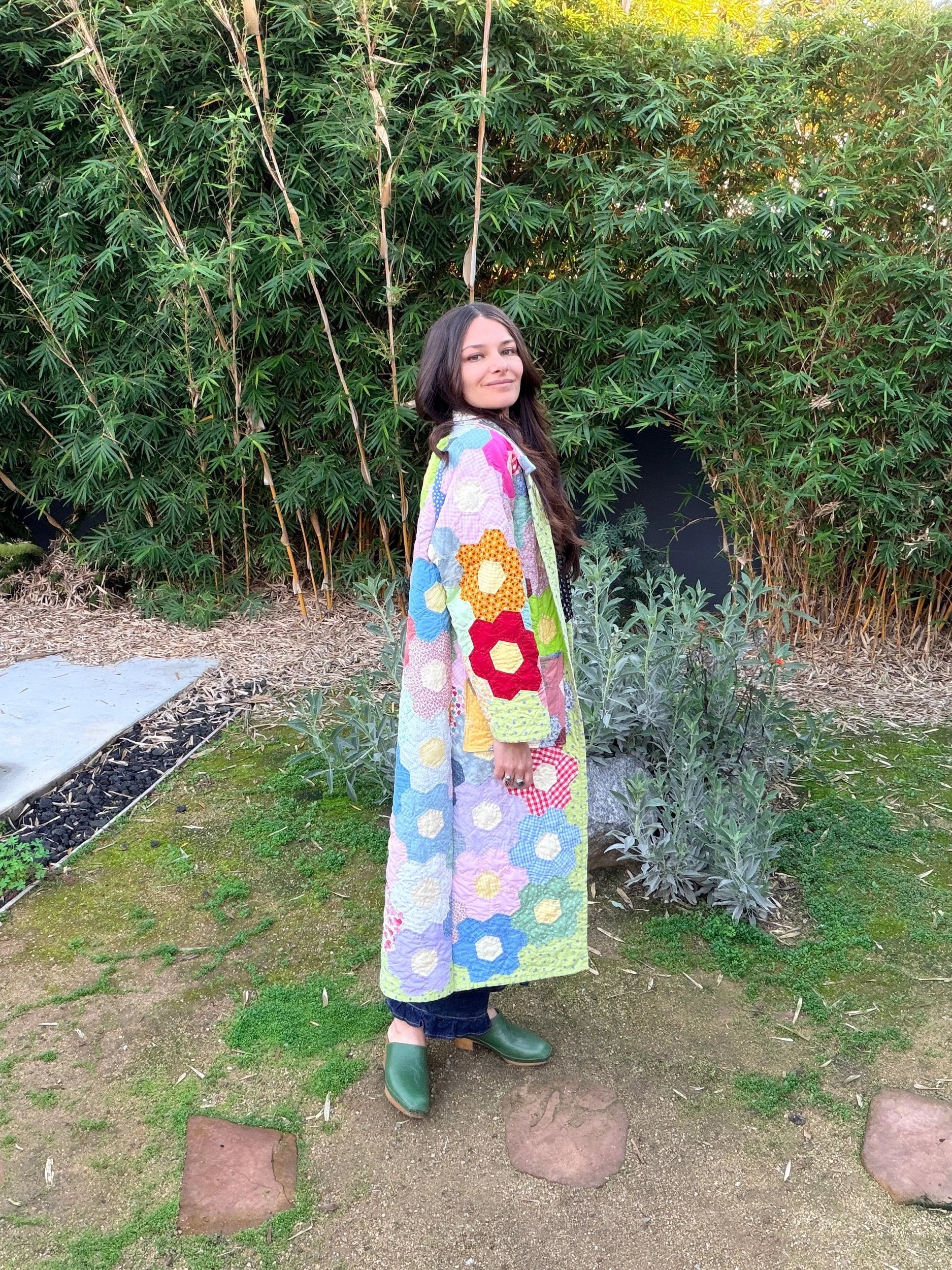 This handmade garden quilted duster offers unparalleled comfort and style. Crafted from a handmade thinner floral quilt, this jacket is truly one of a kind. It’s a great duster that is light weight and great for layering. I used a Small Museum pattern.