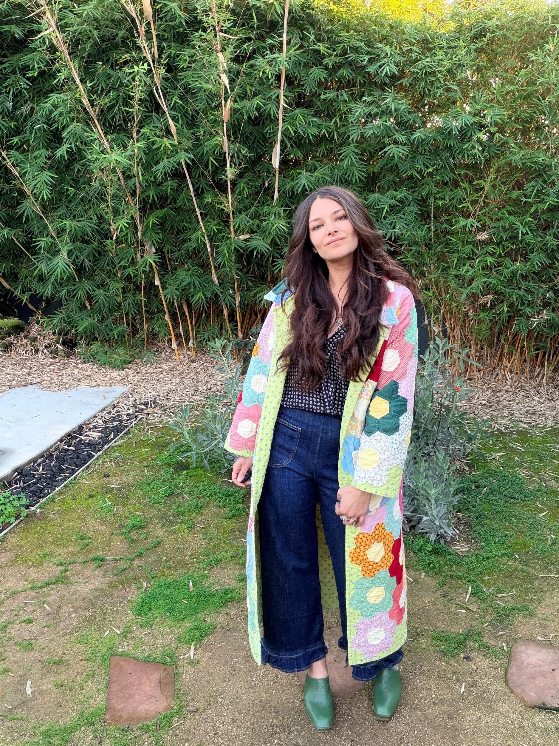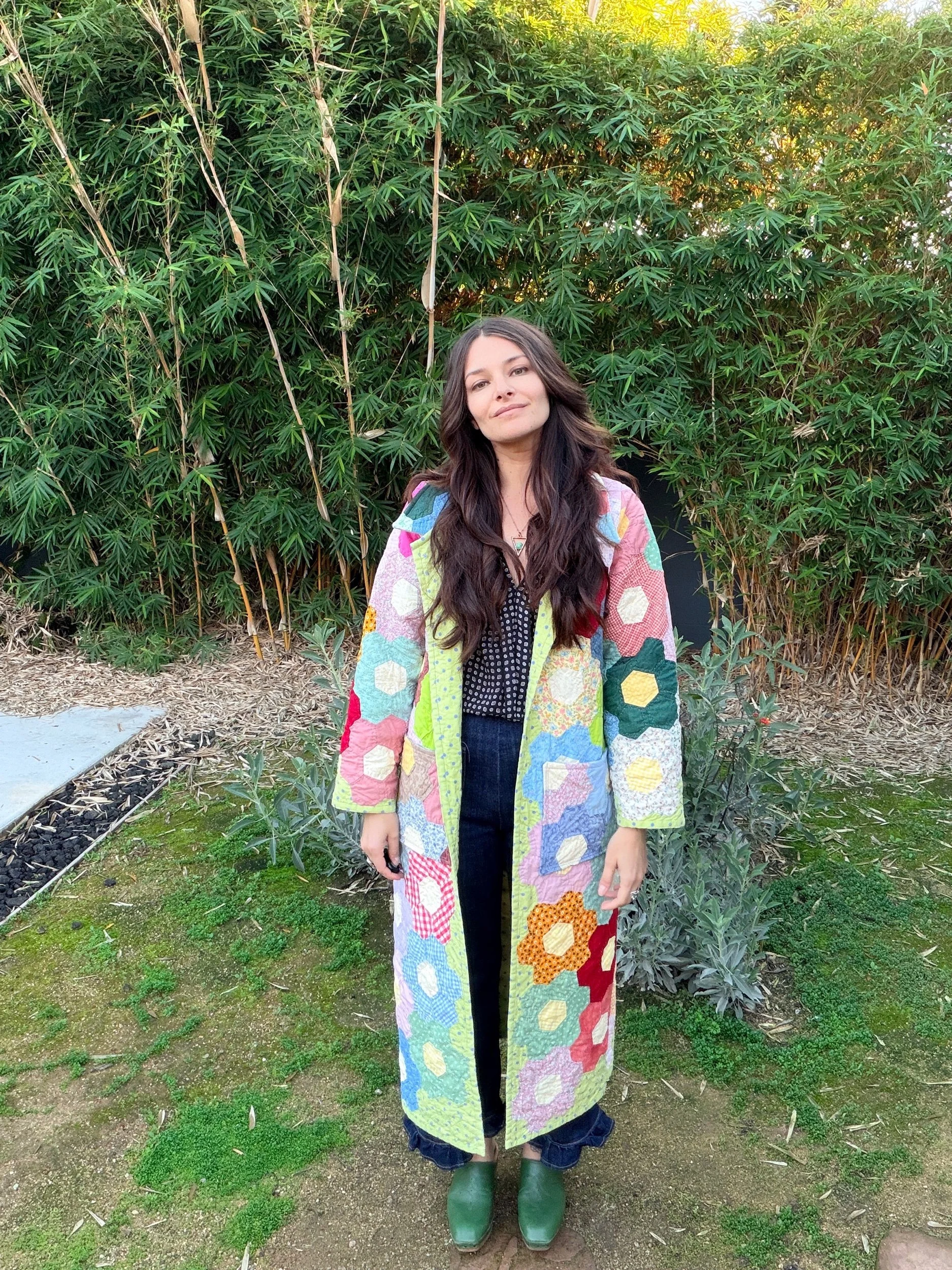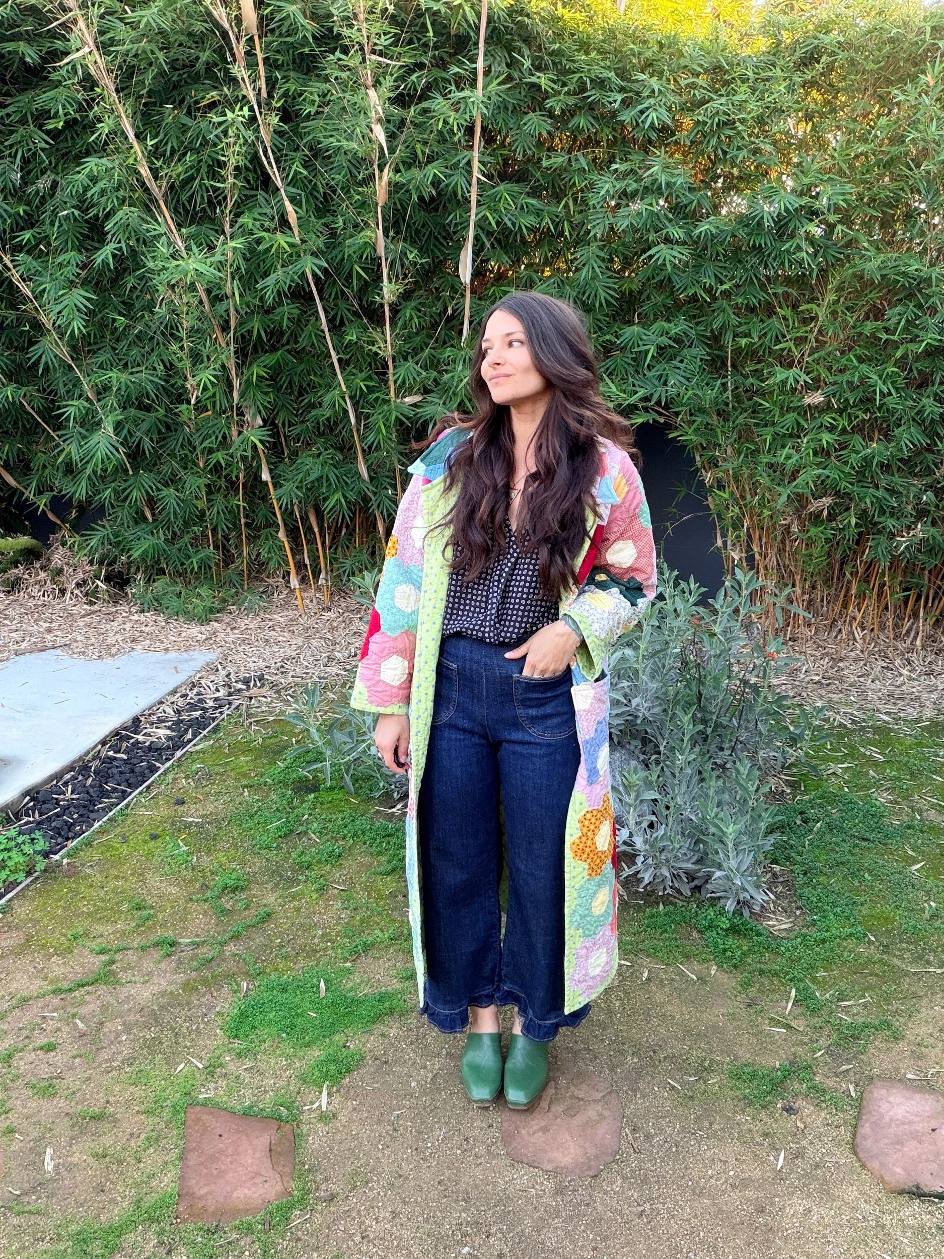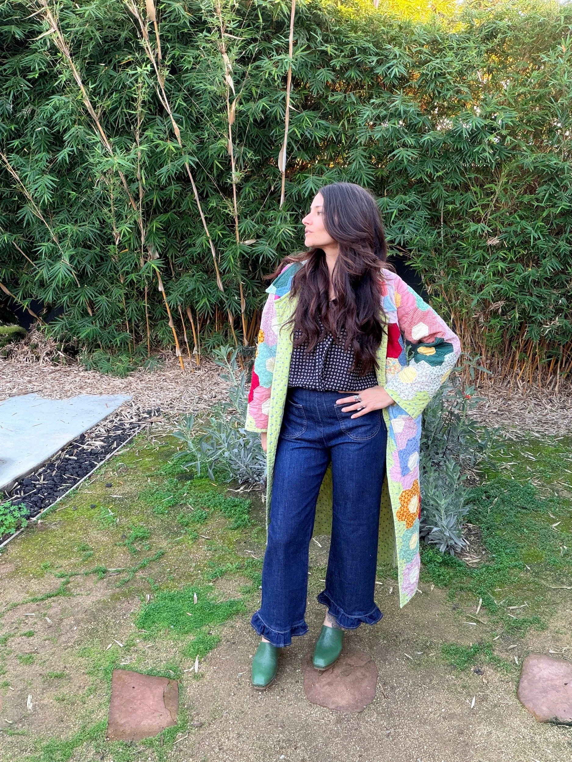 This handmade garden quilted duster offers unparalleled comfort and style. Crafted from a handmade thinner floral quilt, this jacket is truly one of a kind. It’s a great duster that is light weight and great for layering. I used a Small Museum pattern.