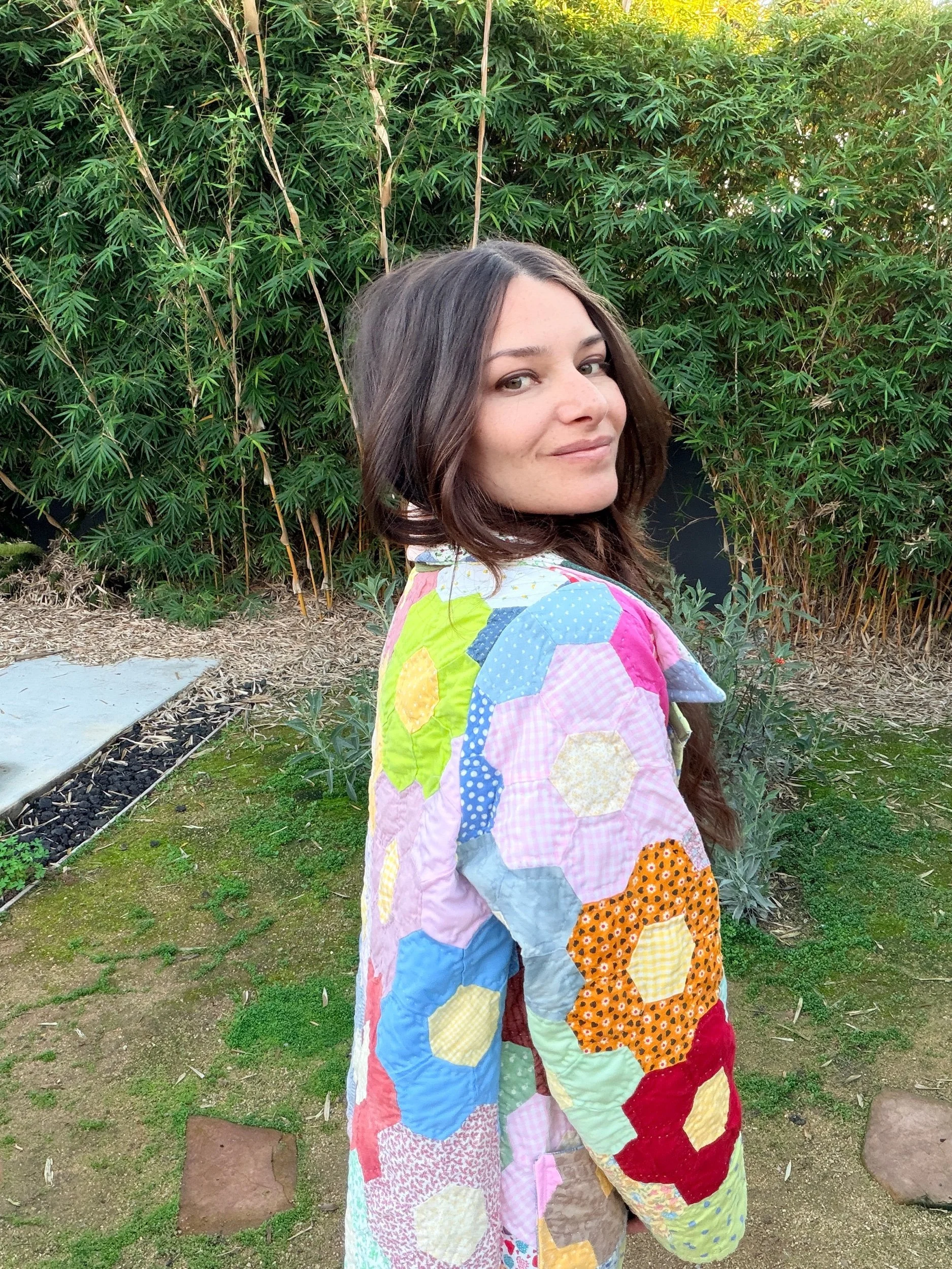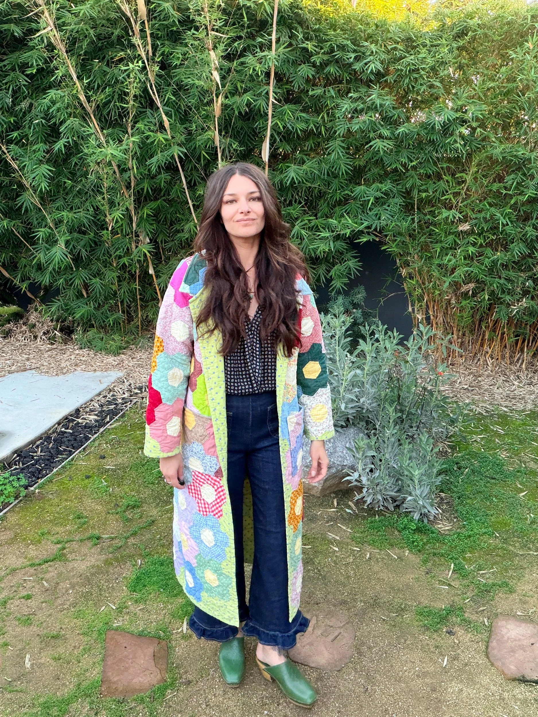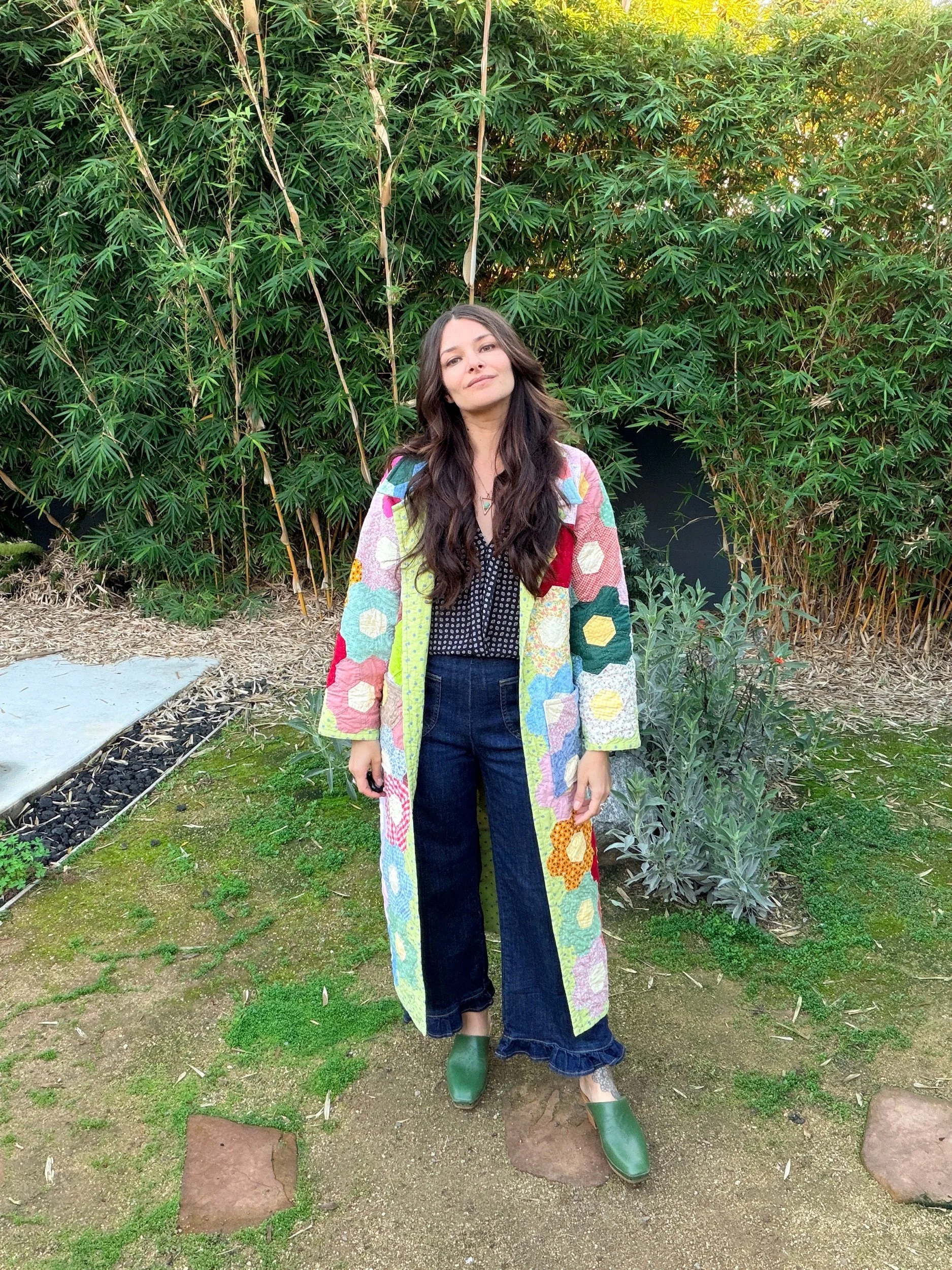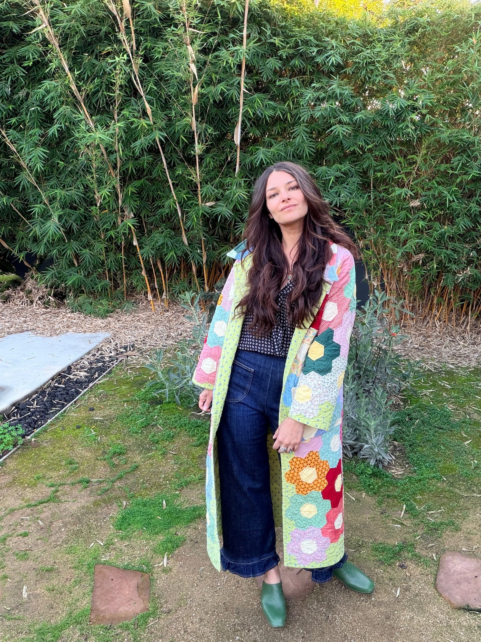 This handmade garden quilted duster offers unparalleled comfort and style. Crafted from a handmade thinner floral quilt, this jacket is truly one of a kind. It’s a great duster that is light weight and great for layering. I used a Small Museum pattern.