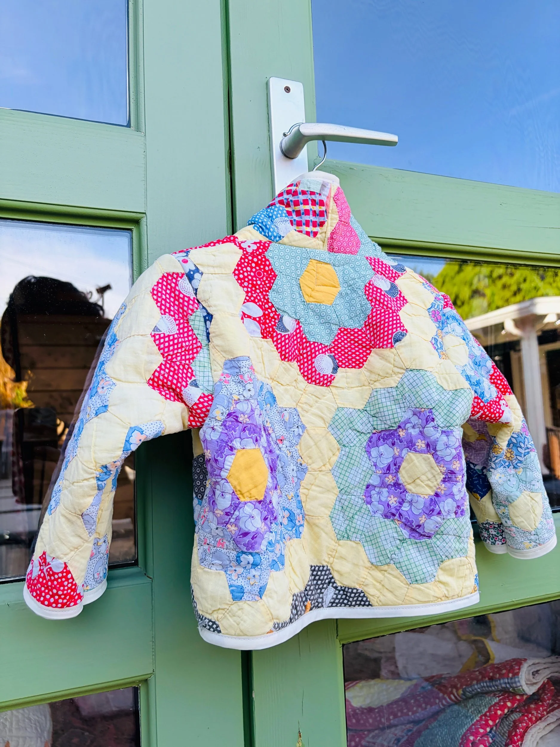 This quilted baby coat is stunning! This quilt jacket is handmade in my studio located in Long Beach, CA. I used a cream colored binding all the way around the coat and sleeves for a nice finish and a pop of color. The colors in this quilt are stunning and guaranteed to be a show stopper for your little one to look adorable in!
