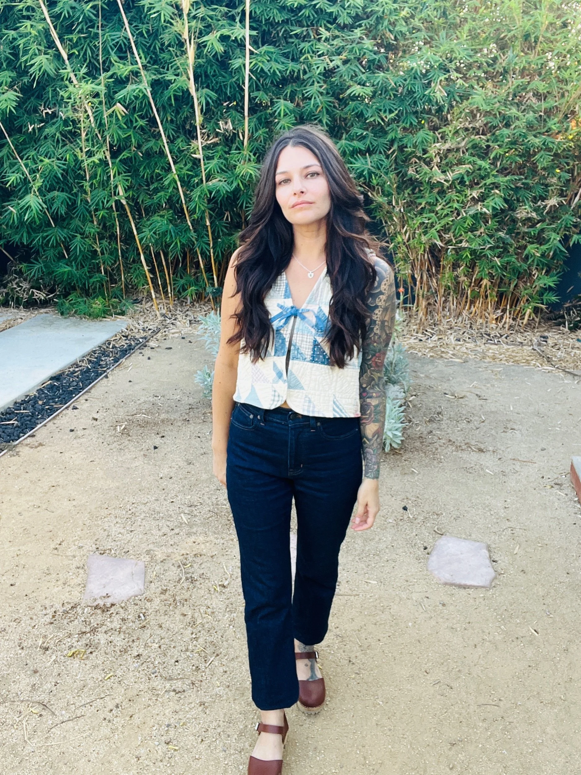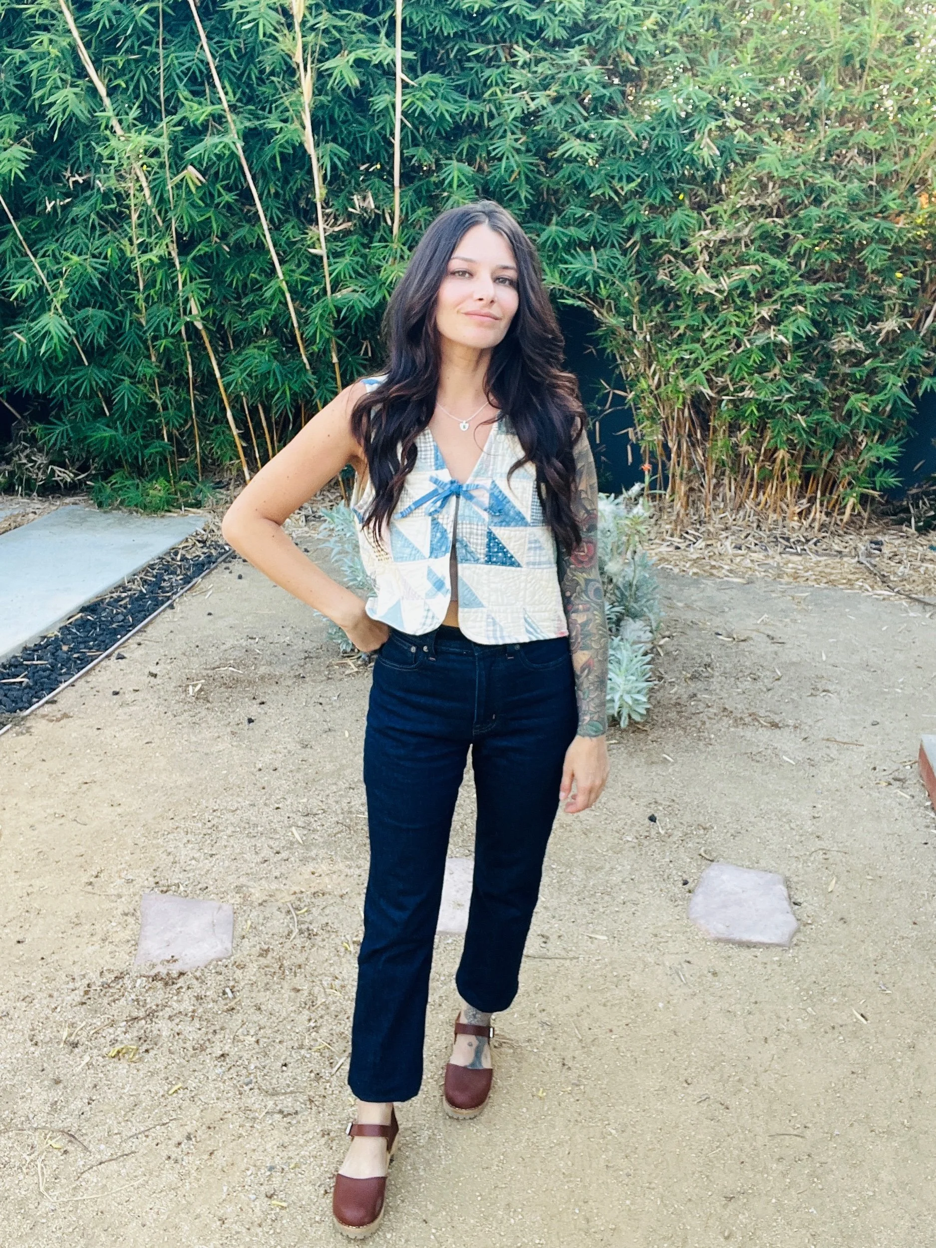 This 1940’s patchwork quilt vest is one of a kind and handmade in Long Beach, CA. I think it’s so cute with a bralette or a long sleeve top underneath. This piece fits a Small/Medium best. Shown on a size Small 5’4 model. That indigo color steals my heart giving it an old timey feel. Milk Thistle Sewing knows what you need!