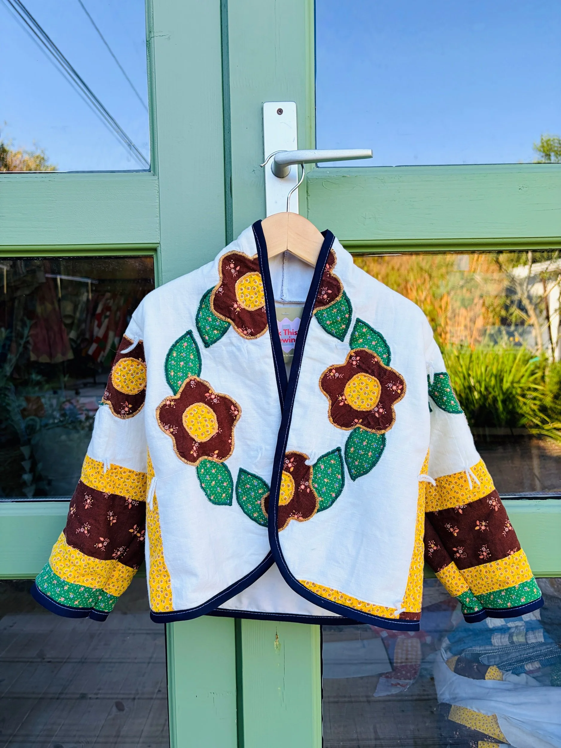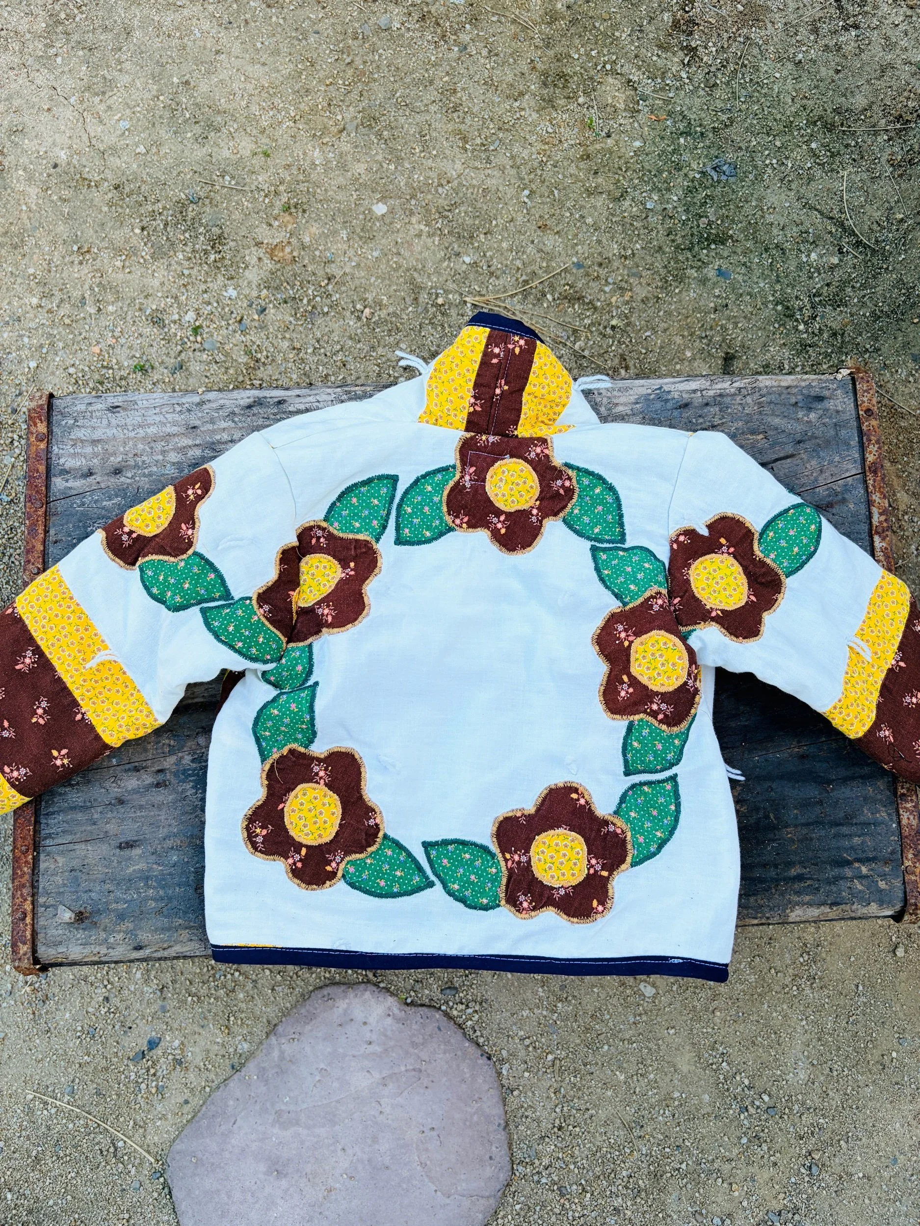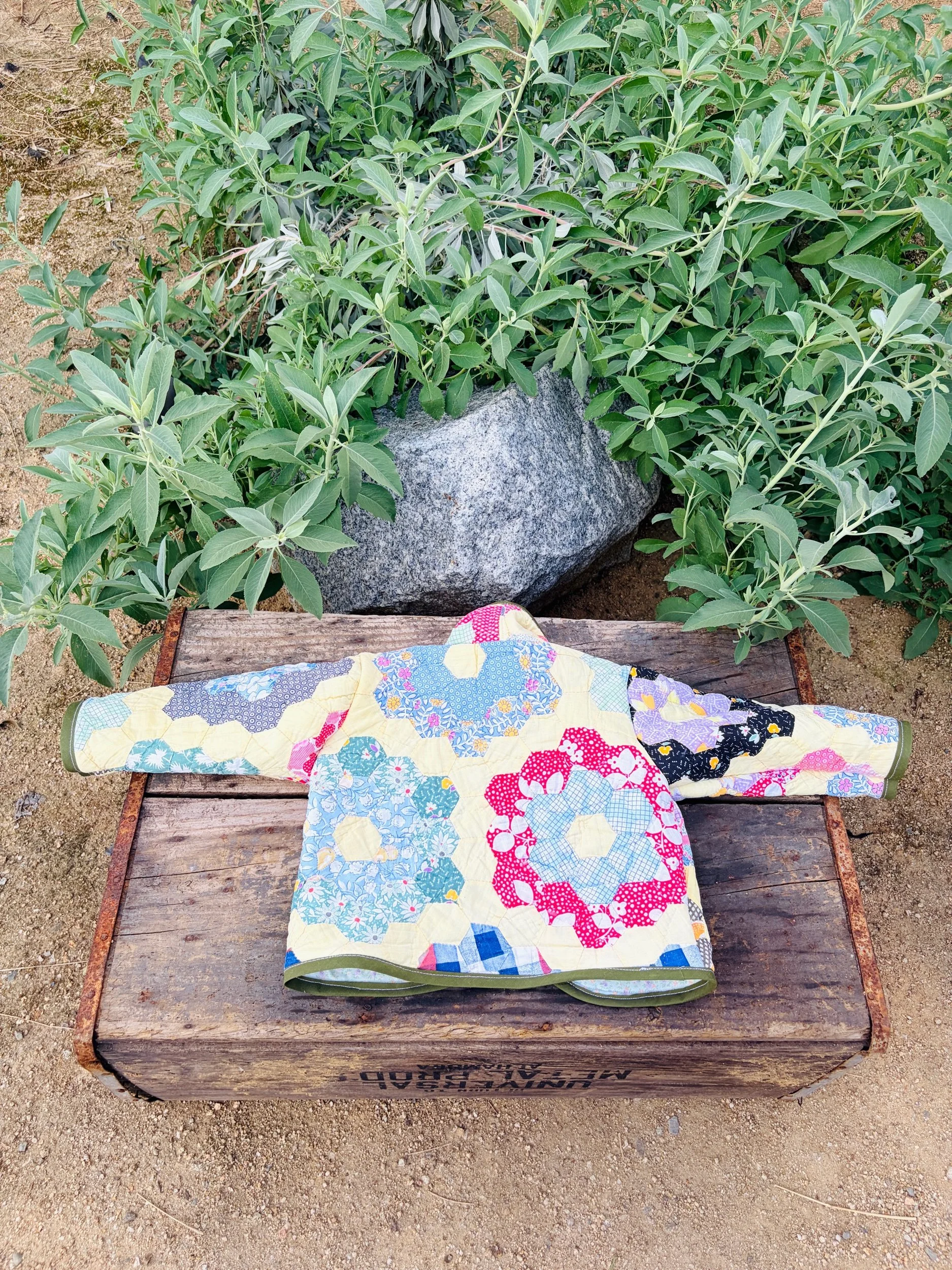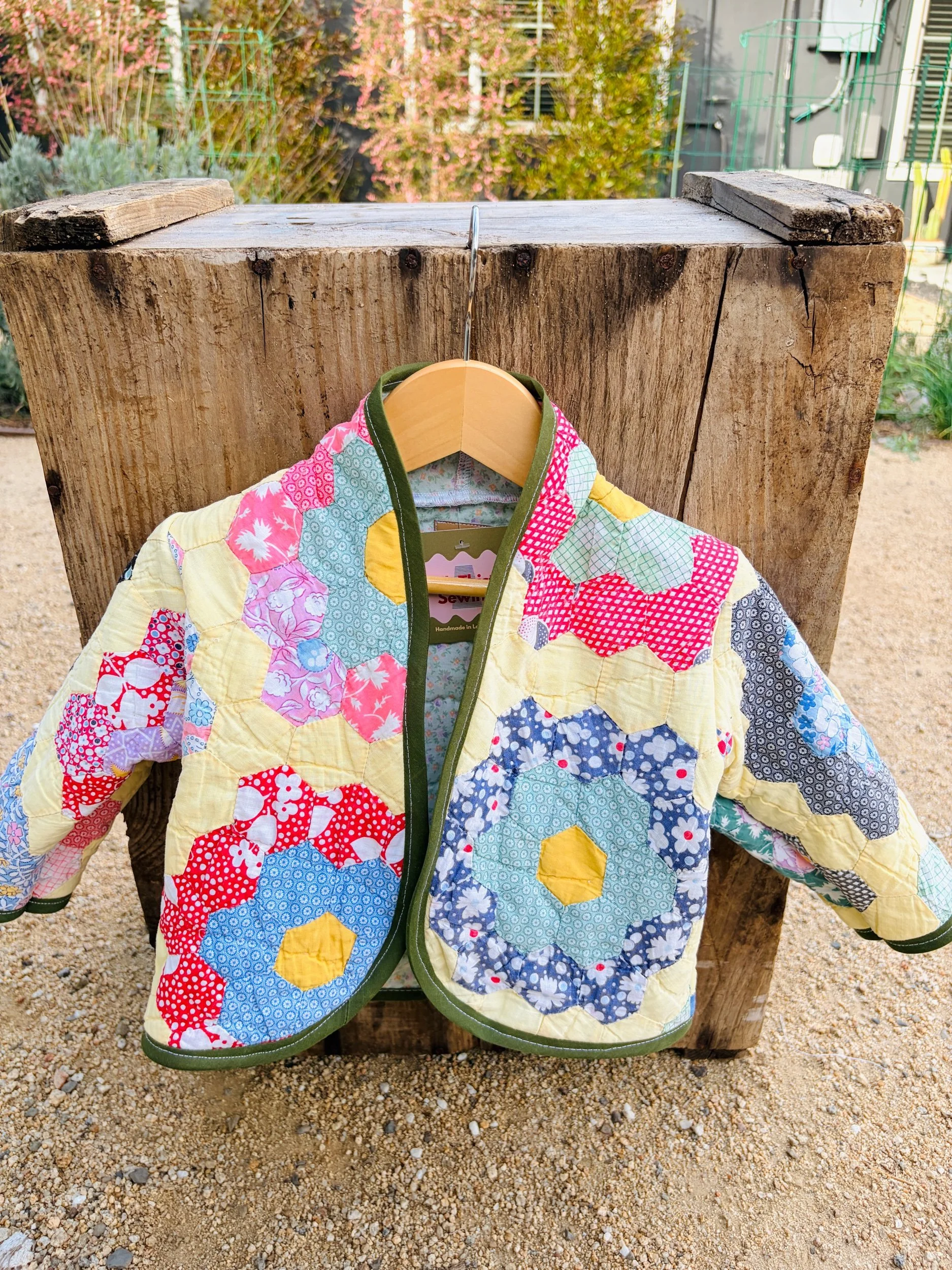 This quilted kids coat is stunning! This quilt jacket is handmade in my studio located in Long Beach, CA. I used blue binding all the way around the coat and sleeves for a nice finish and a pop of color. The colors in this quilt are stunning and guaranteed to be a show stopper for your little one to look adorable in!