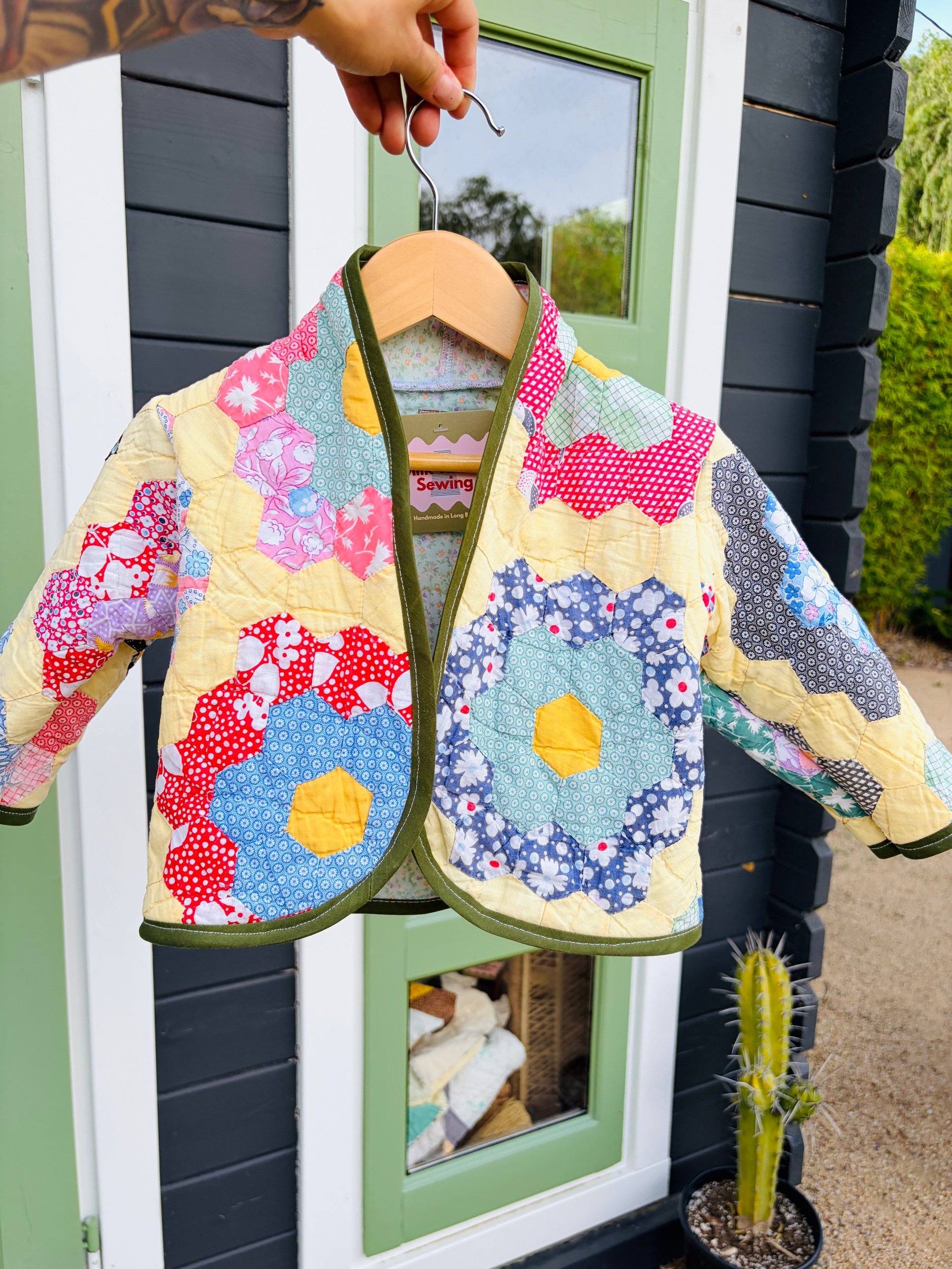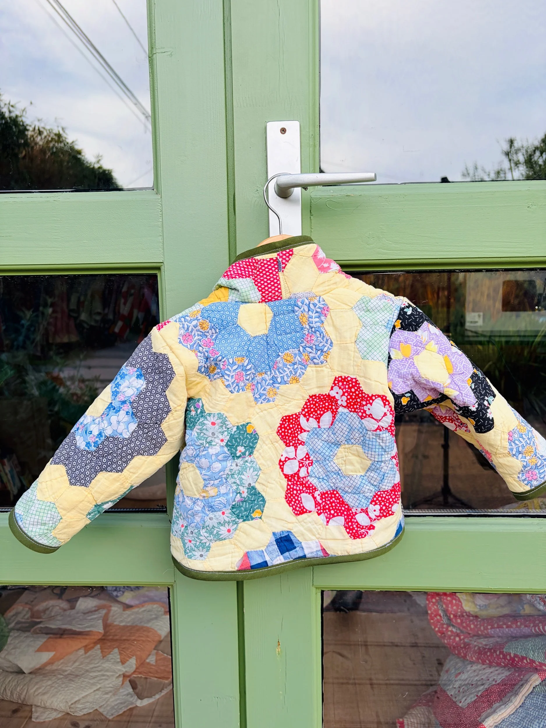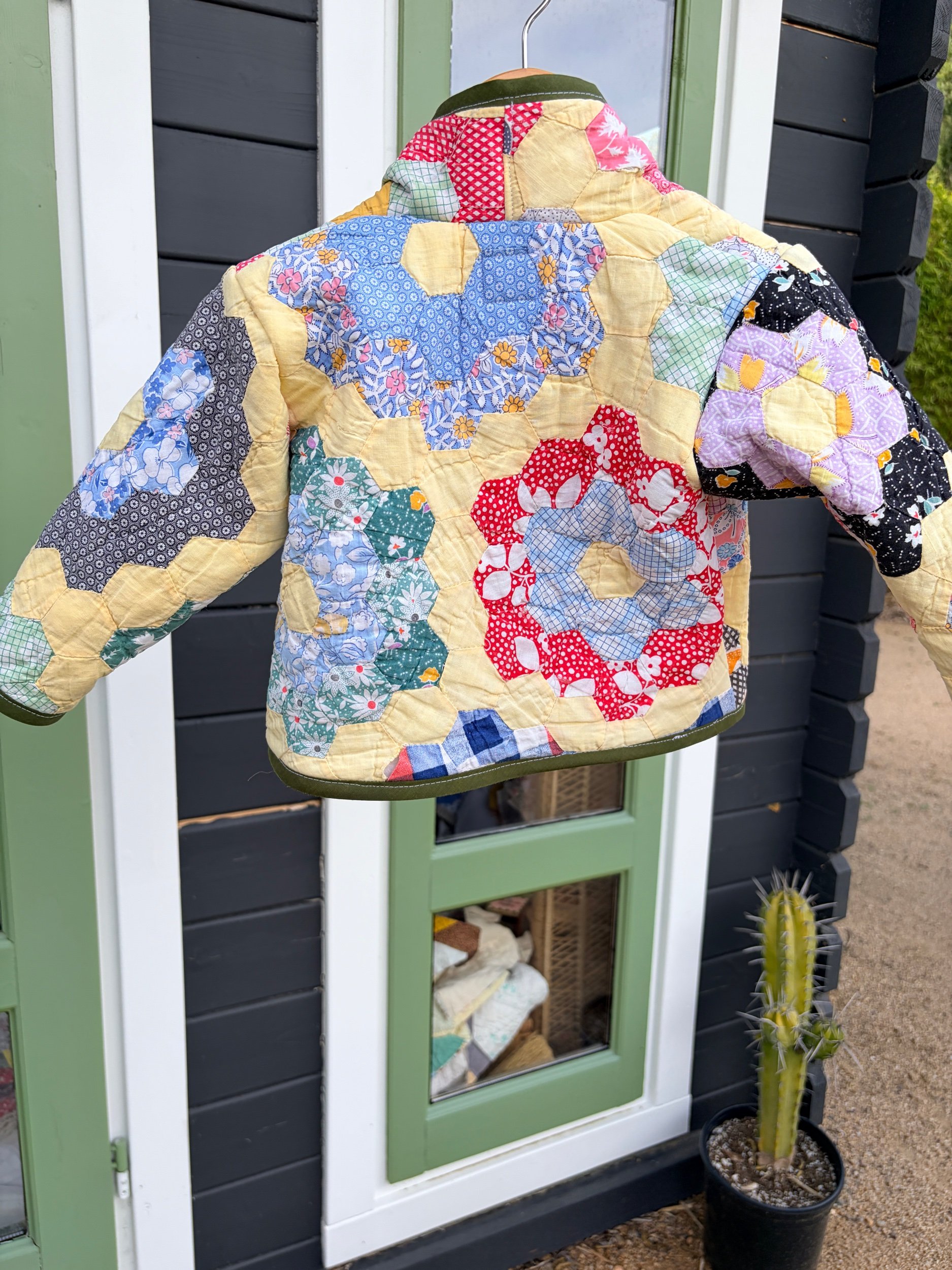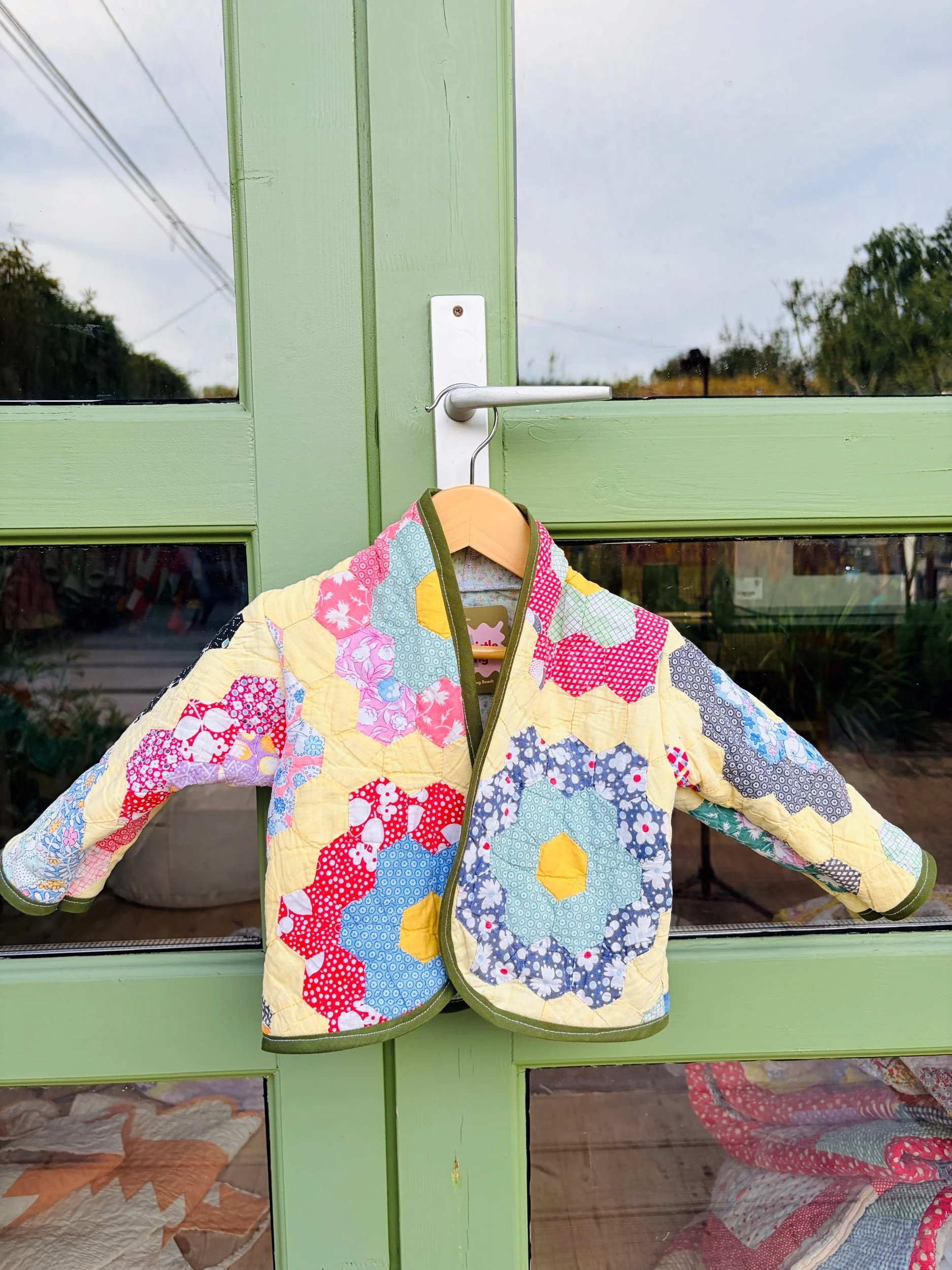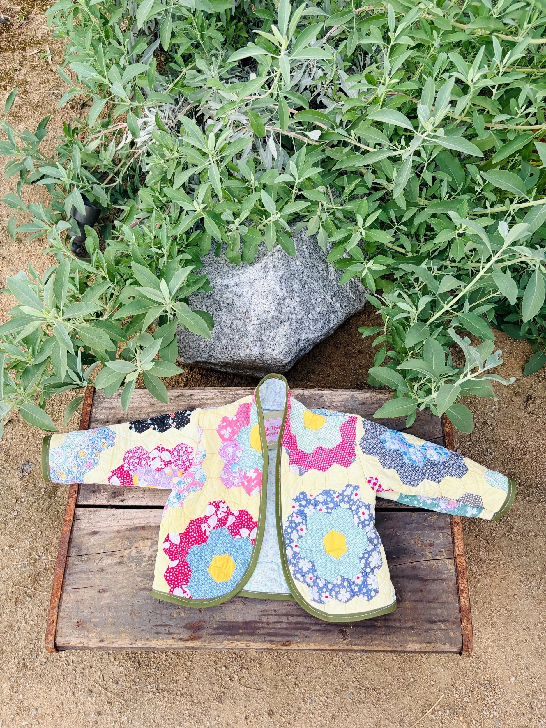 This quilted kids coat is stunning! This quilt jacket is handmade in my studio located in Long Beach, CA. I used blue binding all the way around the coat and sleeves for a nice finish and a pop of color. The colors in this quilt are stunning and guaranteed to be a show stopper for your little one to look adorable in!
