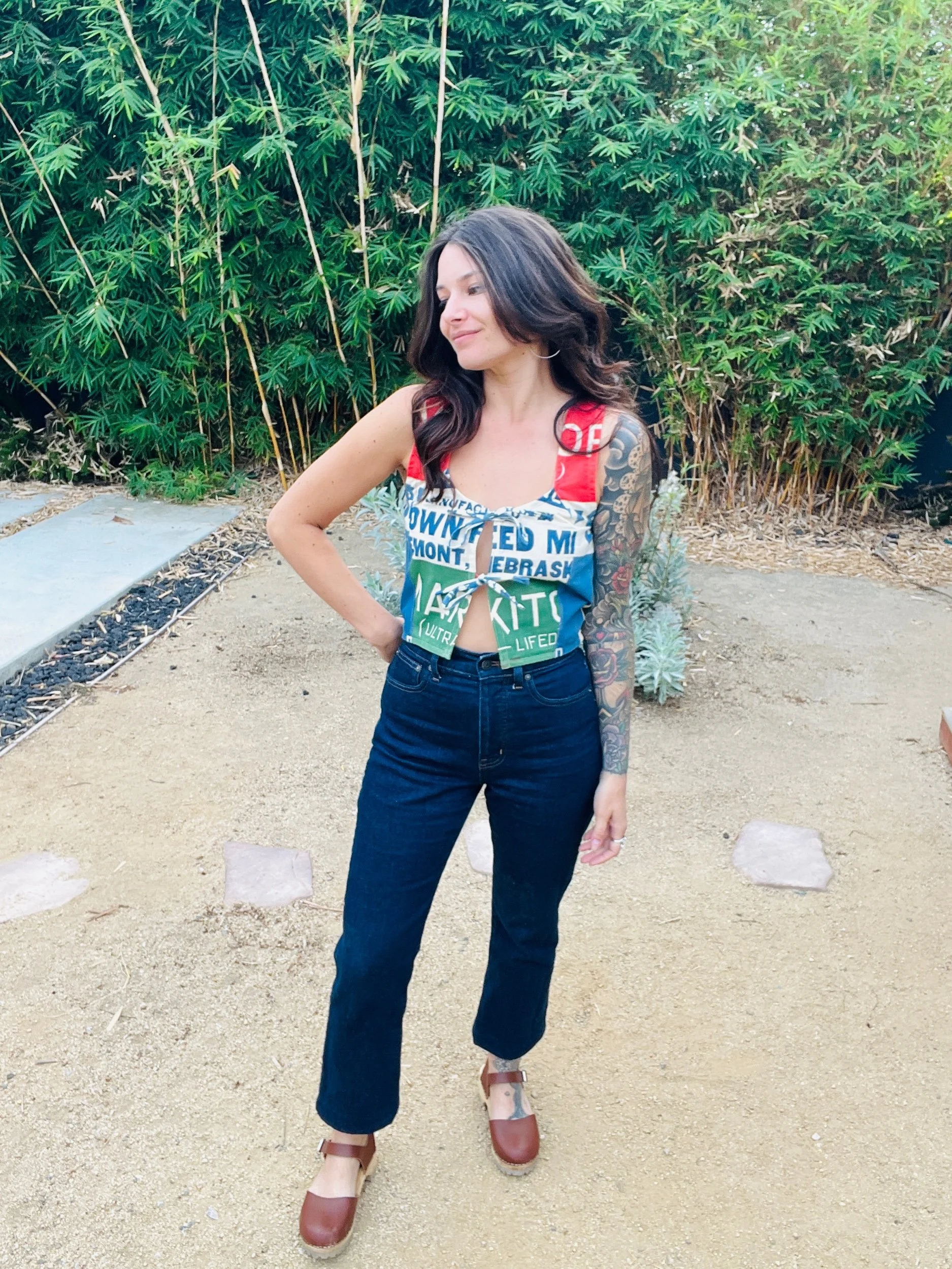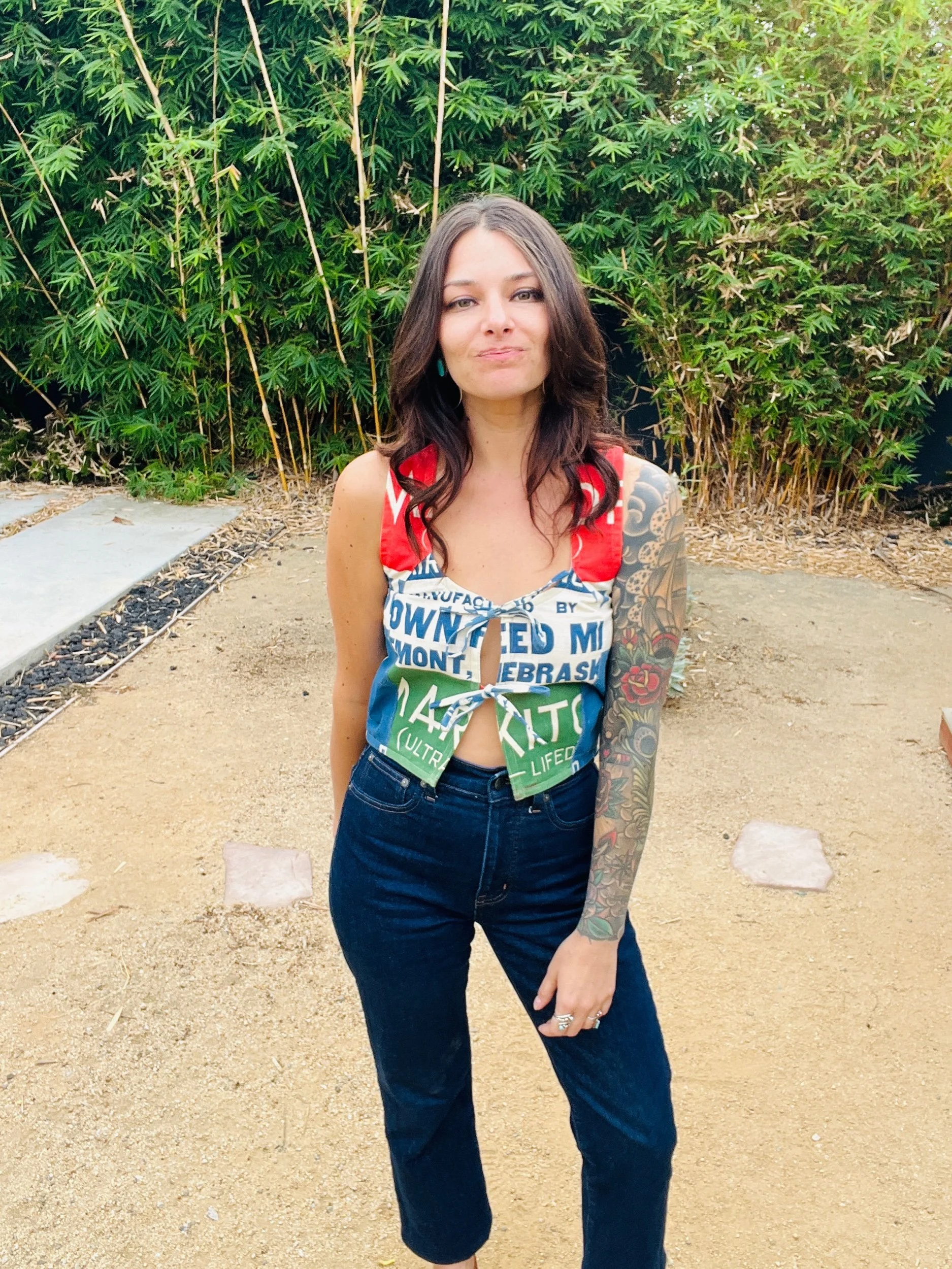 I’m 5’4, 120 pounds, a B cup, and this is how it fits me. All the material is vintage and handmade. I upcycled this quilt in my studio in Long Beach! it’s so cute!!