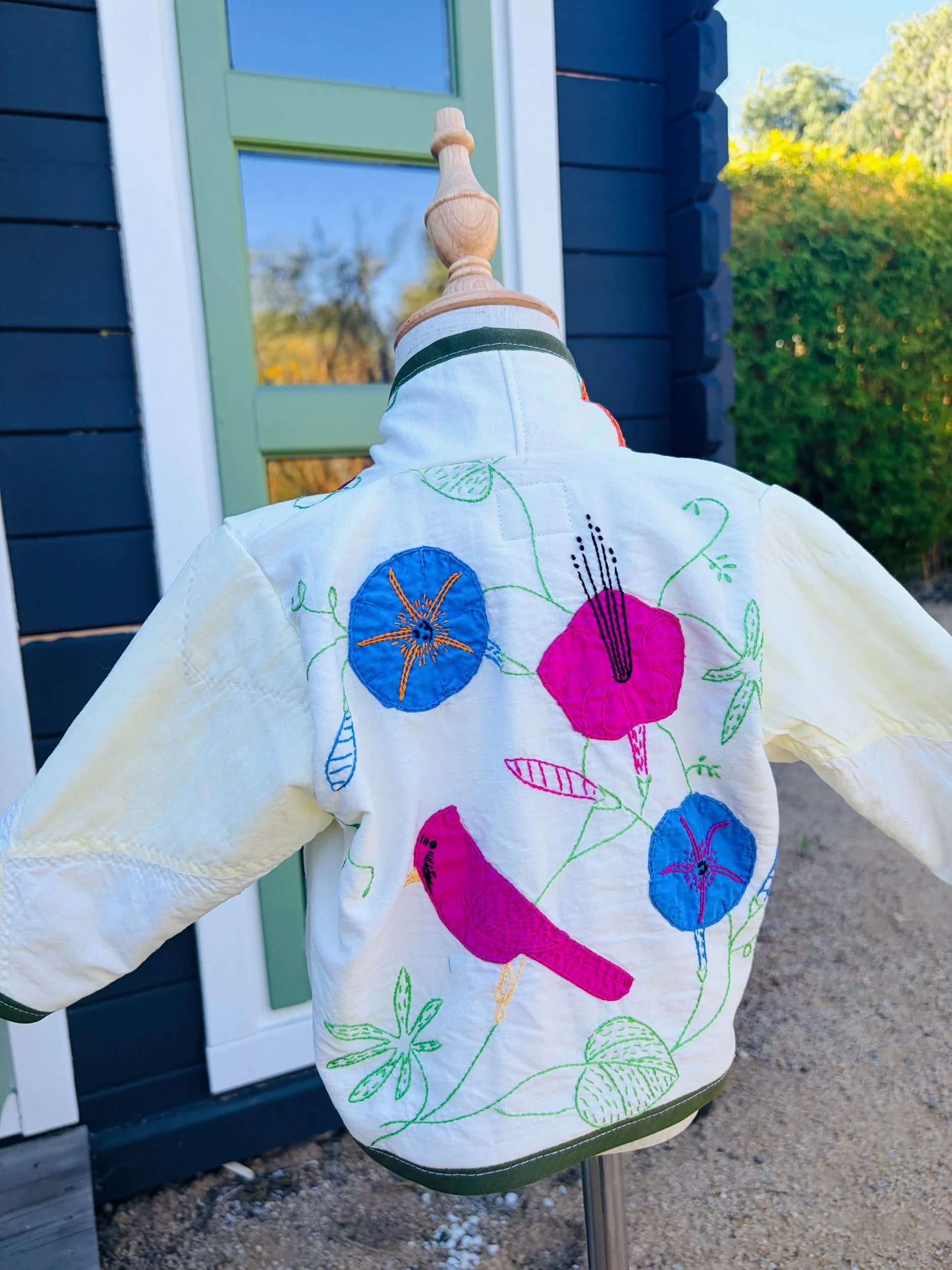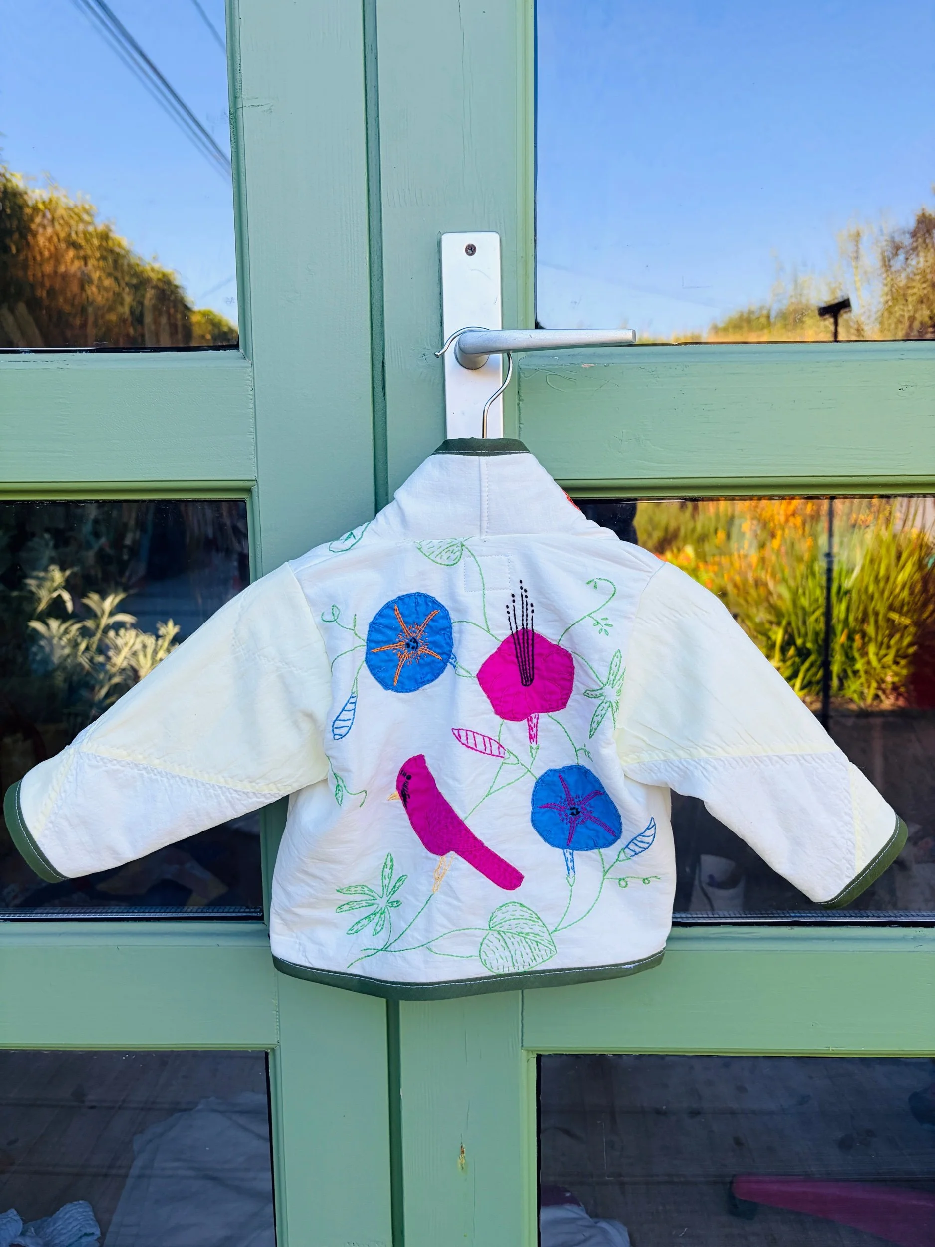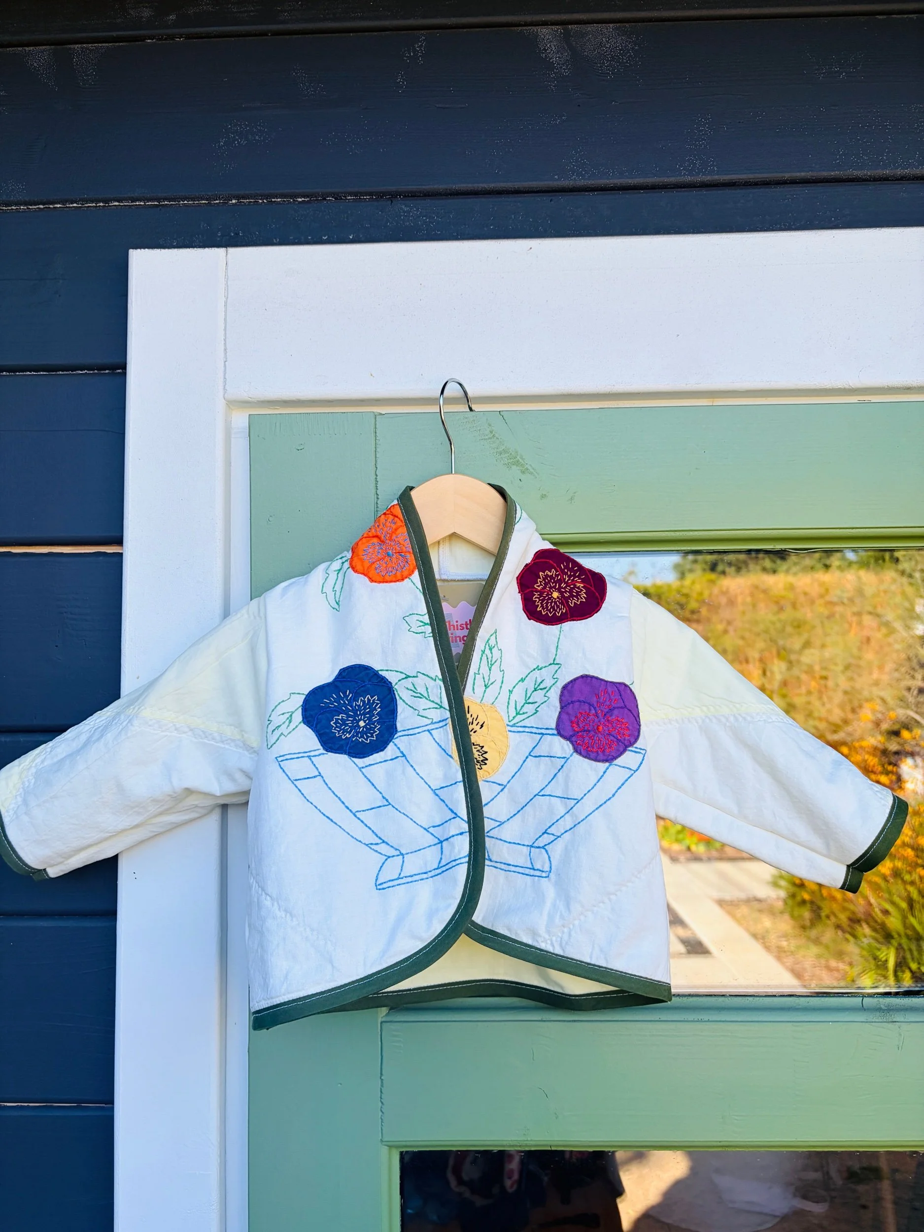 This handmade baby coat is crafted from a vintage quilt, giving new life to timeworn fabric rich with history and warmth. Each stitch carries a story, creating a one-of-a-kind piece that feels both nostalgic and timeless. Soft, cozy, and thoughtfully made, it’s perfect for layering on crisp mornings or quiet afternoon strolls.