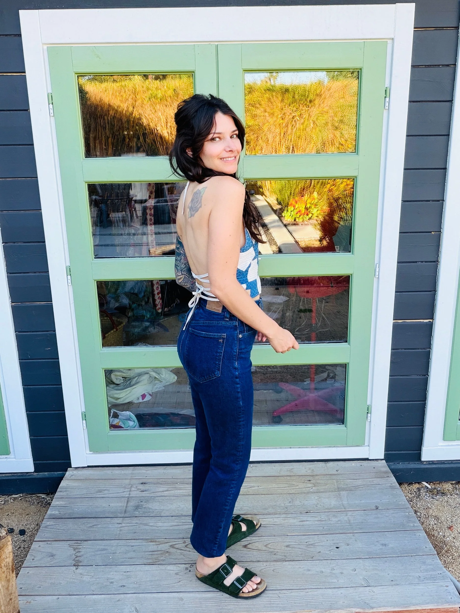 The backless design ties with linen straps, allowing you to adjust the fit to your body—easy, natural, and made to move with you. Best suited for a small to medium, it drapes with that perfectly imperfect charm only vintage fabrics can offer.