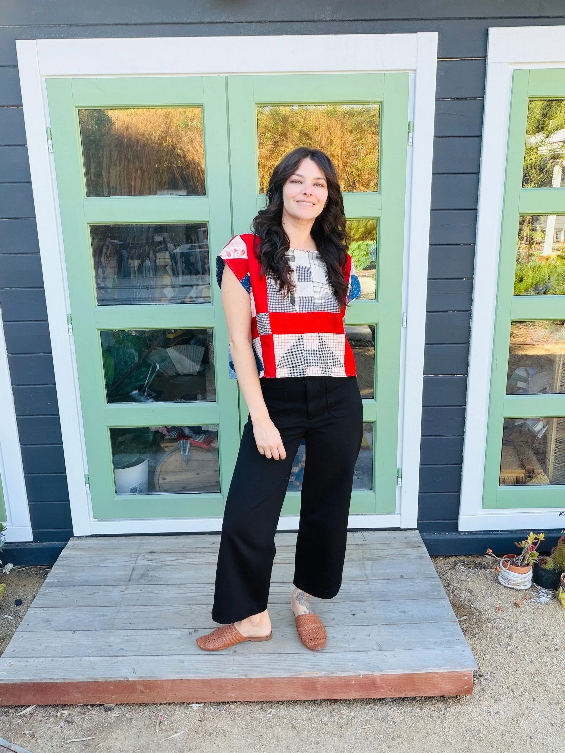 The silhouette is an easy, boxy crop with a relaxed drape and slightly structured feel from the original quilt layers. It hits at the natural waist, making it effortless with high-waisted trousers, denim, or a flowing prairie skirt. The short sleeves and clean neckline keep it simple, letting the antique textile shine.