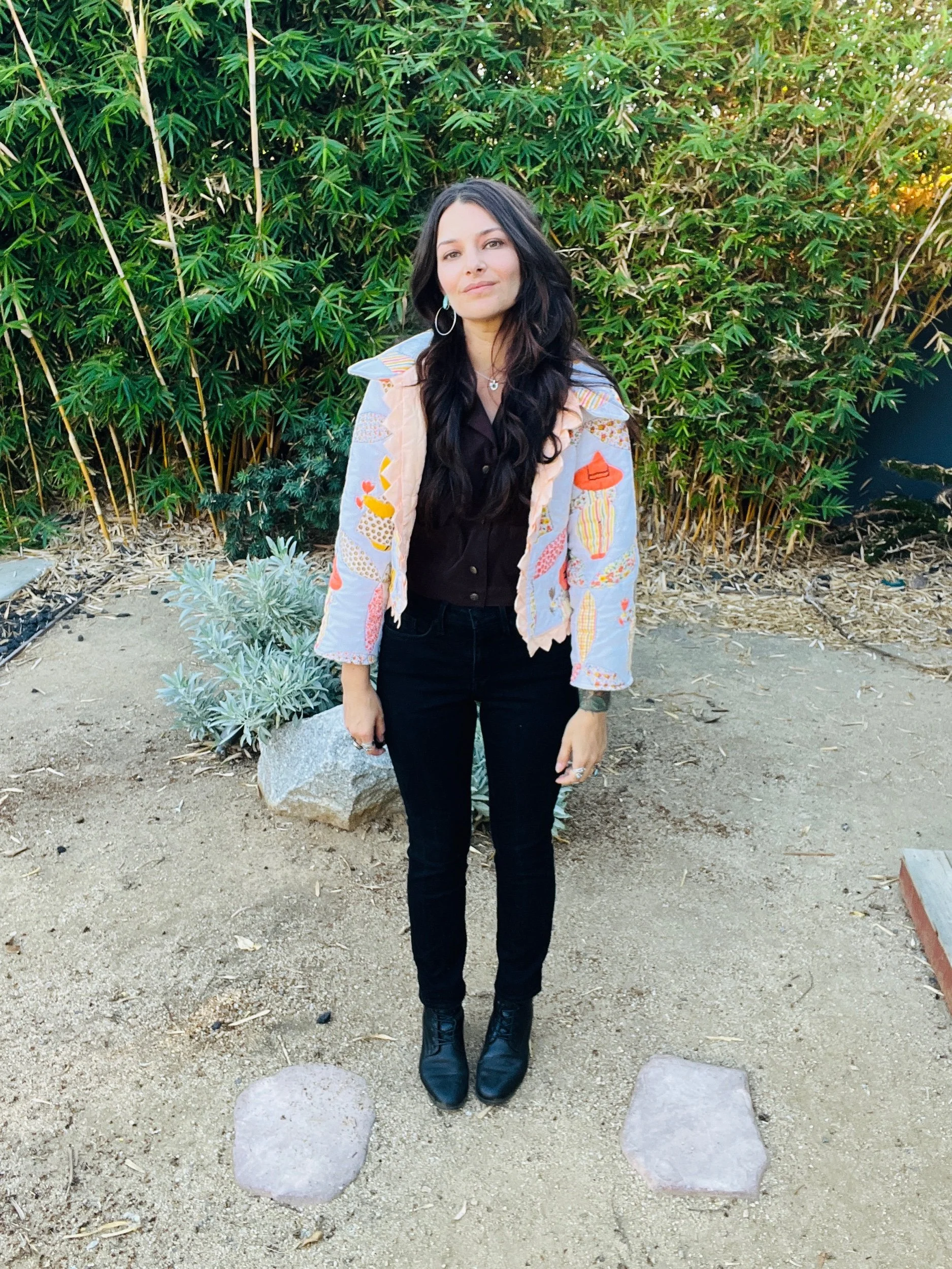 This Small cropped Sunbonnet Sue quilt jacket is truly one of a kind and incredibly comfortable. I love the charm of the Sunbonnet Sue with a modern twist making it a great addition to any wardrobe. This quilt coat is a statement piece that screams slow fashion. The 1970’s colors creates a stylish and nostalgic look. Perfect for a night out around town!