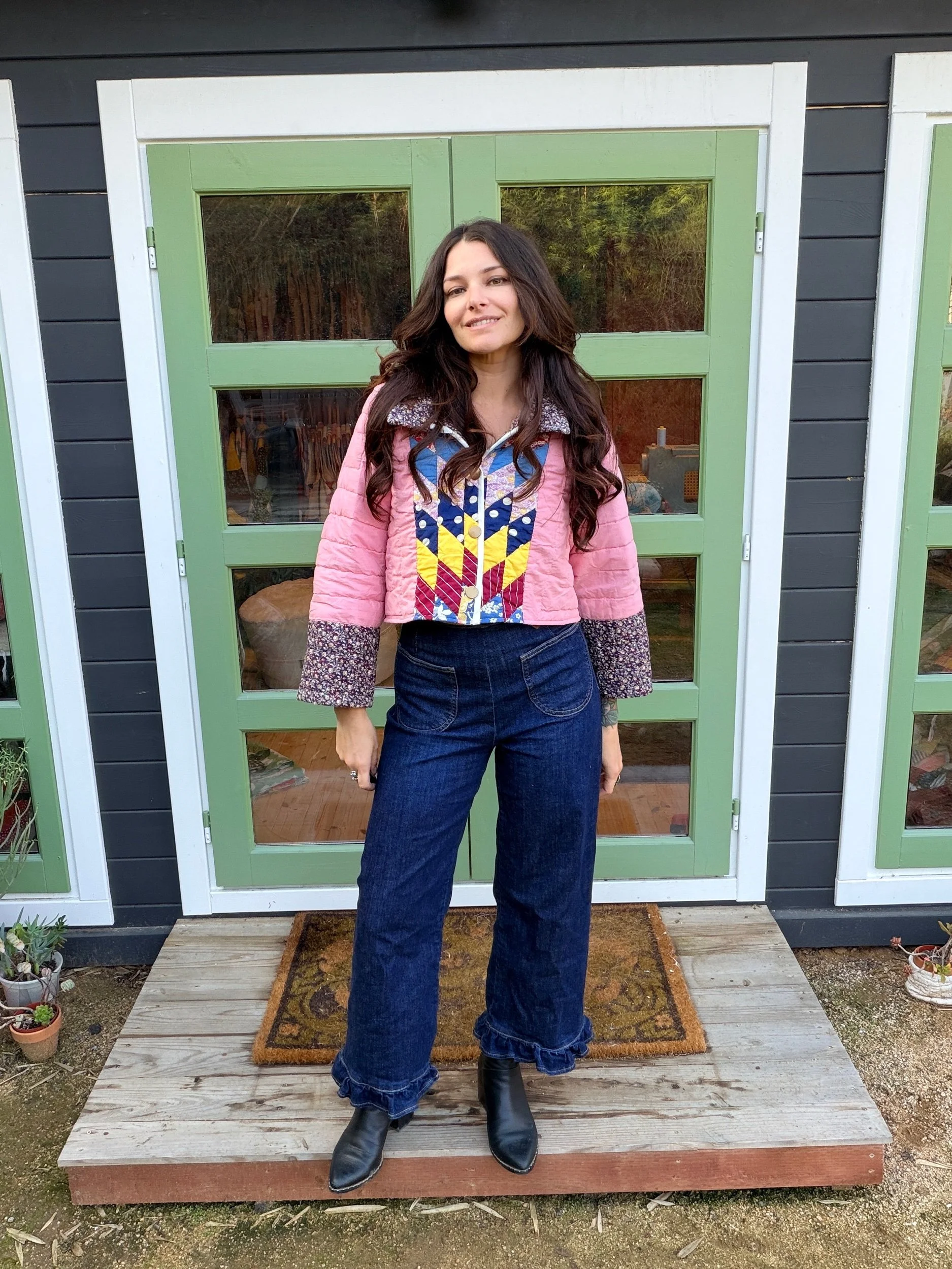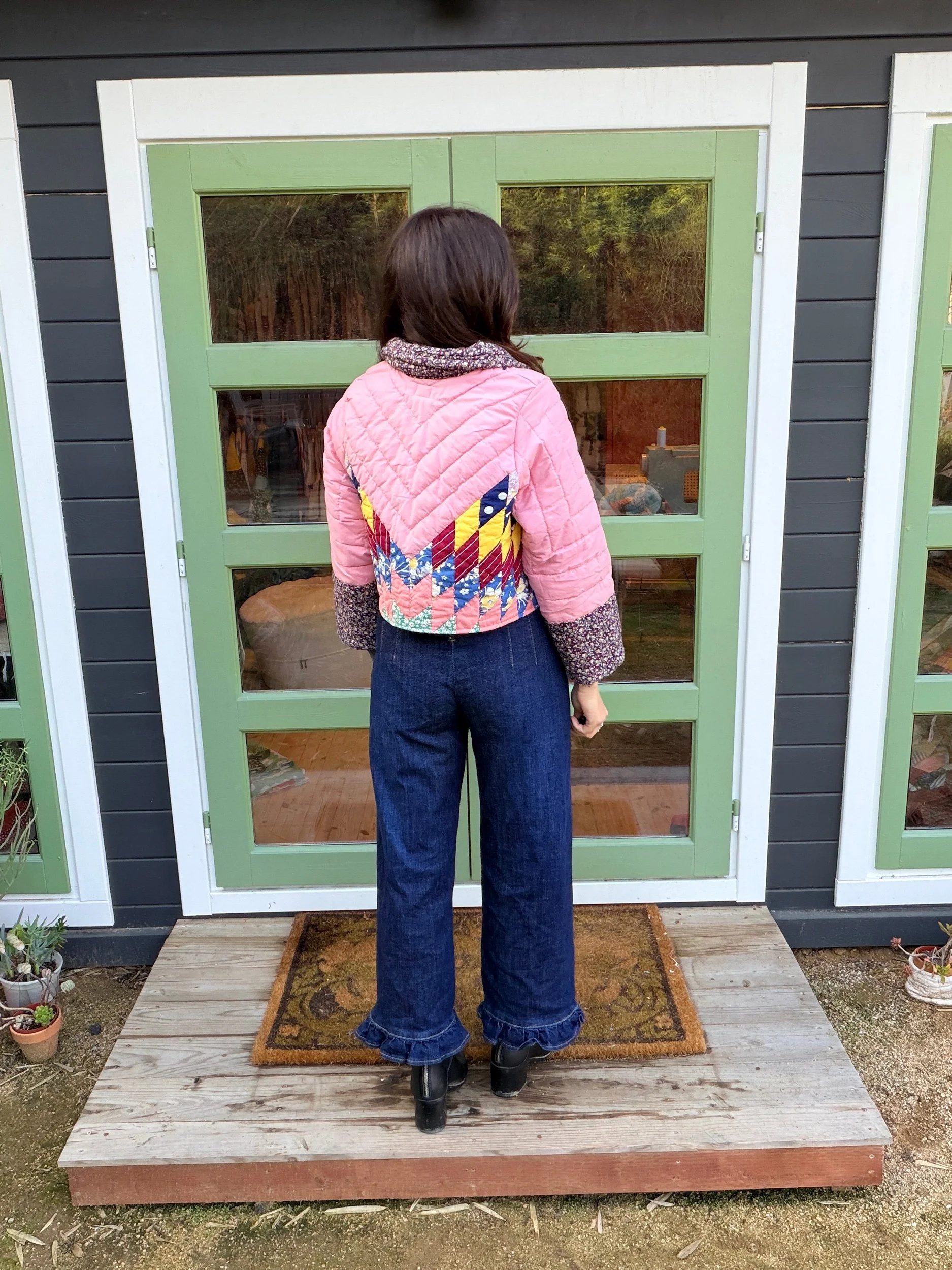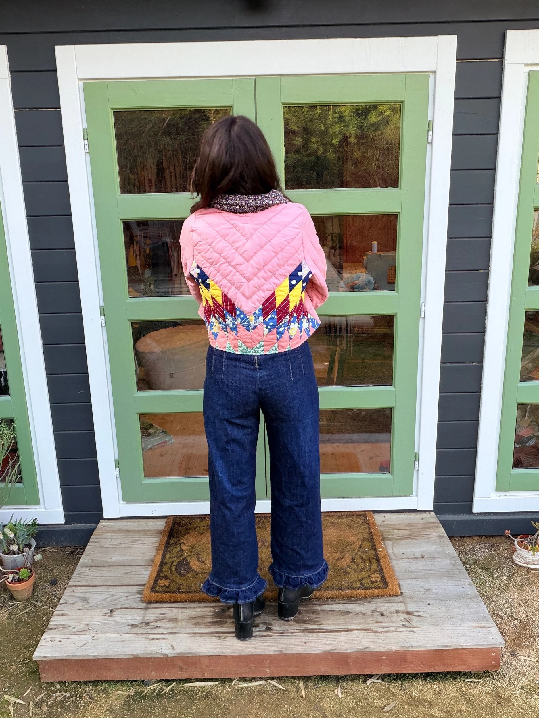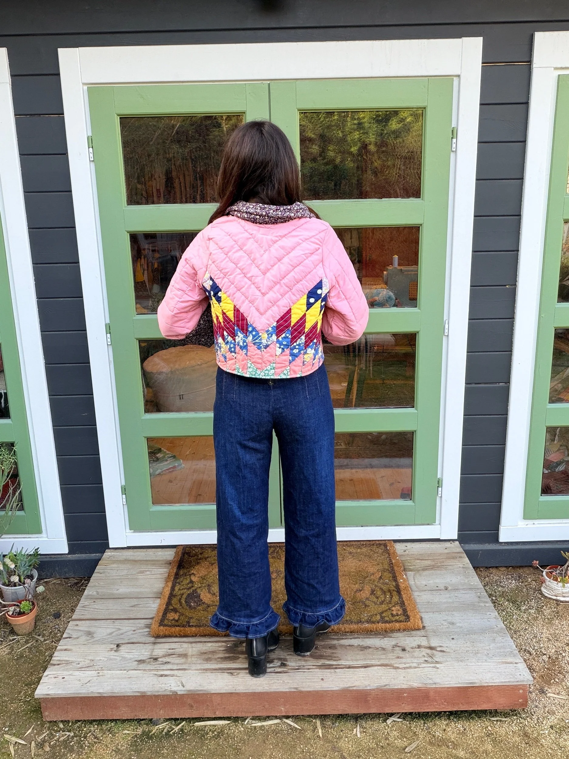 This Small lone star quilt jacket is truly one of a kind and incredibly comfortable. I love the charm of the Sunbonnet Sue with a modern twist making it a great addition to any wardrobe. This quilt coat is a statement piece that screams slow fashion. The 1970’s colors creates a stylish and nostalgic look. Perfect for a night out around town!