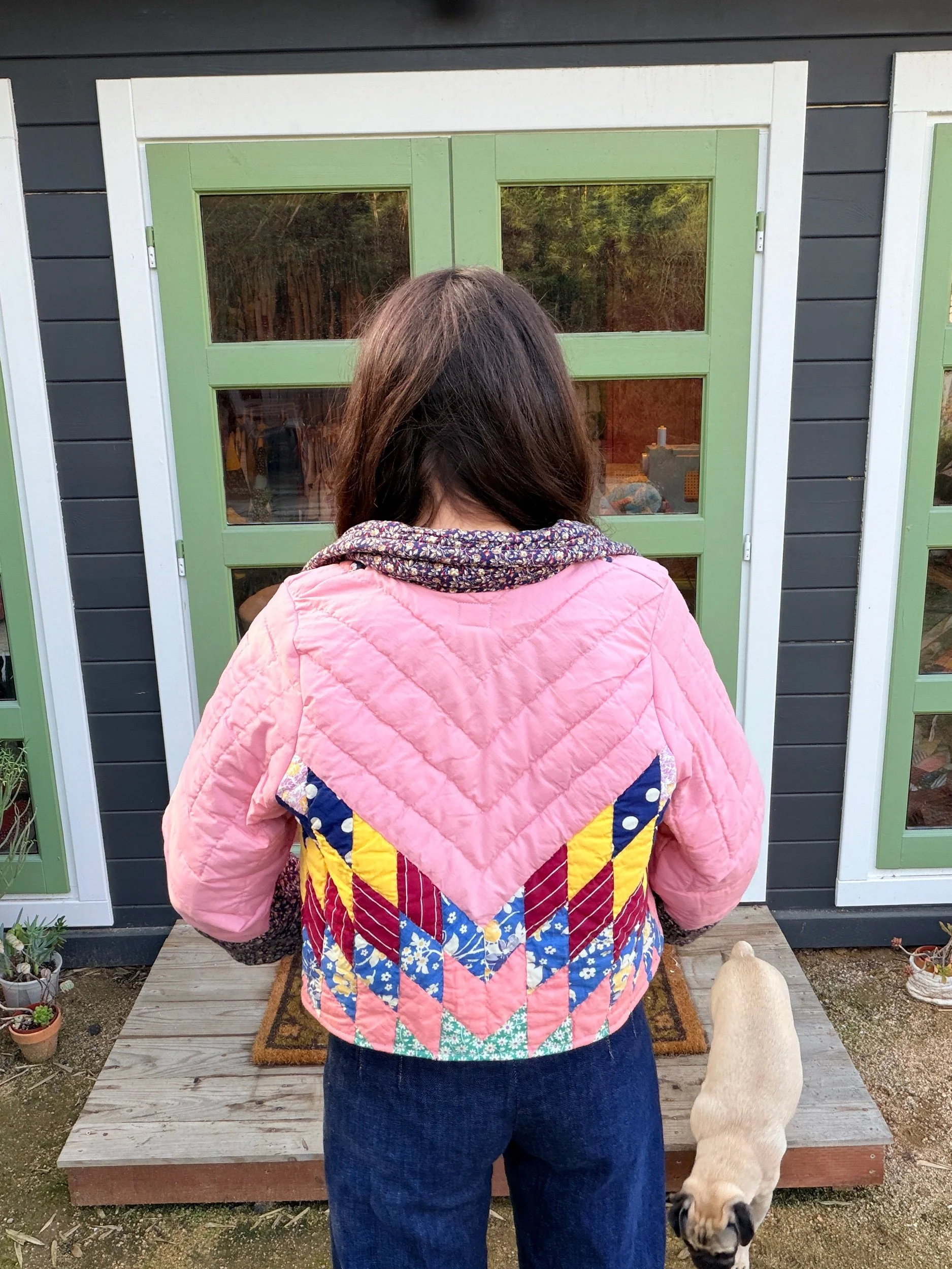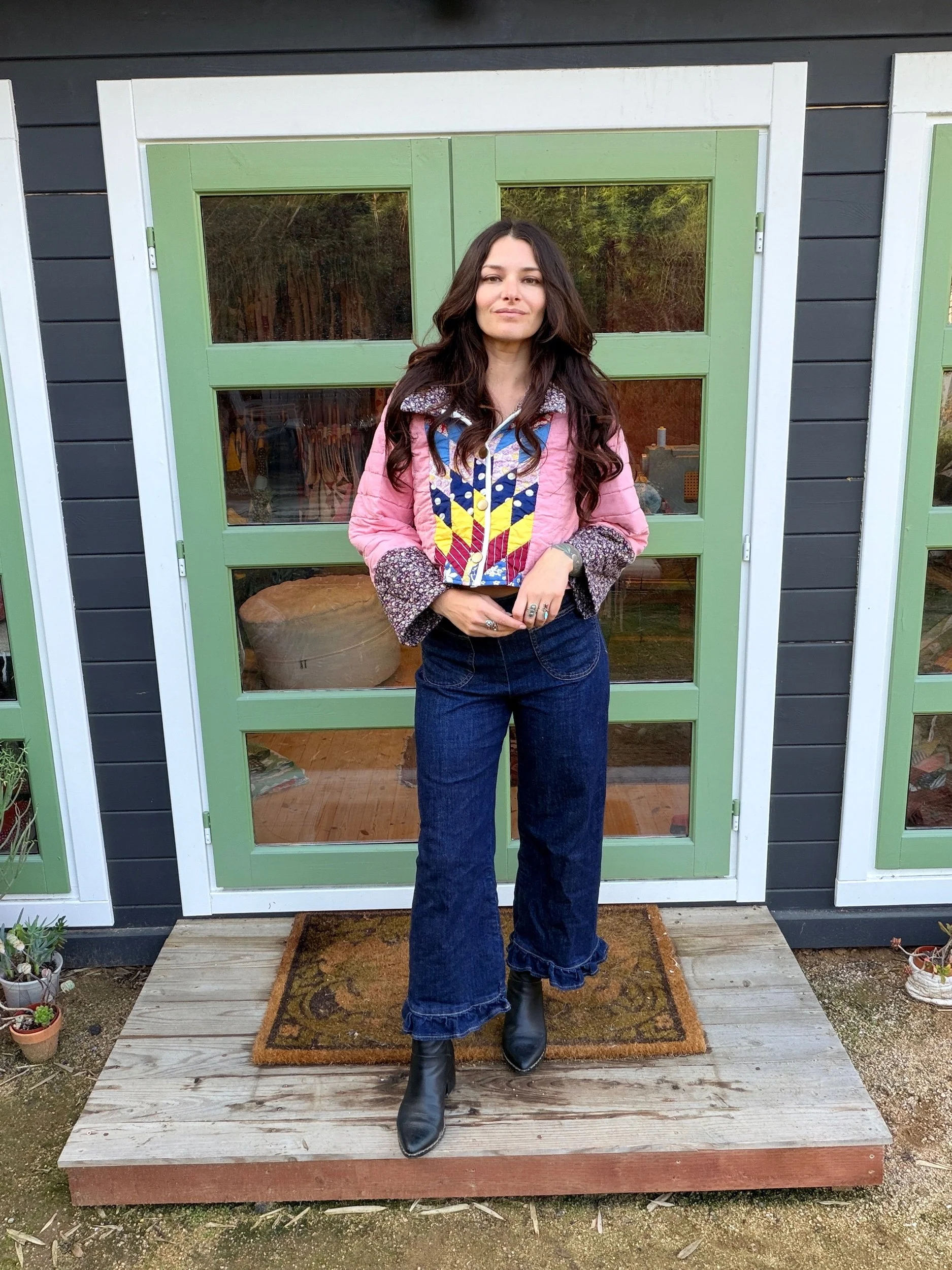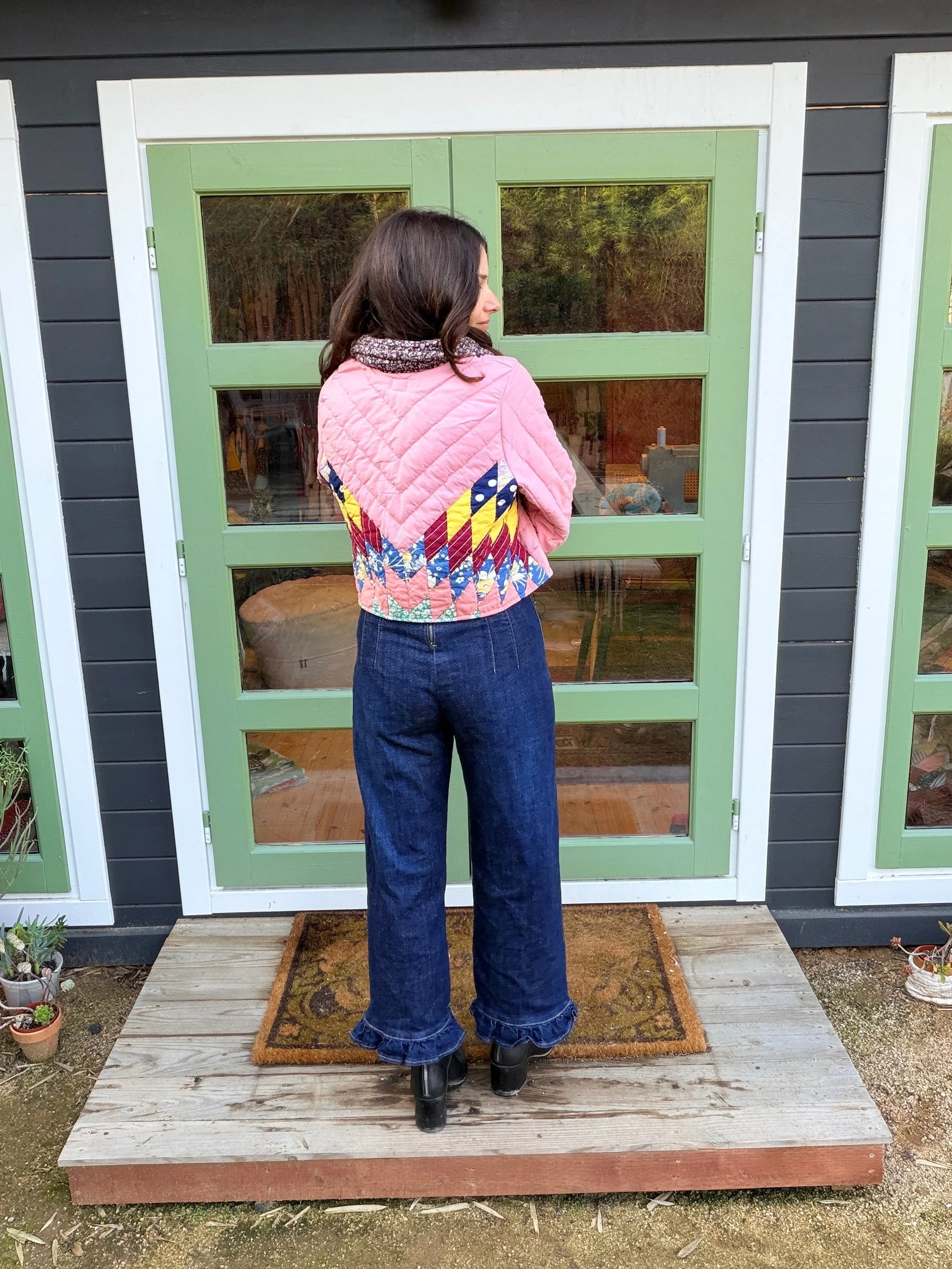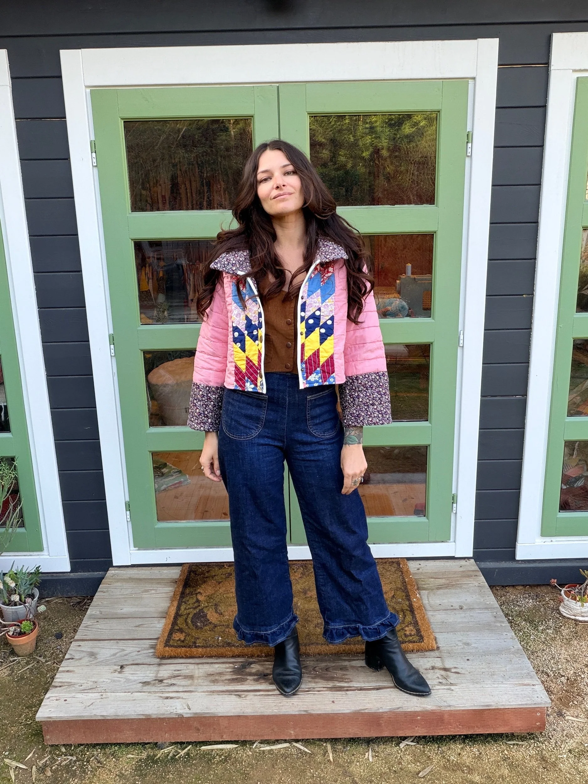 This Small lone star quilt jacket is truly one of a kind and incredibly comfortable. I love the charm of the Sunbonnet Sue with a modern twist making it a great addition to any wardrobe. This quilt coat is a statement piece that screams slow fashion. The 1970’s colors creates a stylish and nostalgic look. Perfect for a night out around town!