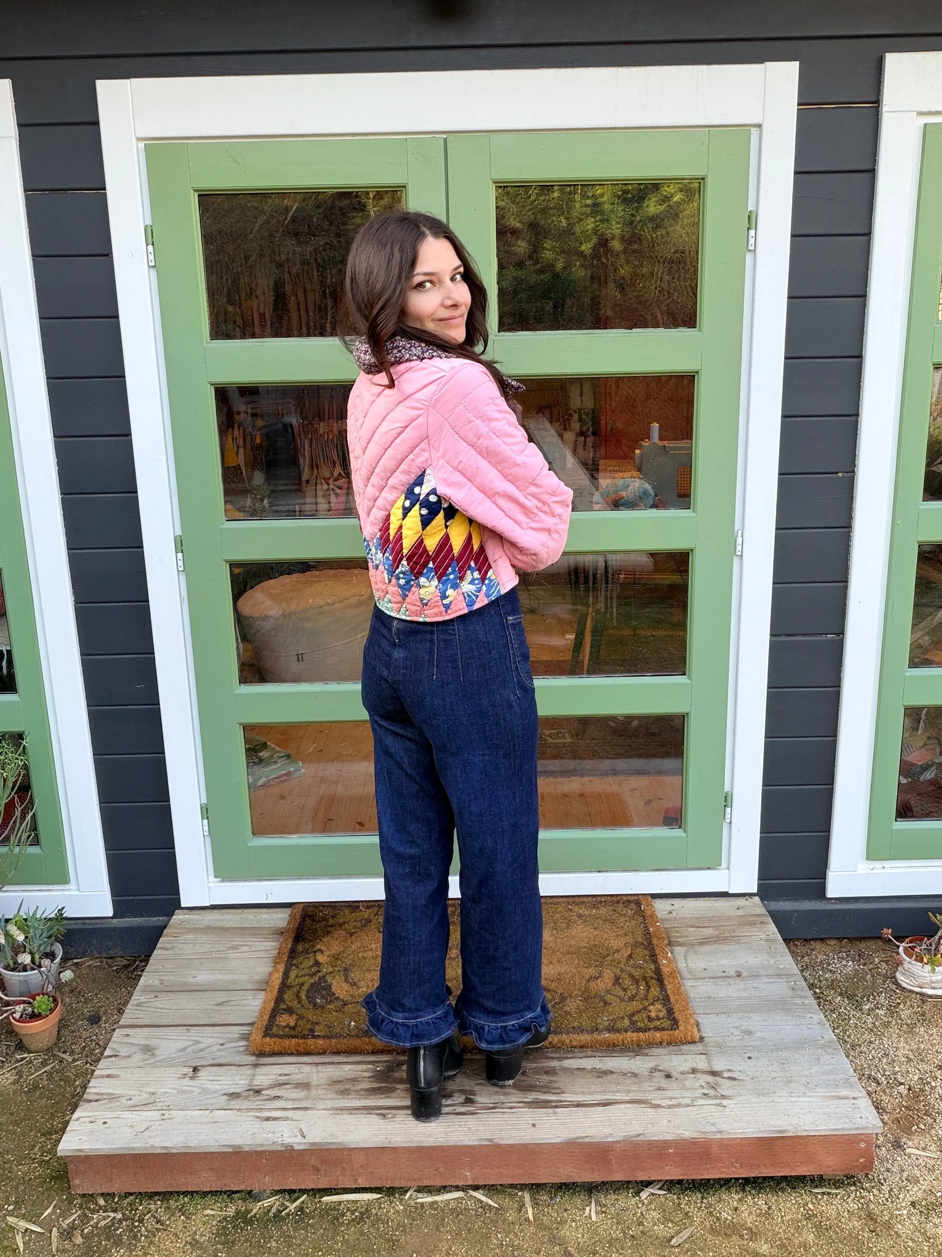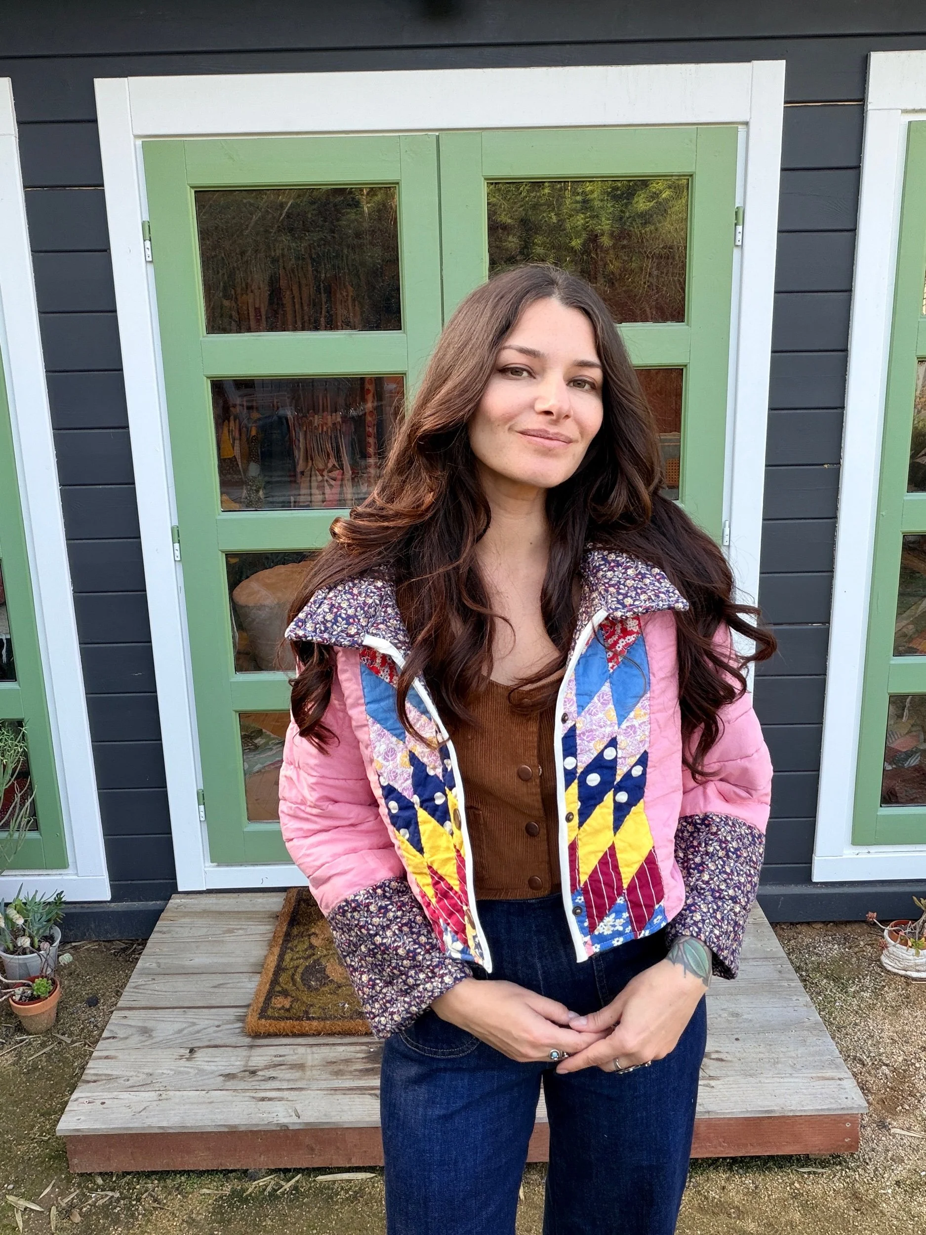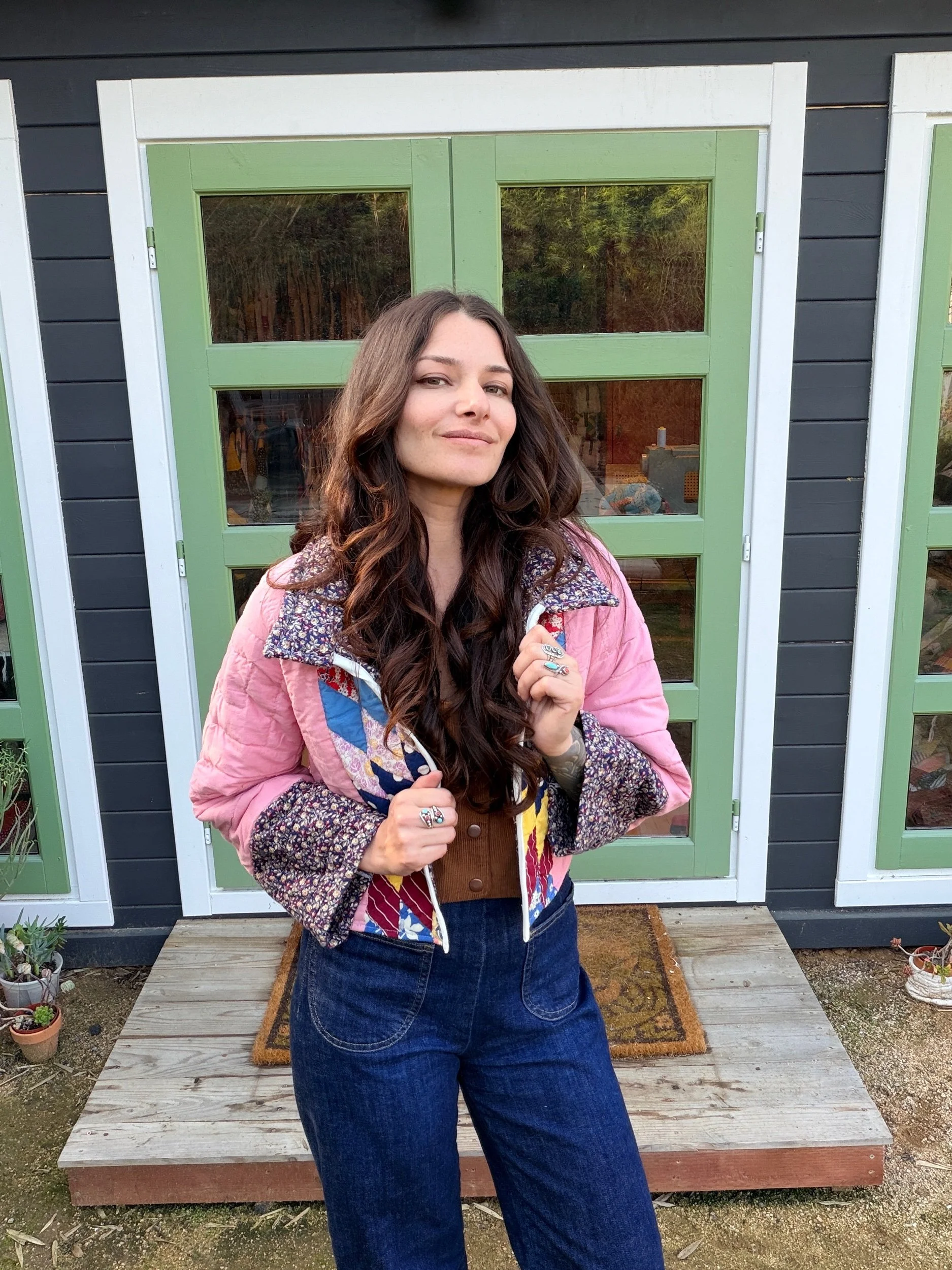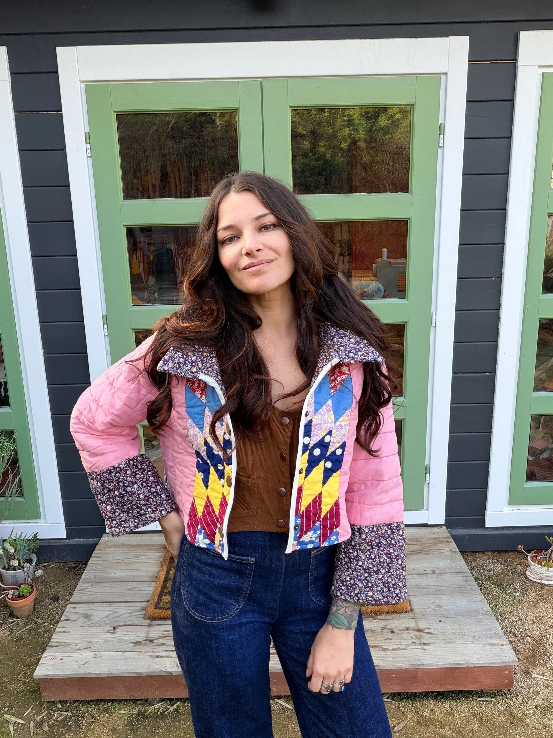 This Small lone star quilt jacket is truly one of a kind and incredibly comfortable. I love the charm of the Sunbonnet Sue with a modern twist making it a great addition to any wardrobe. This quilt coat is a statement piece that screams slow fashion. The 1970’s colors creates a stylish and nostalgic look. Perfect for a night out around town!