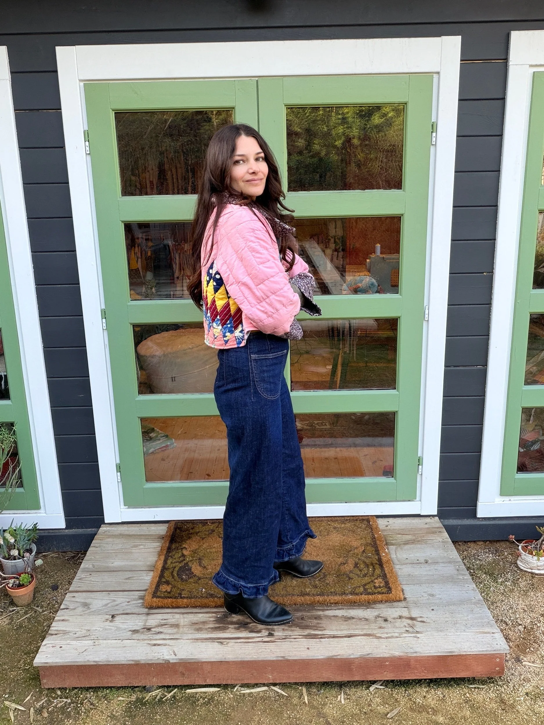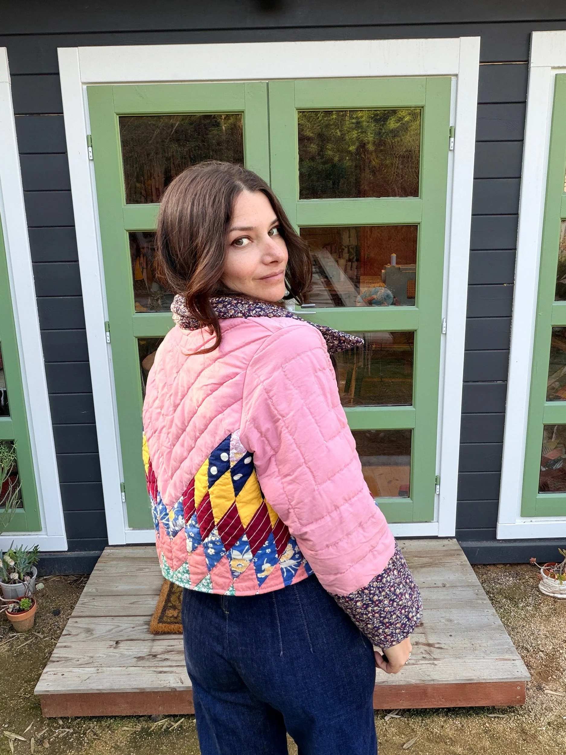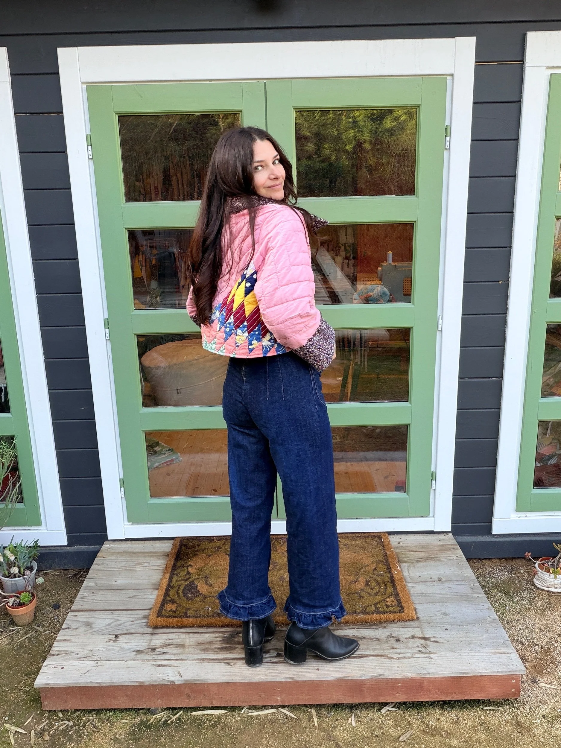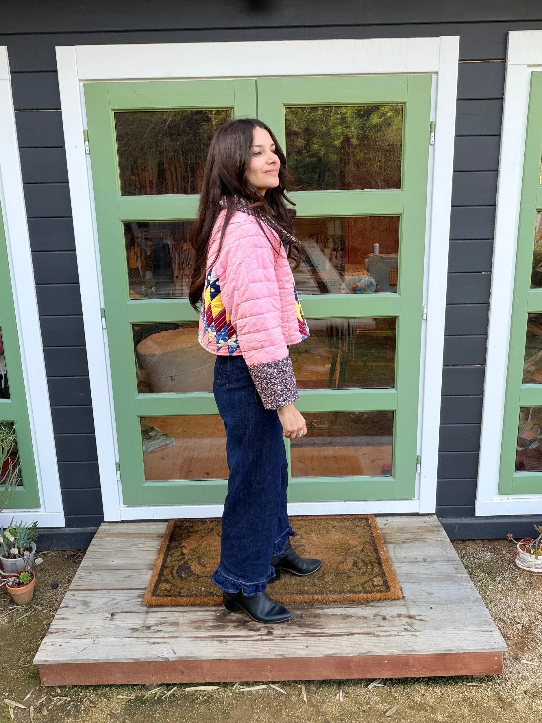 This Small lone star quilt jacket is truly one of a kind and incredibly comfortable. I love the charm of the Sunbonnet Sue with a modern twist making it a great addition to any wardrobe. This quilt coat is a statement piece that screams slow fashion. The 1970’s colors creates a stylish and nostalgic look. Perfect for a night out around town!