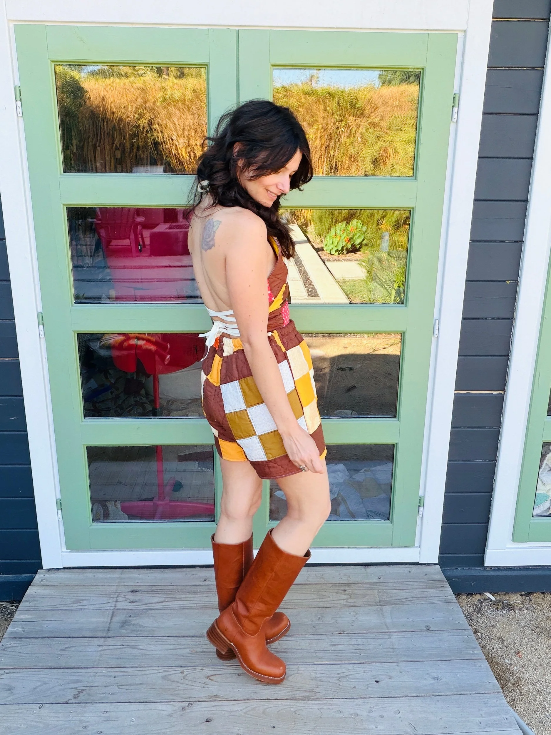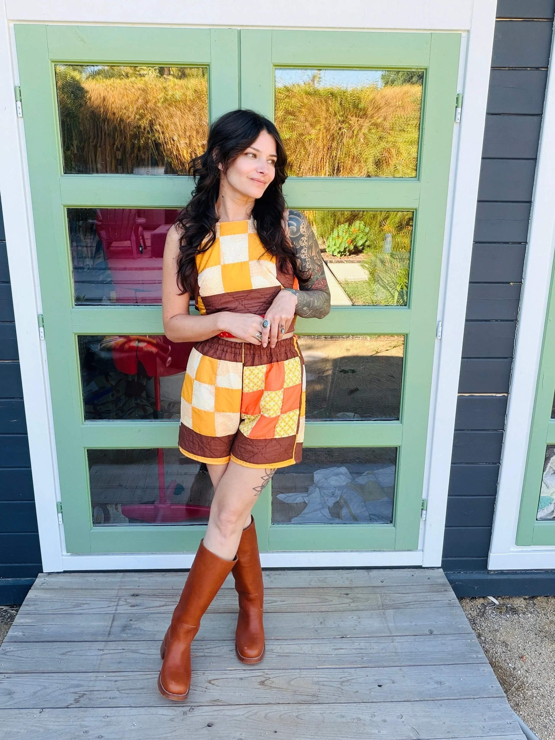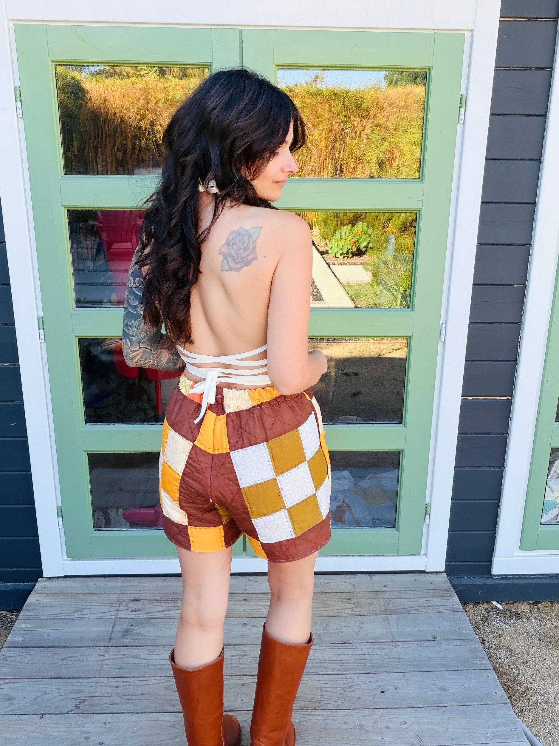 These one-of-a-kind quilt shorts are handmade by Milk Thistle Sewing using a reclaimed vintage quilt. Each pair is carefully cut and sewn to highlight the original patchwork, making every piece truly unique.