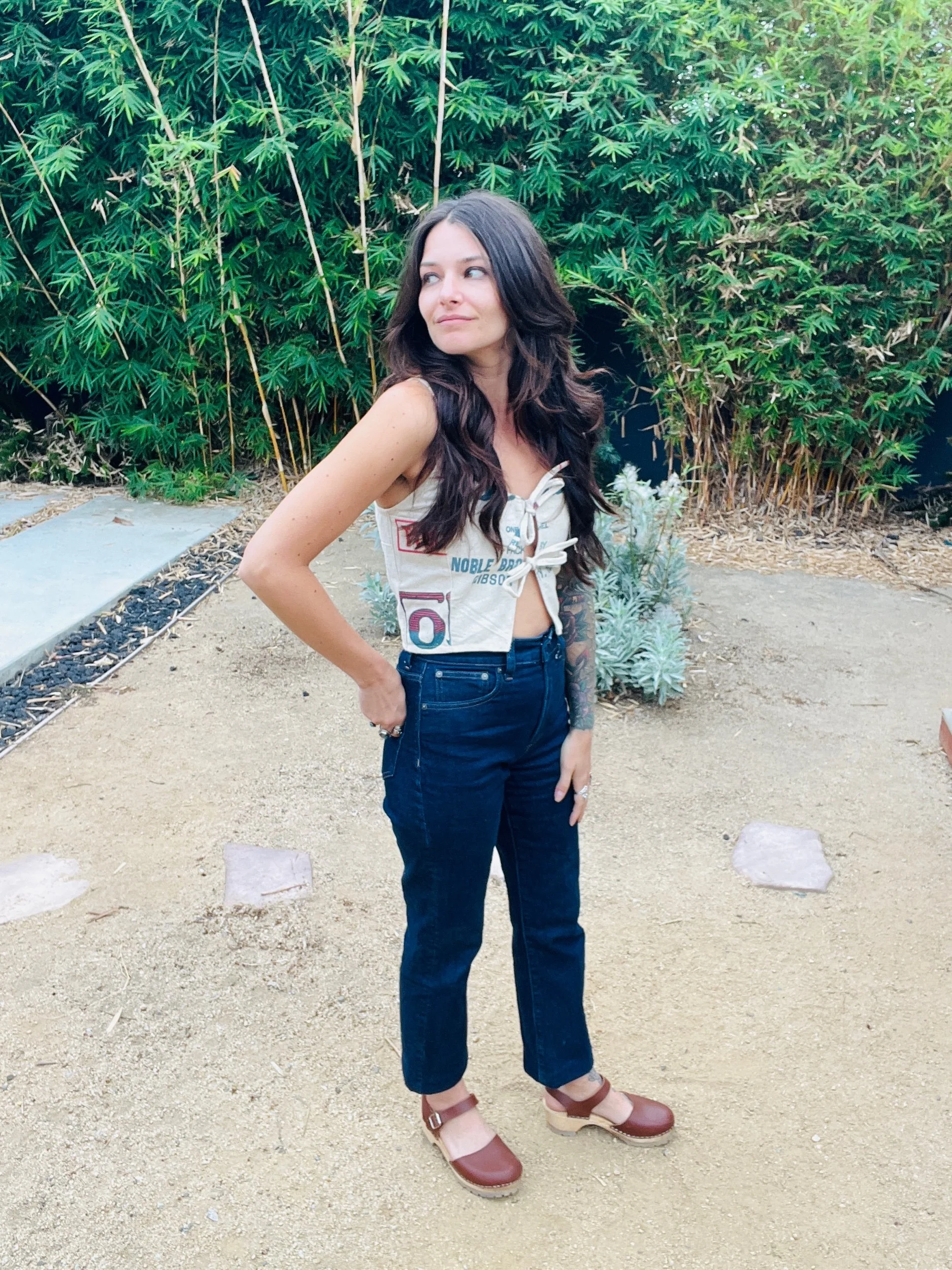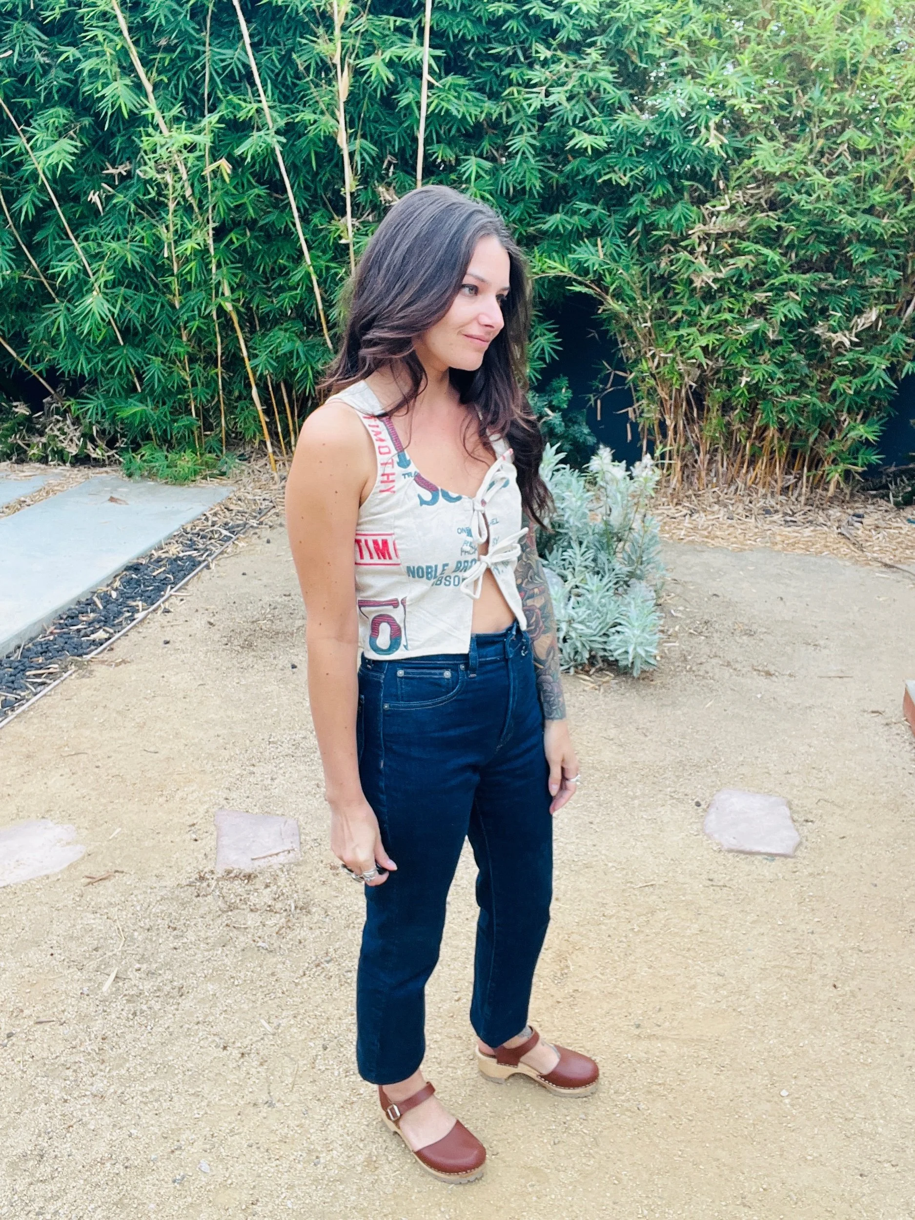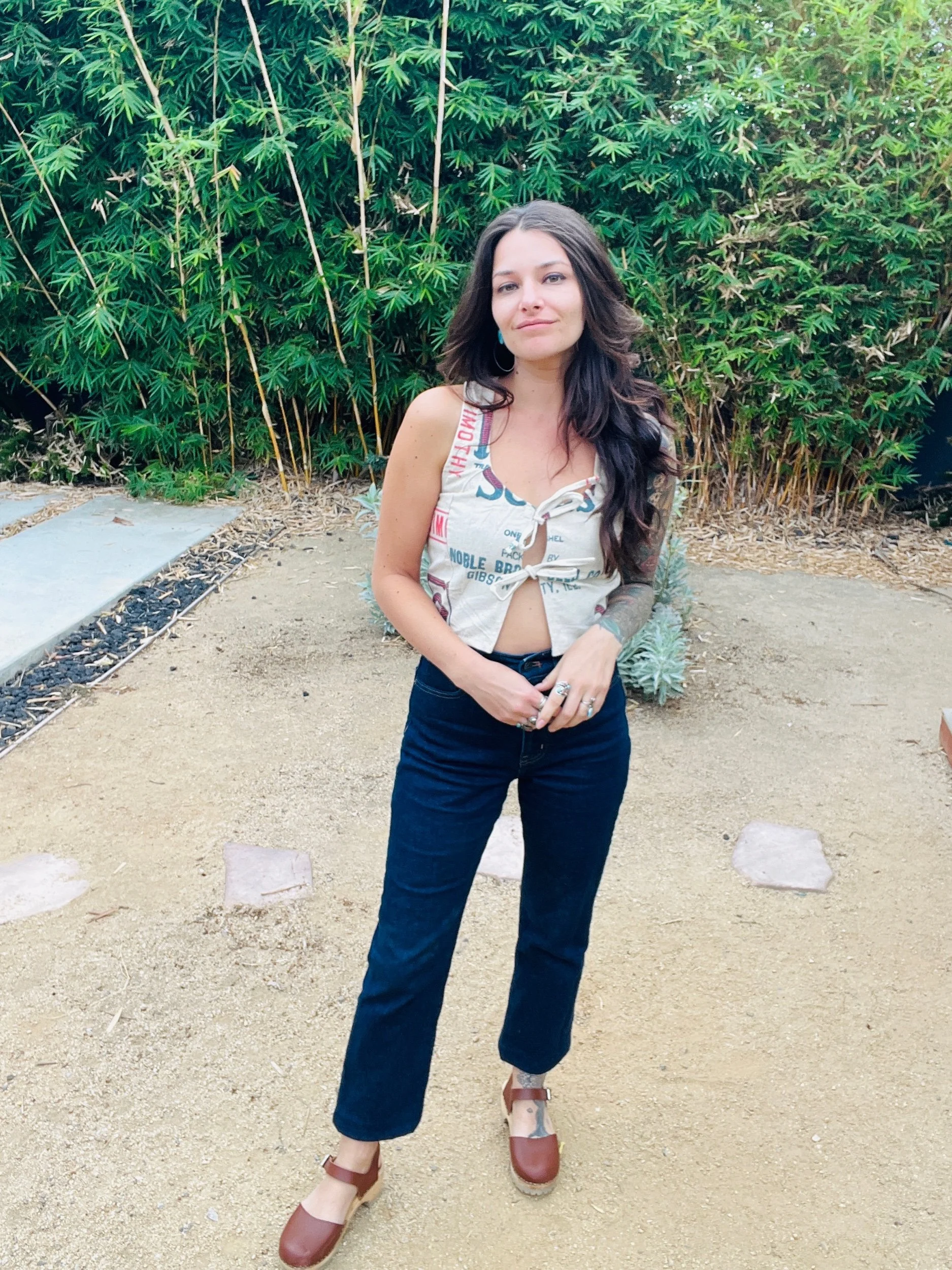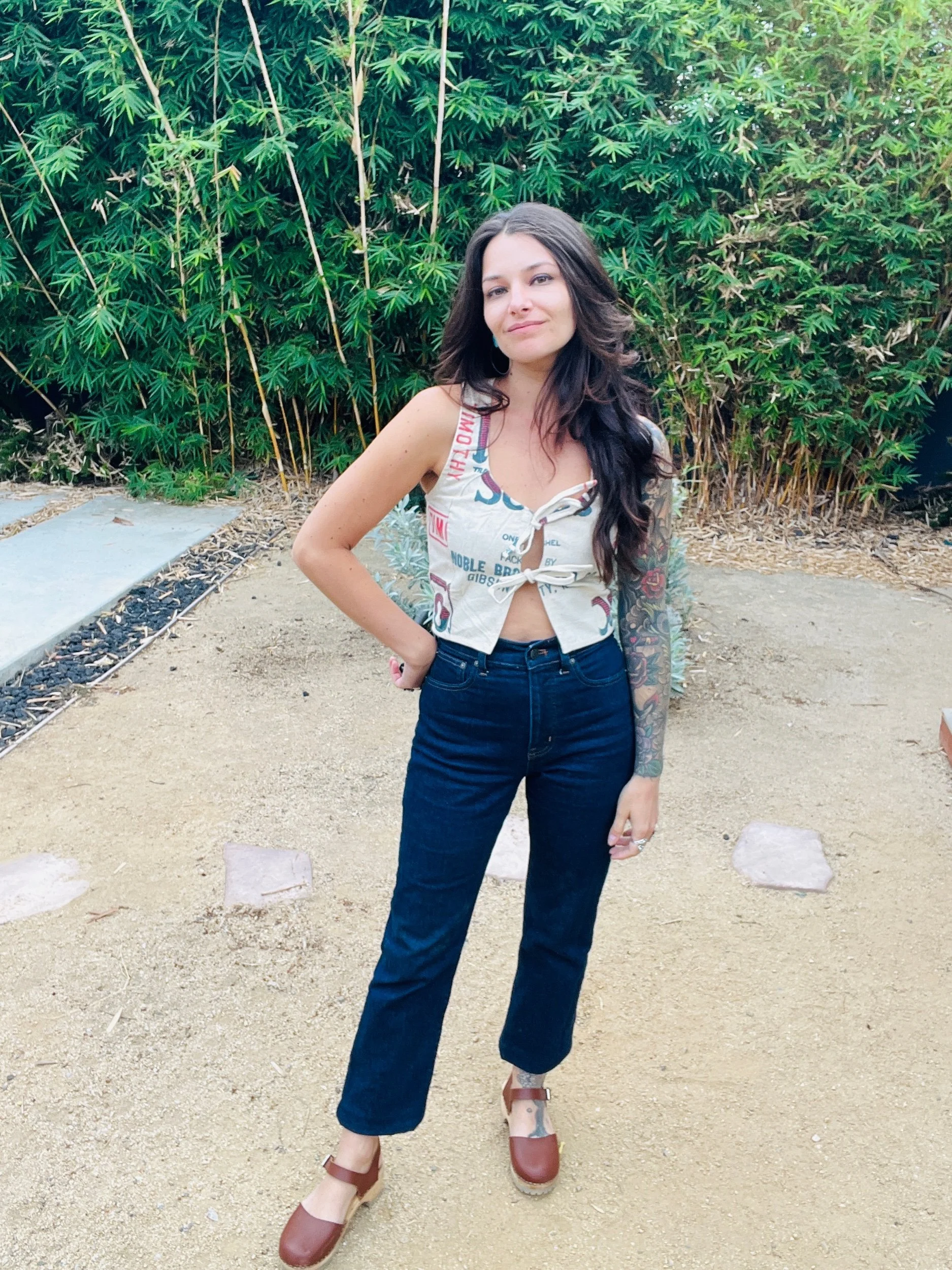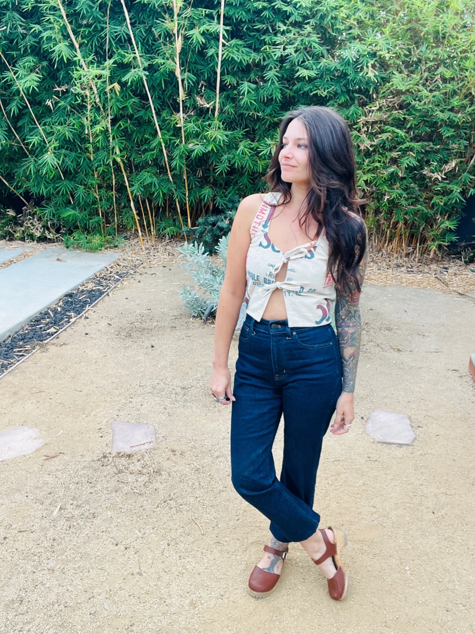 I’m 5’4, 120 pounds, a B cup, and this is how it fits me. All the material is vintage and handmade. I upcycled this quilt in my studio in Long Beach! it’s so cute!!