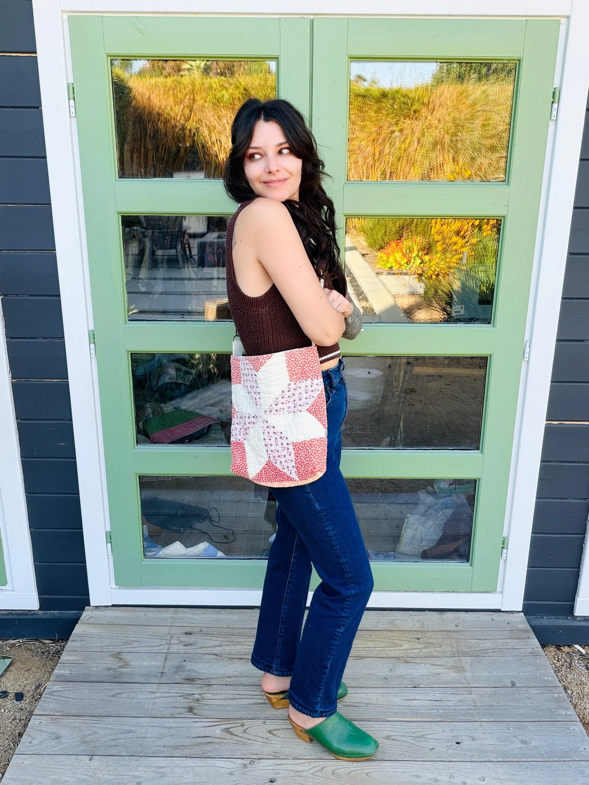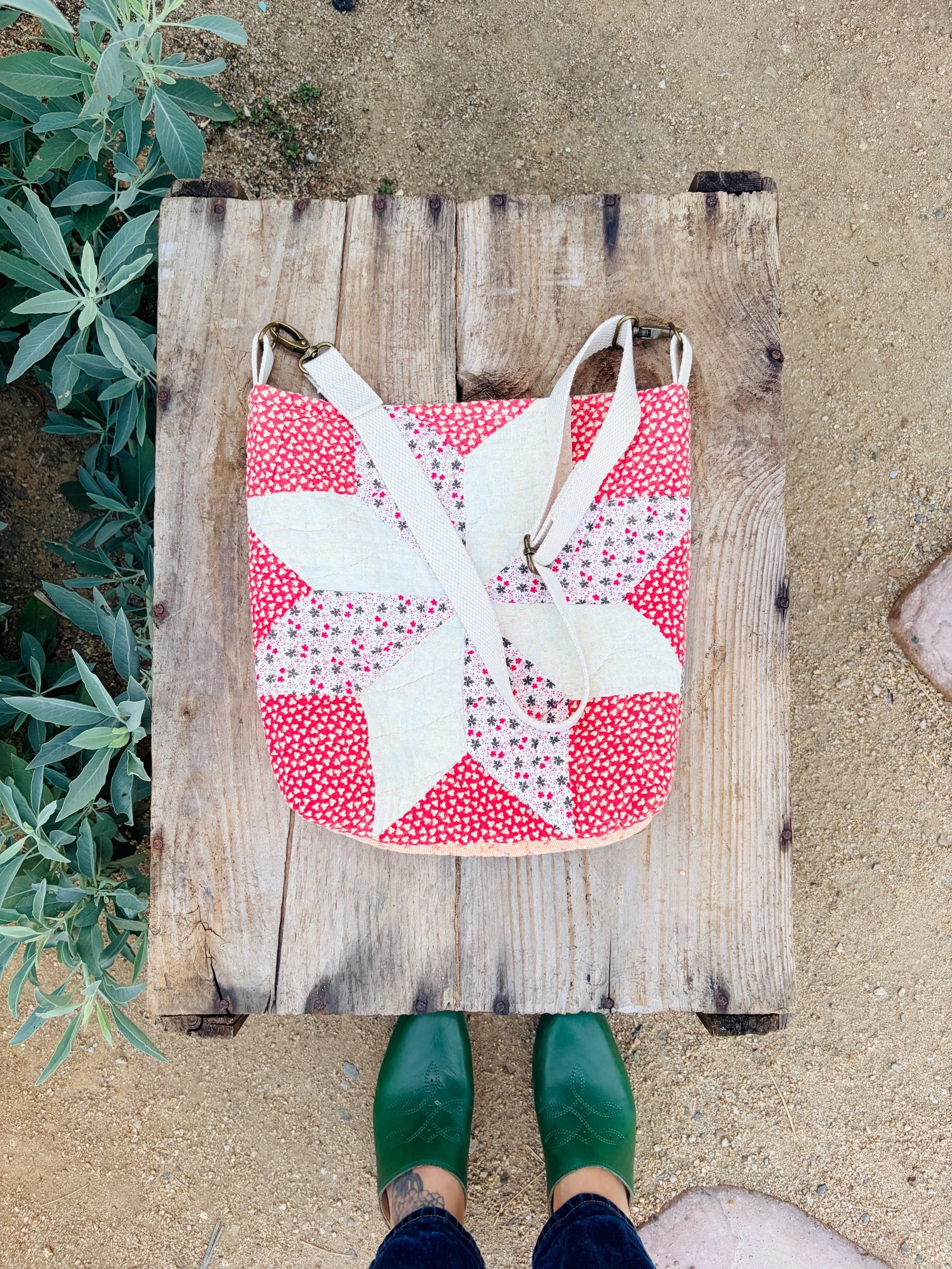 This one-of-a-kind quilted crossbody bag is made from a vintage 1940s quilt, giving new life to a beautiful piece of textile history. The bold geometric star pattern in warm pinks, faded yellows, and soft ivory carries that unmistakable 40s charm—earthy, cozy, and full of character.
