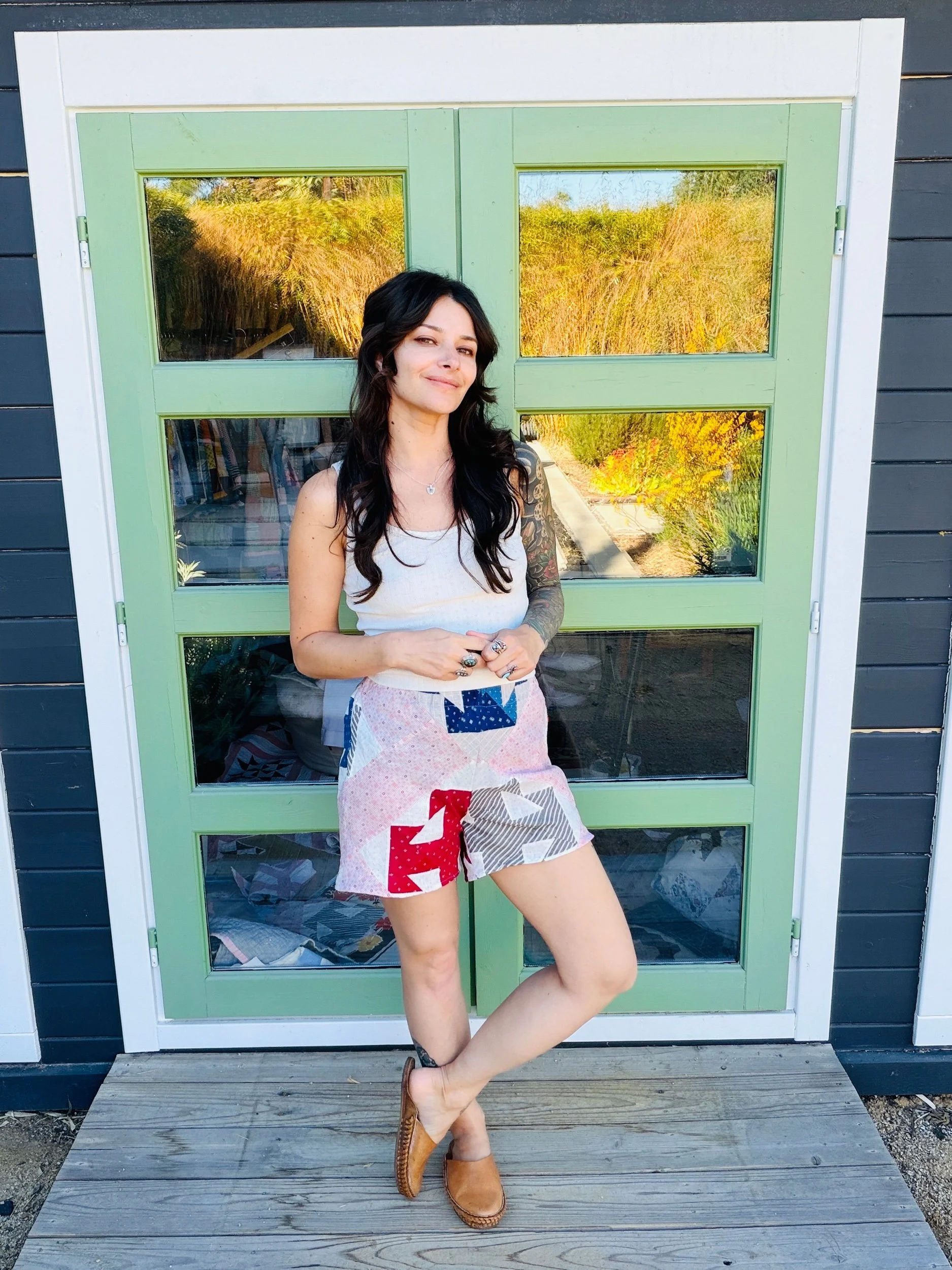 These one-of-a-kind quilt top shorts are handmade by Milk Thistle Sewing using a vintage reclaimed vintage quilt top. Each pair is carefully cut and sewn to highlight the original patchwork, making every piece truly unique.