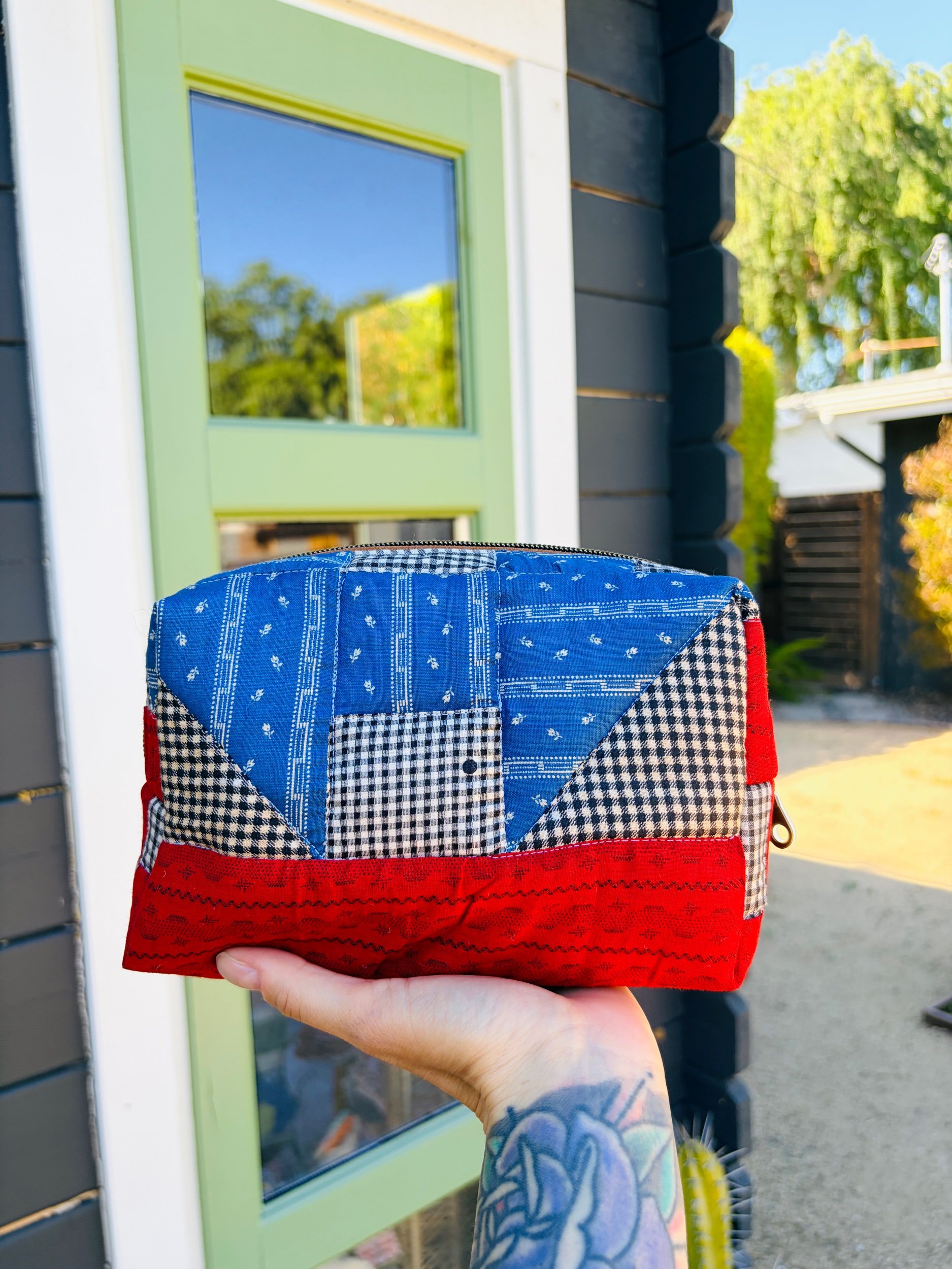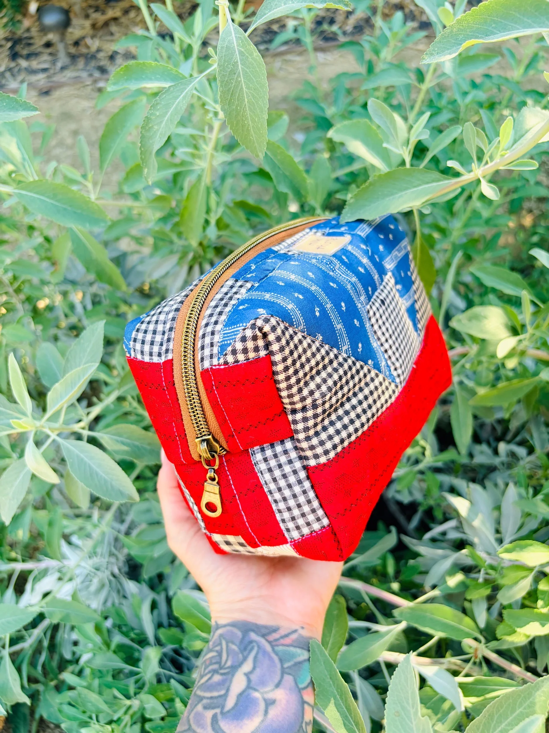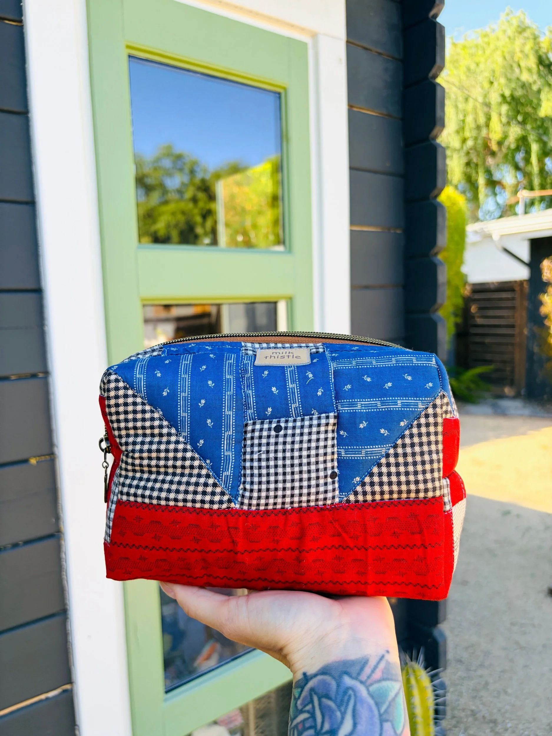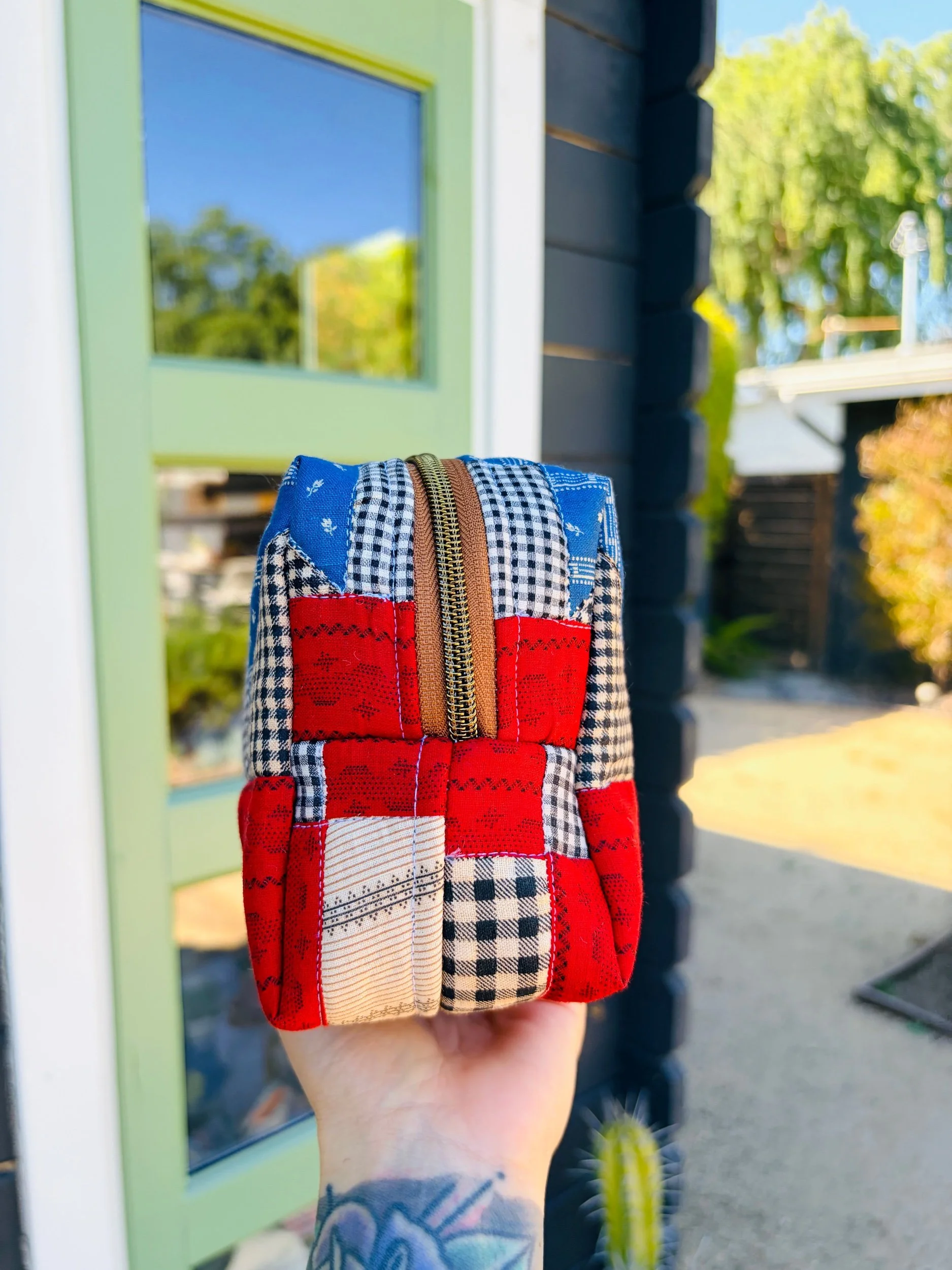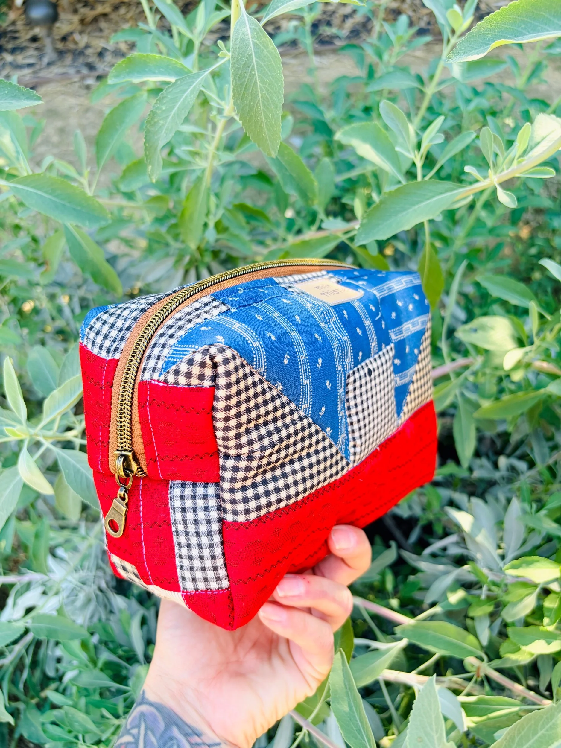 I hand-quilted the exterior to honor the original craftsmanship, adding texture and durability while preserving the vintage charm. Inside, it’s fully lined with sturdy vintage denim — giving it structure, strength, and a beautiful contrast to the soft quilted exterior. The warm brass zipper adds a classic finishing touch and glides smoothly for secure closure.