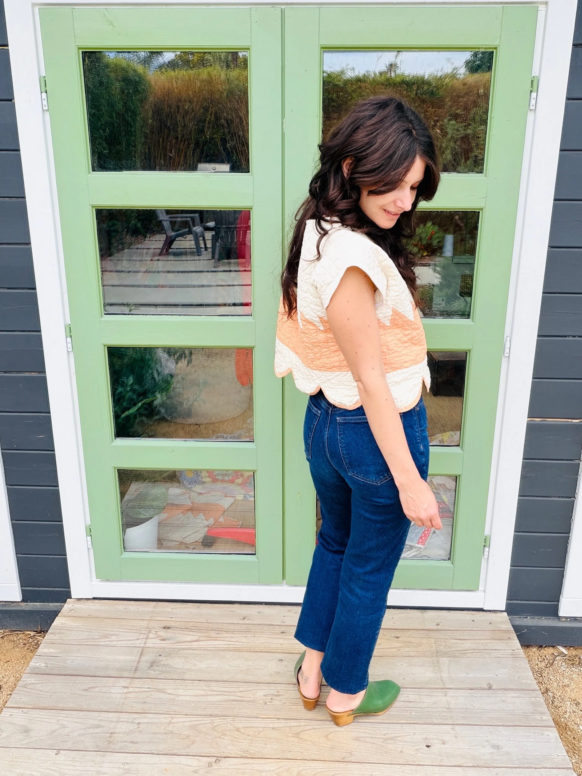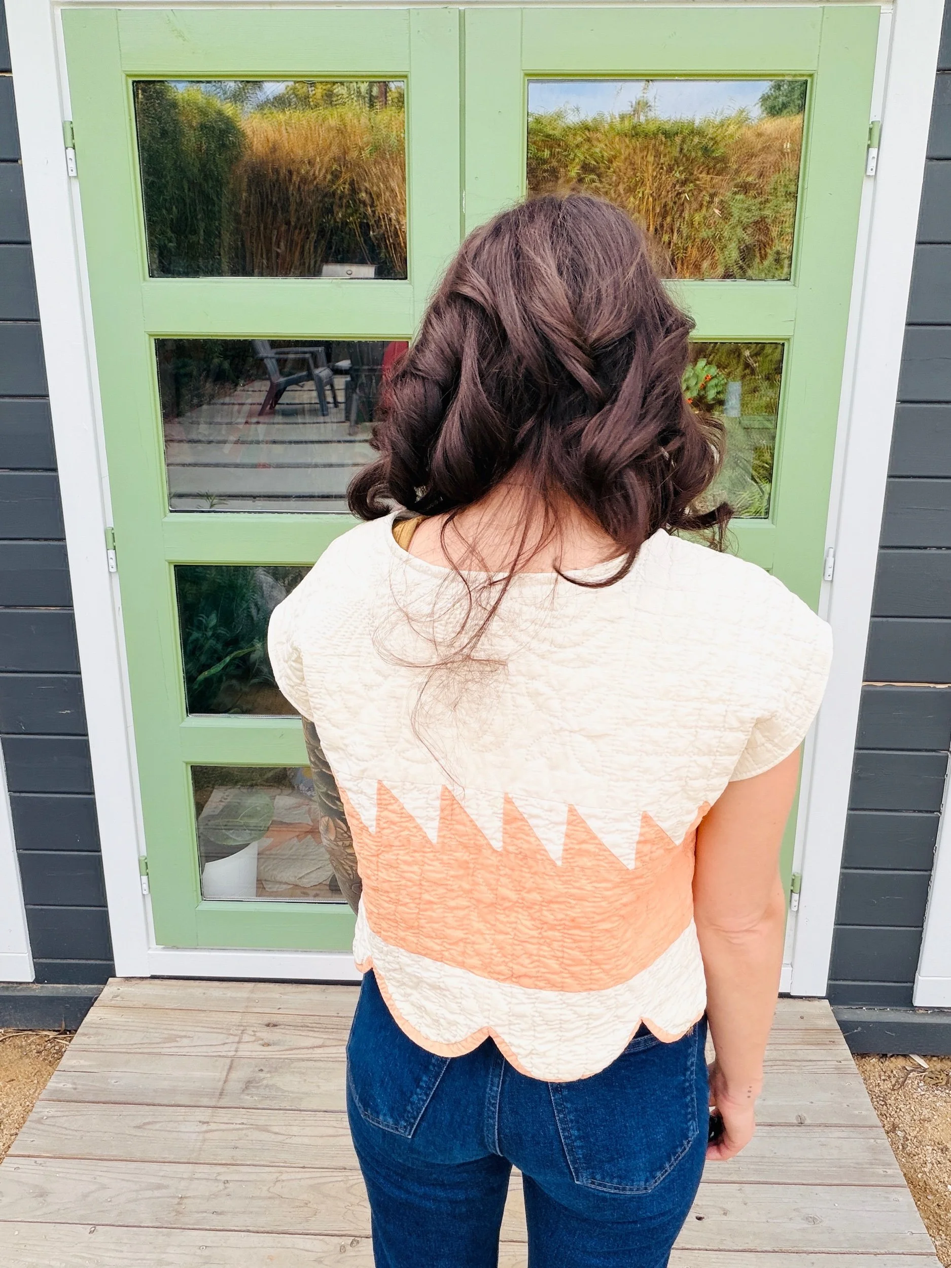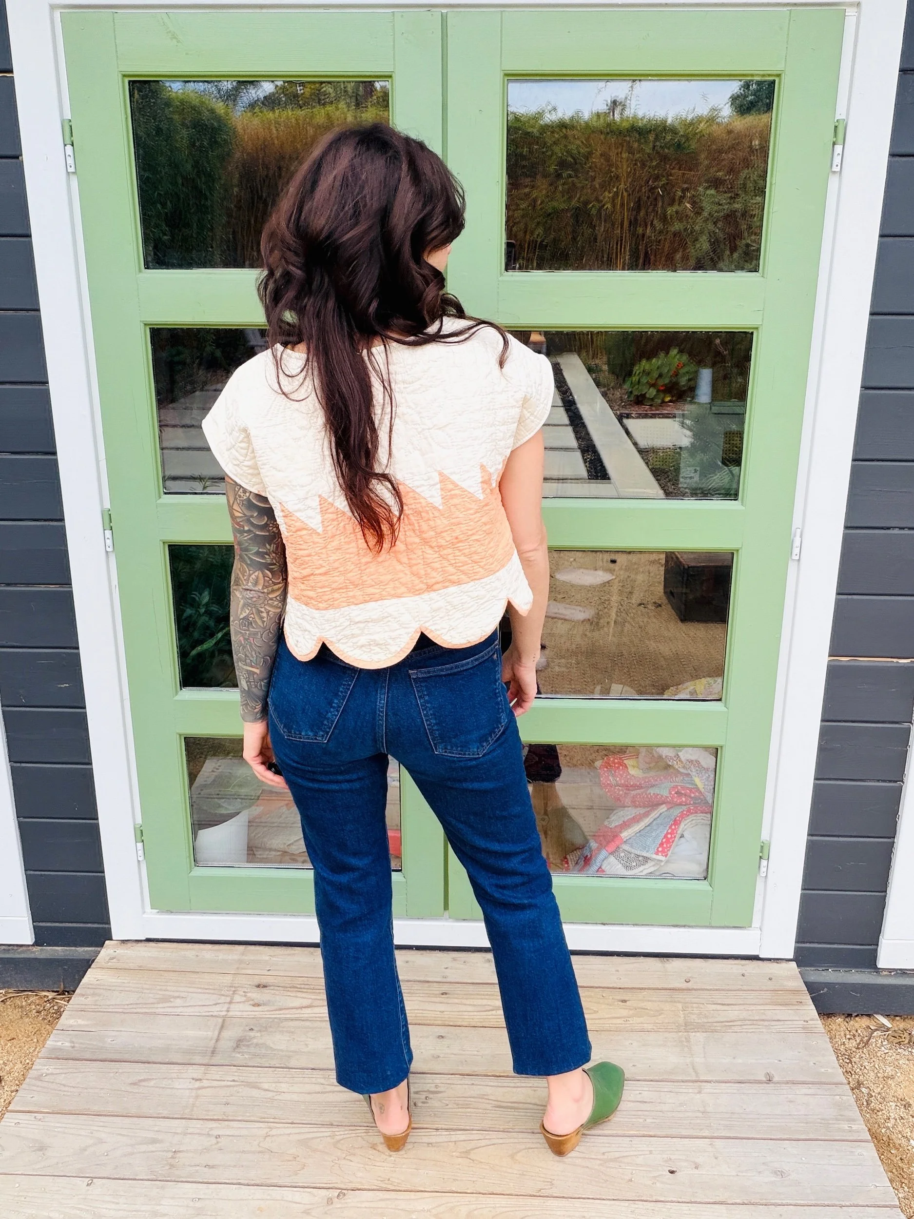The silhouette is an easy, boxy crop with scalloped edges making it really unique. It hits at the natural waist, making it effortless with high-waisted trousers, denim, or a flowing prairie skirt. The short sleeves and clean neckline keep it simple, letting the antique textile shine.