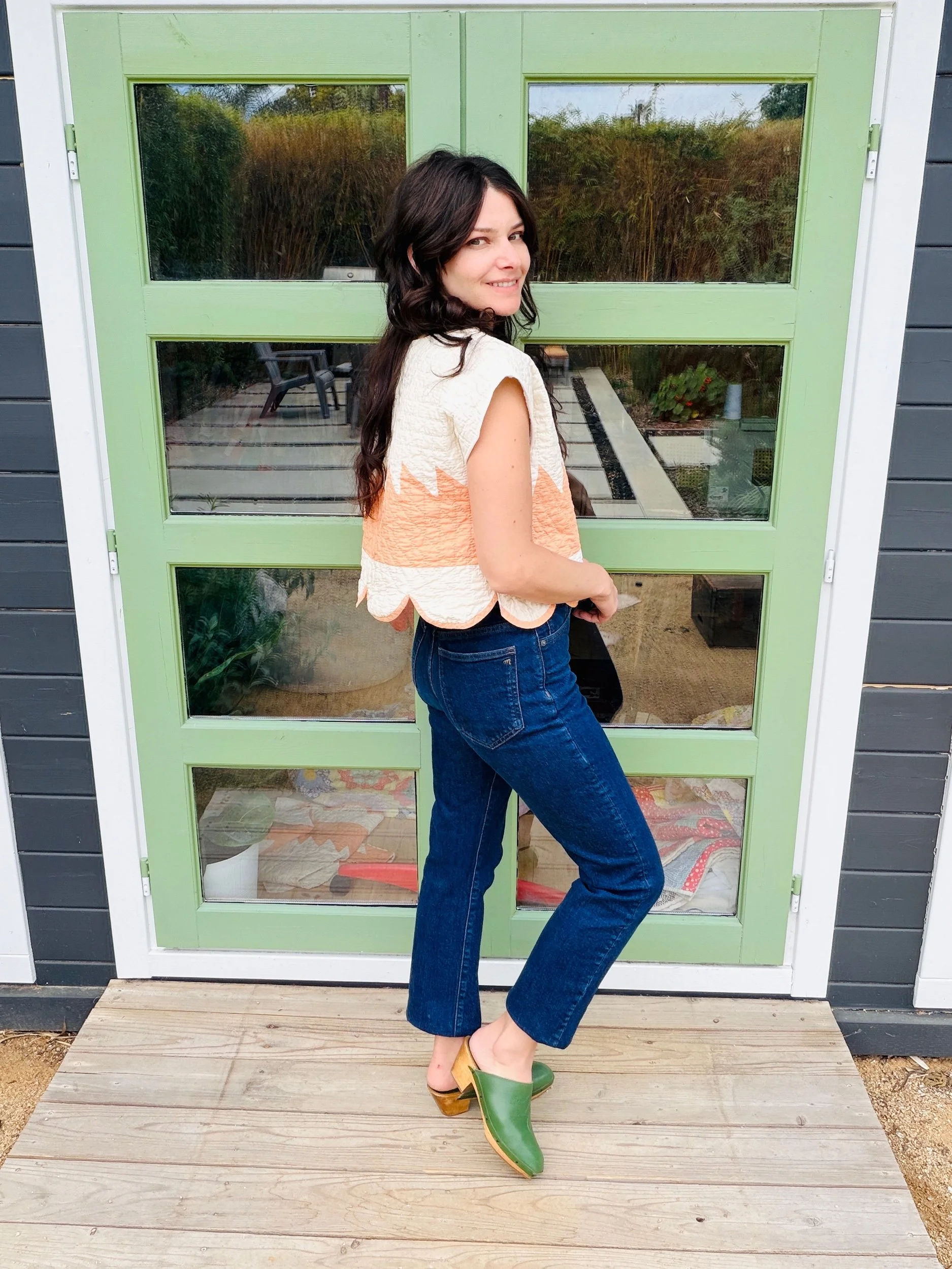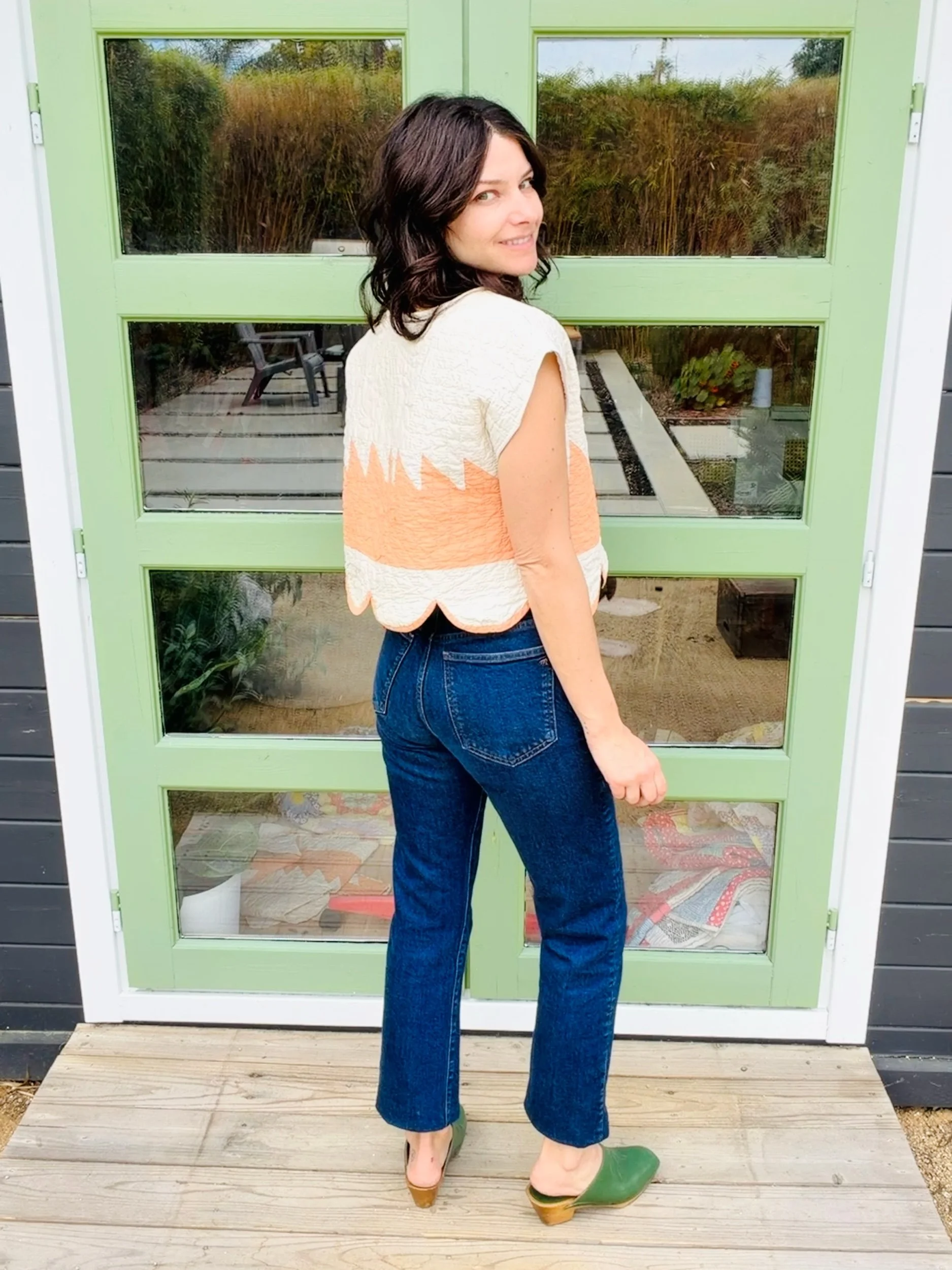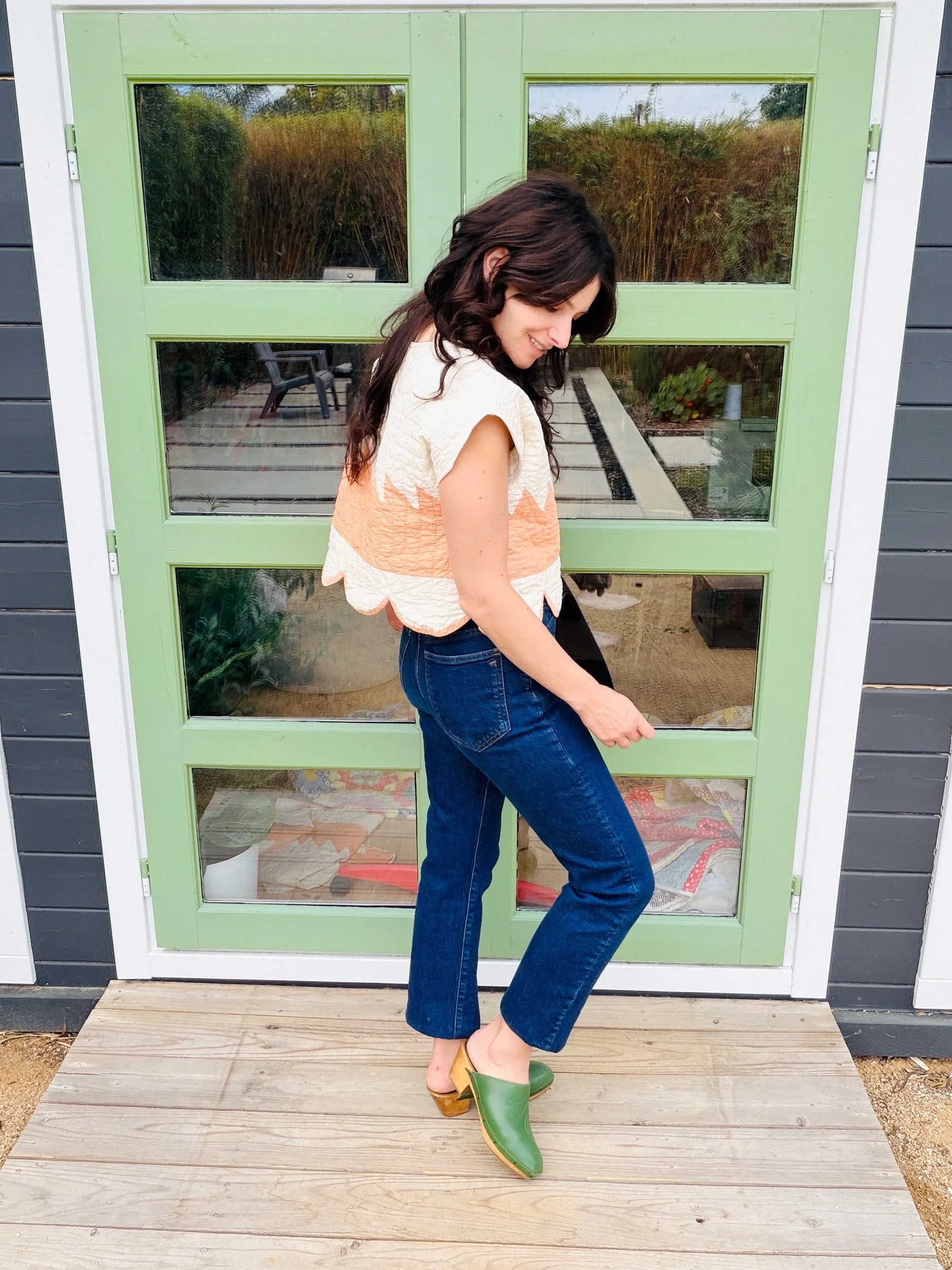 The silhouette is an easy, boxy crop with scalloped edges making it really unique. It hits at the natural waist, making it effortless with high-waisted trousers, denim, or a flowing prairie skirt. The short sleeves and clean neckline keep it simple, letting the antique textile shine.