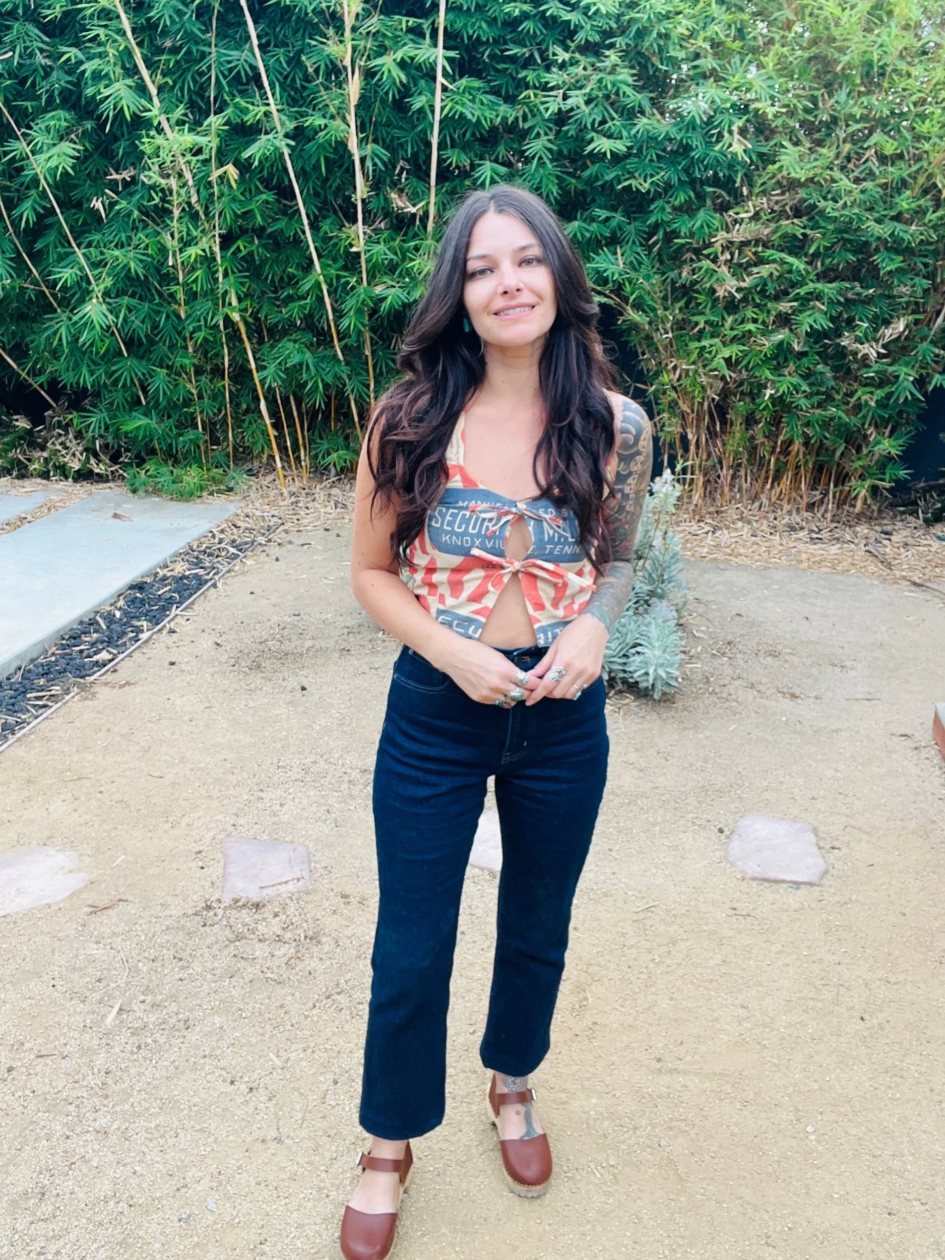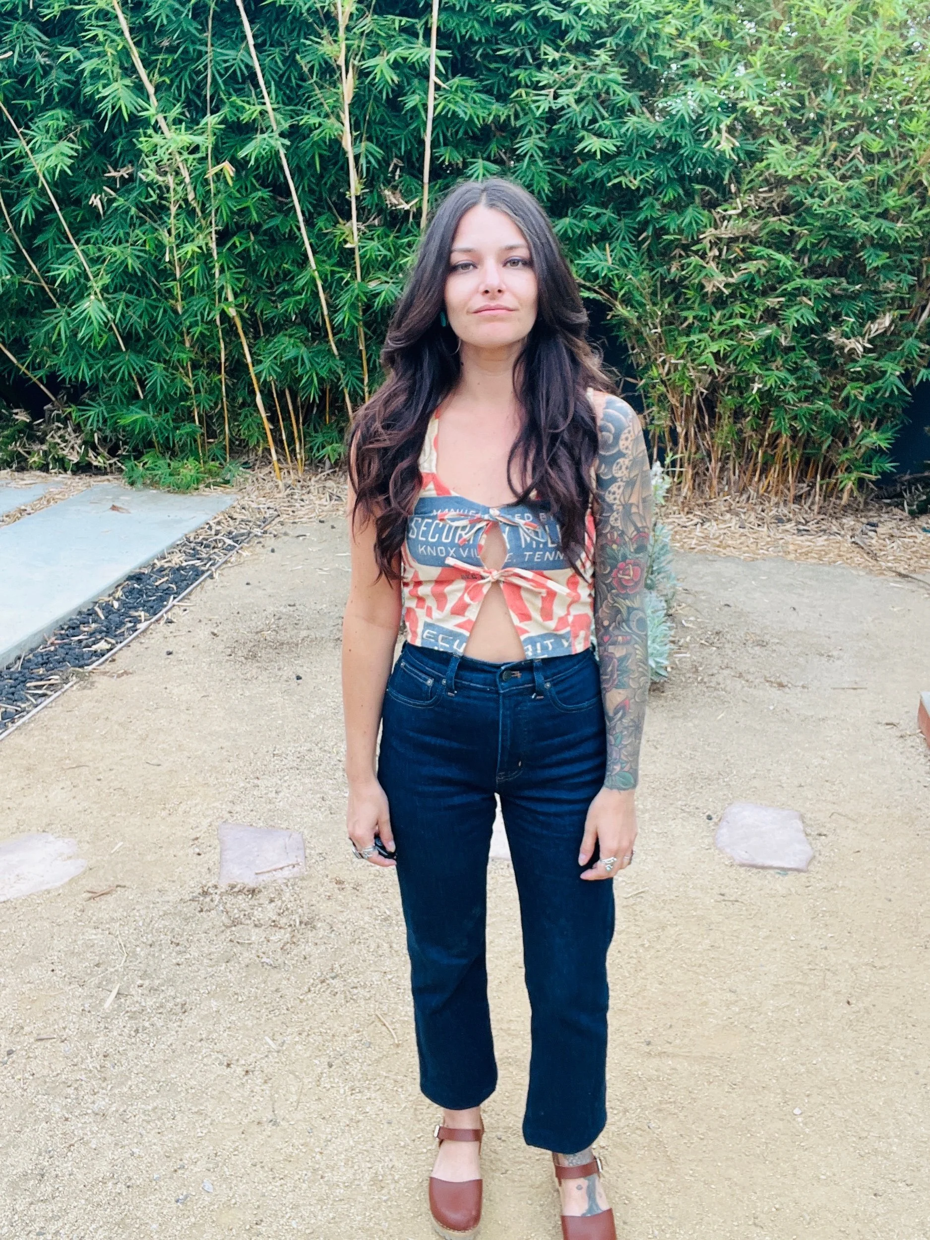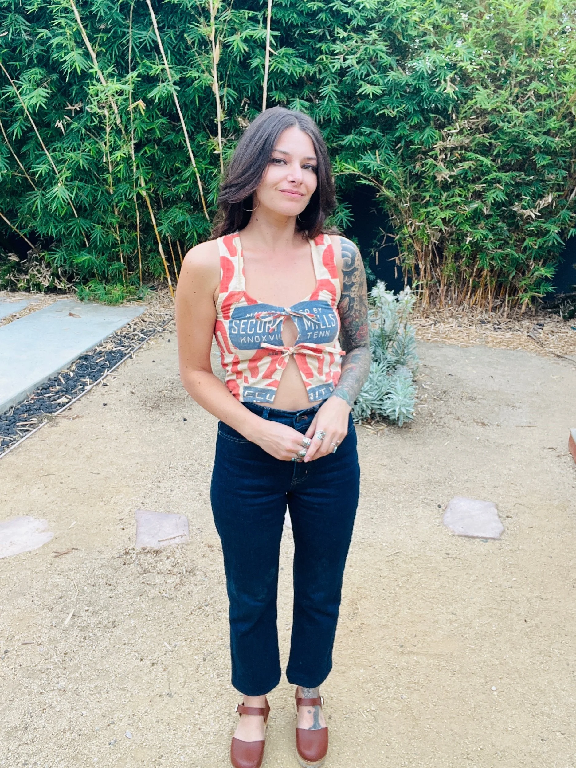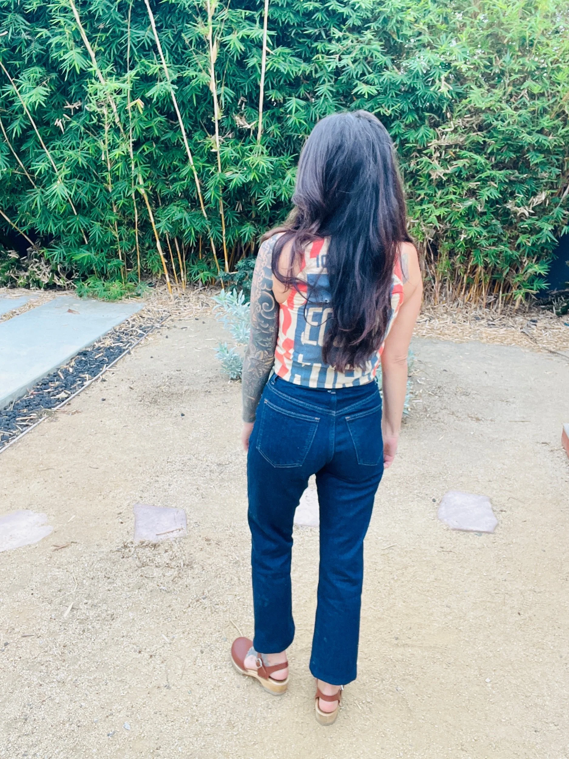 I’m 5’4, 120 pounds, a B cup, and this is how it fits me. I would say it’s between a S and XS. All the material is vintage and handmade. I upcycled this quilt in my studio in Long Beach! it’s so cute!!