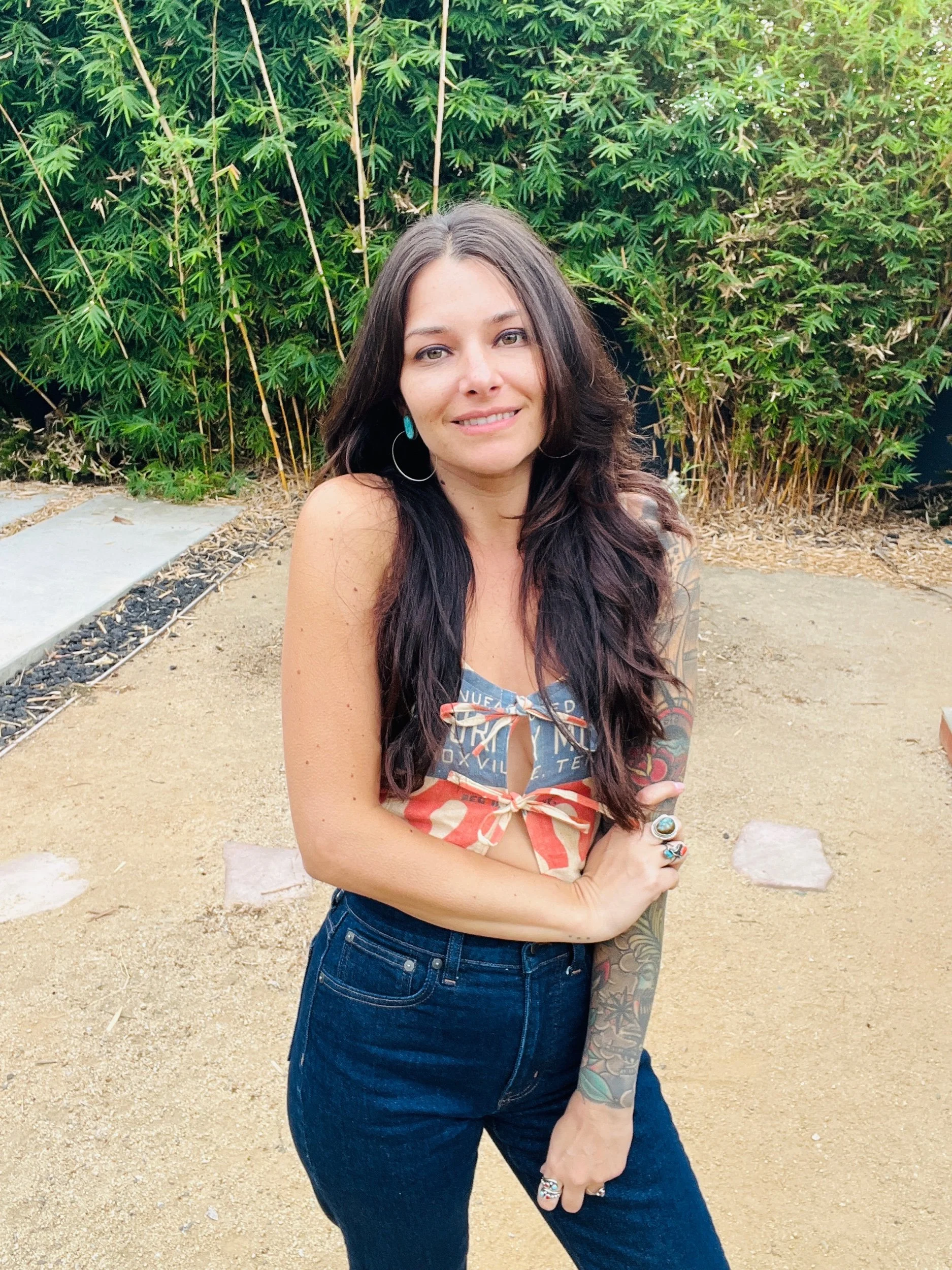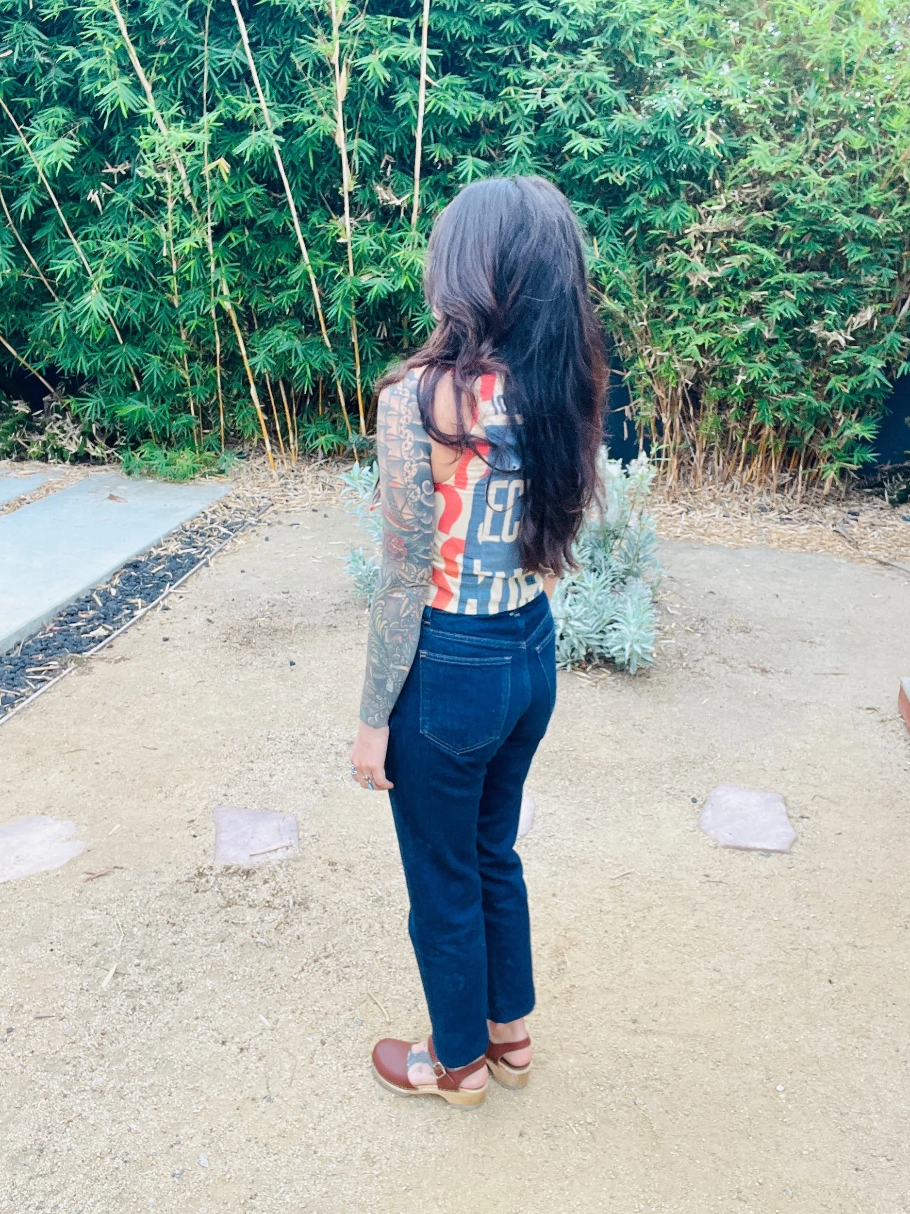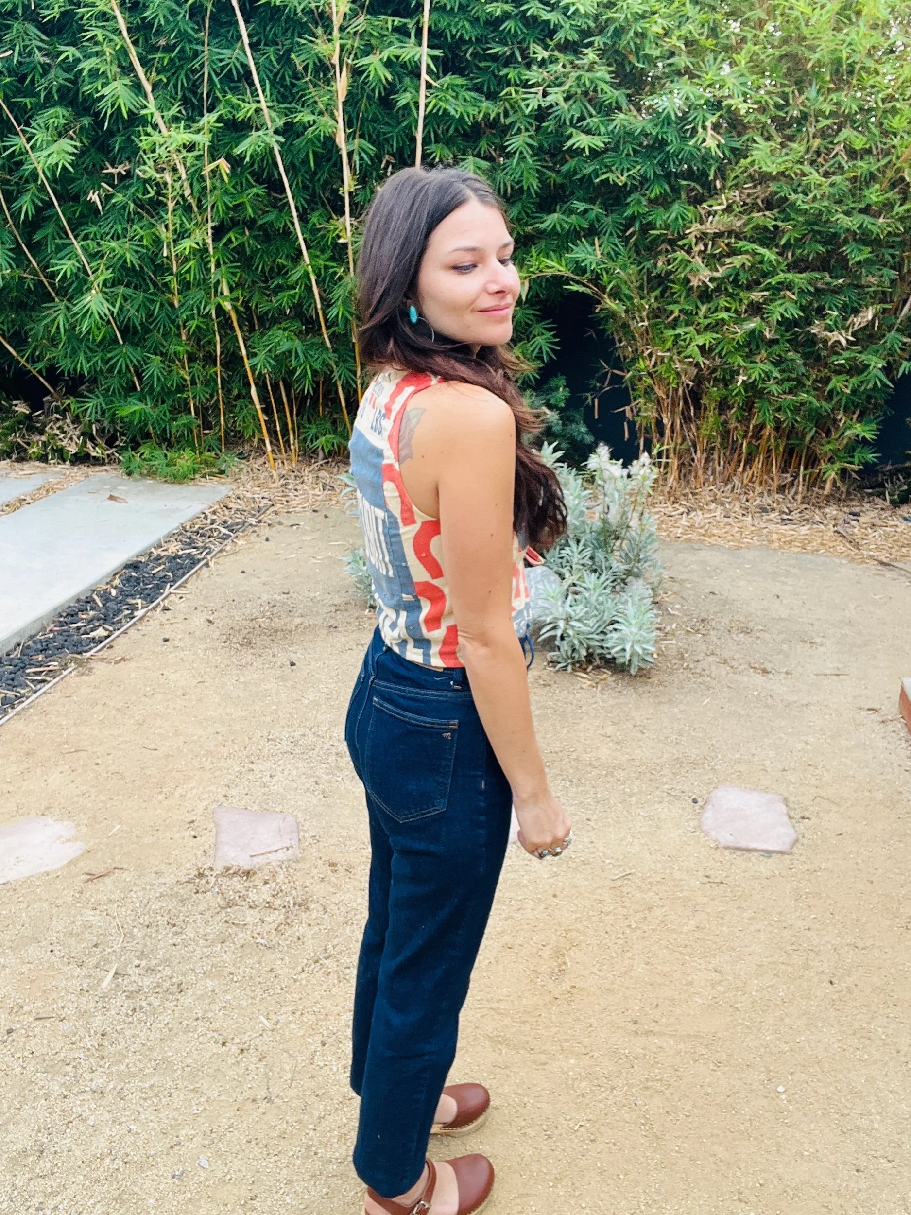 I’m 5’4, 120 pounds, a B cup, and this is how it fits me. I would say it’s between a S and XS. All the material is vintage and handmade. I upcycled this quilt in my studio in Long Beach! it’s so cute!!