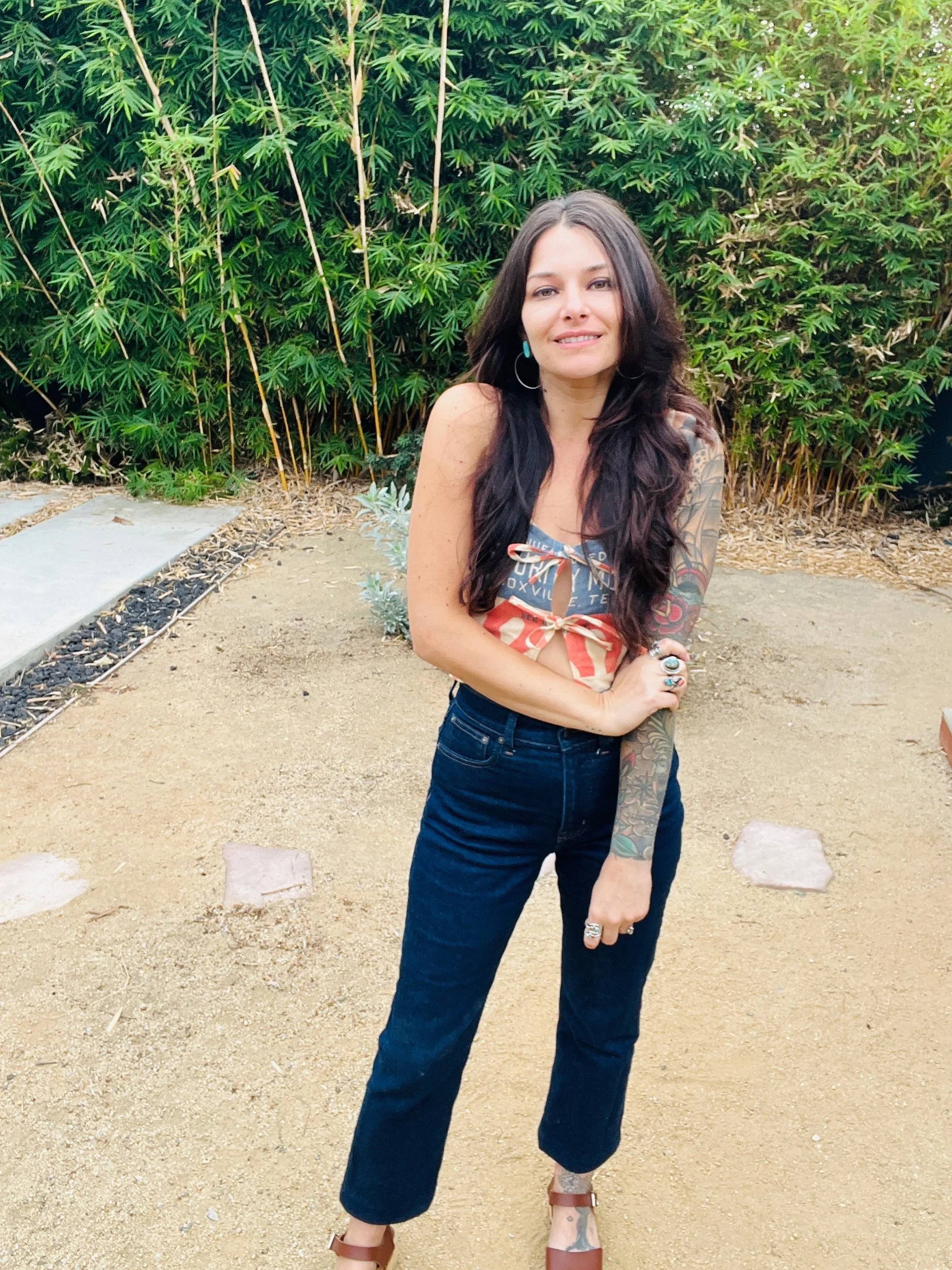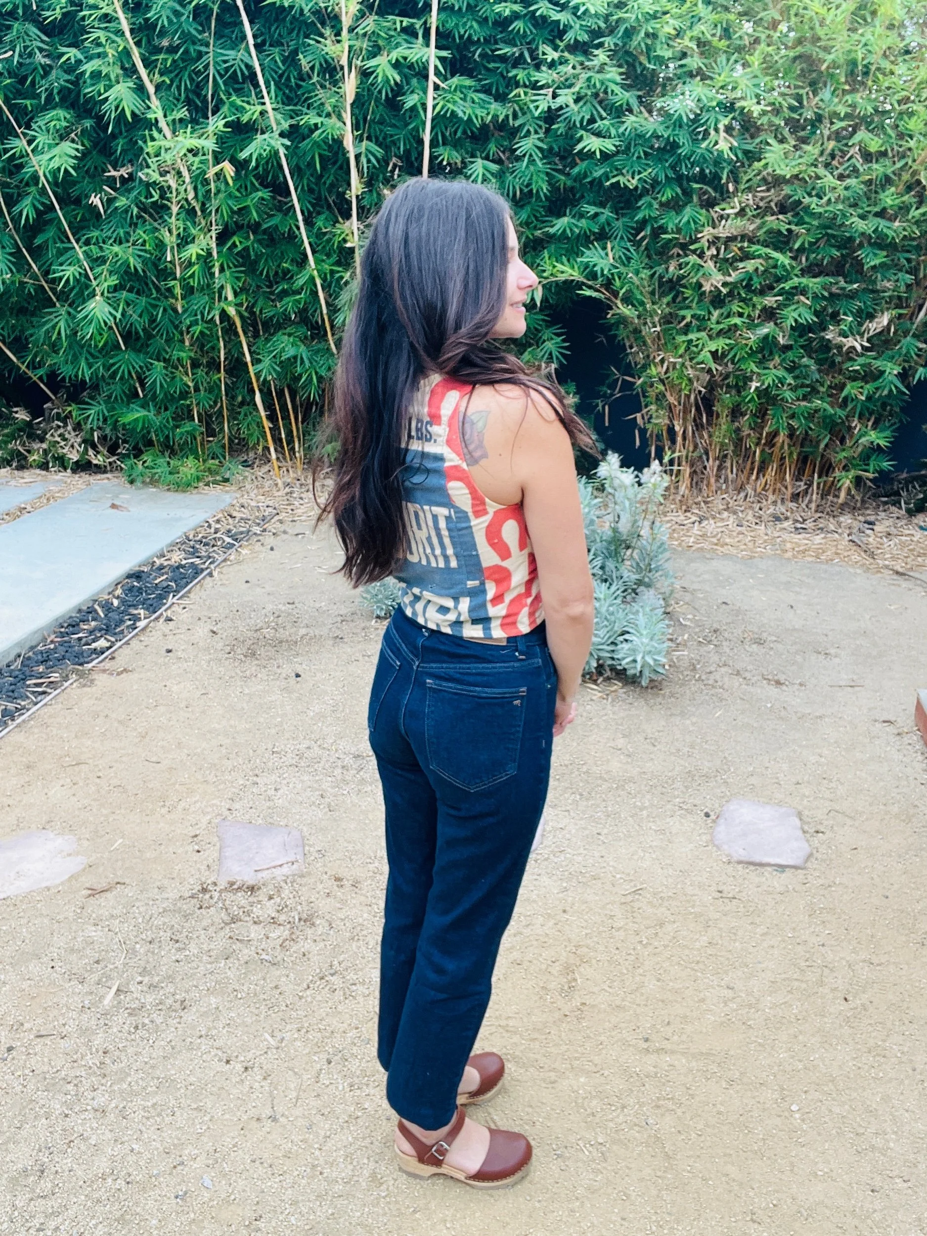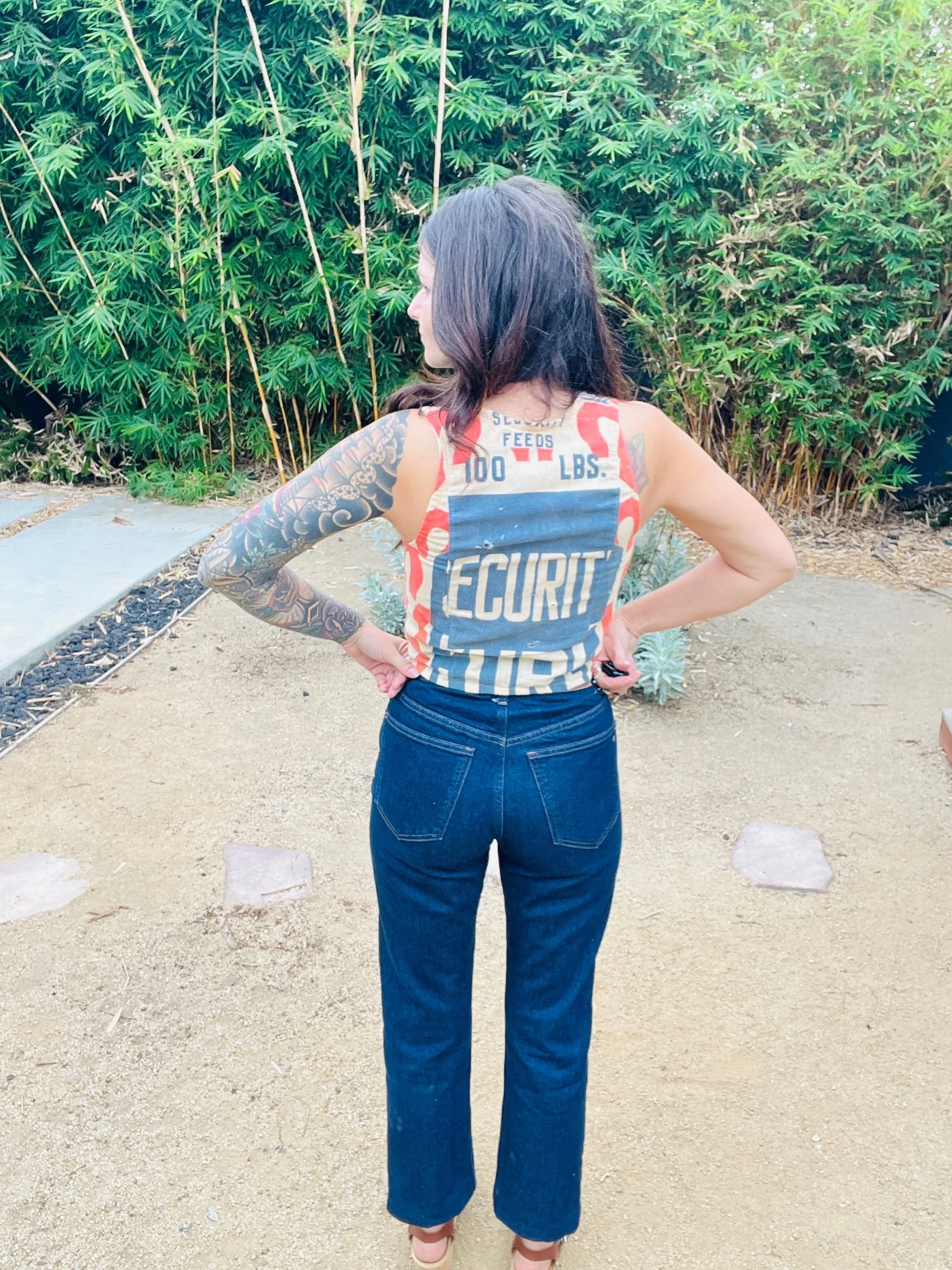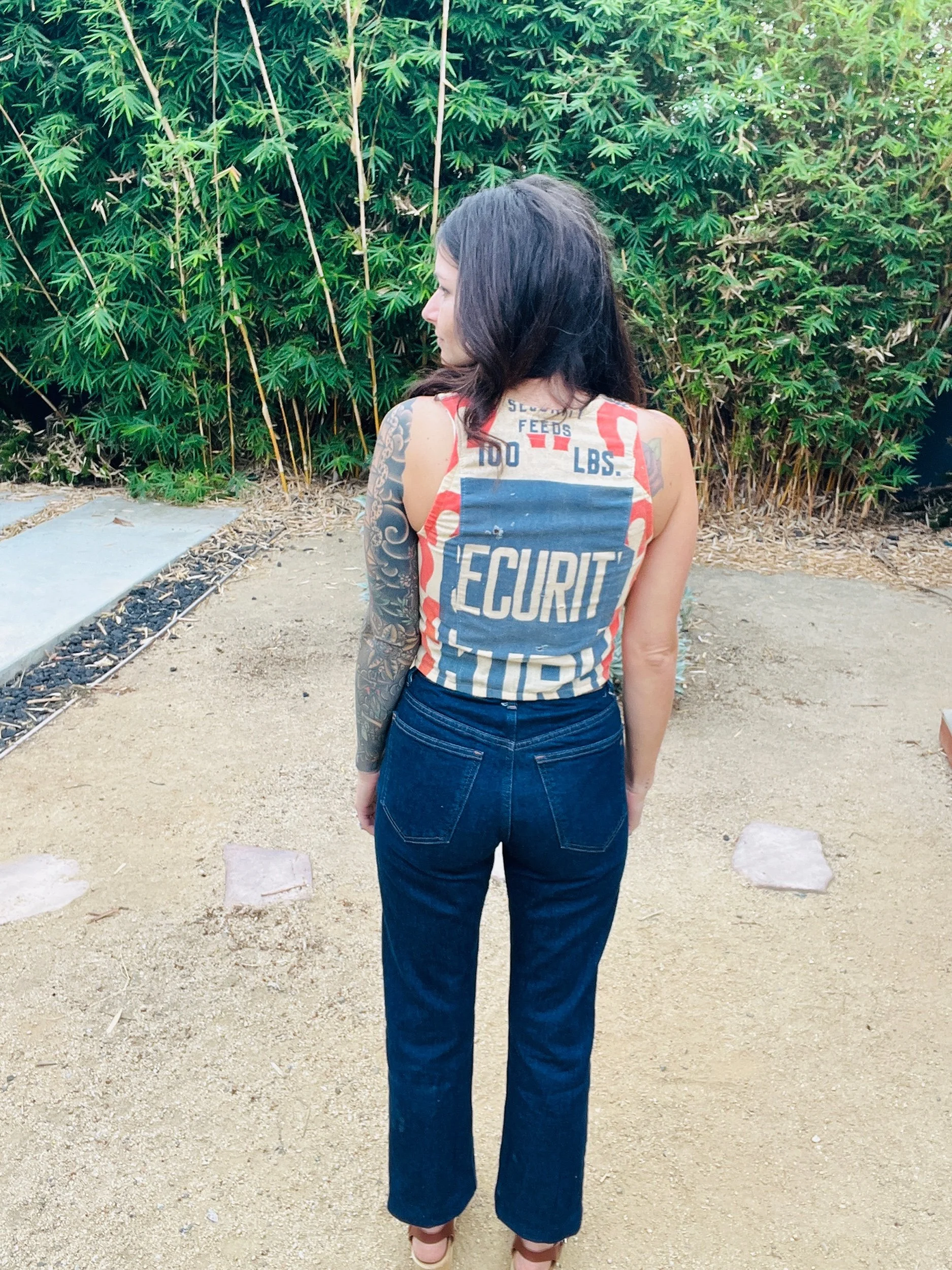 I’m 5’4, 120 pounds, a B cup, and this is how it fits me. I would say it’s between a S and XS. All the material is vintage and handmade. I upcycled this quilt in my studio in Long Beach! it’s so cute!!