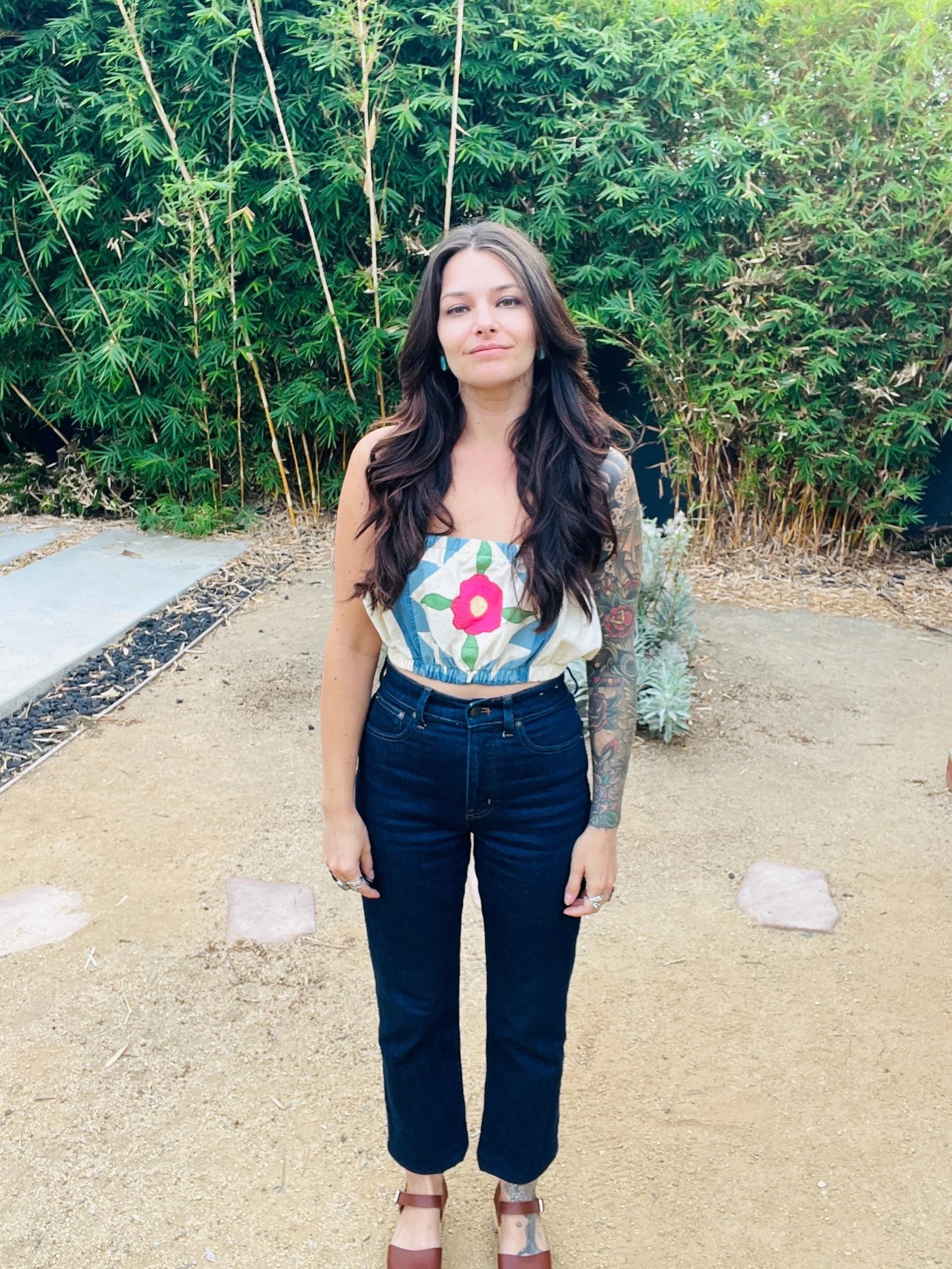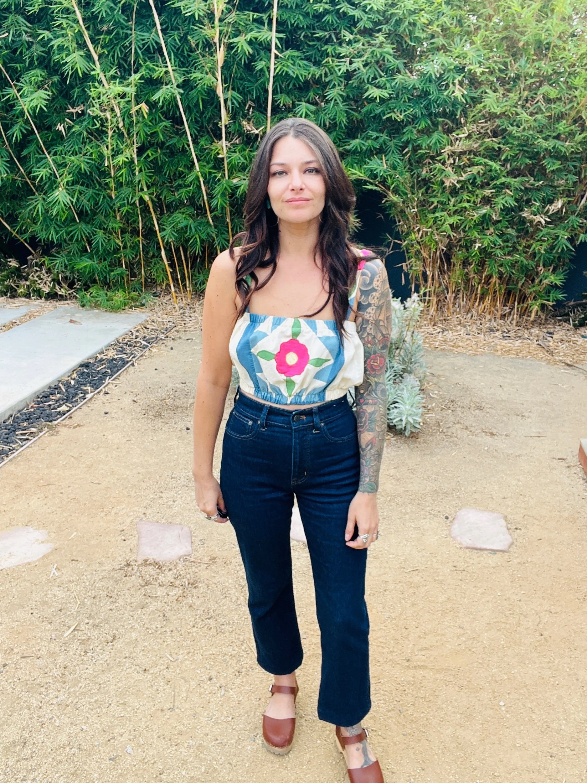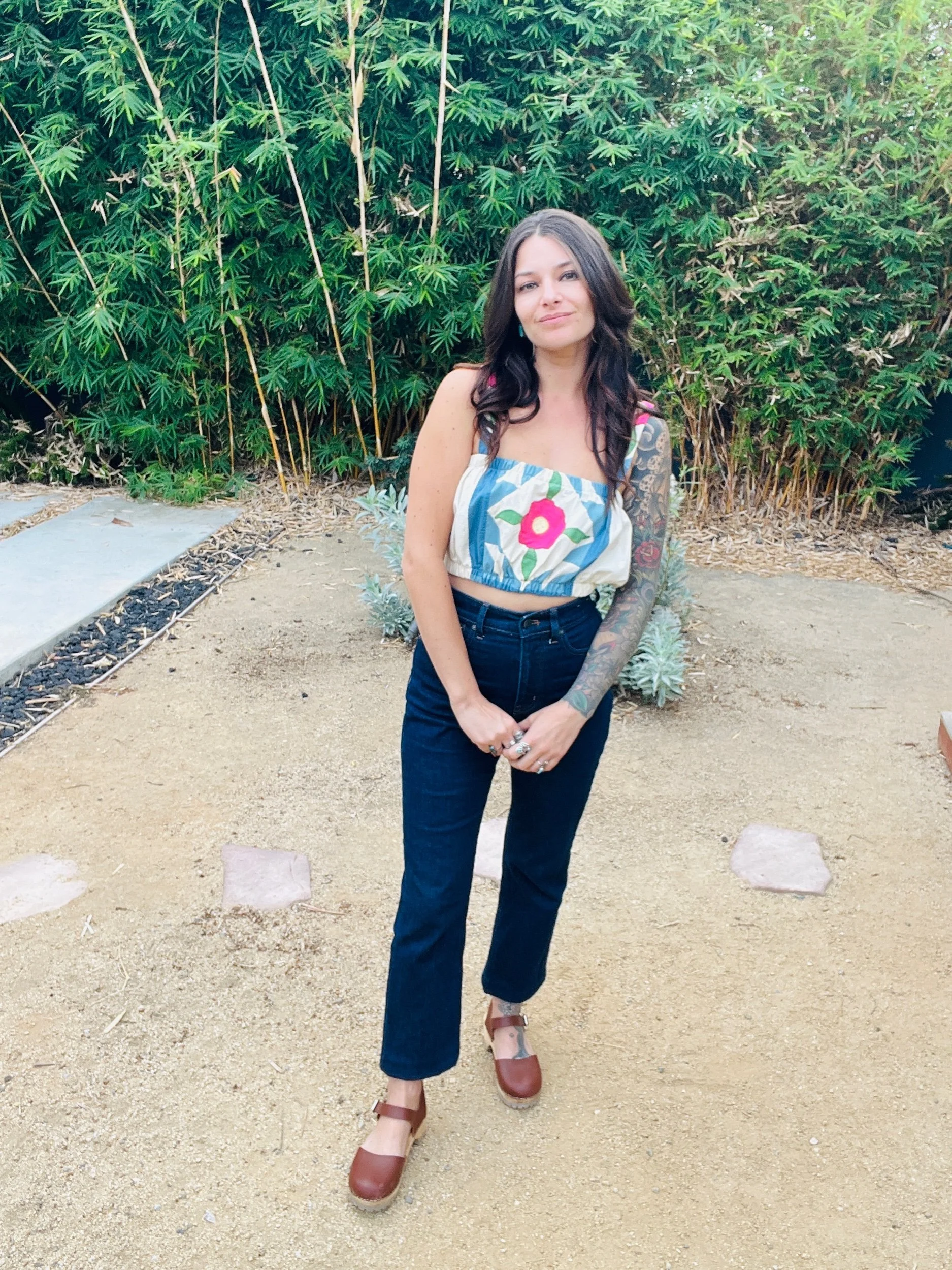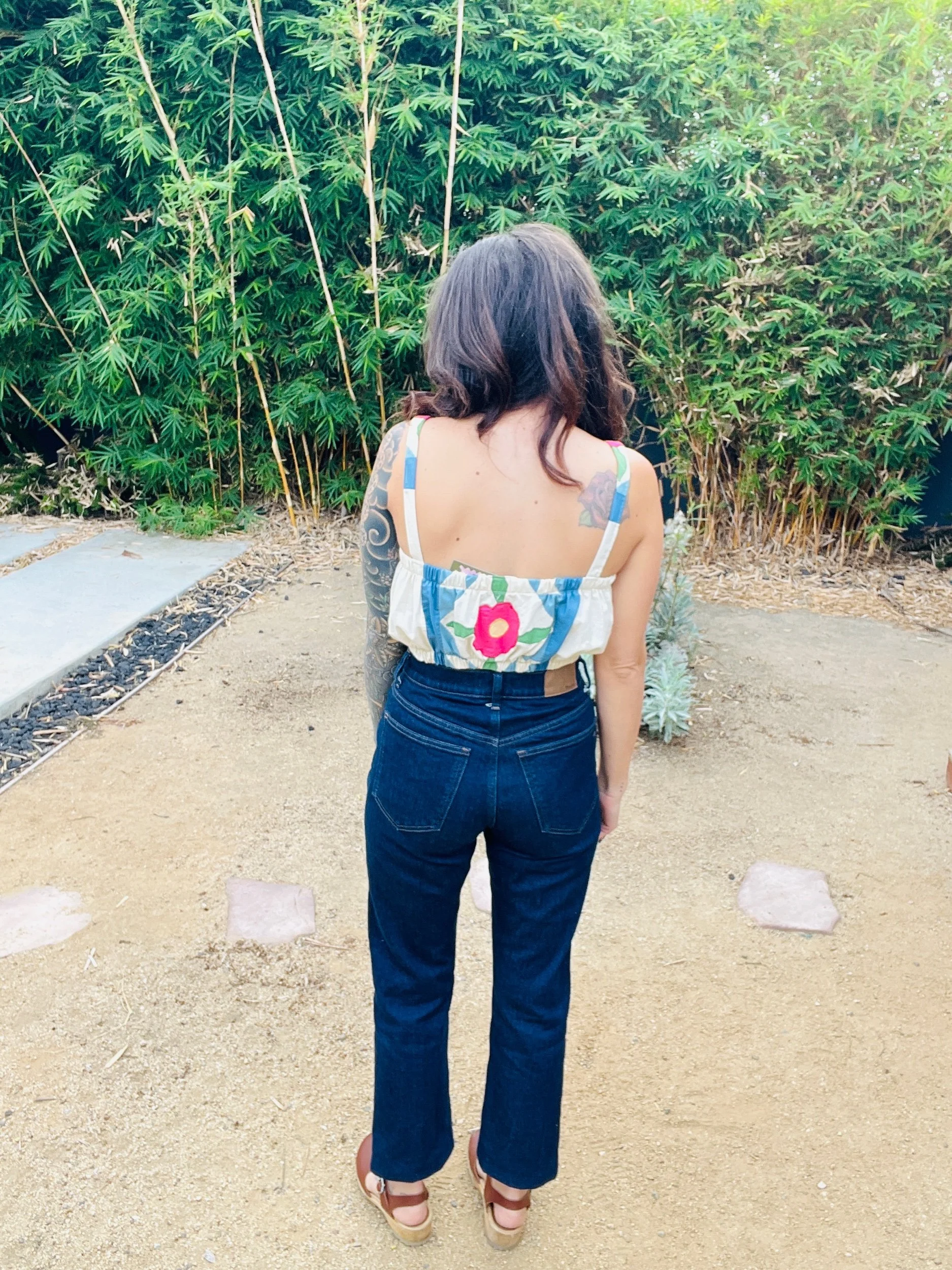 This vintage quilt top is handmade by me from a 1960’s patchwork quilt top. This is truly a unique piece. I’m between a Small and Medium and this is how it fits on me. it lands right above my belly button so something high waisted with this top. I think it sits perfectly with high waisted jeans or a high waisted skirt!