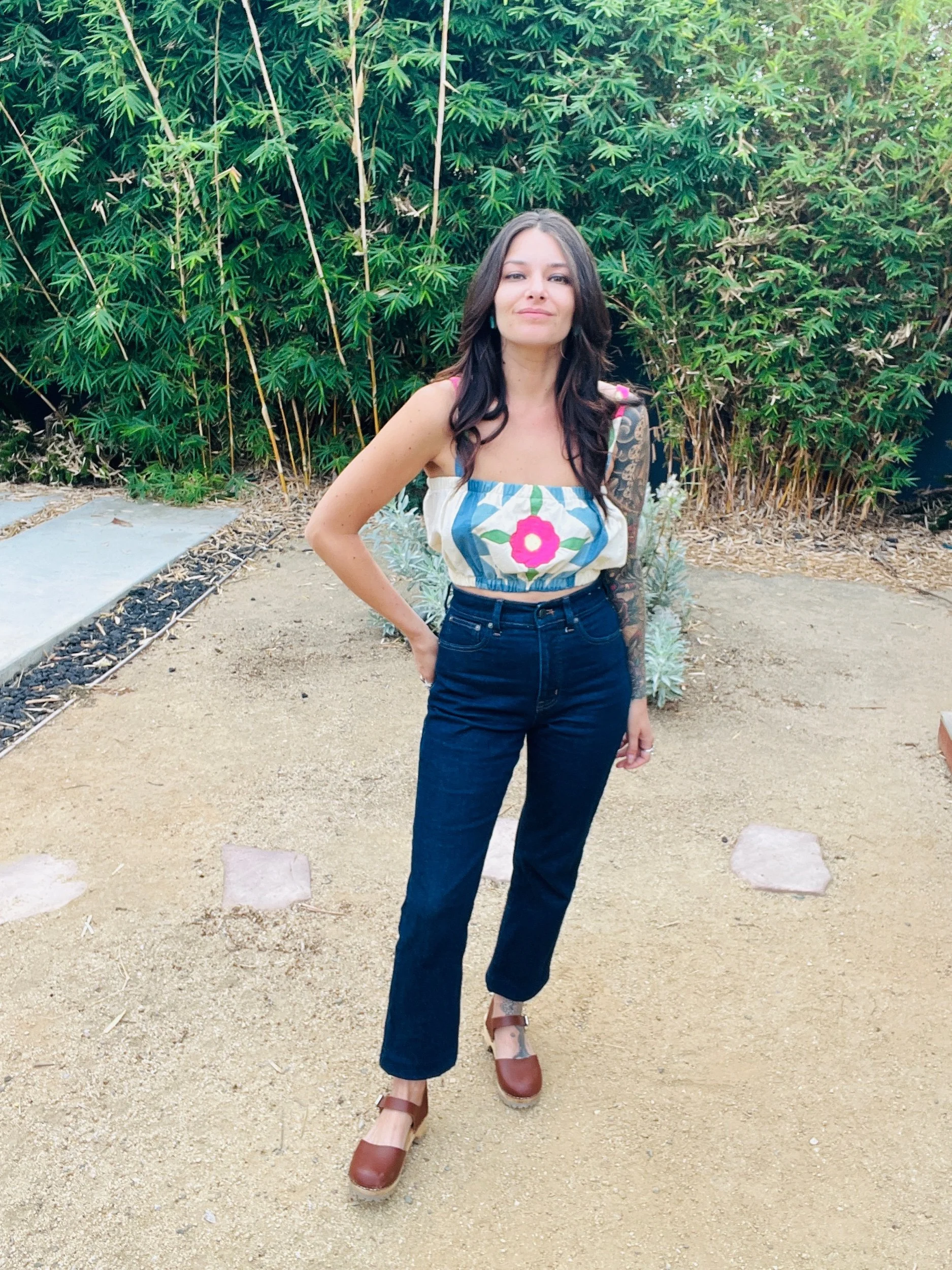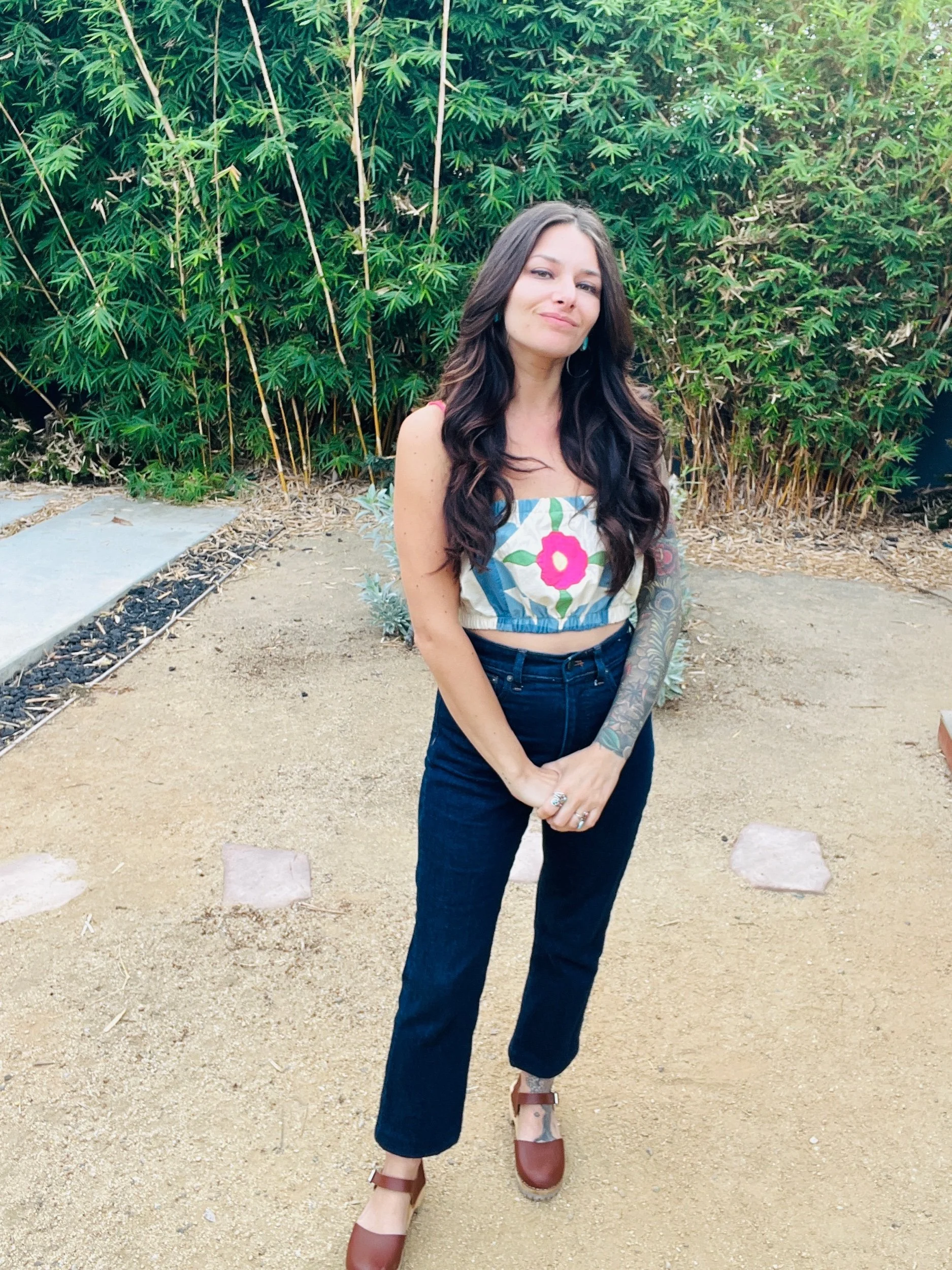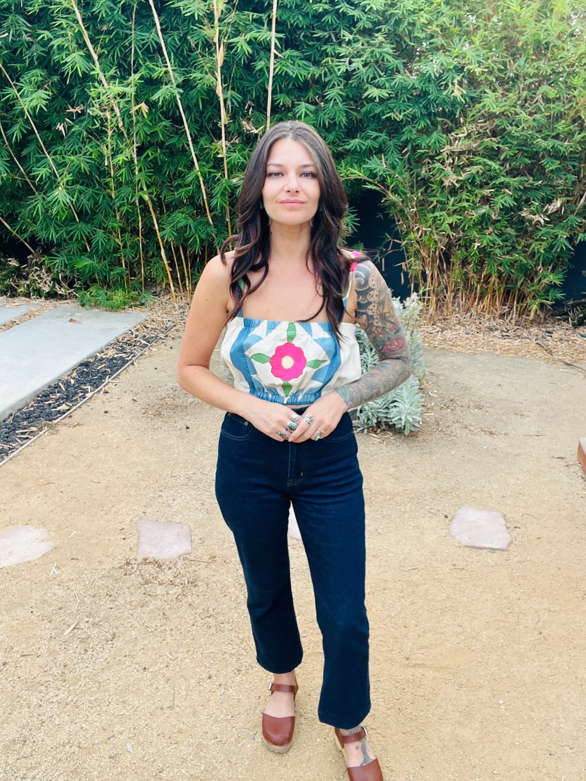 This vintage quilt top is handmade by me from a 1960’s patchwork quilt top. This is truly a unique piece. I’m between a Small and Medium and this is how it fits on me. it lands right above my belly button so something high waisted with this top. I think it sits perfectly with high waisted jeans or a high waisted skirt!