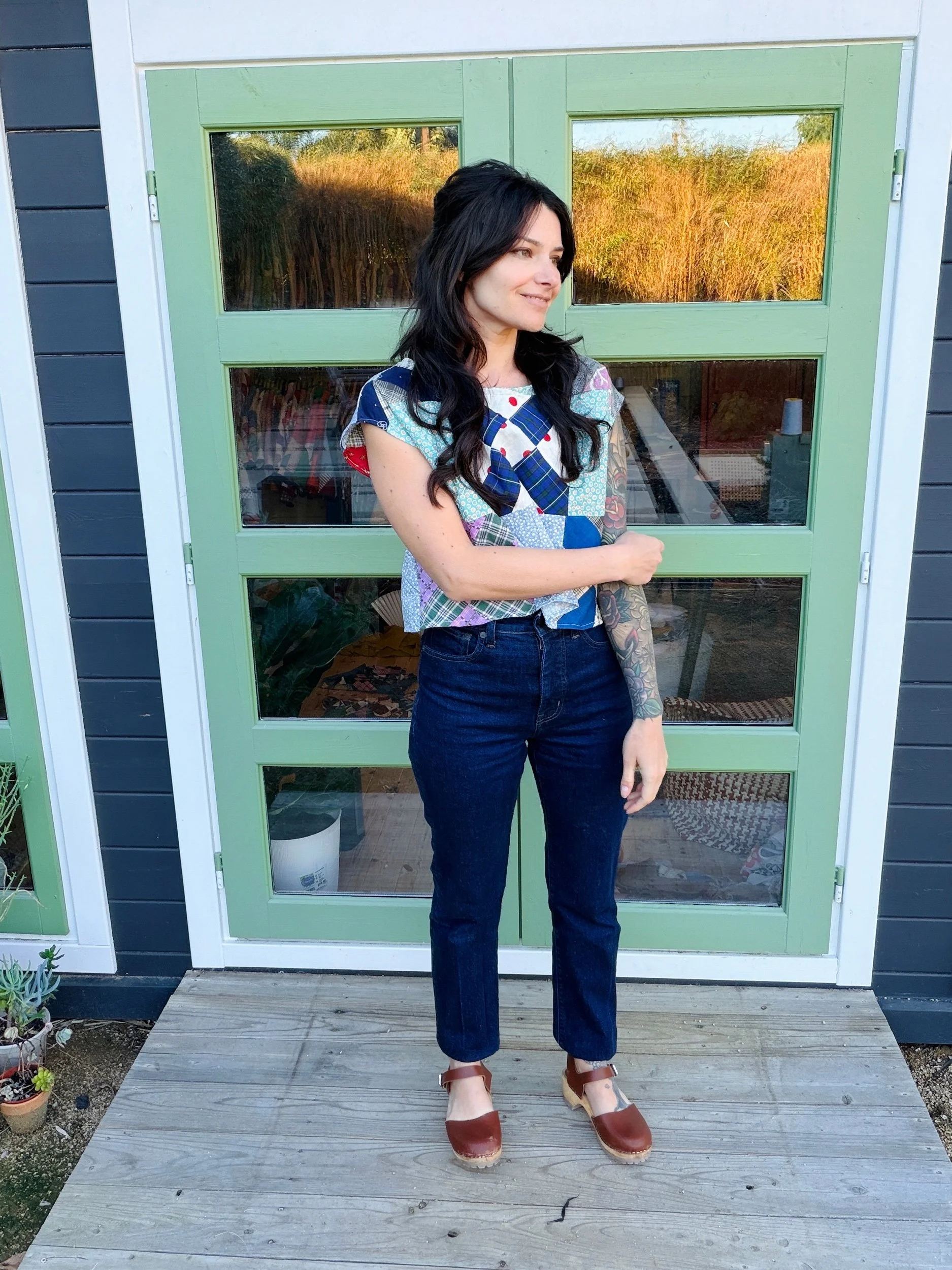 The silhouette is an easy, boxy crop with a relaxed drape and slightly structured feel from the original quilt layers. It hits at the natural waist, making it effortless with high-waisted trousers, denim, or a flowing prairie skirt. The short sleeves and clean neckline keep it simple, letting the antique textile shine.