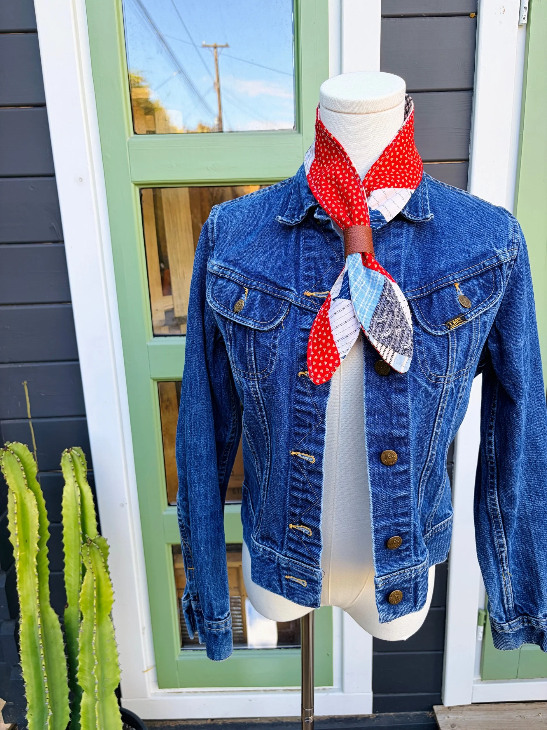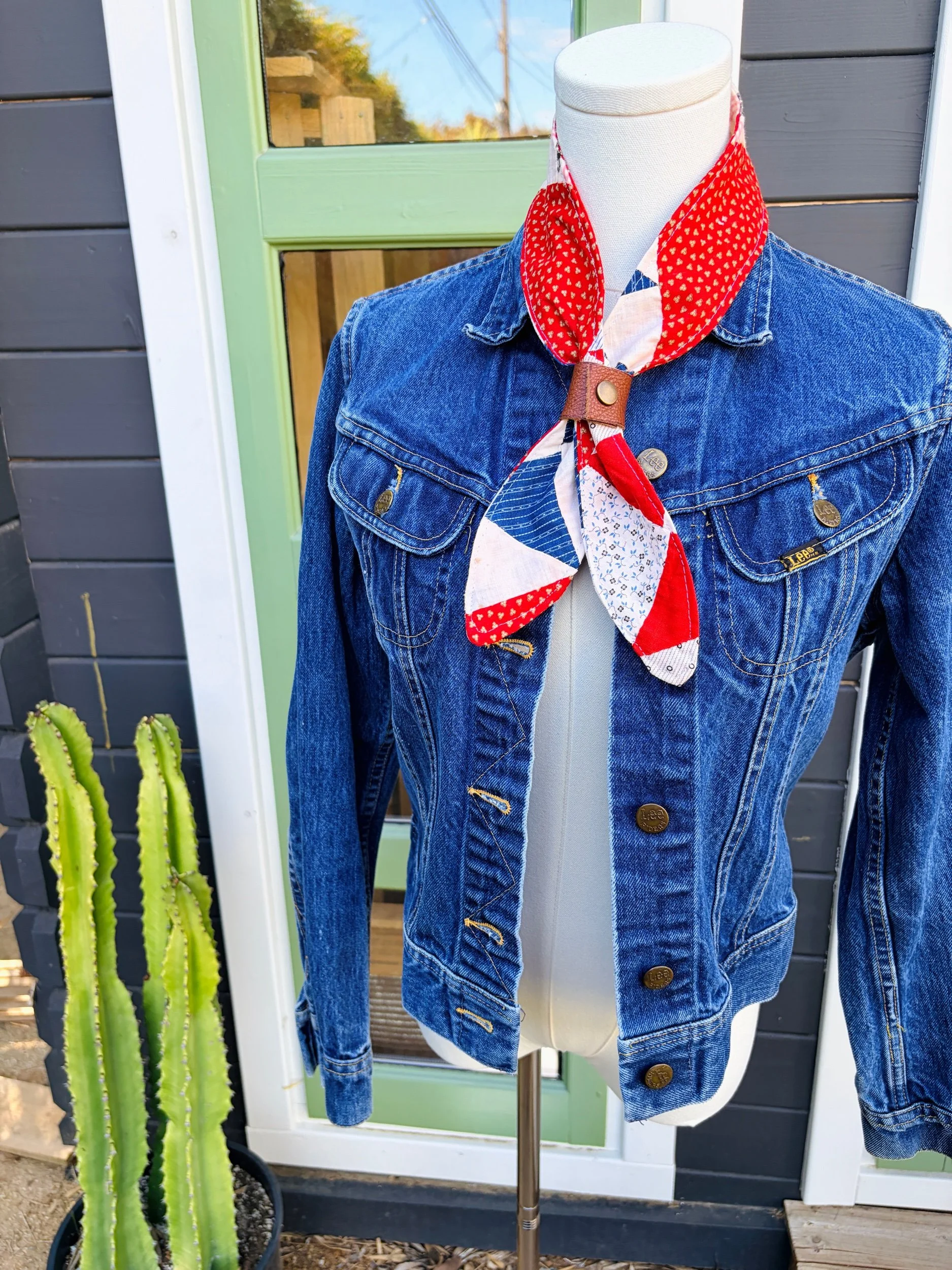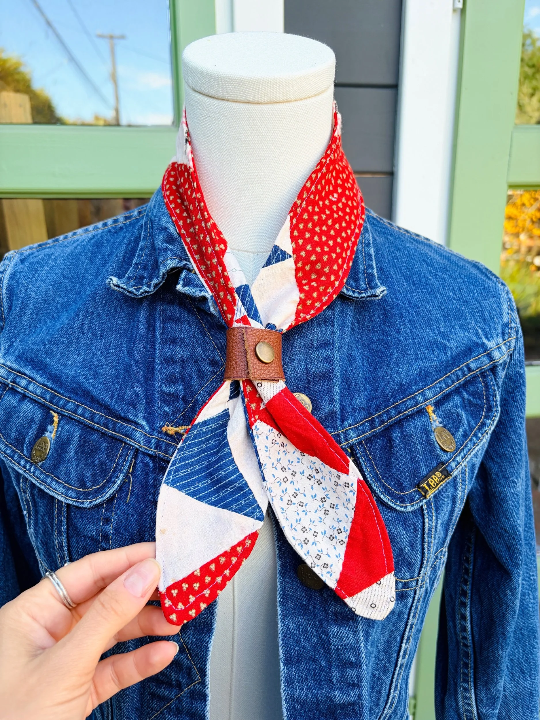 This handmade bandana is thoughtfully crafted from a reclaimed vintage quilt top, giving new life to beautiful, timeworn textiles. Each piece is truly one of a kind, showcasing unique patchwork, gentle fading, and the character that only vintage fabrics can offer.