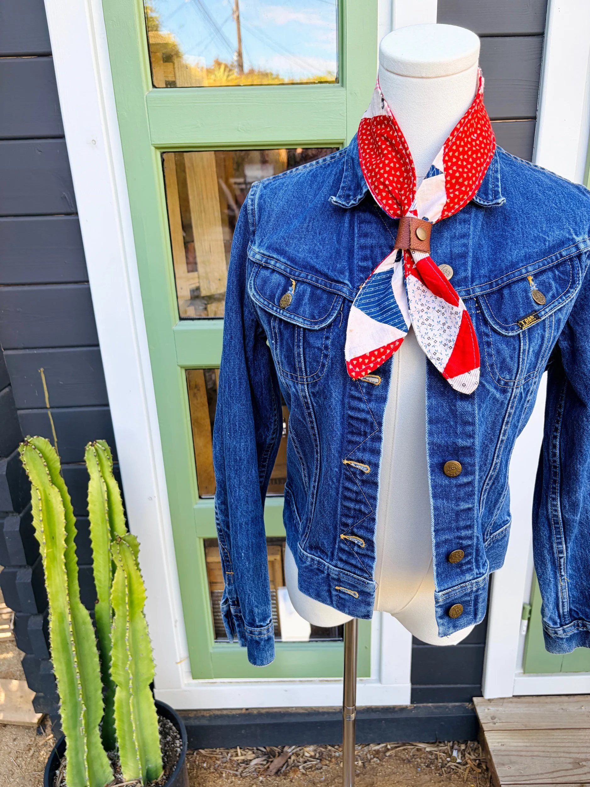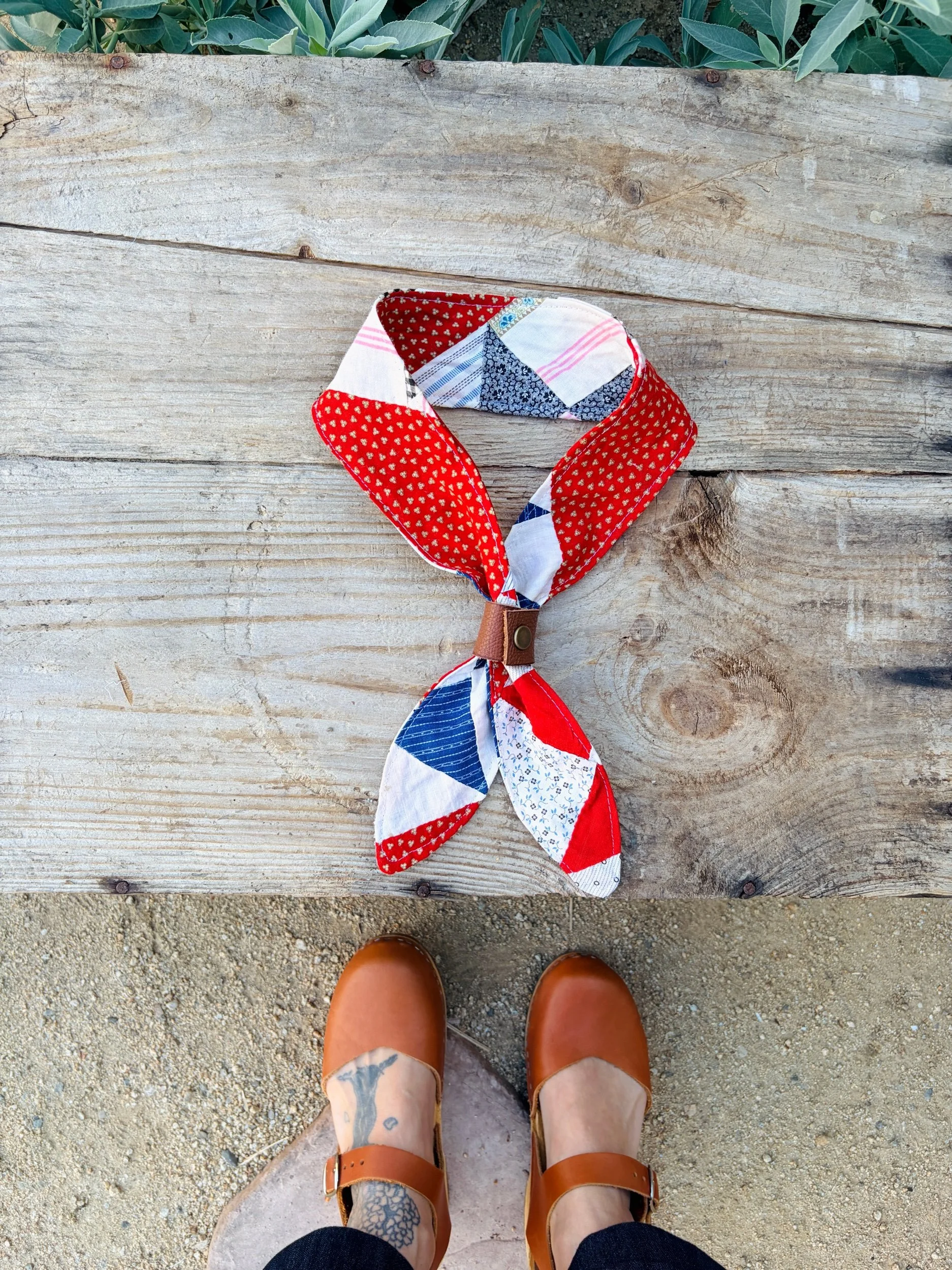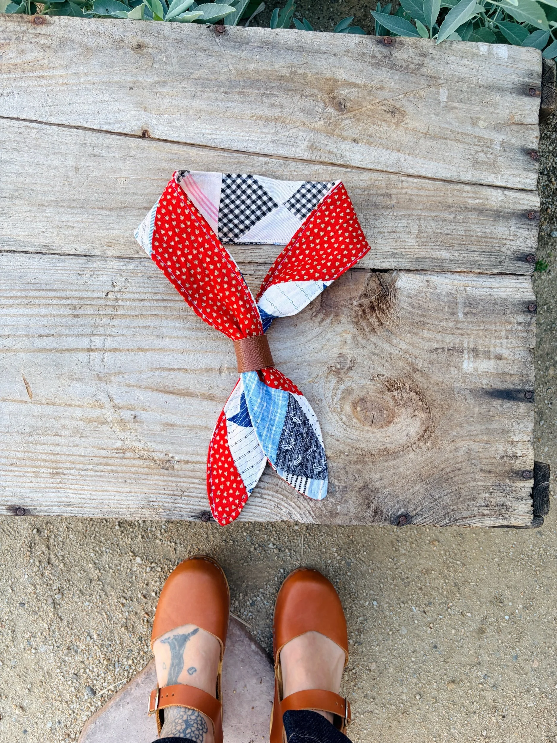 This handmade bandana is thoughtfully crafted from a reclaimed vintage quilt top, giving new life to beautiful, timeworn textiles. Each piece is truly one of a kind, showcasing unique patchwork, gentle fading, and the character that only vintage fabrics can offer.